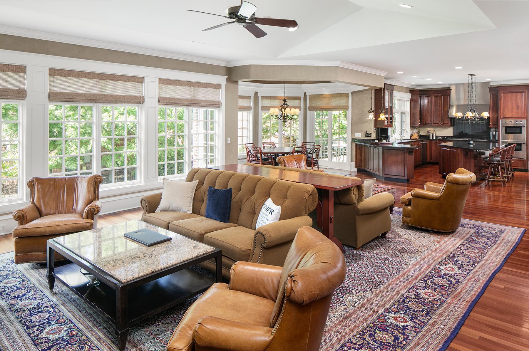 Expansive rambler style home on 1+ acre pondside lot in the heart of Rolling Green. Generous room sizes throughout. 4 BRs, each with private bath, on main level, including generous primary suite with dual walk-in closets. Main level includes well planned kitchen open to great room, den/library, formal LR & DR, mudroom and two powder rooms. Bonus room over 3-car attached garage. Partial second floor includes a family room, bedroom and full bath. Finished walkout level features family room with wet bar, game room, exercise room, craft room, as well as two additional bedrooms. Beautiful level rear yard.