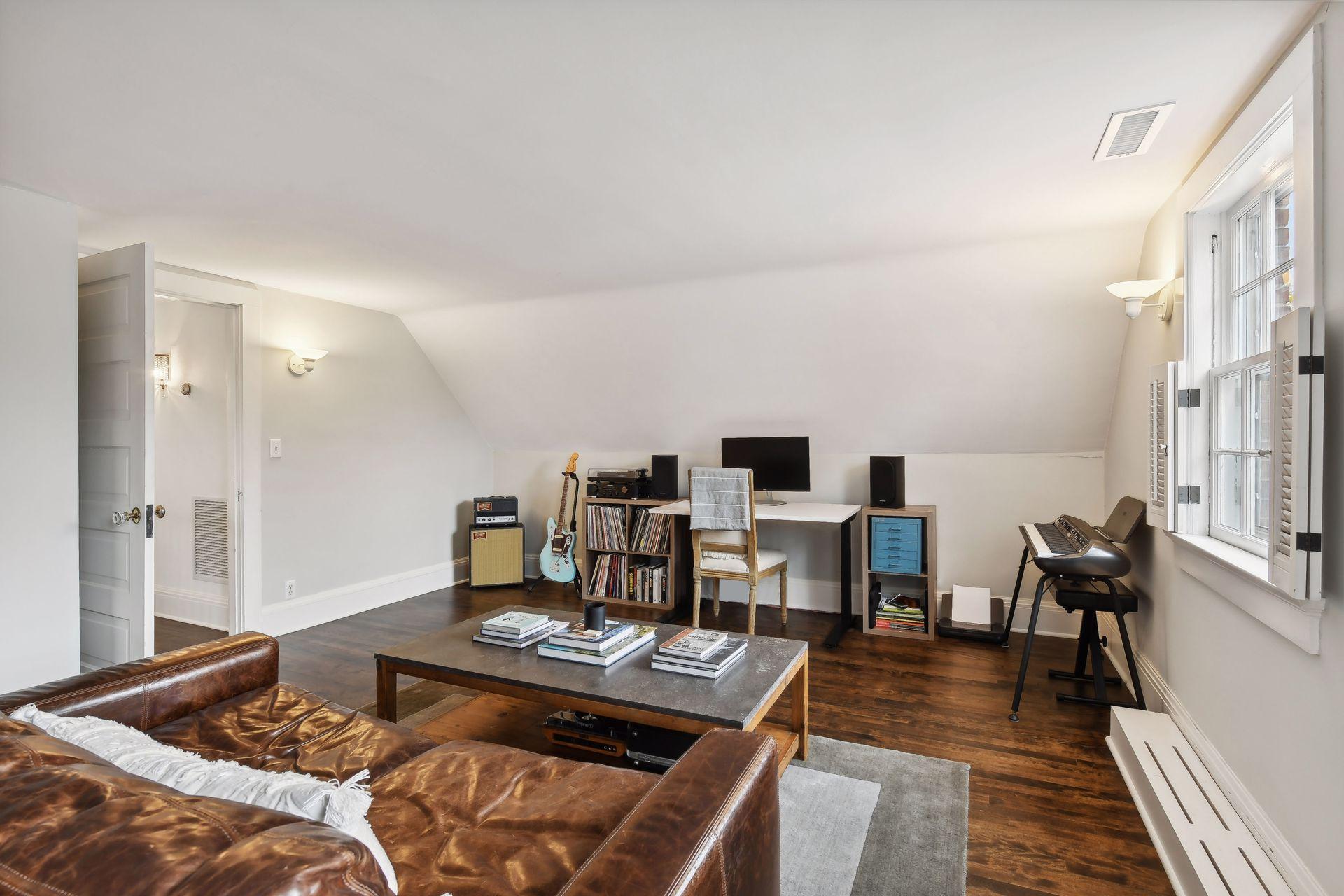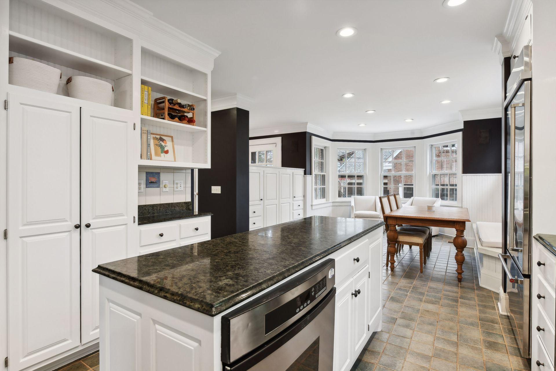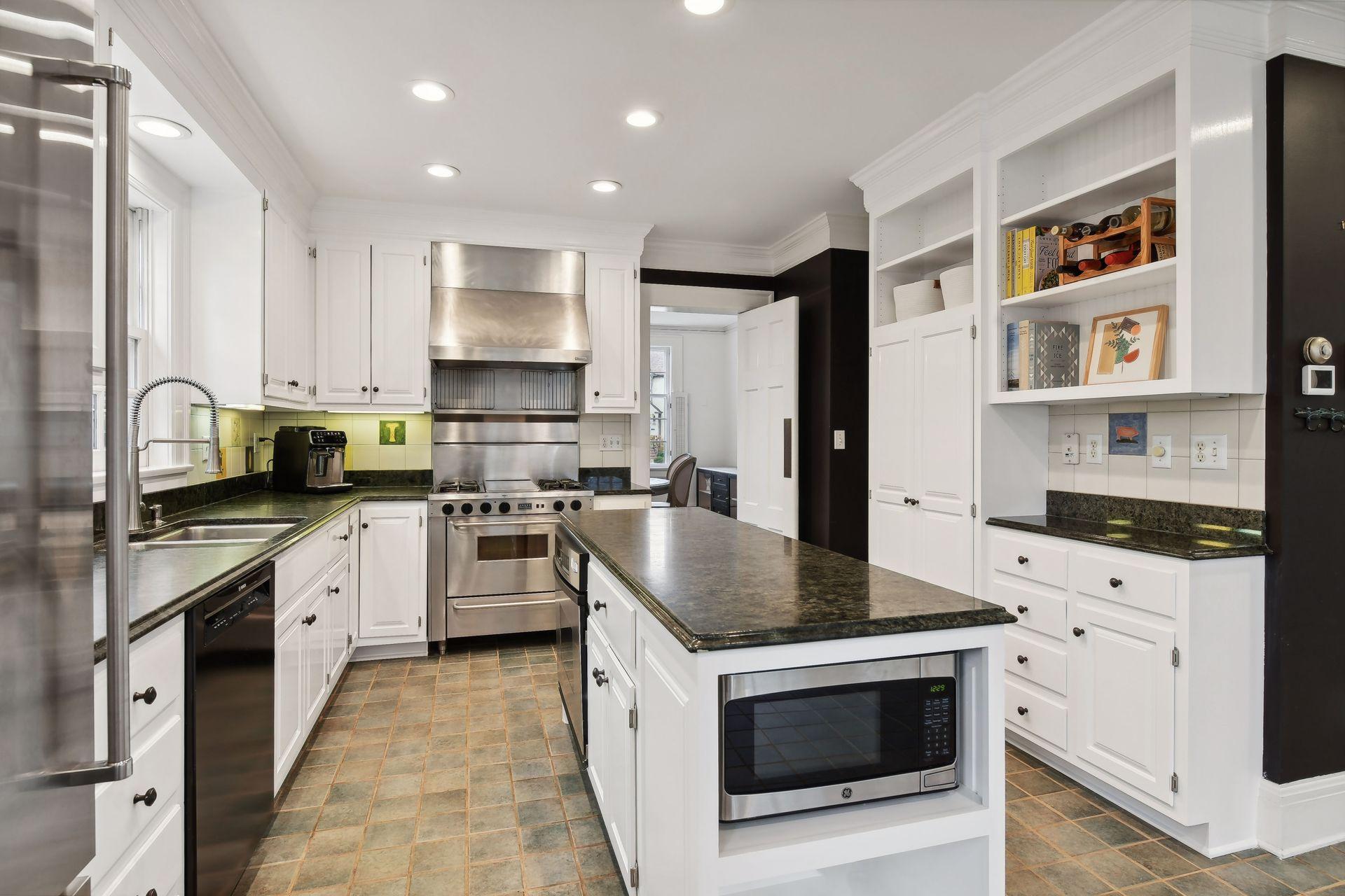 Inside, the inviting living room with wood-burning fireplace flows into a cozy family room. The gourmet kitchen with informal dining connects seamlessly to the formal dining room. Upstairs, the owner’s suite includes a sunroom, with two additional bedrooms, a remodeled bath, and an updated laundry area. The third floor adds two more bedrooms and a full bath.