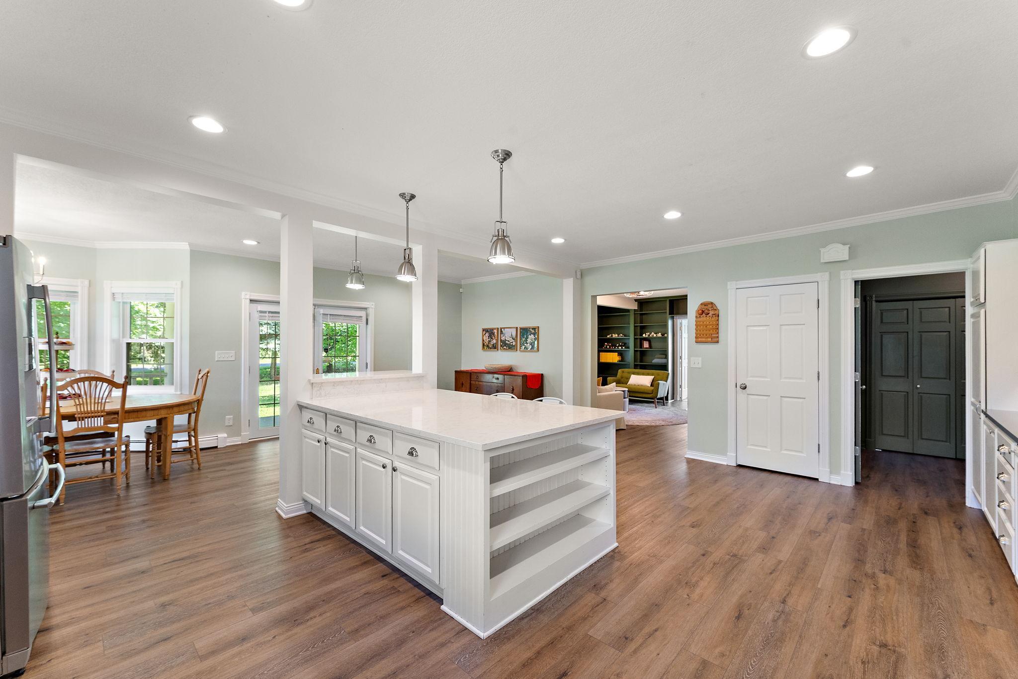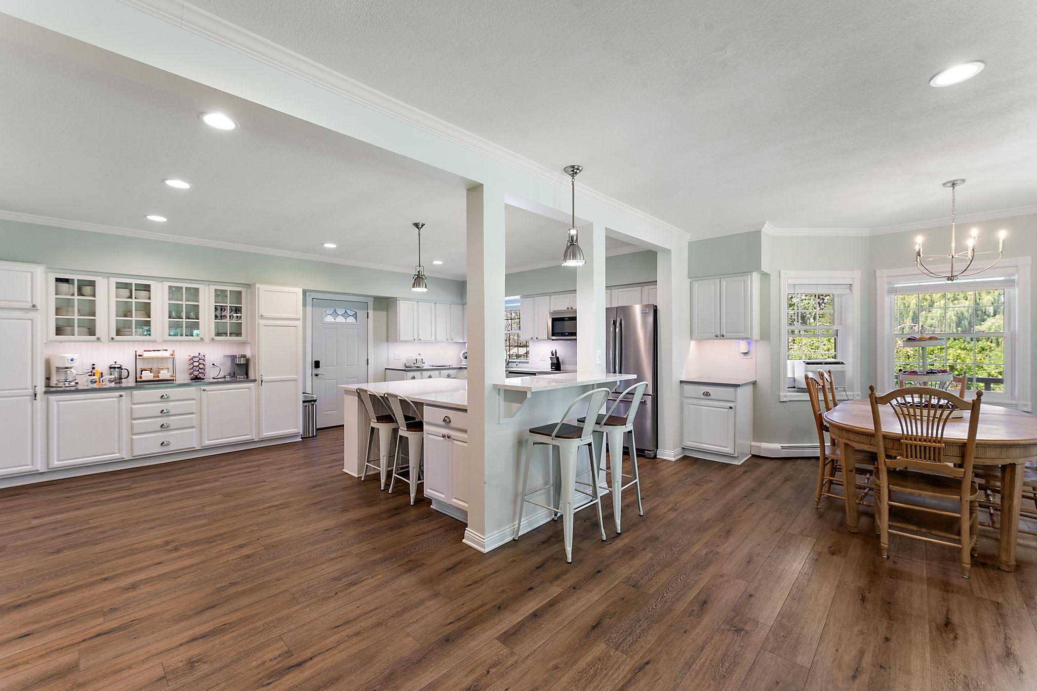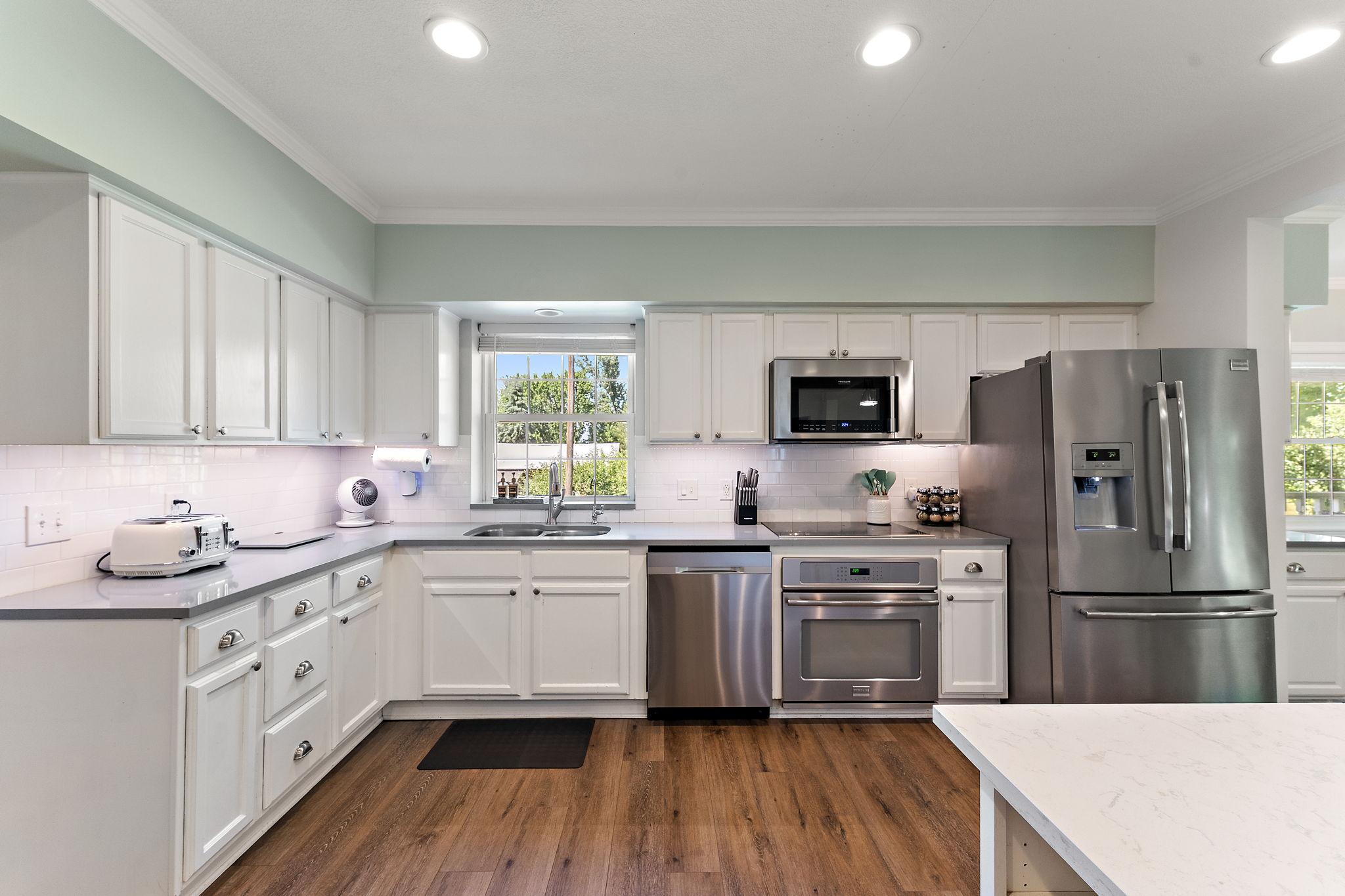 The home features an open, updated kitchen with stainless steel appliances and a large center island.