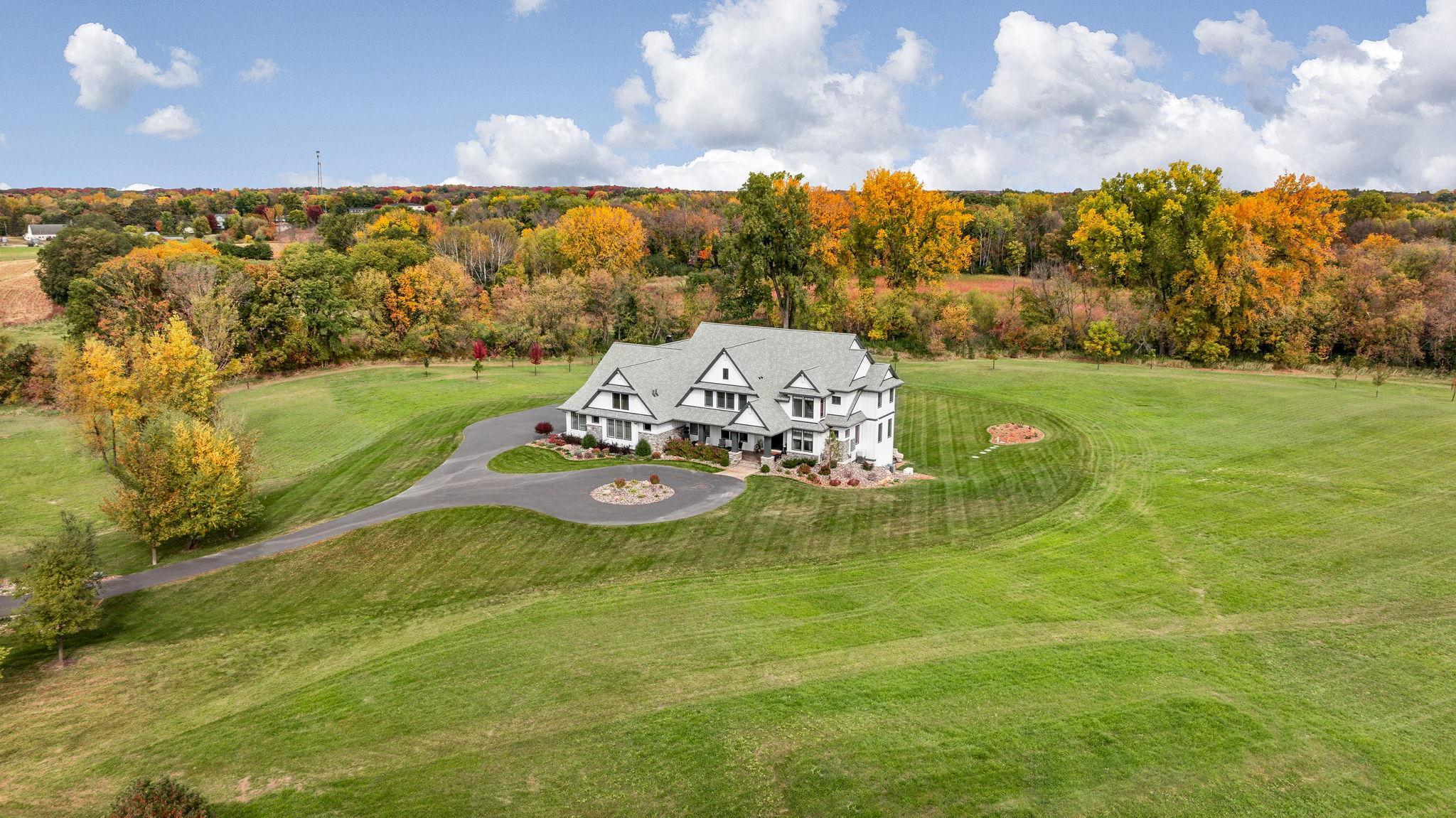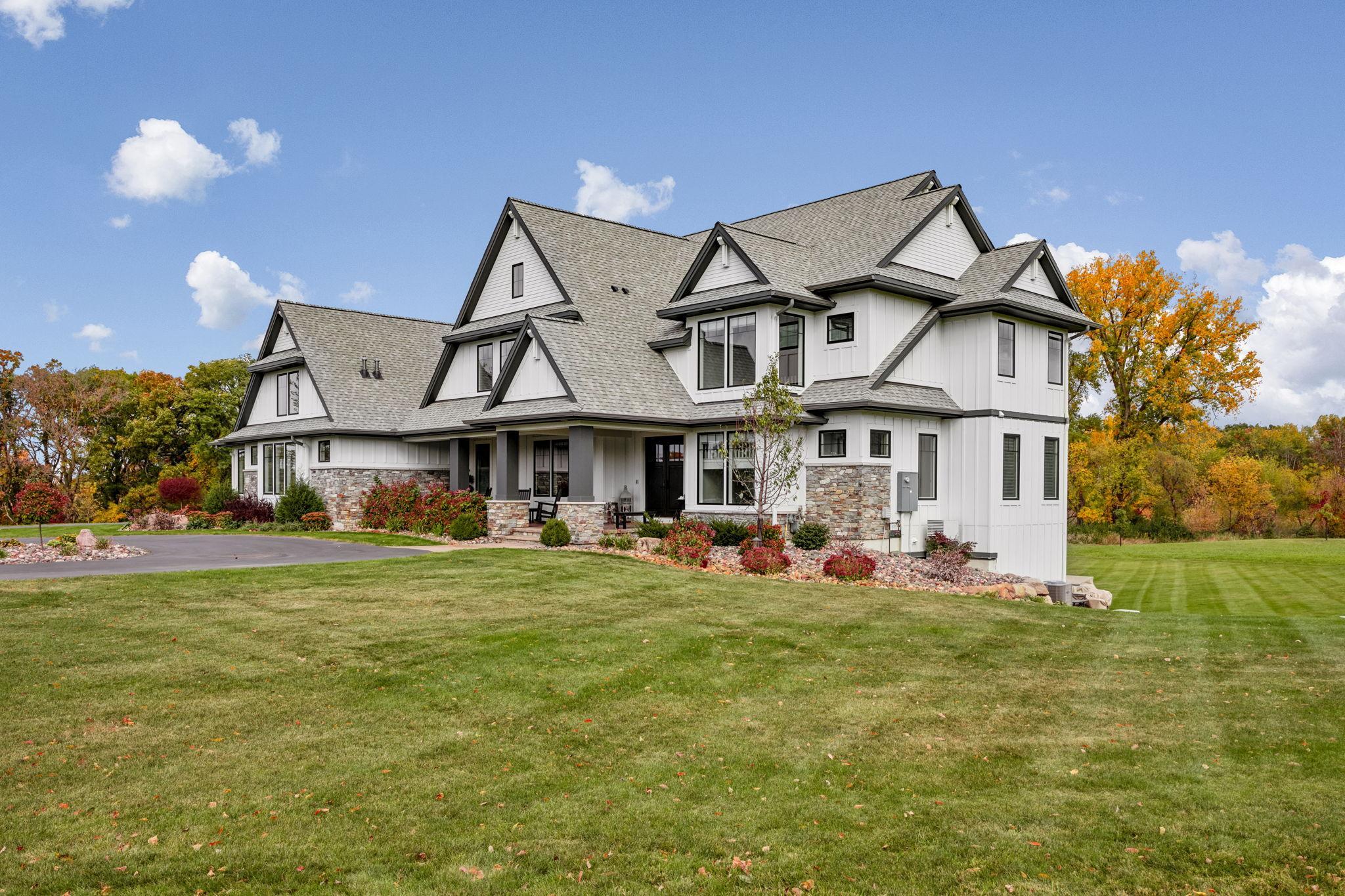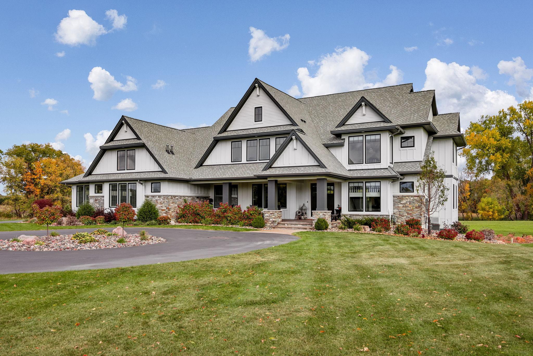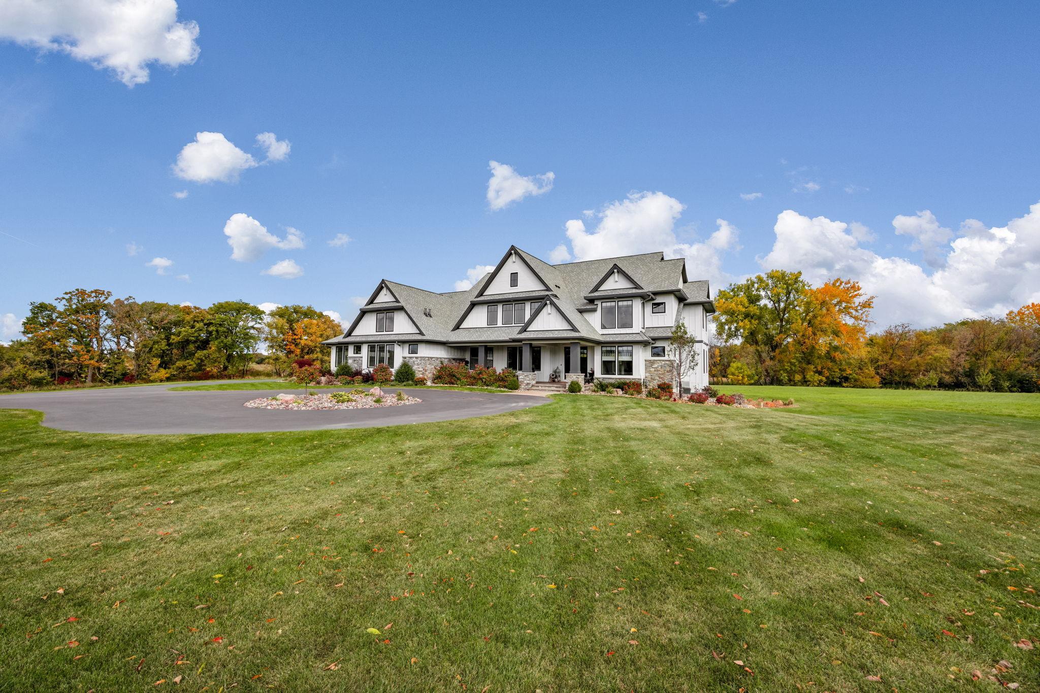 This exclusive custom-built home by Reggie Award-Winning Hartman Homes exemplifies unparalleled craftsmanship, luxurious finishes, and ample space for living, working, and entertaining in style. Situated on 7.5 private acres, this remarkable estate features a fully finished six-car garage with oversized doors, eleven-foot ceilings, built-in cabinetry, a hot/cold tiled dog wash station, and upper-level storage. The main level showcases rich custom woodwork, detailed crown molding, and a full-home Sonos surround sound system. Enjoy the spacious three-season screened porch with vaulted ceiling and a cozy river stone fireplace with built-in bench or relax on the maintenance-free wraparound deck. The gourmet kitchen is equipped with an oversized center island, top-tier stainless steel appliances, custom lighting, and a hidden prep kitchen with walk-in pantry and seven-foot-tall custom shelving. The open-concept great room features a gas fireplace and custom built-ins, while the formal dining room with a coffered ceiling and main-floor office with French doors provide elegant functionality. Upstairs, the luxurious owner’s suite offers a spa-like retreat, while each additional bedroom includes its own en-suite bath and walk-in closet. The upper-level laundry room is thoughtfully designed with built-ins, Cambria counters, and custom lighting. The walkout lower level is designed for entertainment, featuring a media room with custom built-ins and a two-sided fireplace, a full wet bar with high-end appliances, a 500-bottle temperature and humidity-controlled wine room with tasting station, a billiards room, exercise room, and a fifth bedroom with private patio access. This exceptional home has been meticulously crafted down to every detail—an extraordinary opportunity for those seeking space, privacy, and the highest level of custom living all within 25 minutes to downtown Minneapolis