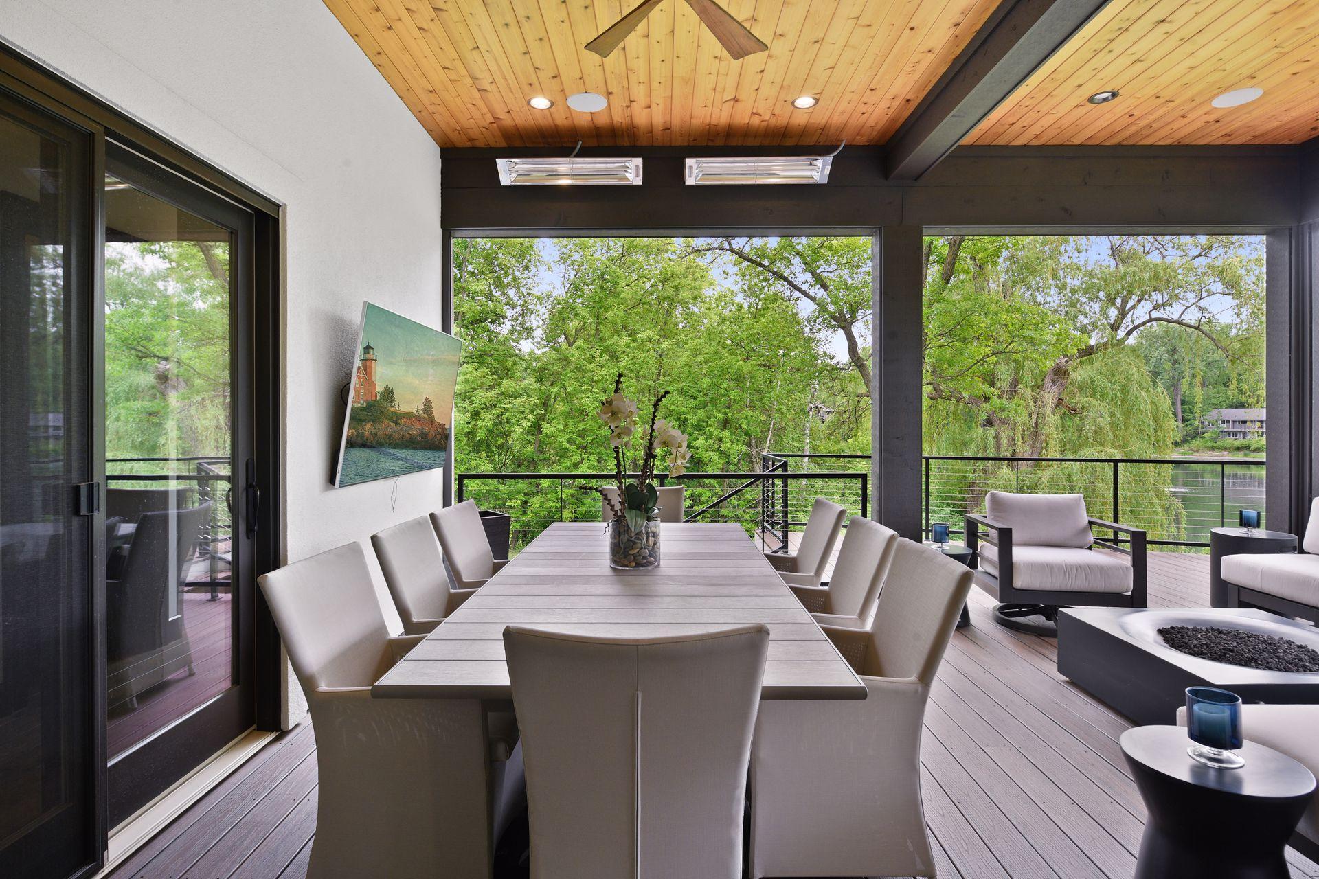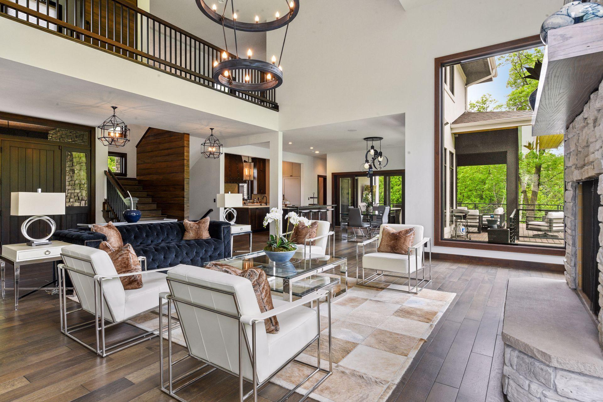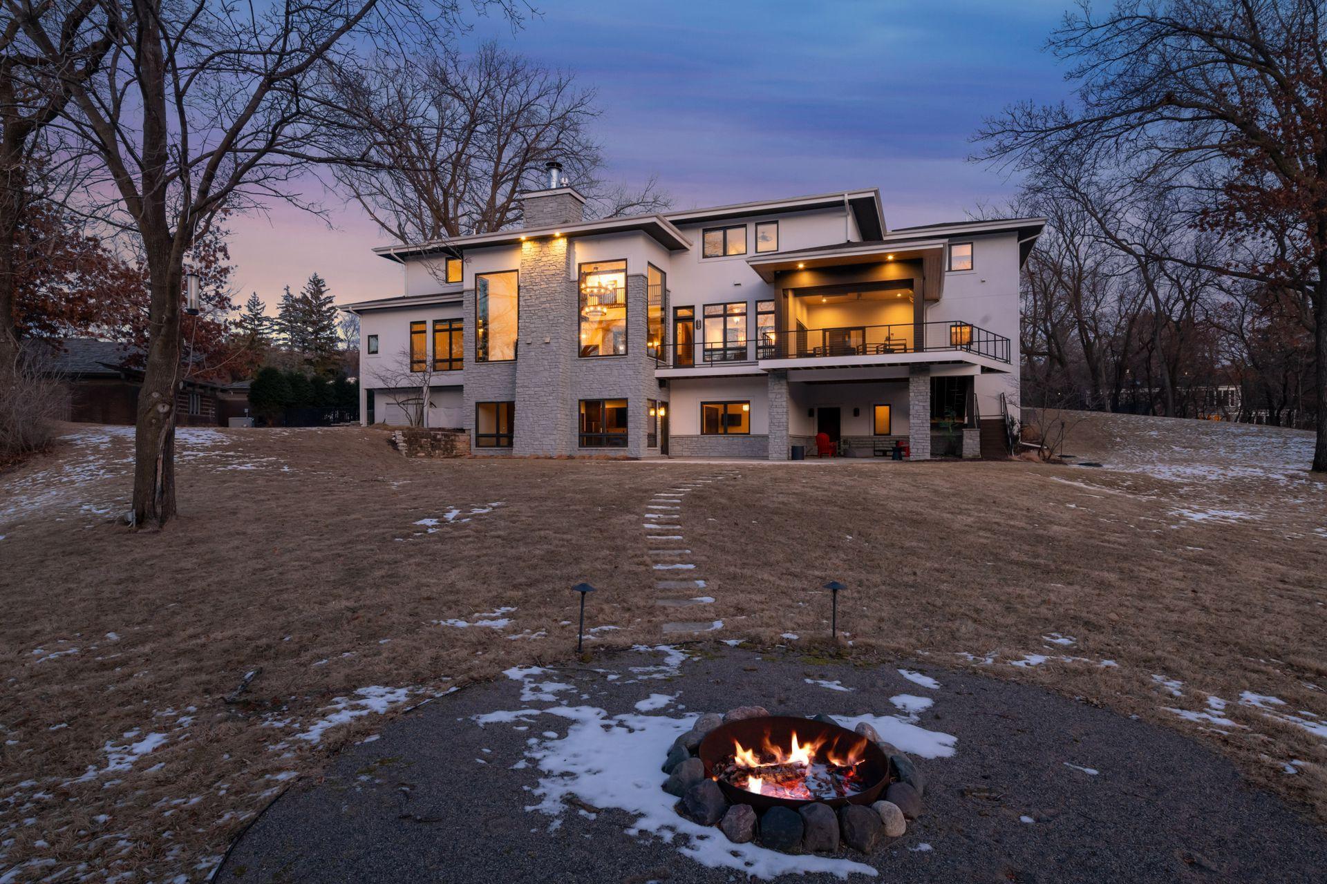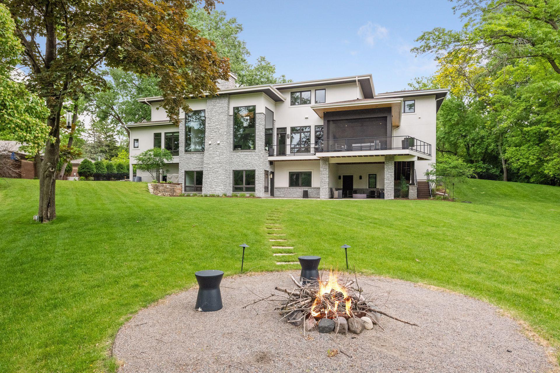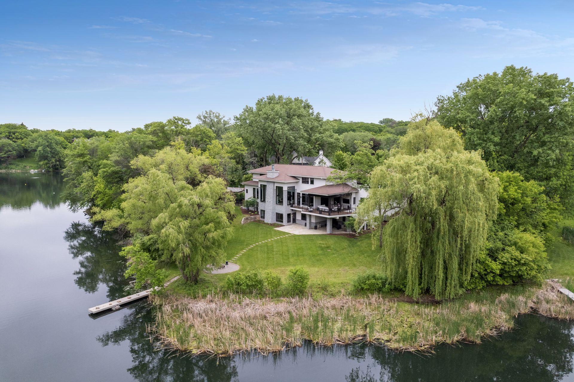 Located on a quiet cul-de-sac and set on a point, this 1.35-acre site has 220 feet of spring-fed water on Indianhead Lake. An extensive $300,000 remodel and update included adding the largest Marvin windows with views of the lake, 400+ bottle refrigerated wine cellar, wood floors in the basement, and the entire house inside and exterior painted. A blend of hand-crafted finishes blends both rustic yet modern symmetry. The open floor plan offers very high ceilings. A highlight is certainly the large main level deck with phantom screens, gas fireplace, television, stairs to the lakeside fire pit, and space for an outdoor dining and living room setup. The fully appointed main level primary suite is very private, while the upper level is dedicated to secondary bedrooms, an office, and plenty of space to stretch out. The walkout lower level features a sport court with an "About Golf" simulator as well as a fitness room, sauna, family room, and dedicated theatre room. Heated floors throughout many parts of house including the garage, basement and primary bath. This highly automated home can be run from your cell phone. The neighborhood is a great area for walking and biking, and is close to the Braemar sports complex, highly rated Edina Schools, and shopping and dining.