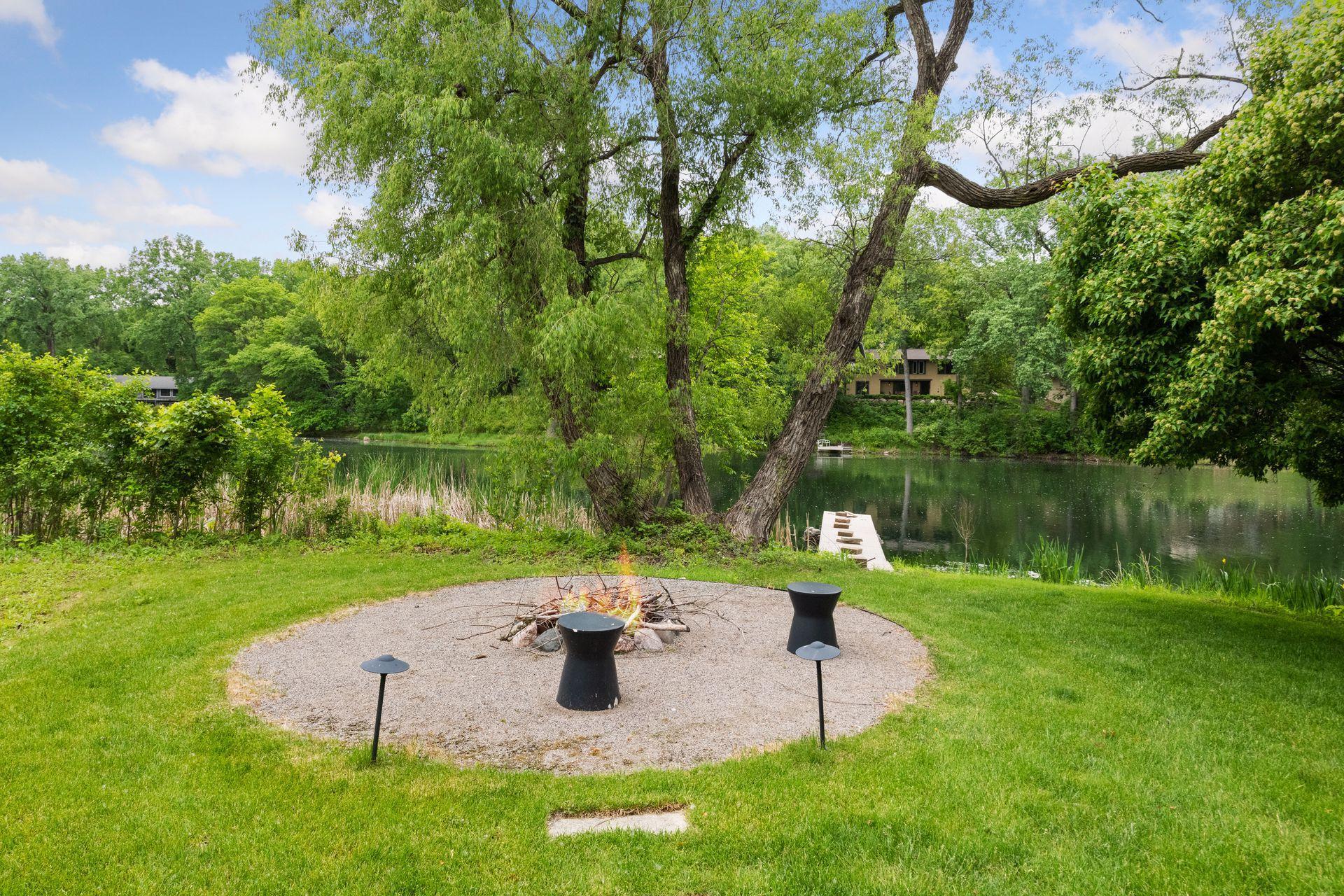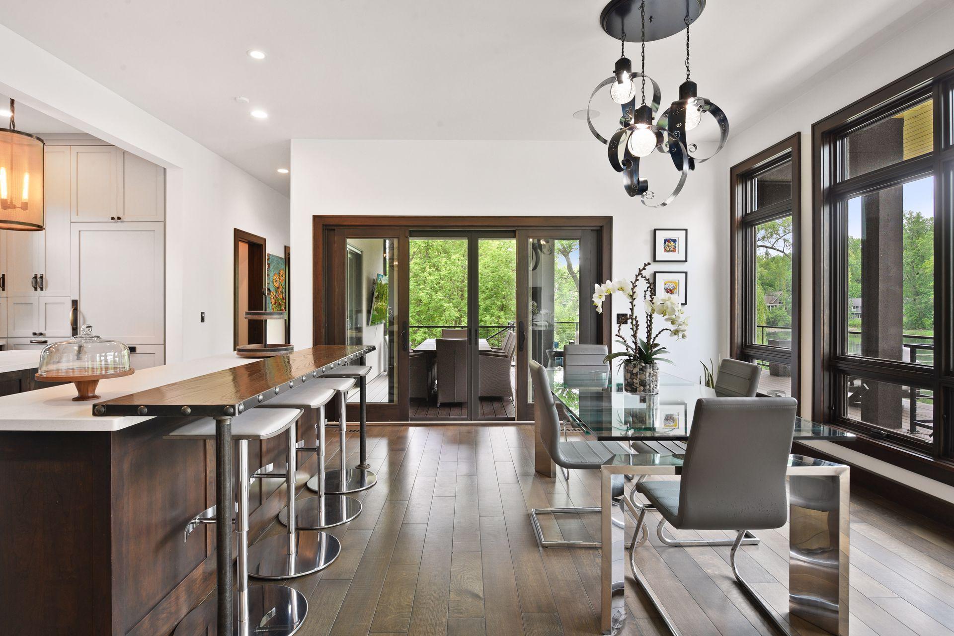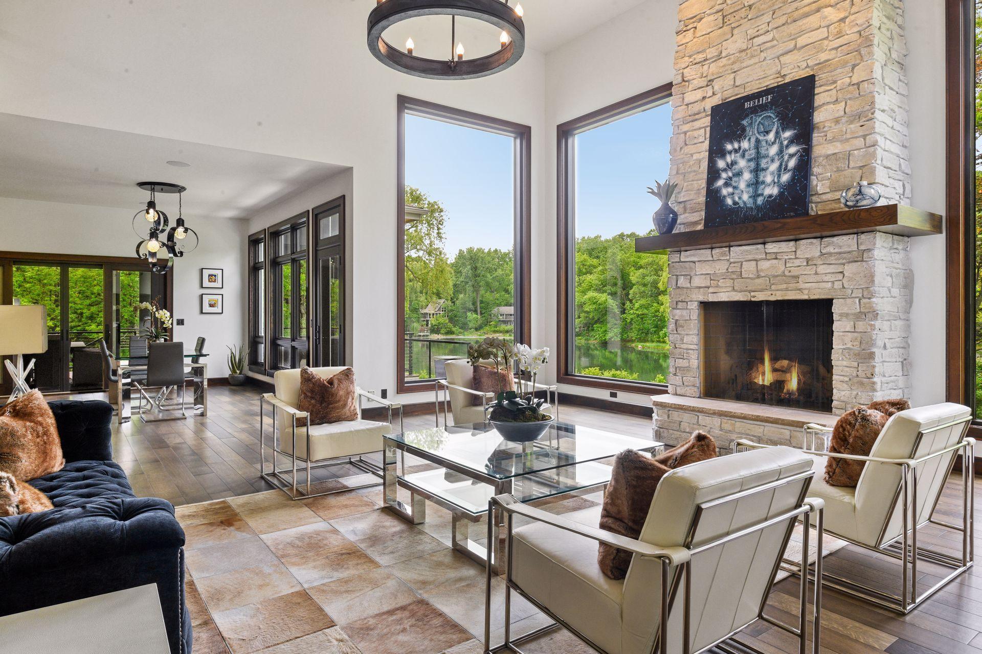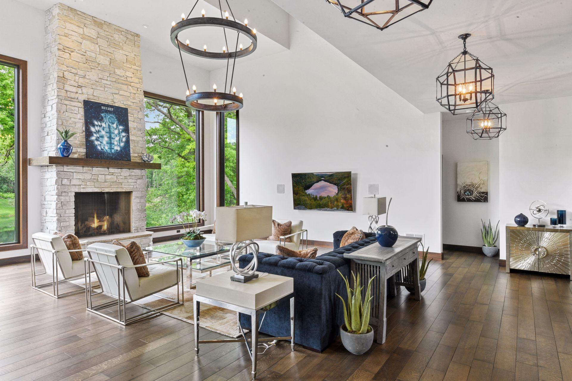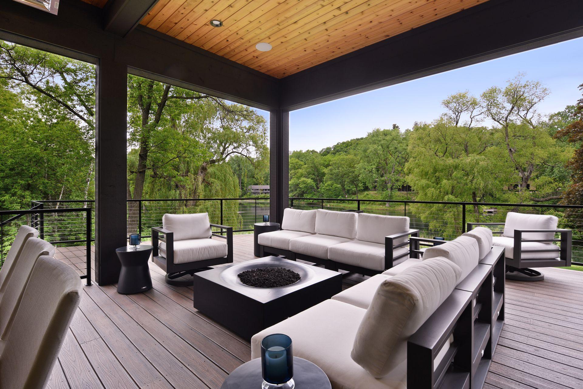 Located on a quiet cul-de-sac and set on a point, this 1.35-acre site has 220 feet of spring-fed water on Indianhead Lake. An extensive $300,000 remodel and update included adding the largest Marvin windows with views of the lake, 400+ bottle refrigerated wine cellar, wood floors in the basement, and the entire house inside and exterior painted. A blend of hand-crafted finishes blends both rustic yet modern symmetry. The open floor plan offers very high ceilings. A highlight is certainly the large main level deck with phantom screens, gas fireplace, television, stairs to the lakeside fire pit, and space for an outdoor dining and living room setup. The fully appointed main level primary suite is very private, while the upper level is dedicated to secondary bedrooms, an office, and plenty of space to stretch out. The walkout lower level features a sport court with an "About Golf" simulator as well as a fitness room, sauna, family room, and dedicated theatre room. Heated floors throughout many parts of house including the garage, basement and primary bath. This highly automated home can be run from your cell phone. The neighborhood is a great area for walking and biking, and is close to the Braemar sports complex, highly rated Edina Schools, and shopping and dining.