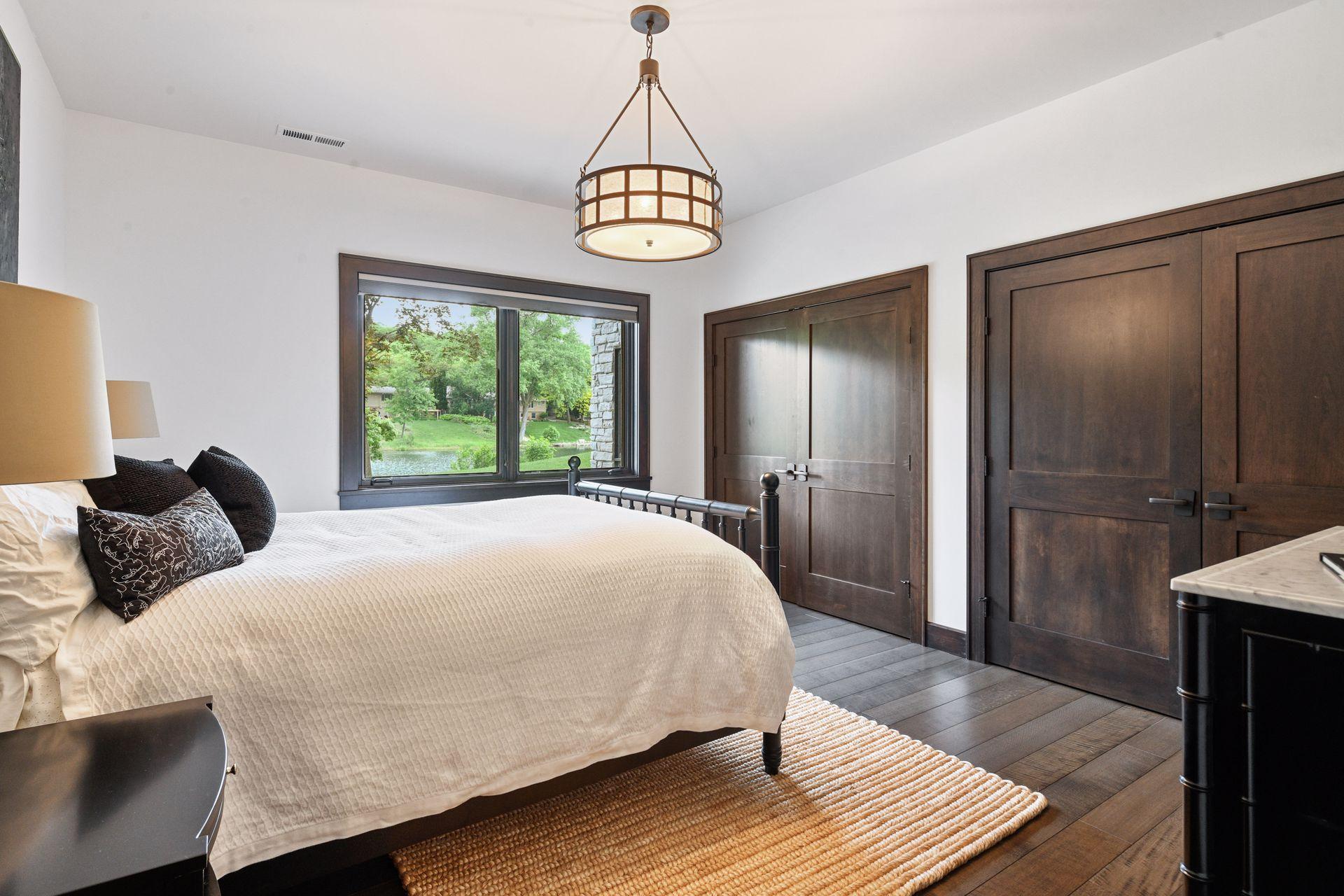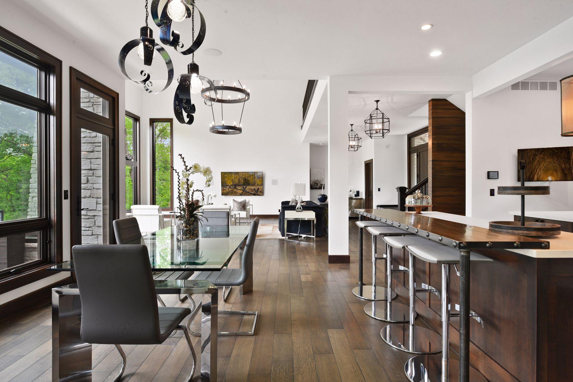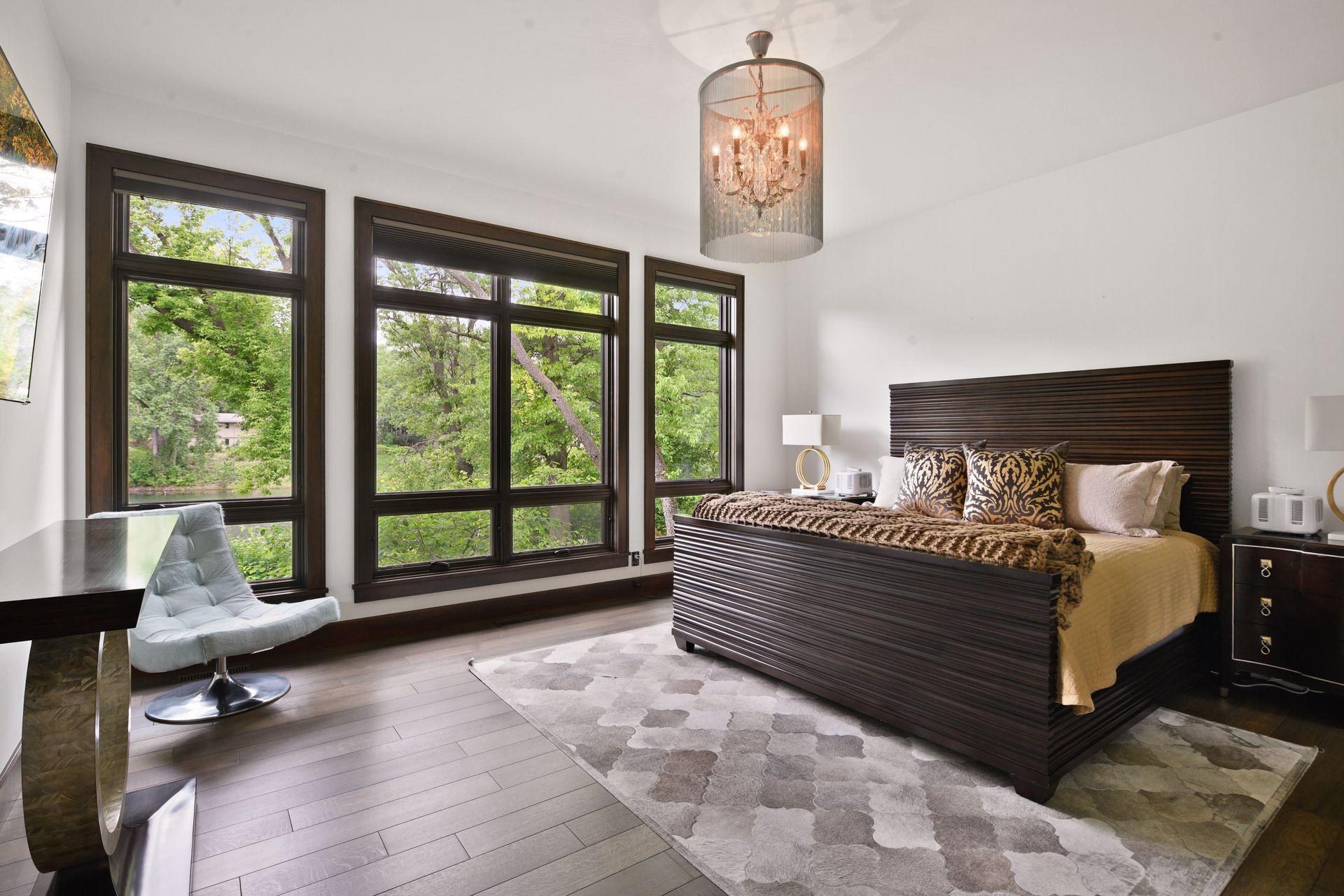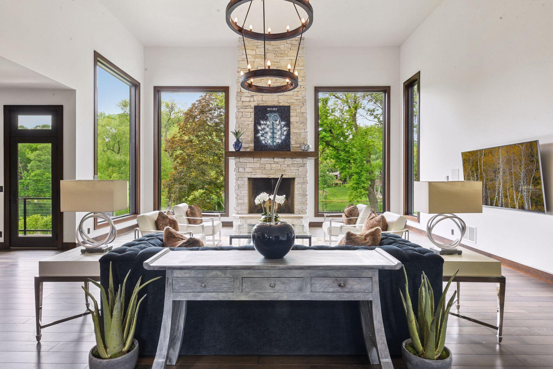 Located on a quiet cul-de-sac and set on a point, this 1.35-acre site has 220 feet of spring-fed water on Indianhead Lake. An extensive $300,000 remodel and update included adding the largest Marvin windows with views of the lake, 400+ bottle refrigerated wine cellar, wood floors in the basement, and the entire house inside and exterior painted. A blend of hand-crafted finishes blends both rustic yet modern symmetry. The open floor plan offers very high ceilings. A highlight is certainly the large main level deck with phantom screens, gas fireplace, television, stairs to the lakeside fire pit, and space for an outdoor dining and living room setup. The fully appointed main level primary suite is very private, while the upper level is dedicated to secondary bedrooms, an office, and plenty of space to stretch out. The walkout lower level features a sport court with an "About Golf" simulator as well as a fitness room, sauna, family room, and dedicated theatre room. Heated floors throughout many parts of house including the garage, basement and primary bath. This highly automated home can be run from your cell phone. The neighborhood is a great area for walking and biking, and is close to the Braemar sports complex, highly rated Edina Schools, and shopping and dining.