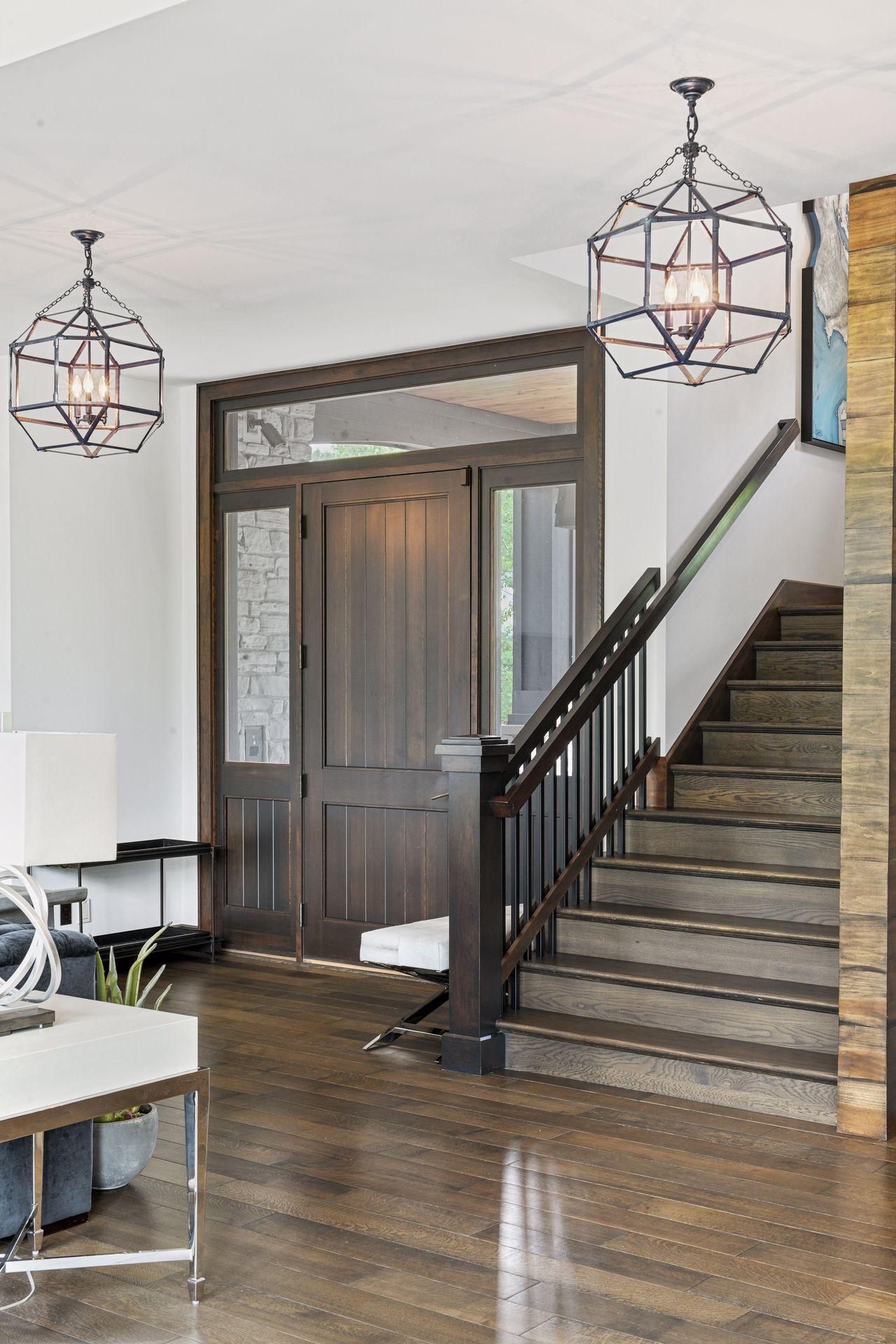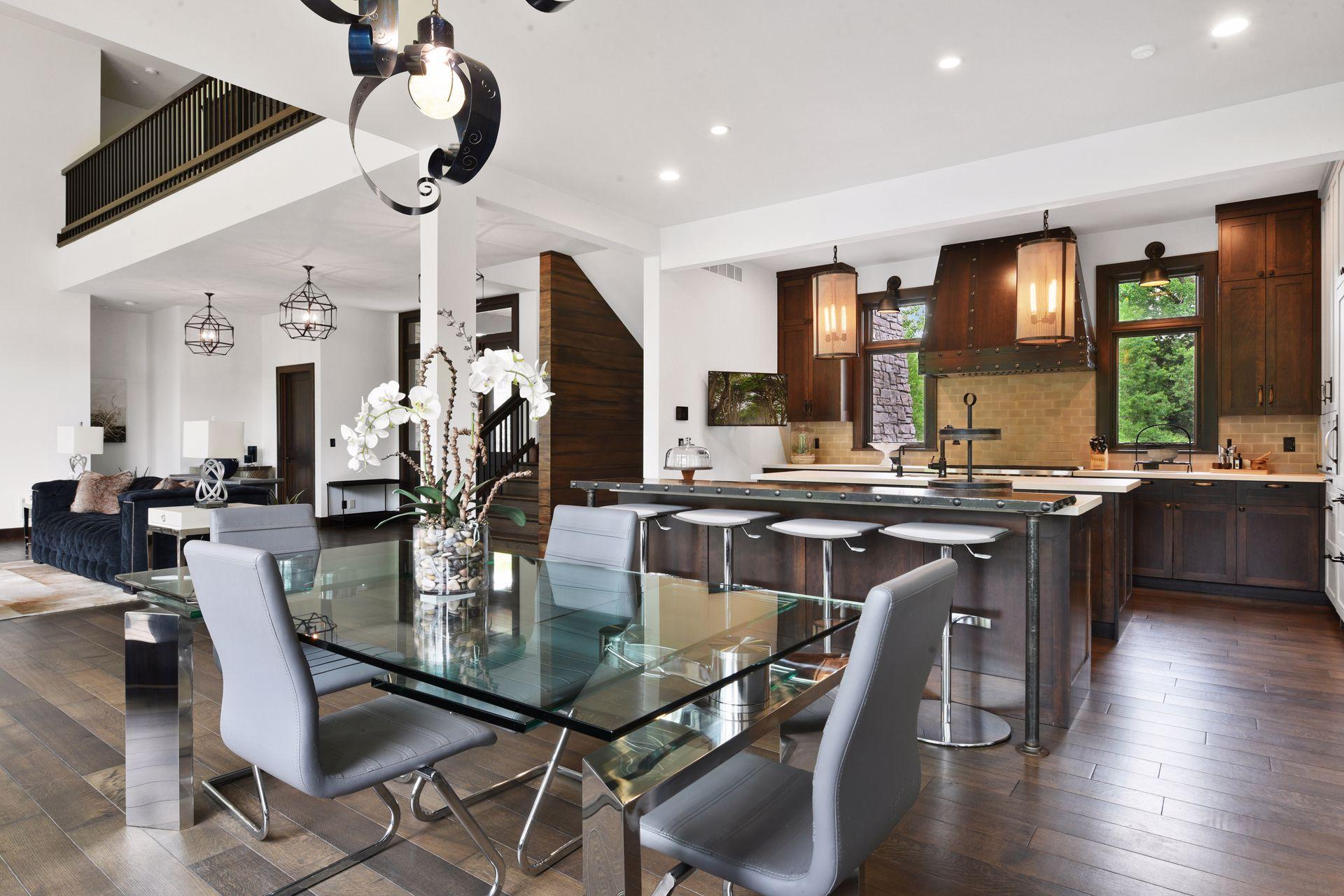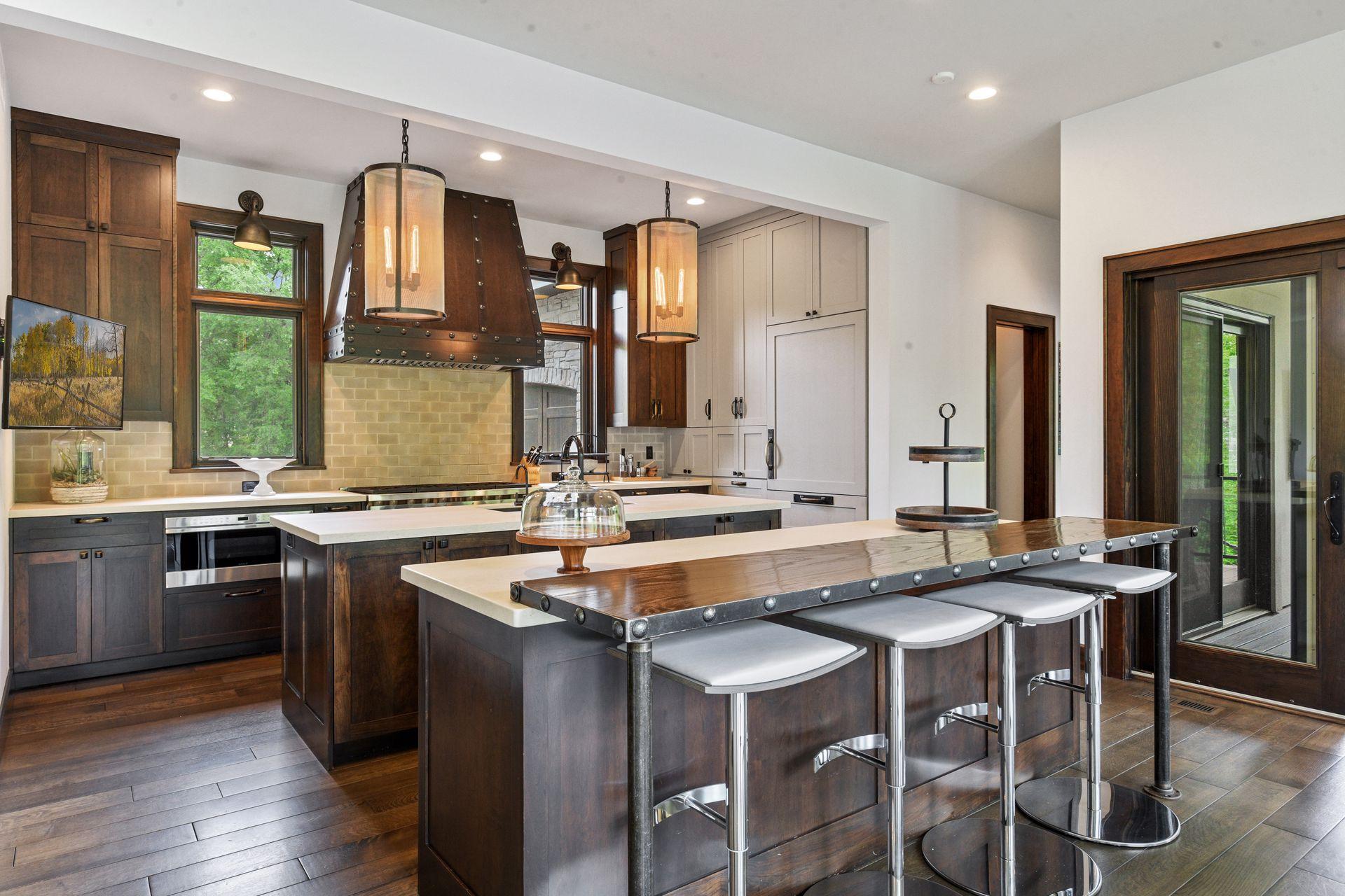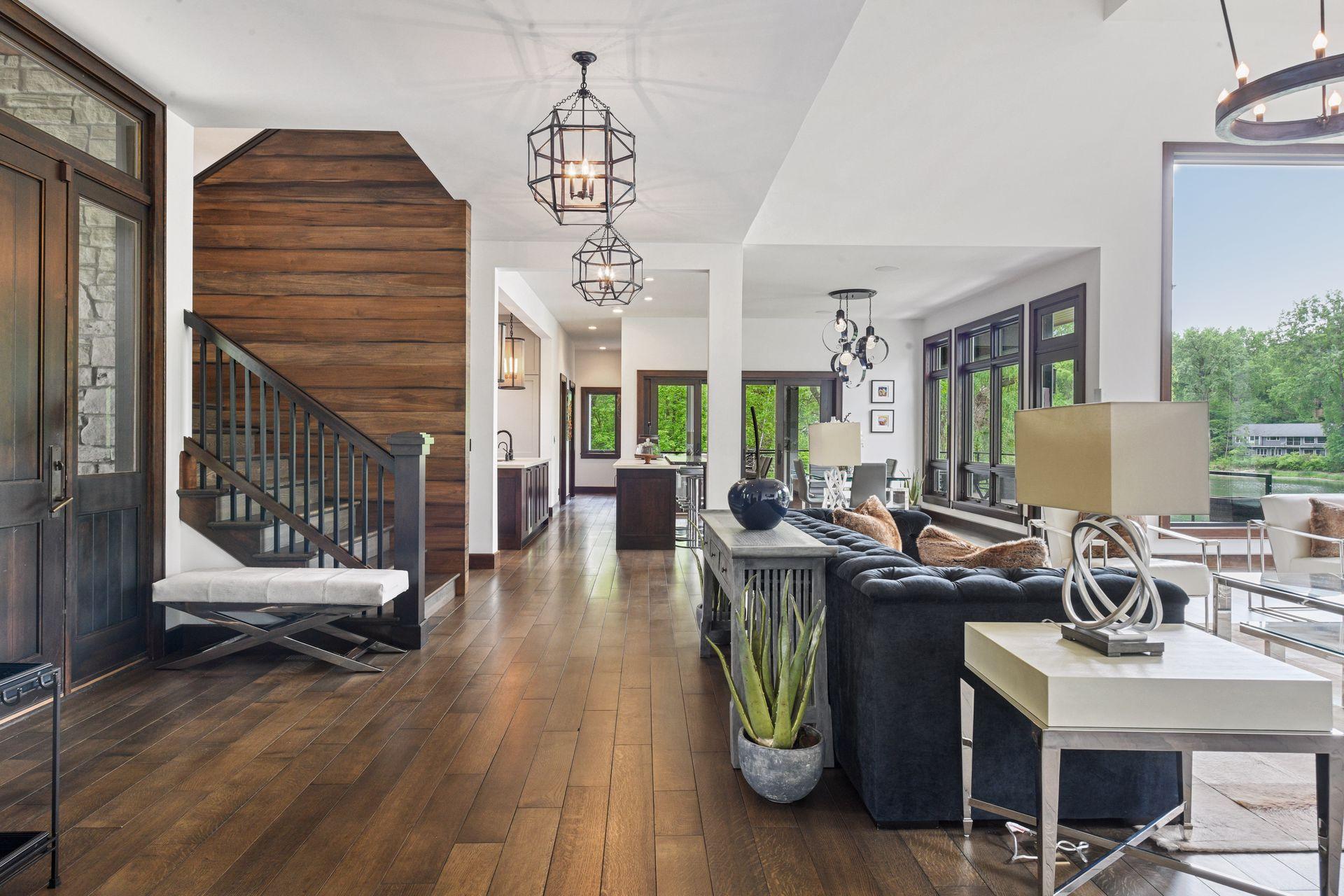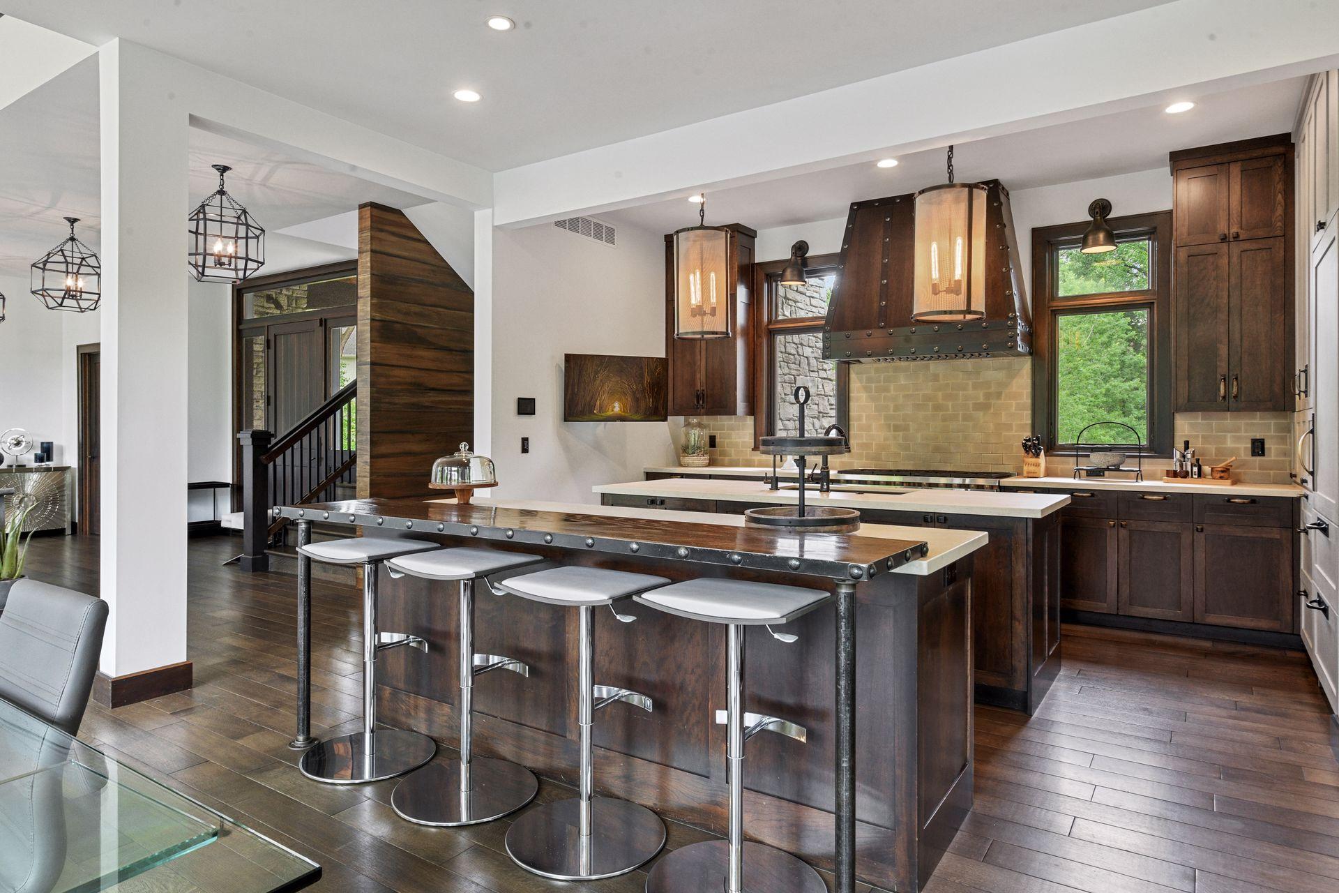Located on a quiet cul-de-sac and set on a point, this 1.35-acre site has 220 feet of spring-fed water on Indianhead Lake. An extensive $300,000 remodel and update included adding the largest Marvin windows with views of the lake, 400+ bottle refrigerated wine cellar, wood floors in the basement, and the entire house inside and exterior painted. A blend of hand-crafted finishes blends both rustic yet modern symmetry. The open floor plan offers very high ceilings. A highlight is certainly the large main level deck with phantom screens, gas fireplace, television, stairs to the lakeside fire pit, and space for an outdoor dining and living room setup. The fully appointed main level primary suite is very private, while the upper level is dedicated to secondary bedrooms, an office, and plenty of space to stretch out. The walkout lower level features a sport court with an "About Golf" simulator as well as a fitness room, sauna, family room, and dedicated theatre room. Heated floors throughout many parts of house including the garage, basement and primary bath. This highly automated home can be run from your cell phone. The neighborhood is a great area for walking and biking, and is close to the Braemar sports complex, highly rated Edina Schools, and shopping and dining.