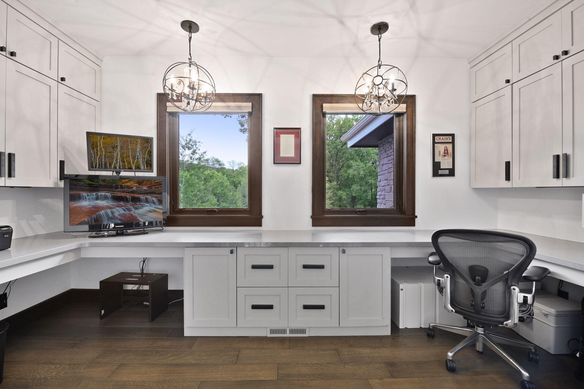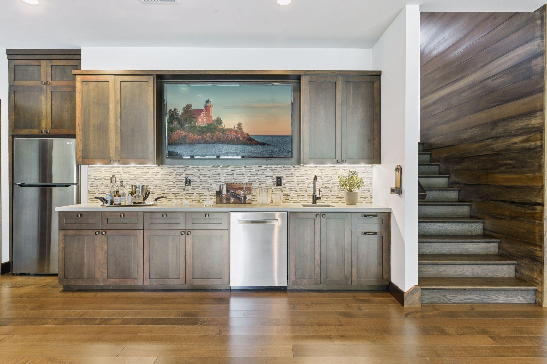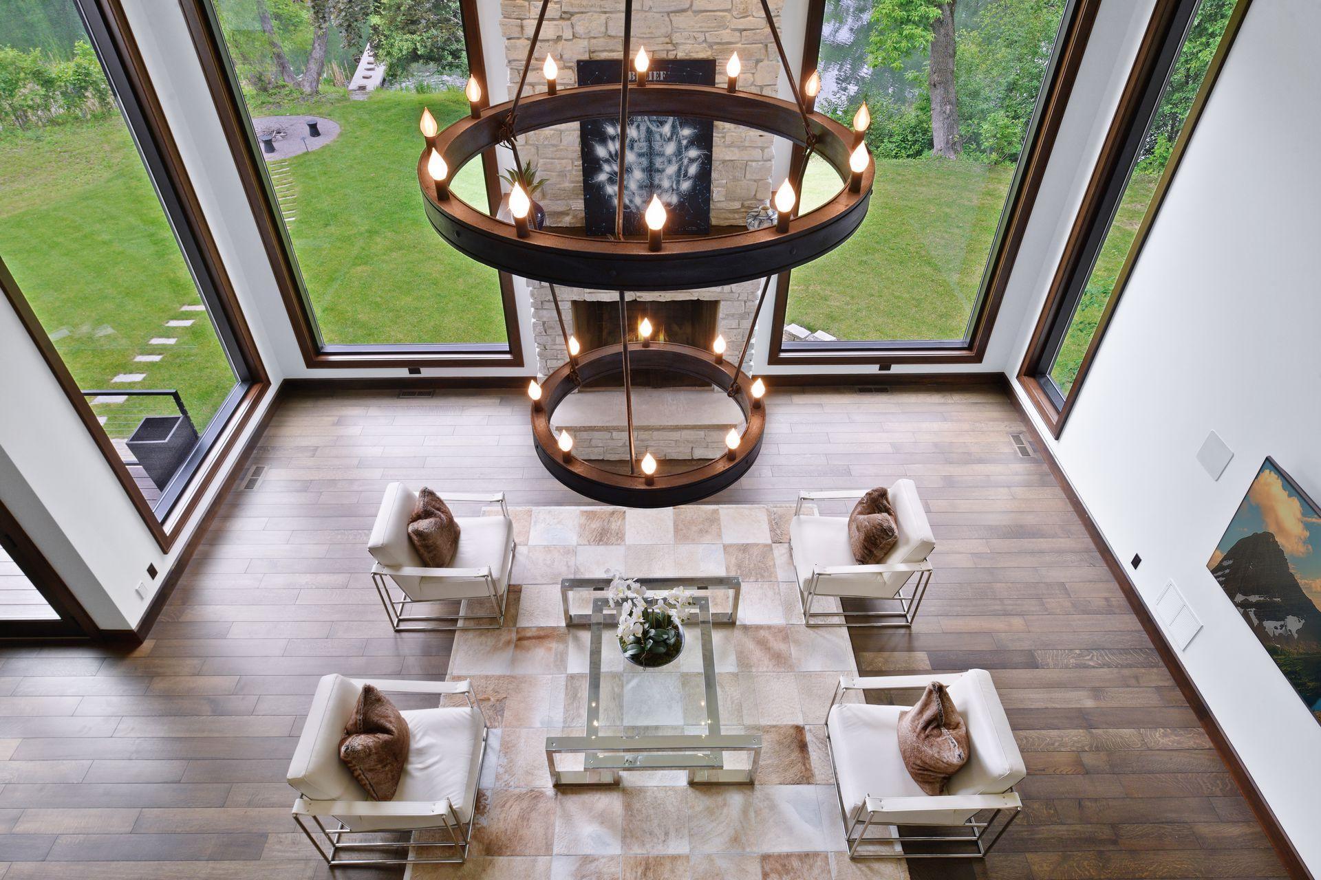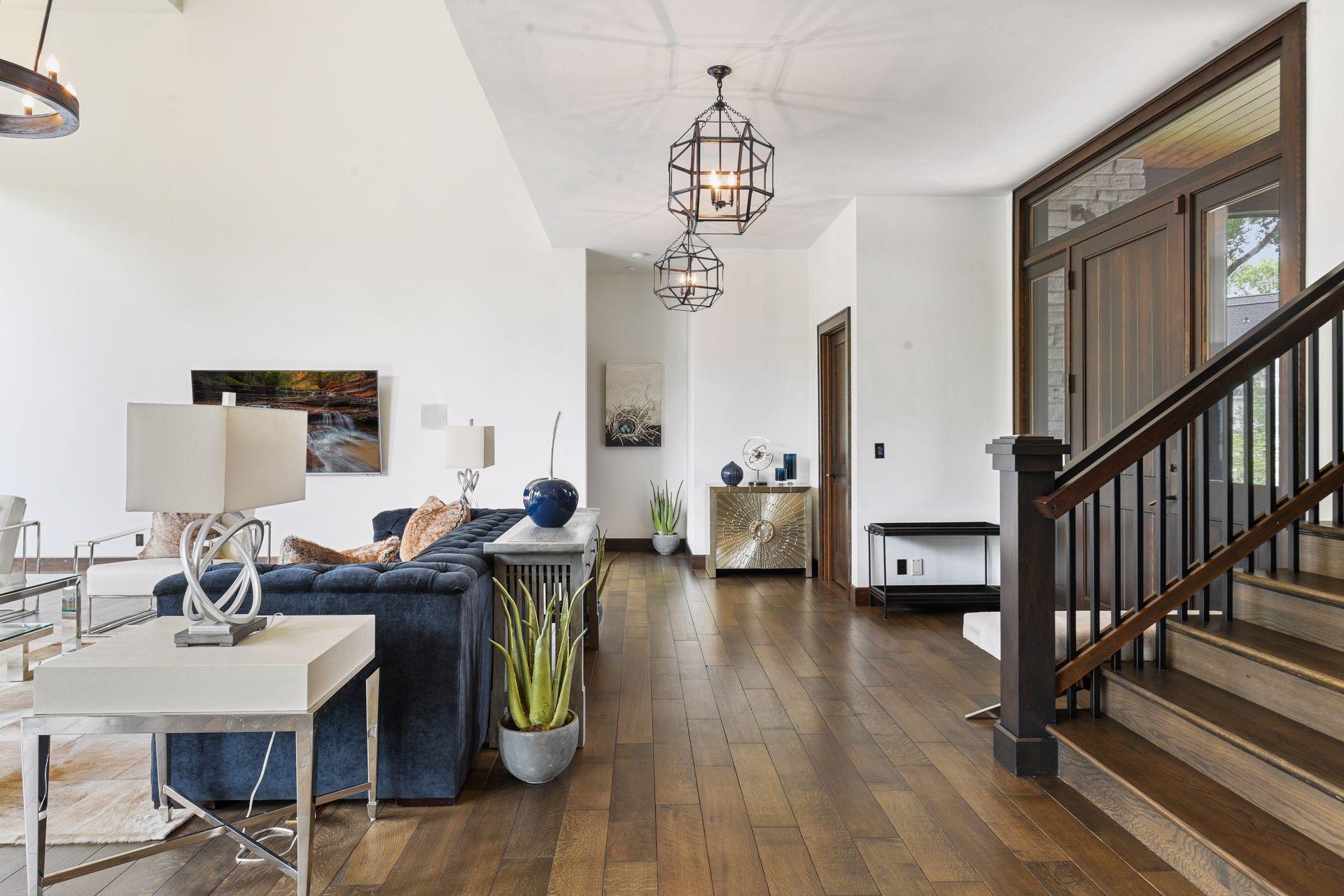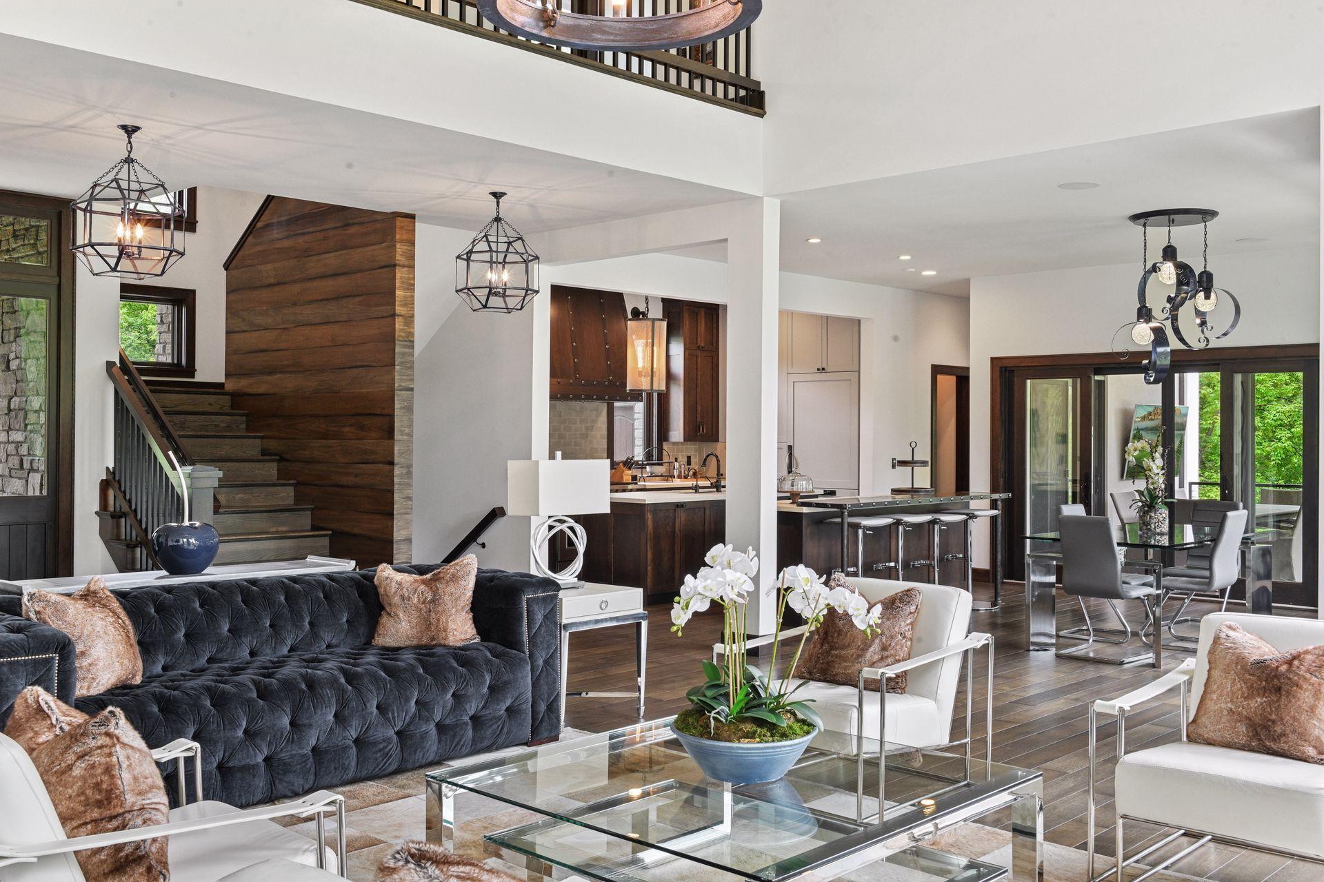 Located on a quiet cul-de-sac and set on a point, this 1.35-acre site has 220 feet of spring-fed water on Indianhead Lake. An extensive $300,000 remodel and update included adding the largest Marvin windows with views of the lake, 400+ bottle refrigerated wine cellar, wood floors in the basement, and the entire house inside and exterior painted. A blend of hand-crafted finishes blends both rustic yet modern symmetry. The open floor plan offers very high ceilings. A highlight is certainly the large main level deck with phantom screens, gas fireplace, television, stairs to the lakeside fire pit, and space for an outdoor dining and living room setup. The fully appointed main level primary suite is very private, while the upper level is dedicated to secondary bedrooms, an office, and plenty of space to stretch out. The walkout lower level features a sport court with an "About Golf" simulator as well as a fitness room, sauna, family room, and dedicated theatre room. Heated floors throughout many parts of house including the garage, basement and primary bath. This highly automated home can be run from your cell phone. The neighborhood is a great area for walking and biking, and is close to the Braemar sports complex, highly rated Edina Schools, and shopping and dining.