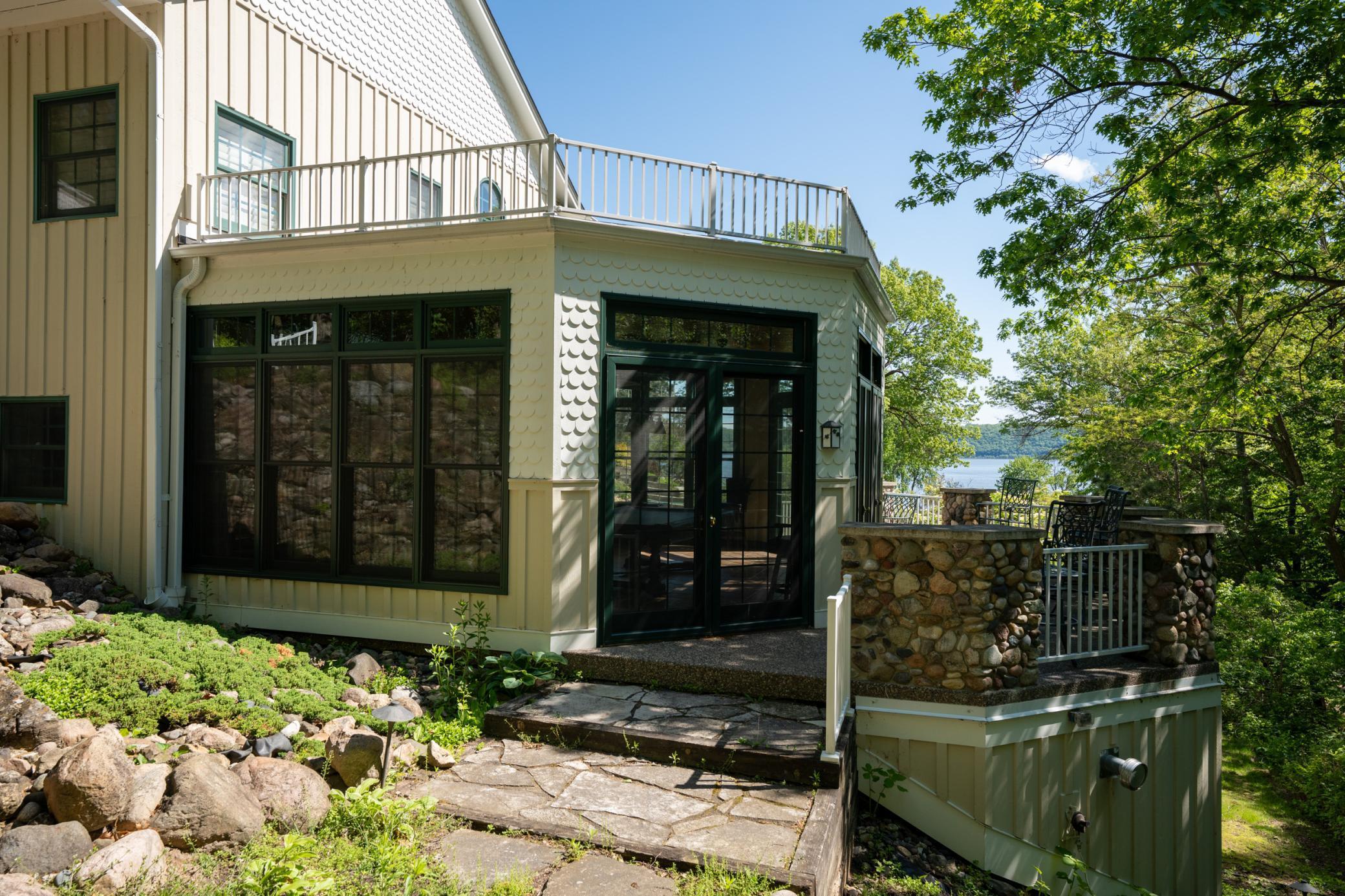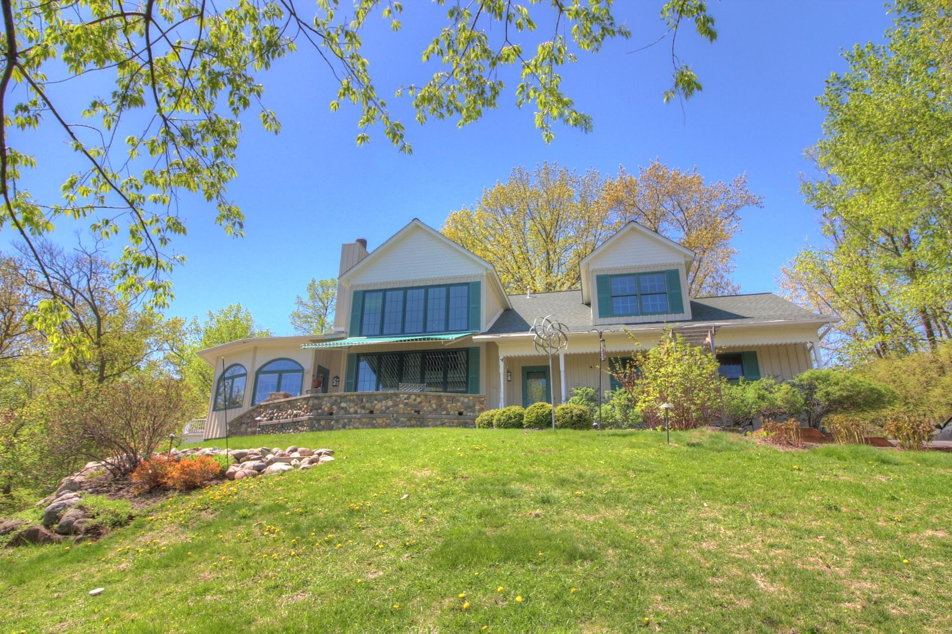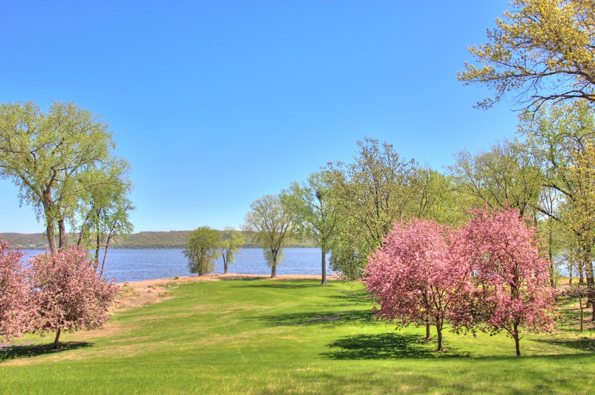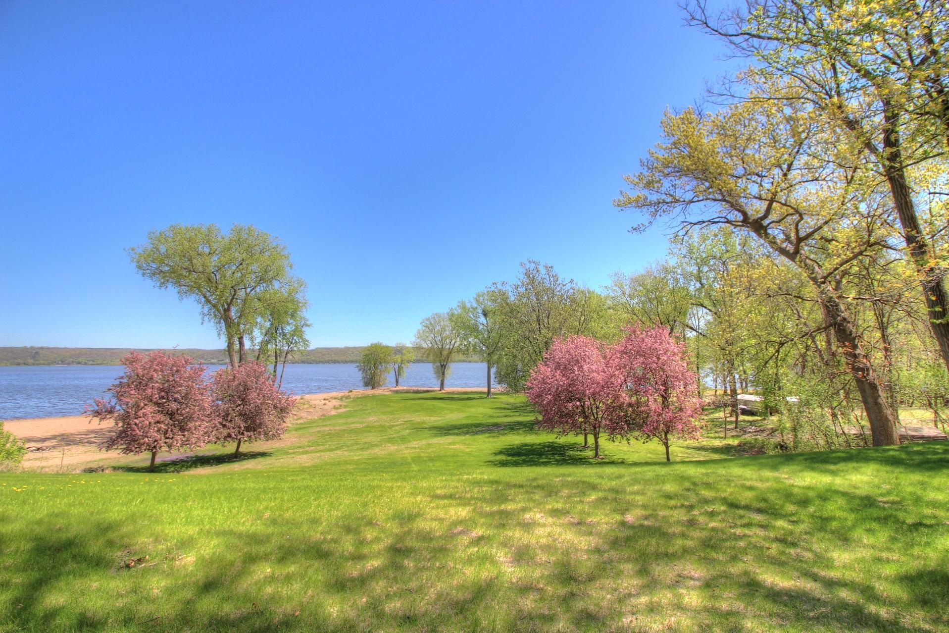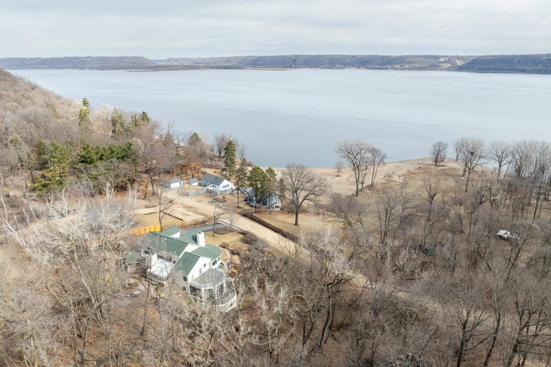 An amazing opportunity to own this 3.68-acre Old Frontenac estate with over 200 ft of sandy beach frontage on gorgeous Lake Pepin/Mississippi River. Ennjoy fishing, swimming, boating, kayaking and more right out your front door. Your backyard is 2600 acre Frontenac State Park that includes 17 miles of hiking and cross country ski trails, camping and the highest bird species count of any park in the state. Custom designed 4 bedroom, 4 bath home with over 5200 sq. ft. of finished living space and panoramic river and bluff land views. Main level includes a vaulted living room with fireplace and floor to ceiling windows, a formal dining room, library, a sun-filled conservatory with in-floor heat, auto ceiling blinds and a gas fireplace, eat-in kitchen with center island/breakfast bar, informal dining with a wood burning fireplace and built in desk, primary bedroom suite with multiple closets and a full bath with hot tub, adjacent sun room/office with fireplace, 1/2 bath, foyer and mud room. Mudroom has space for future washer/dryer but hookups are not yet installed. Upper level includes 3 bedrooms and a 3/4 bath with tiled shower. In the lower level, you'll find family room/den with a beautiful built-in entertainment center, 3/4 bath, a billiards room with gas fireplace, laundry, storage, and utility room. Attached 2 car garage with a 3rd (tuck-under, insulated and heated) garage with plenty of space (504 sq. ft.) for additional toys and workshop. Front, rear and side stone patio areas and a dining deck. Private and wooded backyard with attractive landscaping, rock garden, fountain, and rock steps. Front yard is an expansive 3 acre lawn that rolls gently down to over 200 ft. of sandy beach shoreline with phenomenal views in all directions. You also have the privilege of watching an active bald eagle nest high in a tree close to the water. 1 hour to MSP; 40 minutes to Rochester. Surrounded by Frontenac State Park and Lake Pepin, Old Frontenac was founded in the 1850s and retains a gentle, peaceful ambience of the past. This property offers a quiet and private lifestyle in a charming, unique and historic community.