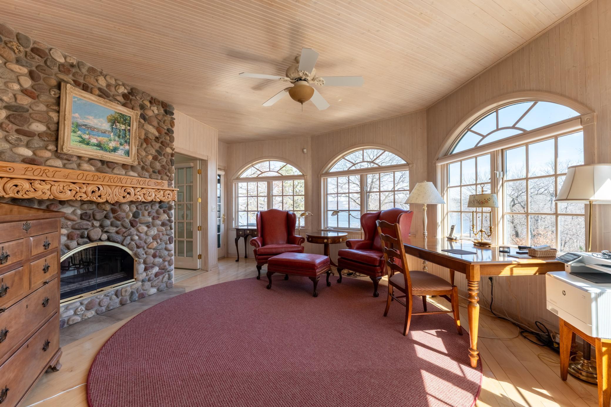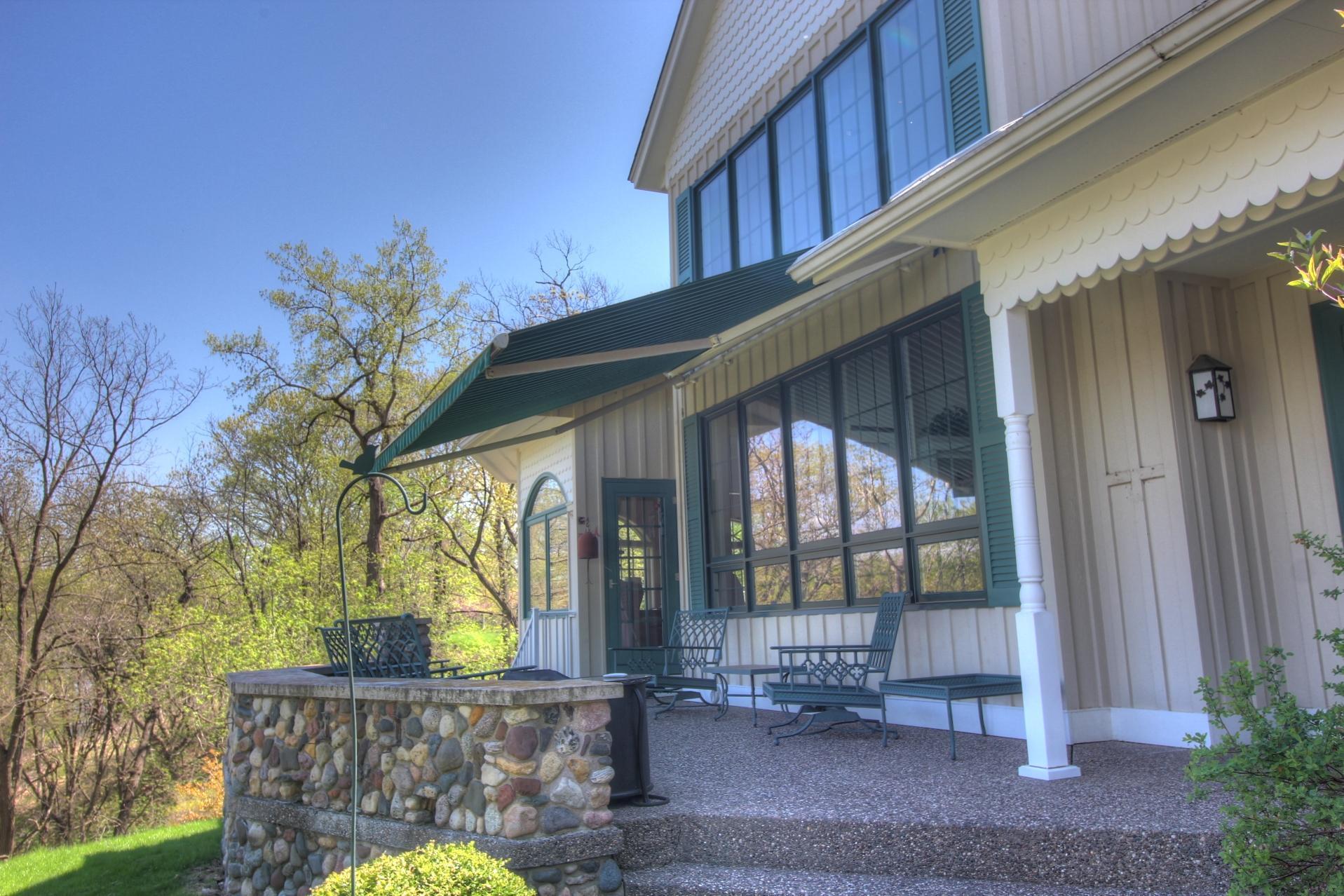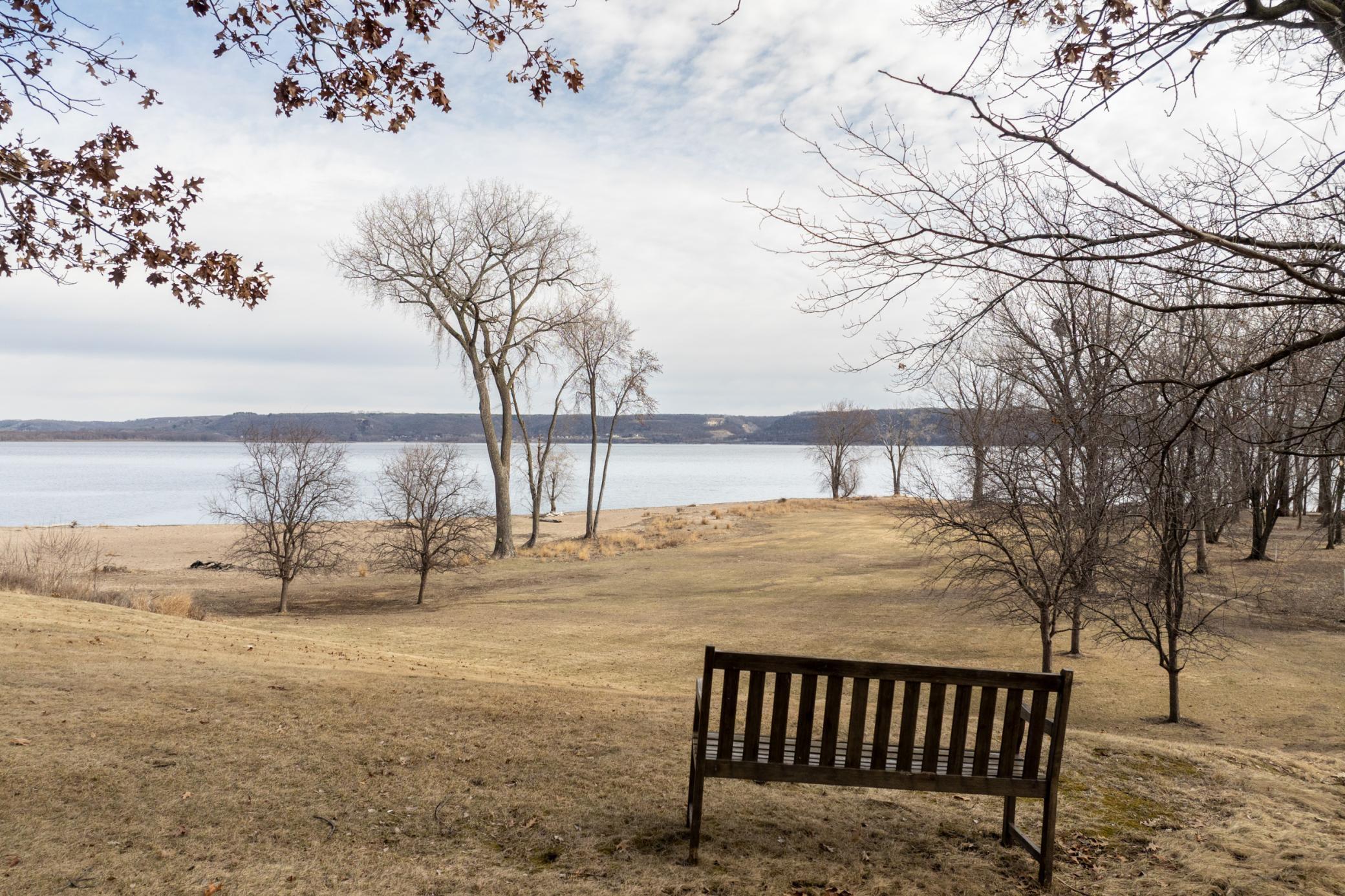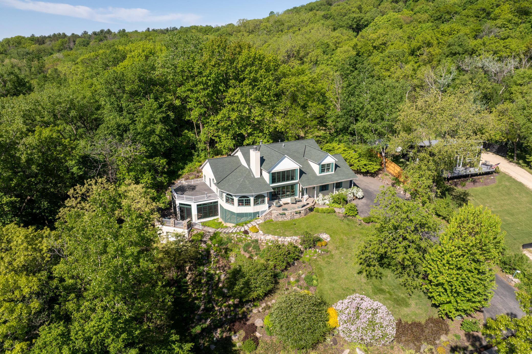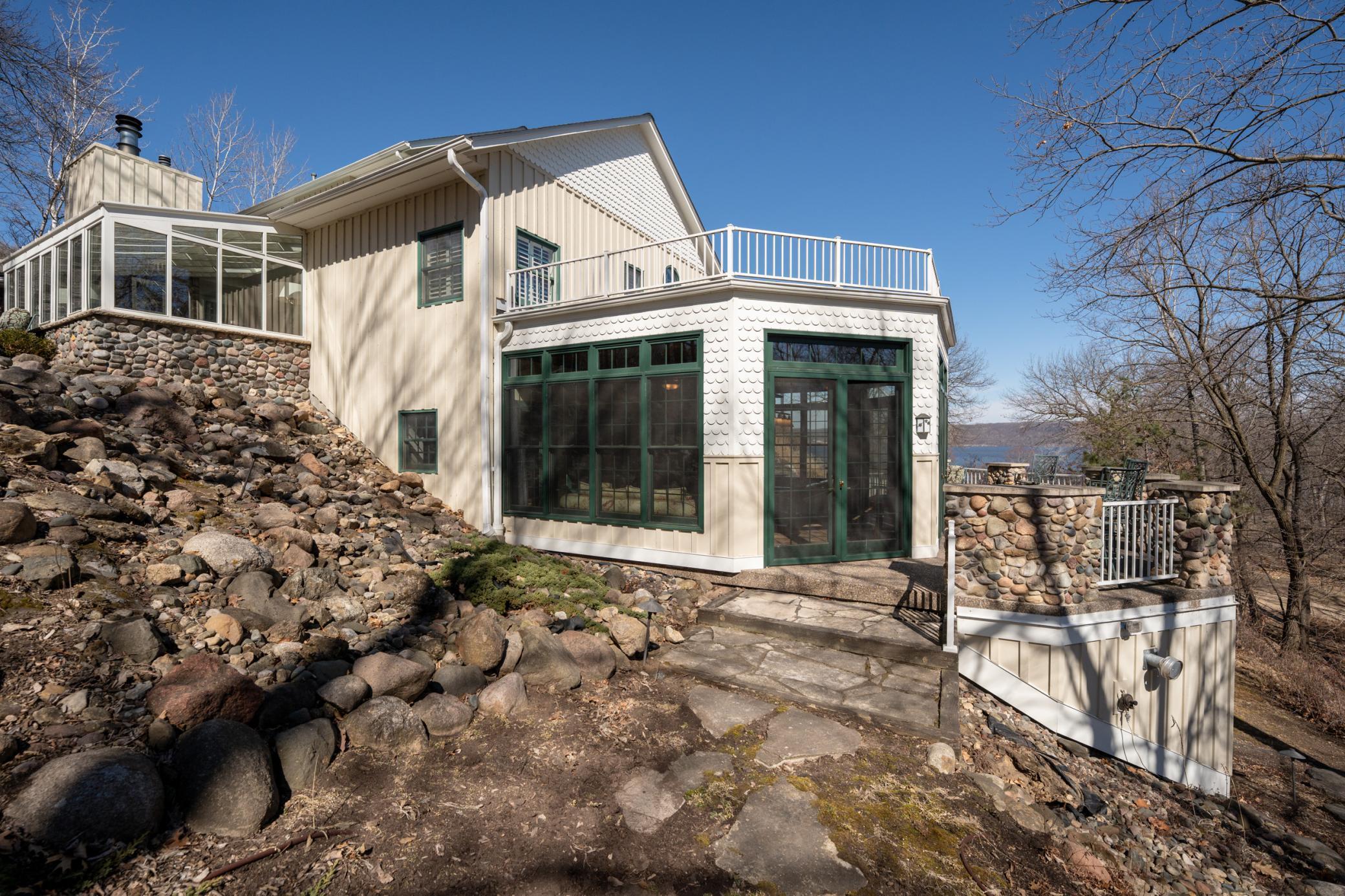 An amazing opportunity to own this 3.68-acre Old Frontenac estate with over 200 ft of sandy beach frontage on gorgeous Lake Pepin/Mississippi River. Ennjoy fishing, swimming, boating, kayaking and more right out your front door. Your backyard is 2600 acre Frontenac State Park that includes 17 miles of hiking and cross country ski trails, camping and the highest bird species count of any park in the state. Custom designed 4 bedroom, 4 bath home with over 5200 sq. ft. of finished living space and panoramic river and bluff land views. Main level includes a vaulted living room with fireplace and floor to ceiling windows, a formal dining room, library, a sun-filled conservatory with in-floor heat, auto ceiling blinds and a gas fireplace, eat-in kitchen with center island/breakfast bar, informal dining with a wood burning fireplace and built in desk, primary bedroom suite with multiple closets and a full bath with hot tub, adjacent sun room/office with fireplace, 1/2 bath, foyer and mud room. Mudroom has space for future washer/dryer but hookups are not yet installed. Upper level includes 3 bedrooms and a 3/4 bath with tiled shower. In the lower level, you'll find family room/den with a beautiful built-in entertainment center, 3/4 bath, a billiards room with gas fireplace, laundry, storage, and utility room. Attached 2 car garage with a 3rd (tuck-under, insulated and heated) garage with plenty of space (504 sq. ft.) for additional toys and workshop. Front, rear and side stone patio areas and a dining deck. Private and wooded backyard with attractive landscaping, rock garden, fountain, and rock steps. Front yard is an expansive 3 acre lawn that rolls gently down to over 200 ft. of sandy beach shoreline with phenomenal views in all directions. You also have the privilege of watching an active bald eagle nest high in a tree close to the water. 1 hour to MSP; 40 minutes to Rochester. Surrounded by Frontenac State Park and Lake Pepin, Old Frontenac was founded in the 1850s and retains a gentle, peaceful ambience of the past. This property offers a quiet and private lifestyle in a charming, unique and historic community.