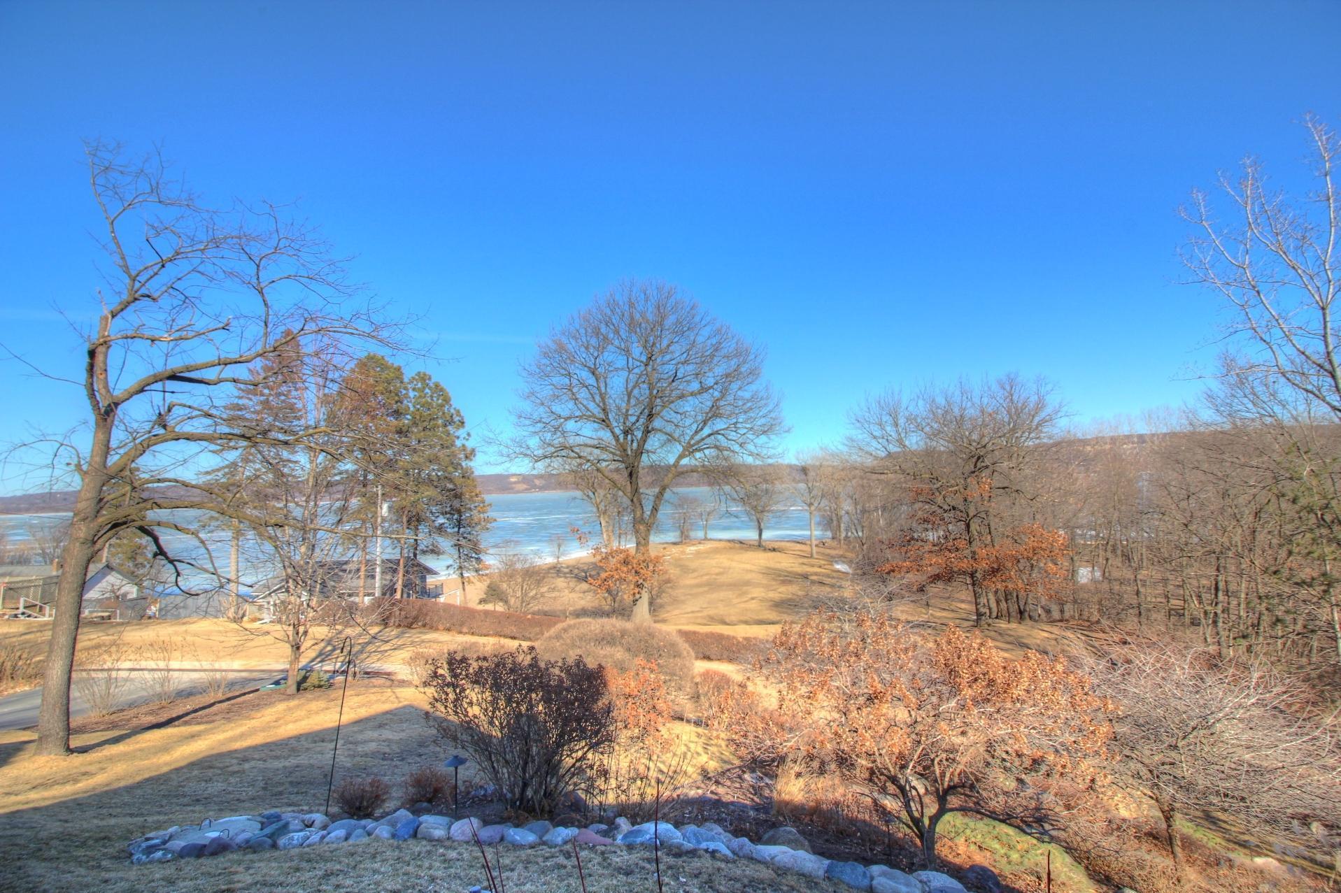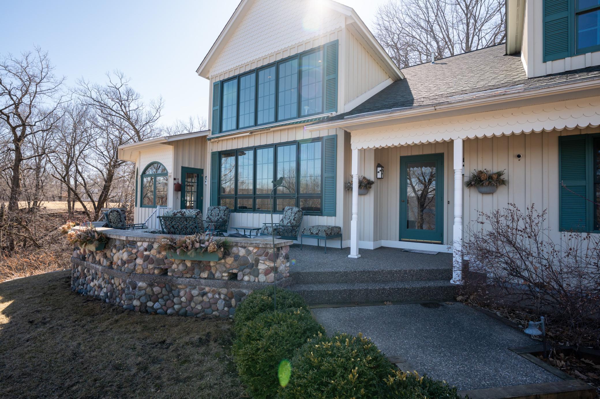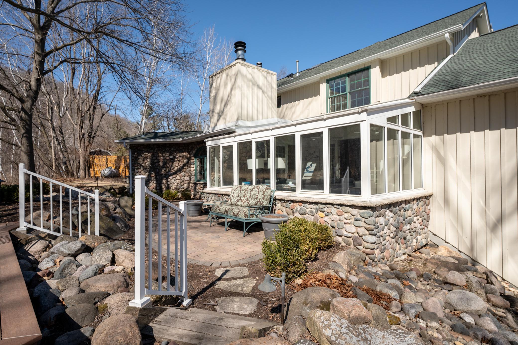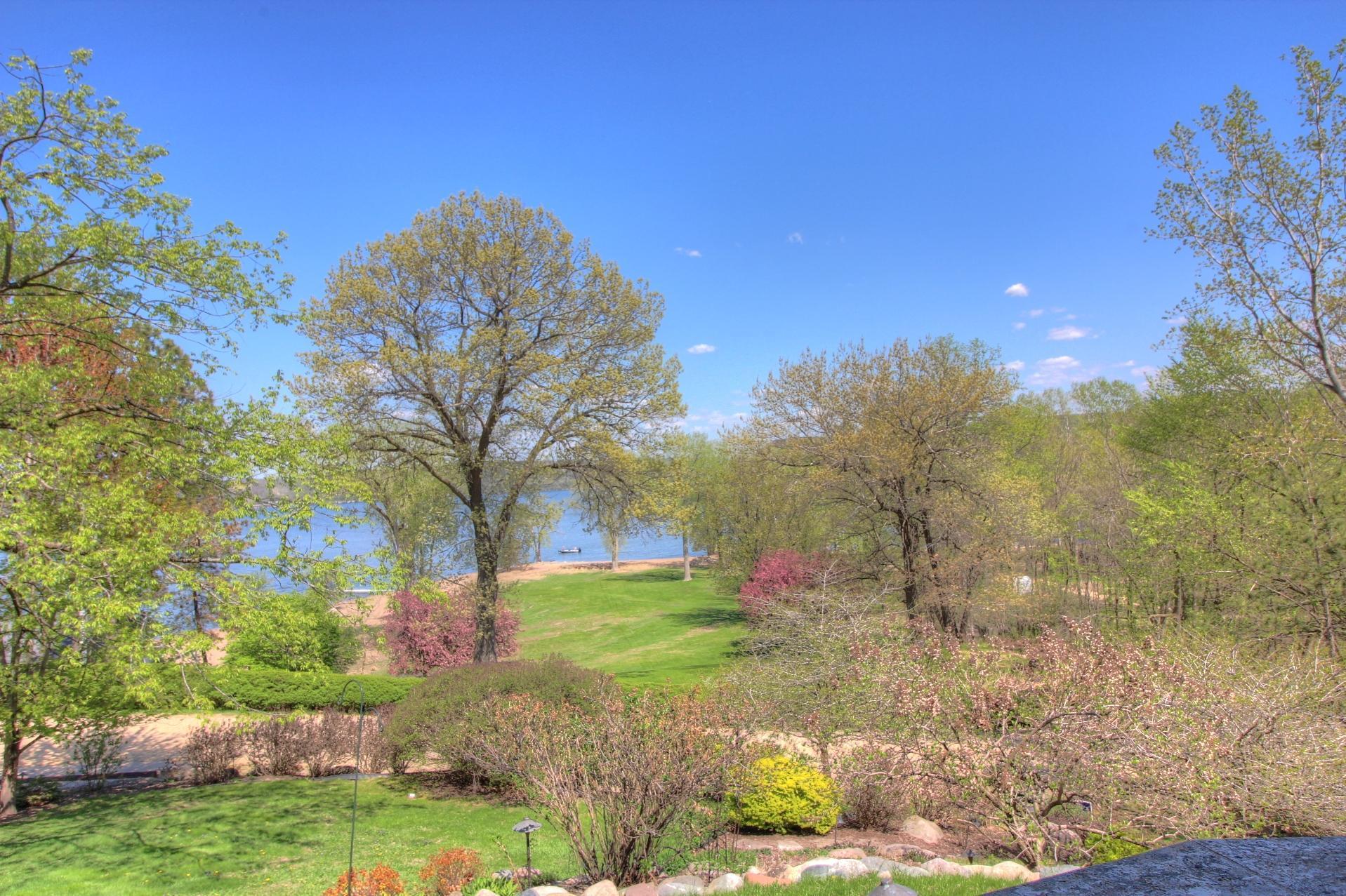 An amazing opportunity to own this 3.68-acre Old Frontenac estate with over 200 ft of sandy beach frontage on gorgeous Lake Pepin/Mississippi River. Ennjoy fishing, swimming, boating, kayaking and more right out your front door. Your backyard is 2600 acre Frontenac State Park that includes 17 miles of hiking and cross country ski trails, camping and the highest bird species count of any park in the state. Custom designed 4 bedroom, 4 bath home with over 5200 sq. ft. of finished living space and panoramic river and bluff land views. Main level includes a vaulted living room with fireplace and floor to ceiling windows, a formal dining room, library, a sun-filled conservatory with in-floor heat, auto ceiling blinds and a gas fireplace, eat-in kitchen with center island/breakfast bar, informal dining with a wood burning fireplace and built in desk, primary bedroom suite with multiple closets and a full bath with hot tub, adjacent sun room/office with fireplace, 1/2 bath, foyer and mud room. Mudroom has space for future washer/dryer but hookups are not yet installed. Upper level includes 3 bedrooms and a 3/4 bath with tiled shower. In the lower level, you'll find family room/den with a beautiful built-in entertainment center, 3/4 bath, a billiards room with gas fireplace, laundry, storage, and utility room. Attached 2 car garage with a 3rd (tuck-under, insulated and heated) garage with plenty of space (504 sq. ft.) for additional toys and workshop. Front, rear and side stone patio areas and a dining deck. Private and wooded backyard with attractive landscaping, rock garden, fountain, and rock steps. Front yard is an expansive 3 acre lawn that rolls gently down to over 200 ft. of sandy beach shoreline with phenomenal views in all directions. You also have the privilege of watching an active bald eagle nest high in a tree close to the water. 1 hour to MSP; 40 minutes to Rochester. Surrounded by Frontenac State Park and Lake Pepin, Old Frontenac was founded in the 1850s and retains a gentle, peaceful ambience of the past. This property offers a quiet and private lifestyle in a charming, unique and historic community.