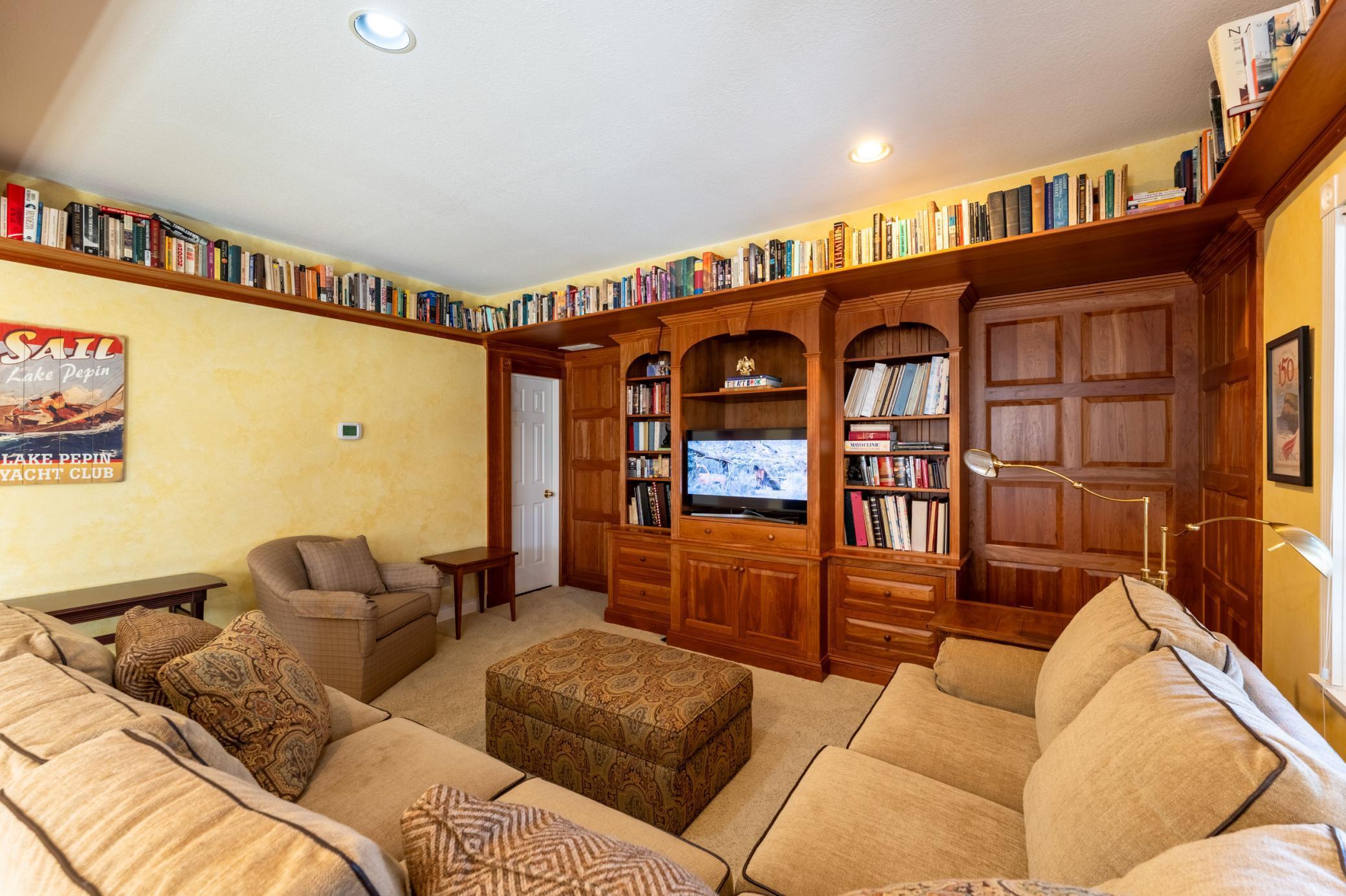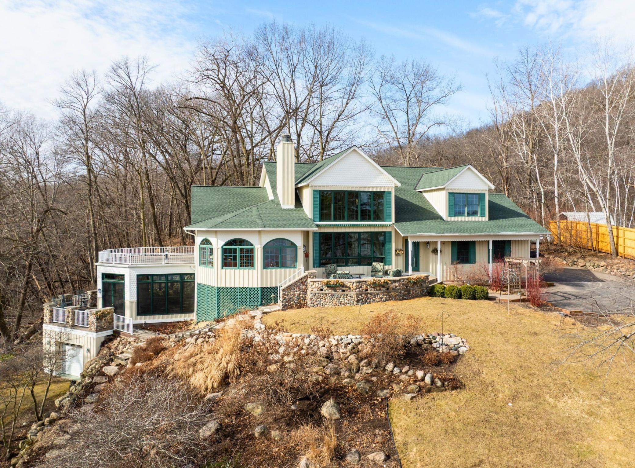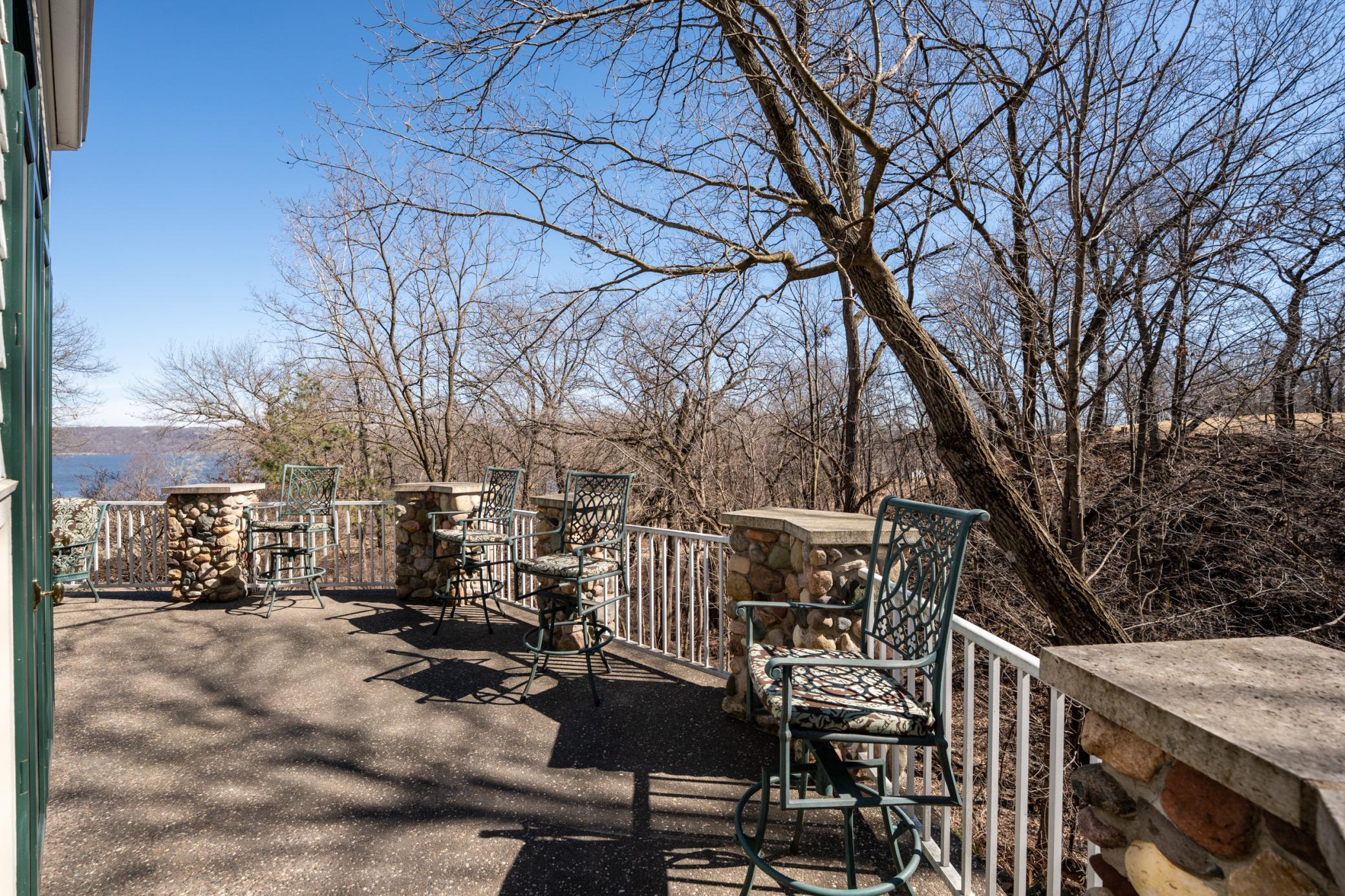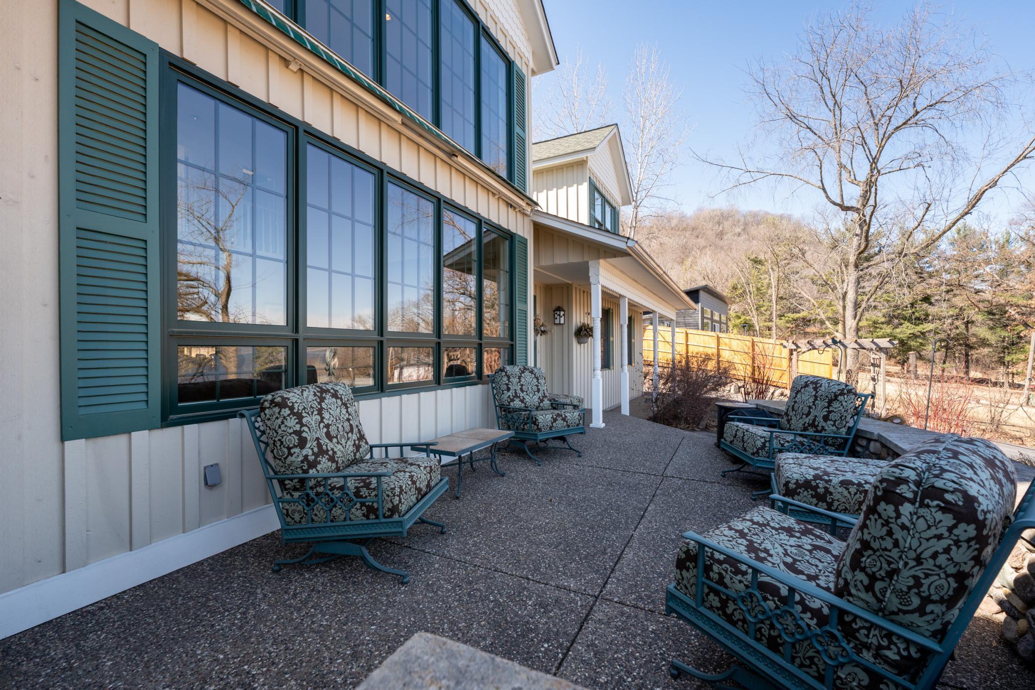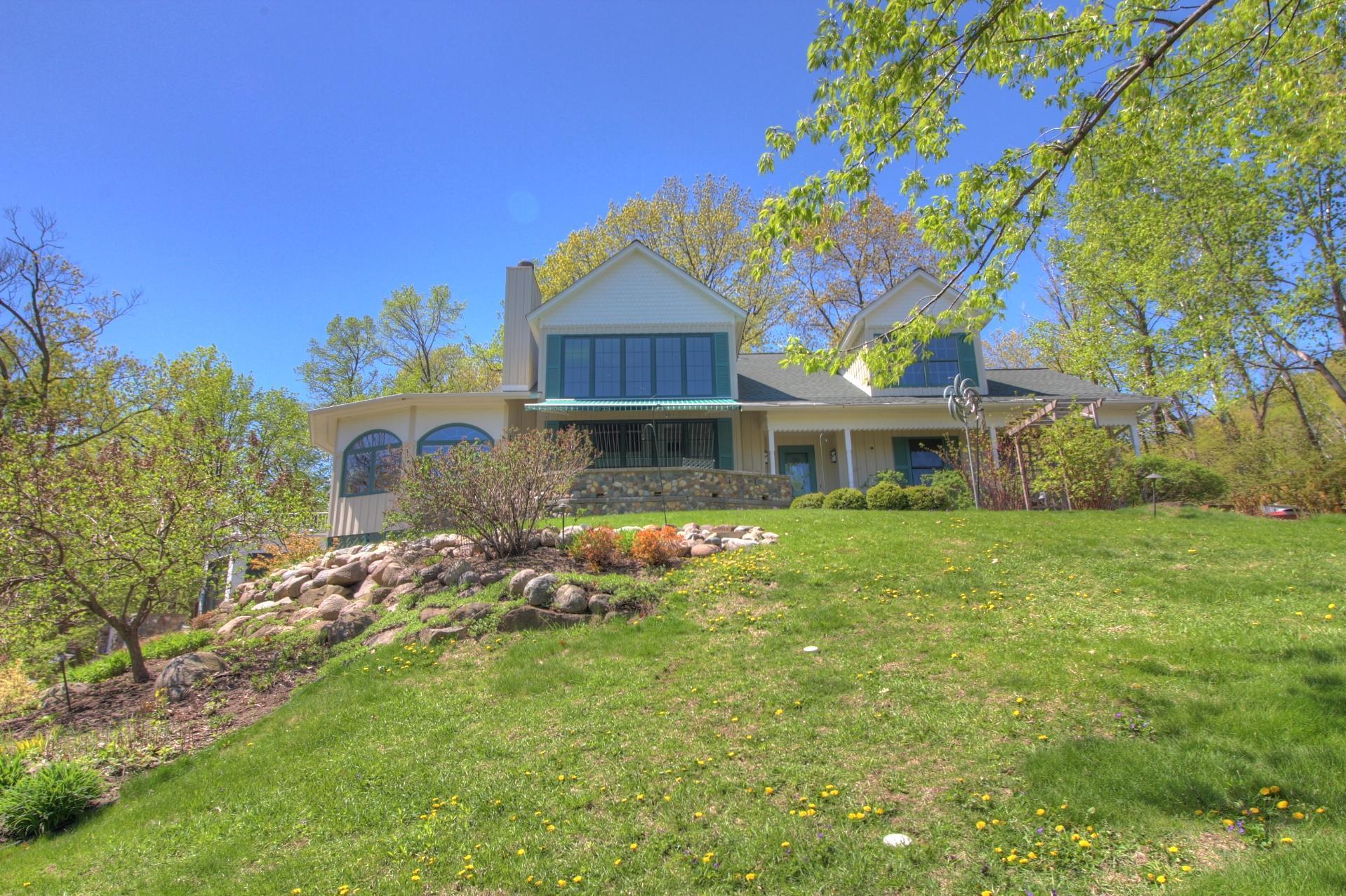 An amazing opportunity to own this 3.68-acre Old Frontenac estate with over 200 ft of sandy beach frontage on gorgeous Lake Pepin/Mississippi River. Ennjoy fishing, swimming, boating, kayaking and more right out your front door. Your backyard is 2600 acre Frontenac State Park that includes 17 miles of hiking and cross country ski trails, camping and the highest bird species count of any park in the state. Custom designed 4 bedroom, 4 bath home with over 5200 sq. ft. of finished living space and panoramic river and bluff land views. Main level includes a vaulted living room with fireplace and floor to ceiling windows, a formal dining room, library, a sun-filled conservatory with in-floor heat, auto ceiling blinds and a gas fireplace, eat-in kitchen with center island/breakfast bar, informal dining with a wood burning fireplace and built in desk, primary bedroom suite with multiple closets and a full bath with hot tub, adjacent sun room/office with fireplace, 1/2 bath, foyer and mud room. Mudroom has space for future washer/dryer but hookups are not yet installed. Upper level includes 3 bedrooms and a 3/4 bath with tiled shower. In the lower level, you'll find family room/den with a beautiful built-in entertainment center, 3/4 bath, a billiards room with gas fireplace, laundry, storage, and utility room. Attached 2 car garage with a 3rd (tuck-under, insulated and heated) garage with plenty of space (504 sq. ft.) for additional toys and workshop. Front, rear and side stone patio areas and a dining deck. Private and wooded backyard with attractive landscaping, rock garden, fountain, and rock steps. Front yard is an expansive 3 acre lawn that rolls gently down to over 200 ft. of sandy beach shoreline with phenomenal views in all directions. You also have the privilege of watching an active bald eagle nest high in a tree close to the water. 1 hour to MSP; 40 minutes to Rochester. Surrounded by Frontenac State Park and Lake Pepin, Old Frontenac was founded in the 1850s and retains a gentle, peaceful ambience of the past. This property offers a quiet and private lifestyle in a charming, unique and historic community.