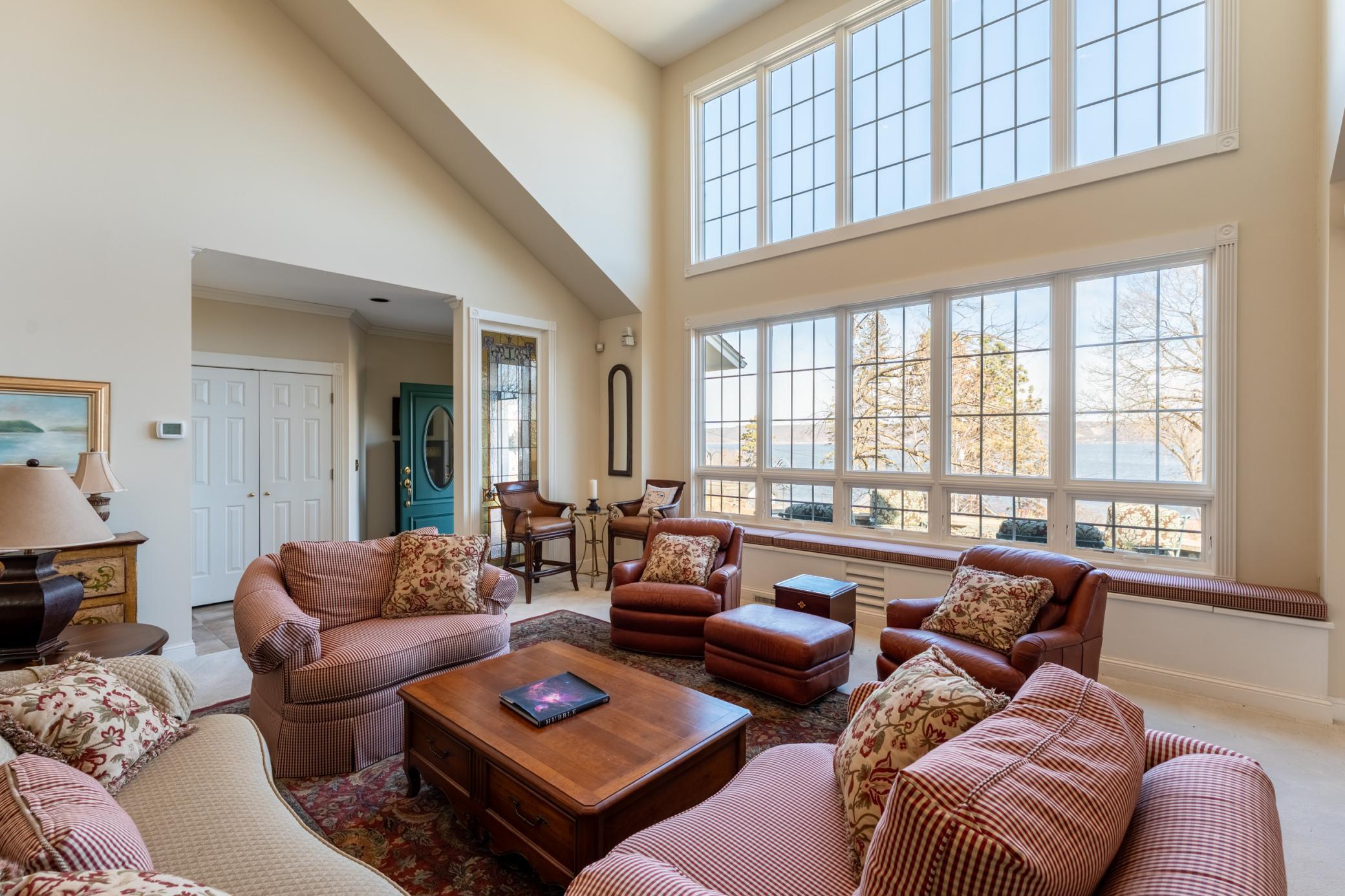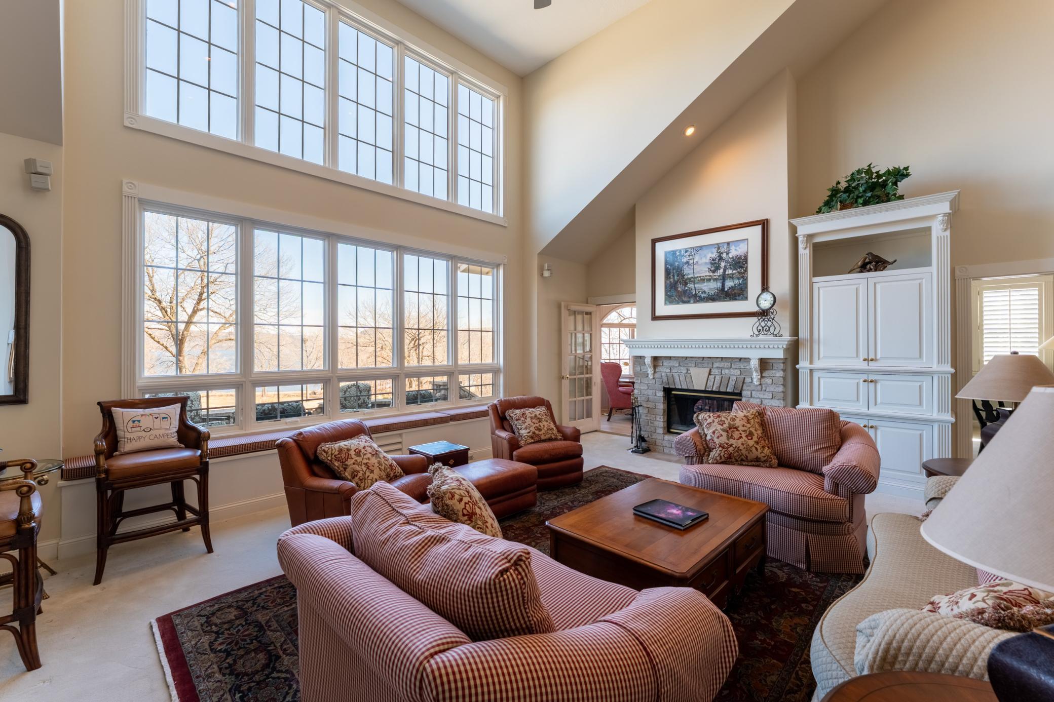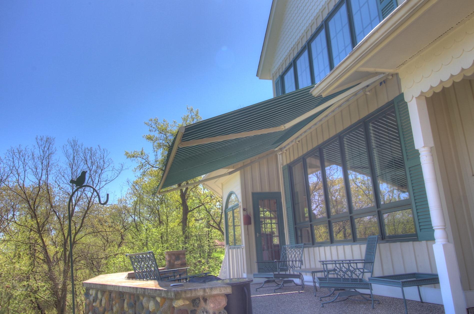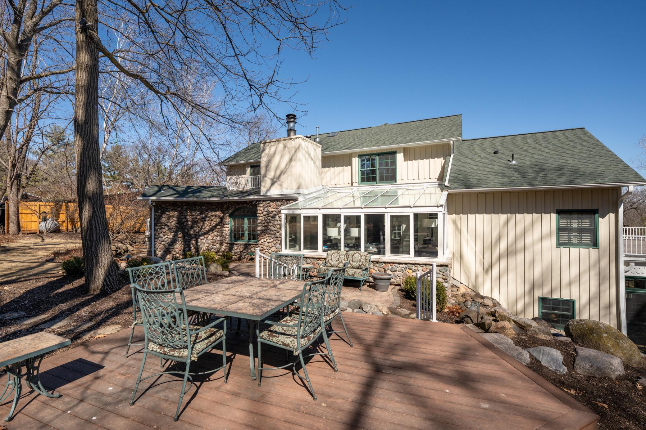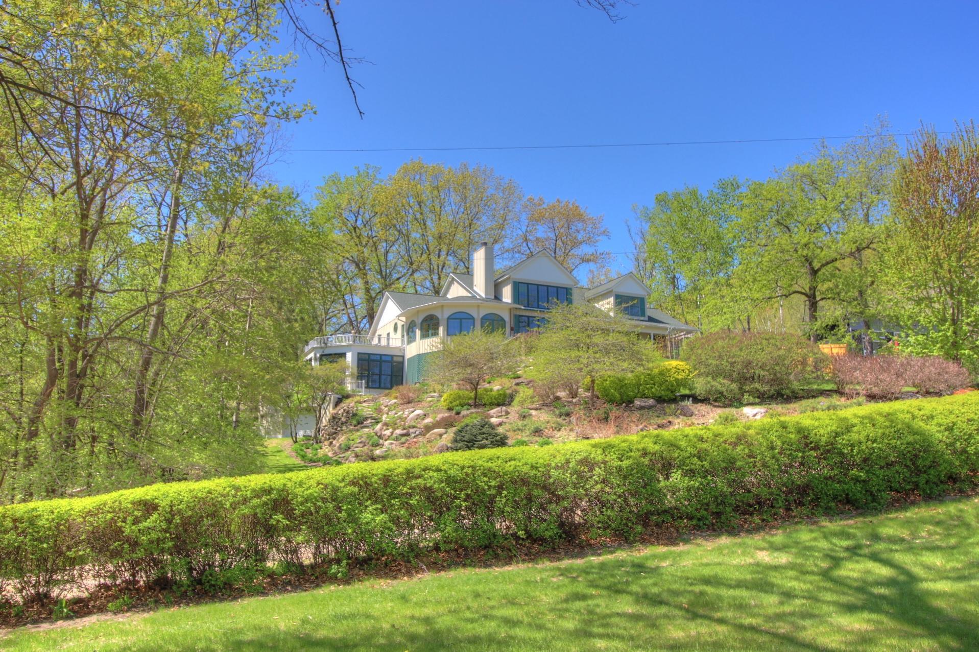 An amazing opportunity to own this 3.68-acre Old Frontenac estate with over 200 ft of sandy beach frontage on gorgeous Lake Pepin/Mississippi River. Ennjoy fishing, swimming, boating, kayaking and more right out your front door. Your backyard is 2600 acre Frontenac State Park that includes 17 miles of hiking and cross country ski trails, camping and the highest bird species count of any park in the state. Custom designed 4 bedroom, 4 bath home with over 5200 sq. ft. of finished living space and panoramic river and bluff land views. Main level includes a vaulted living room with fireplace and floor to ceiling windows, a formal dining room, library, a sun-filled conservatory with in-floor heat, auto ceiling blinds and a gas fireplace, eat-in kitchen with center island/breakfast bar, informal dining with a wood burning fireplace and built in desk, primary bedroom suite with multiple closets and a full bath with hot tub, adjacent sun room/office with fireplace, 1/2 bath, foyer and mud room. Mudroom has space for future washer/dryer but hookups are not yet installed. Upper level includes 3 bedrooms and a 3/4 bath with tiled shower. In the lower level, you'll find family room/den with a beautiful built-in entertainment center, 3/4 bath, a billiards room with gas fireplace, laundry, storage, and utility room. Attached 2 car garage with a 3rd (tuck-under, insulated and heated) garage with plenty of space (504 sq. ft.) for additional toys and workshop. Front, rear and side stone patio areas and a dining deck. Private and wooded backyard with attractive landscaping, rock garden, fountain, and rock steps. Front yard is an expansive 3 acre lawn that rolls gently down to over 200 ft. of sandy beach shoreline with phenomenal views in all directions. You also have the privilege of watching an active bald eagle nest high in a tree close to the water. 1 hour to MSP; 40 minutes to Rochester. Surrounded by Frontenac State Park and Lake Pepin, Old Frontenac was founded in the 1850s and retains a gentle, peaceful ambience of the past. This property offers a quiet and private lifestyle in a charming, unique and historic community.