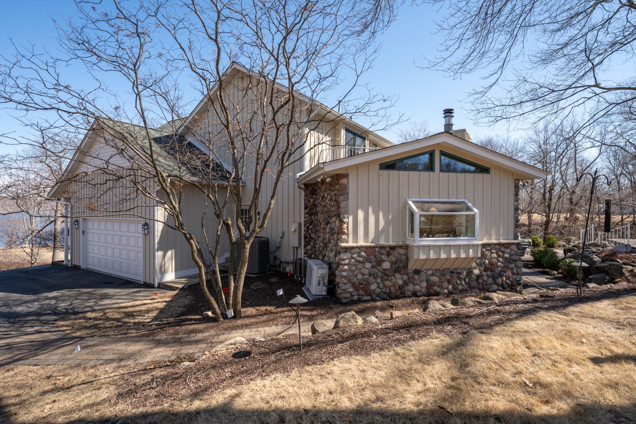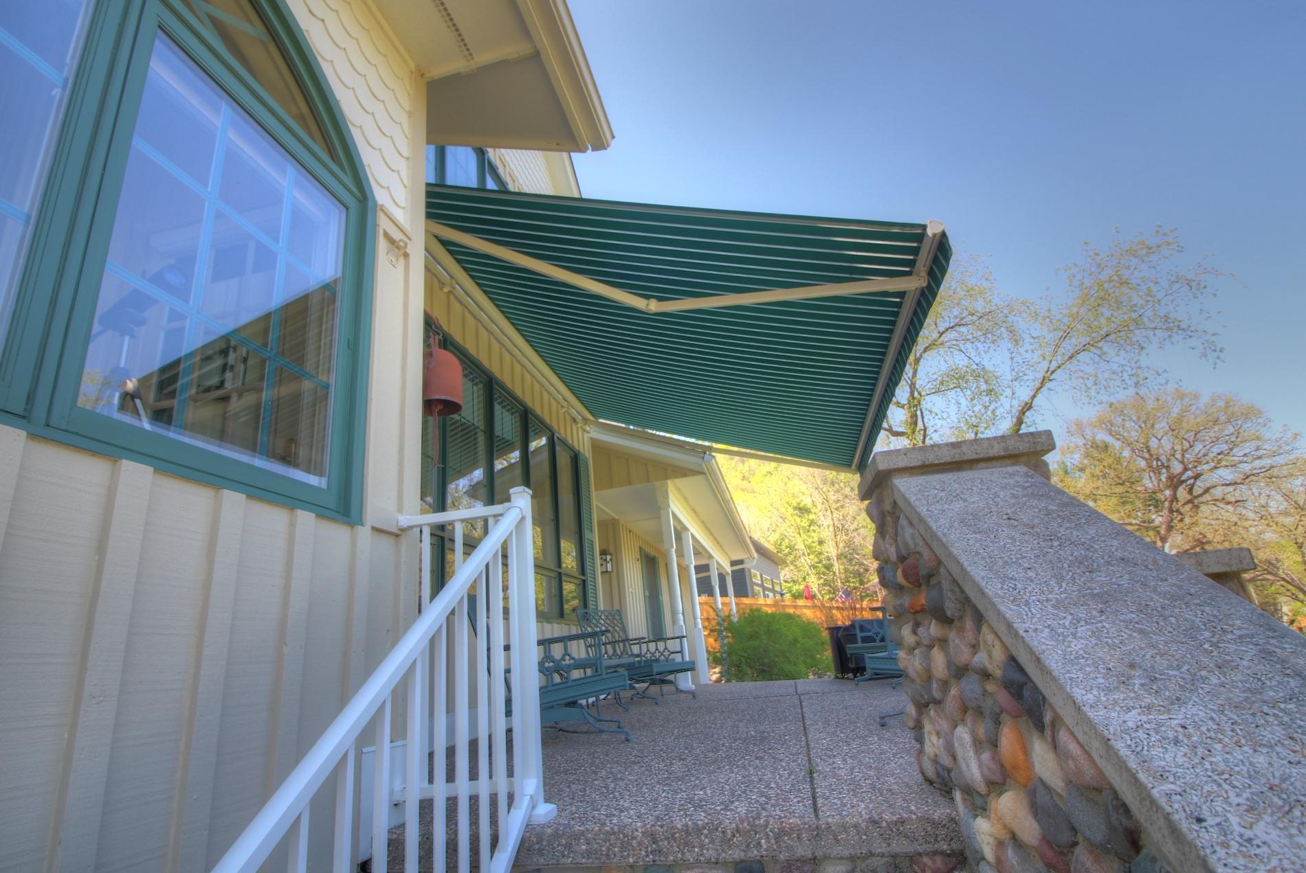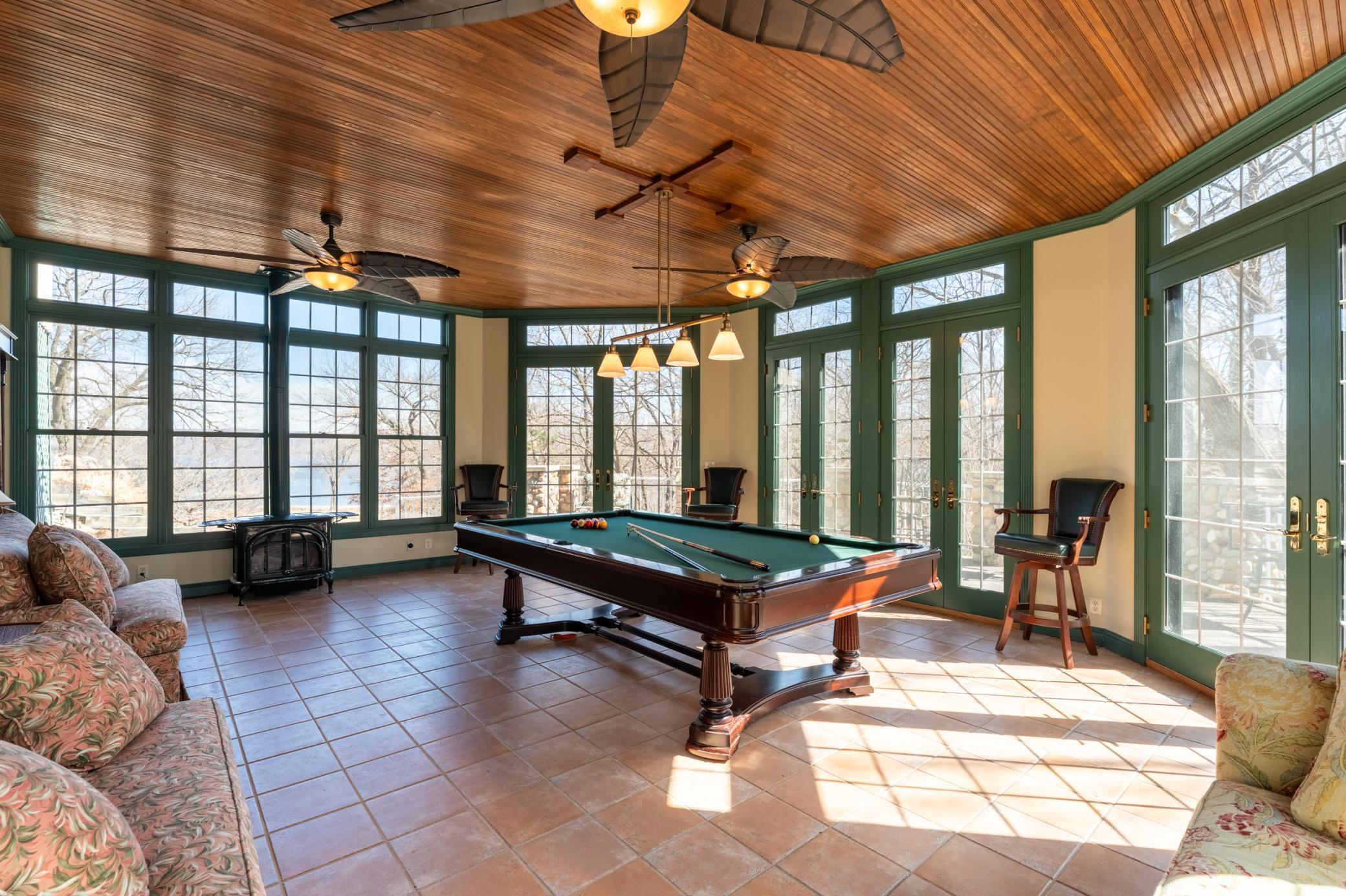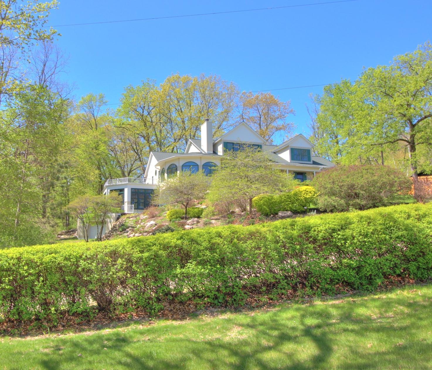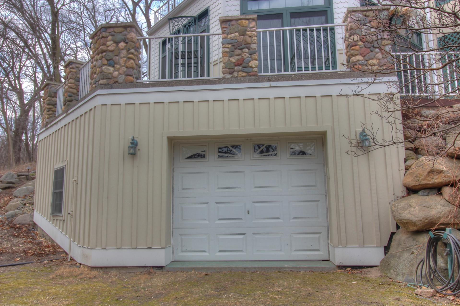 An amazing opportunity to own this 3.68-acre Old Frontenac estate with over 200 ft of sandy beach frontage on gorgeous Lake Pepin/Mississippi River. Ennjoy fishing, swimming, boating, kayaking and more right out your front door. Your backyard is 2600 acre Frontenac State Park that includes 17 miles of hiking and cross country ski trails, camping and the highest bird species count of any park in the state. Custom designed 4 bedroom, 4 bath home with over 5200 sq. ft. of finished living space and panoramic river and bluff land views. Main level includes a vaulted living room with fireplace and floor to ceiling windows, a formal dining room, library, a sun-filled conservatory with in-floor heat, auto ceiling blinds and a gas fireplace, eat-in kitchen with center island/breakfast bar, informal dining with a wood burning fireplace and built in desk, primary bedroom suite with multiple closets and a full bath with hot tub, adjacent sun room/office with fireplace, 1/2 bath, foyer and mud room. Mudroom has space for future washer/dryer but hookups are not yet installed. Upper level includes 3 bedrooms and a 3/4 bath with tiled shower. In the lower level, you'll find family room/den with a beautiful built-in entertainment center, 3/4 bath, a billiards room with gas fireplace, laundry, storage, and utility room. Attached 2 car garage with a 3rd (tuck-under, insulated and heated) garage with plenty of space (504 sq. ft.) for additional toys and workshop. Front, rear and side stone patio areas and a dining deck. Private and wooded backyard with attractive landscaping, rock garden, fountain, and rock steps. Front yard is an expansive 3 acre lawn that rolls gently down to over 200 ft. of sandy beach shoreline with phenomenal views in all directions. You also have the privilege of watching an active bald eagle nest high in a tree close to the water. 1 hour to MSP; 40 minutes to Rochester. Surrounded by Frontenac State Park and Lake Pepin, Old Frontenac was founded in the 1850s and retains a gentle, peaceful ambience of the past. This property offers a quiet and private lifestyle in a charming, unique and historic community.