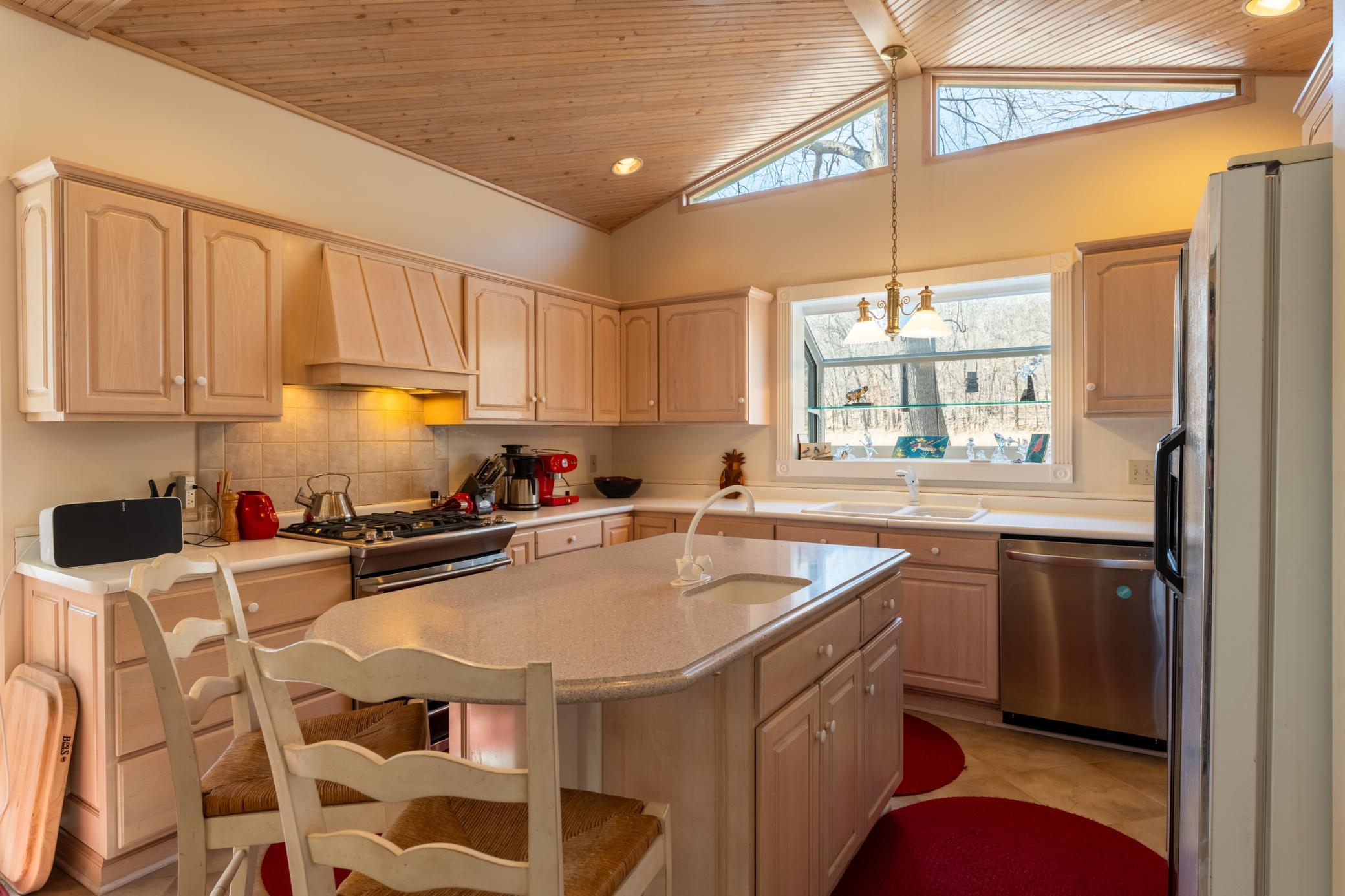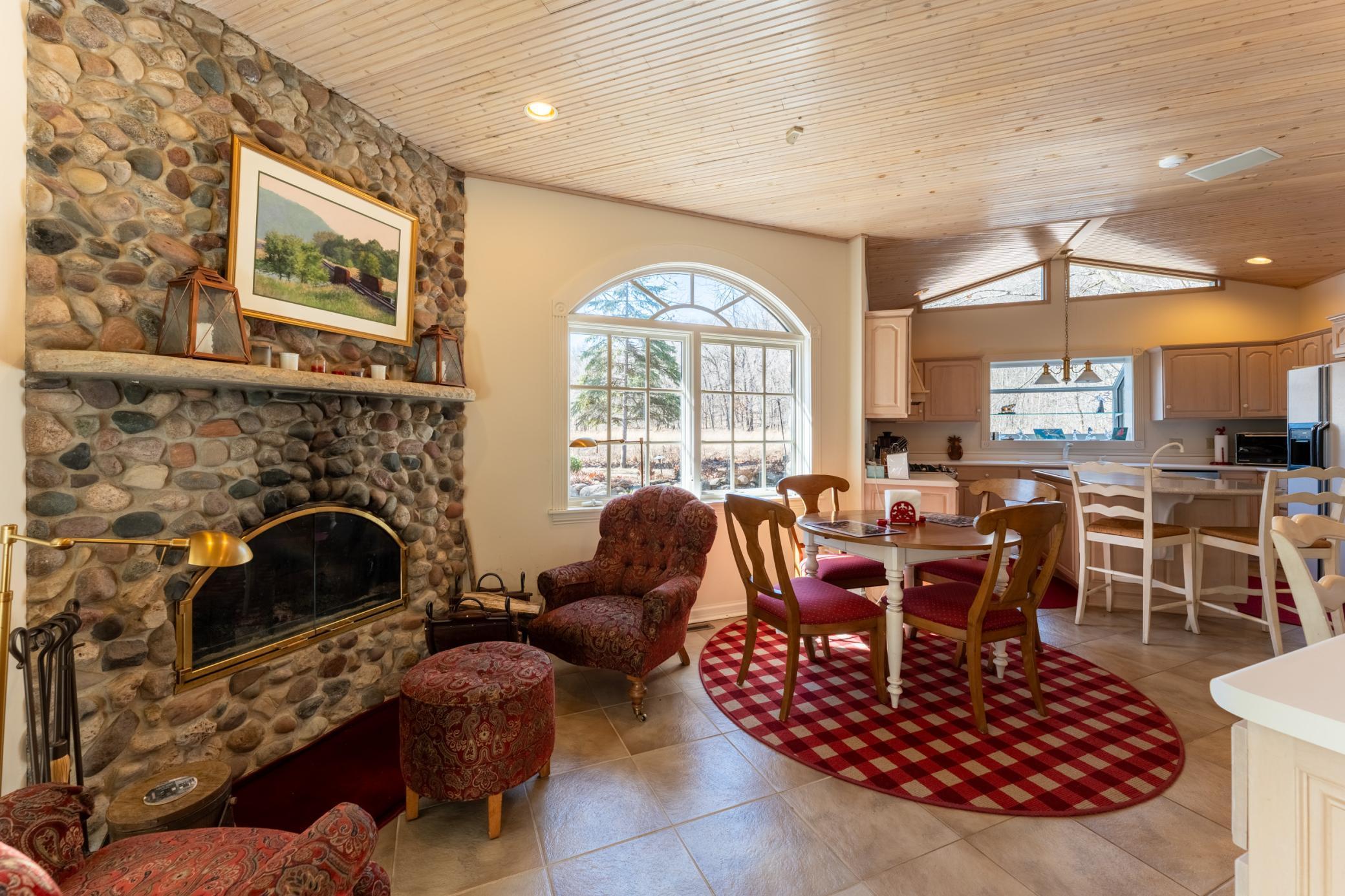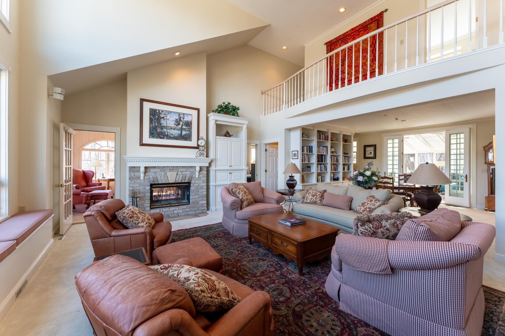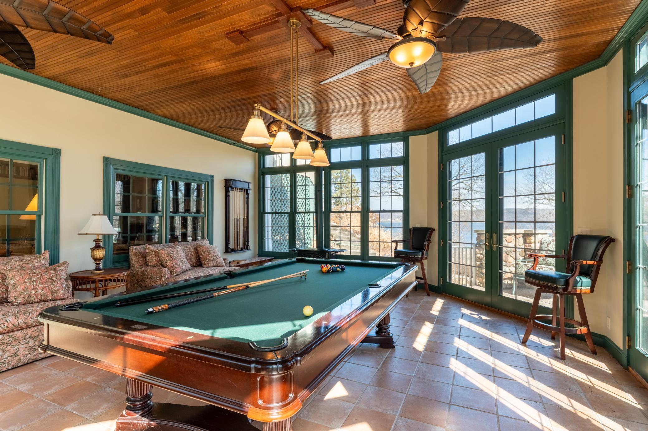 An amazing opportunity to own this 3.68-acre Old Frontenac estate with over 200 ft of sandy beach frontage on gorgeous Lake Pepin/Mississippi River. Ennjoy fishing, swimming, boating, kayaking and more right out your front door. Your backyard is 2600 acre Frontenac State Park that includes 17 miles of hiking and cross country ski trails, camping and the highest bird species count of any park in the state. Custom designed 4 bedroom, 4 bath home with over 5200 sq. ft. of finished living space and panoramic river and bluff land views. Main level includes a vaulted living room with fireplace and floor to ceiling windows, a formal dining room, library, a sun-filled conservatory with in-floor heat, auto ceiling blinds and a gas fireplace, eat-in kitchen with center island/breakfast bar, informal dining with a wood burning fireplace and built in desk, primary bedroom suite with multiple closets and a full bath with hot tub, adjacent sun room/office with fireplace, 1/2 bath, foyer and mud room. Mudroom has space for future washer/dryer but hookups are not yet installed. Upper level includes 3 bedrooms and a 3/4 bath with tiled shower. In the lower level, you'll find family room/den with a beautiful built-in entertainment center, 3/4 bath, a billiards room with gas fireplace, laundry, storage, and utility room. Attached 2 car garage with a 3rd (tuck-under, insulated and heated) garage with plenty of space (504 sq. ft.) for additional toys and workshop. Front, rear and side stone patio areas and a dining deck. Private and wooded backyard with attractive landscaping, rock garden, fountain, and rock steps. Front yard is an expansive 3 acre lawn that rolls gently down to over 200 ft. of sandy beach shoreline with phenomenal views in all directions. You also have the privilege of watching an active bald eagle nest high in a tree close to the water. 1 hour to MSP; 40 minutes to Rochester. Surrounded by Frontenac State Park and Lake Pepin, Old Frontenac was founded in the 1850s and retains a gentle, peaceful ambience of the past. This property offers a quiet and private lifestyle in a charming, unique and historic community.