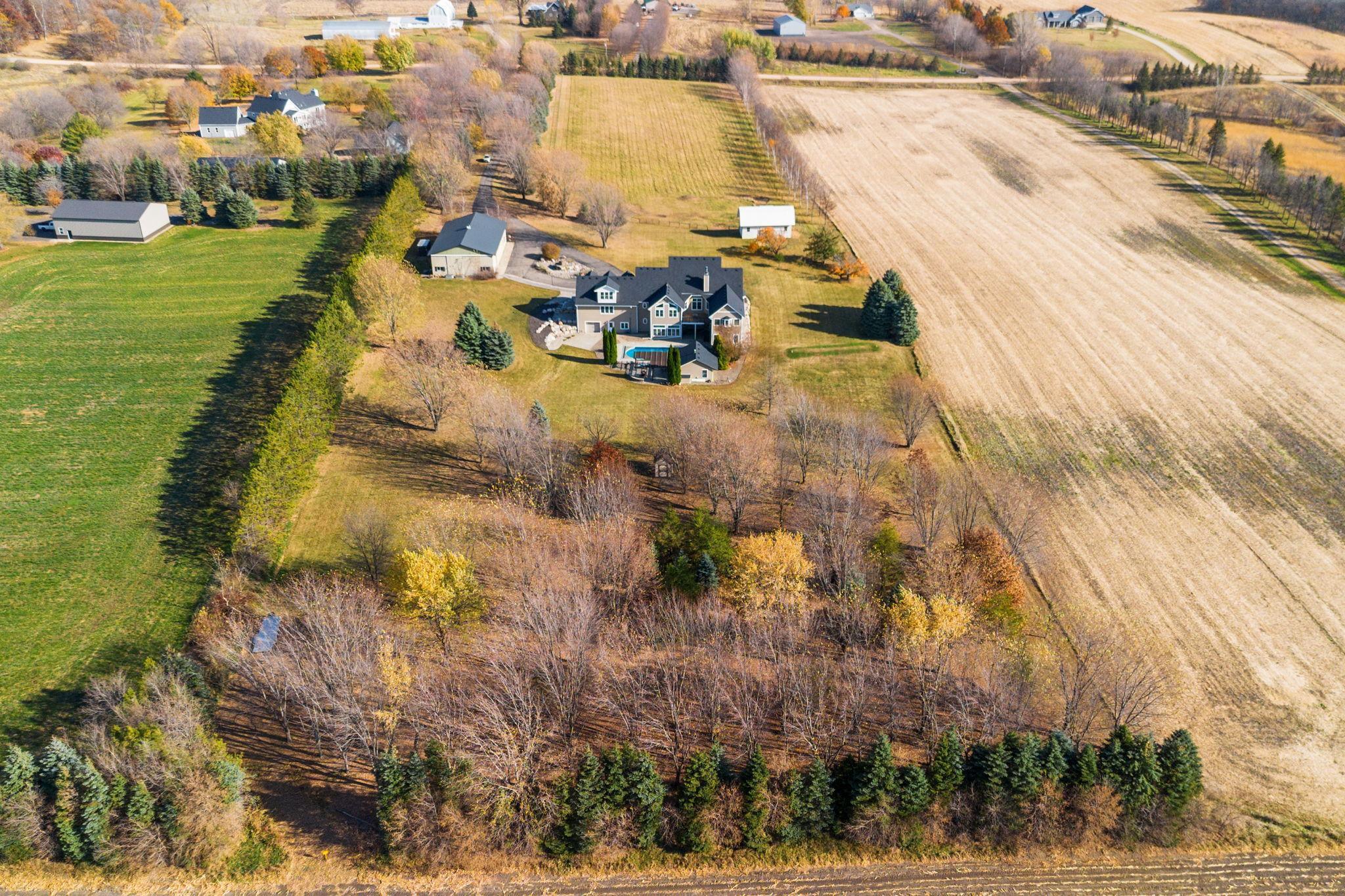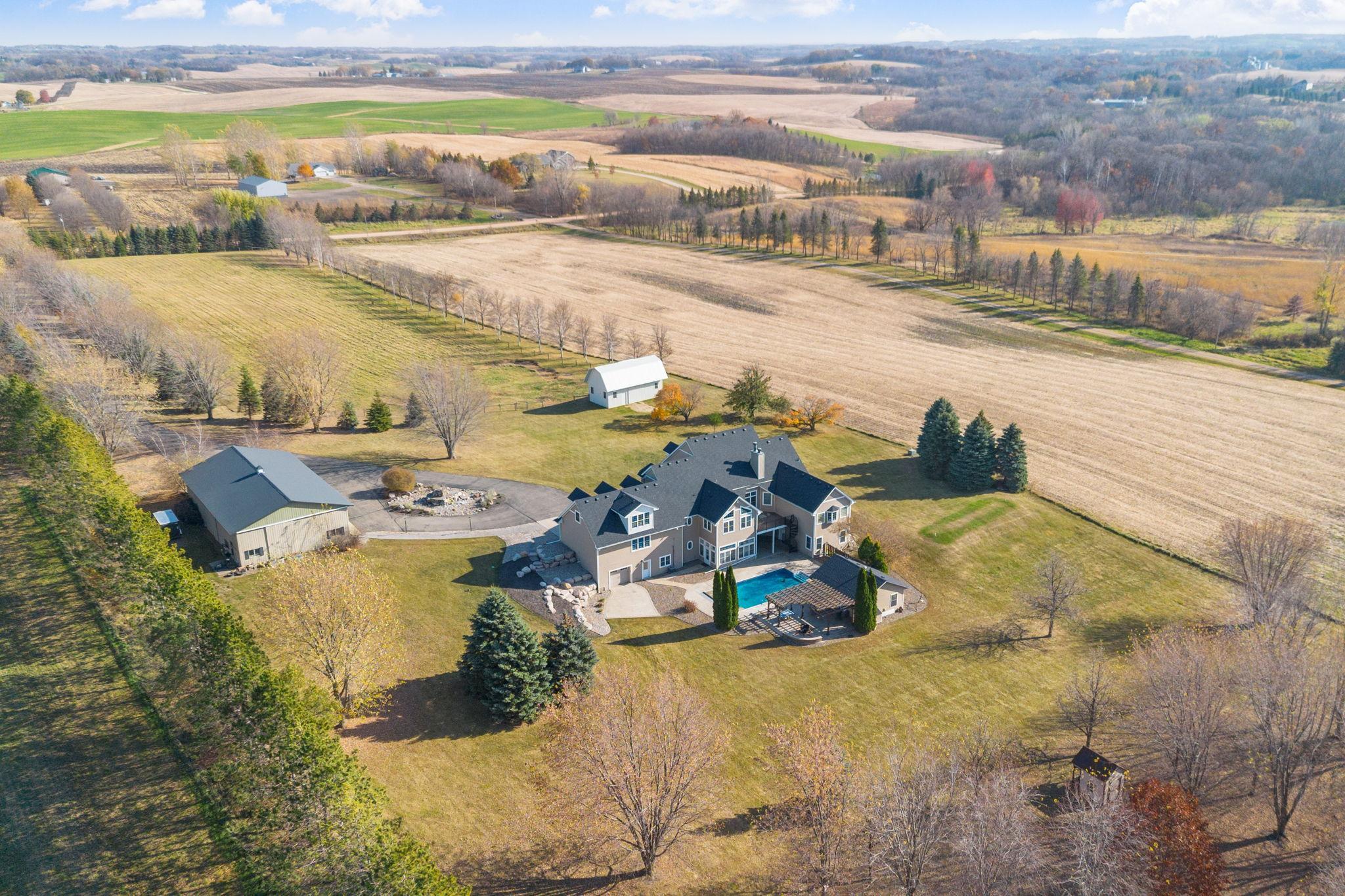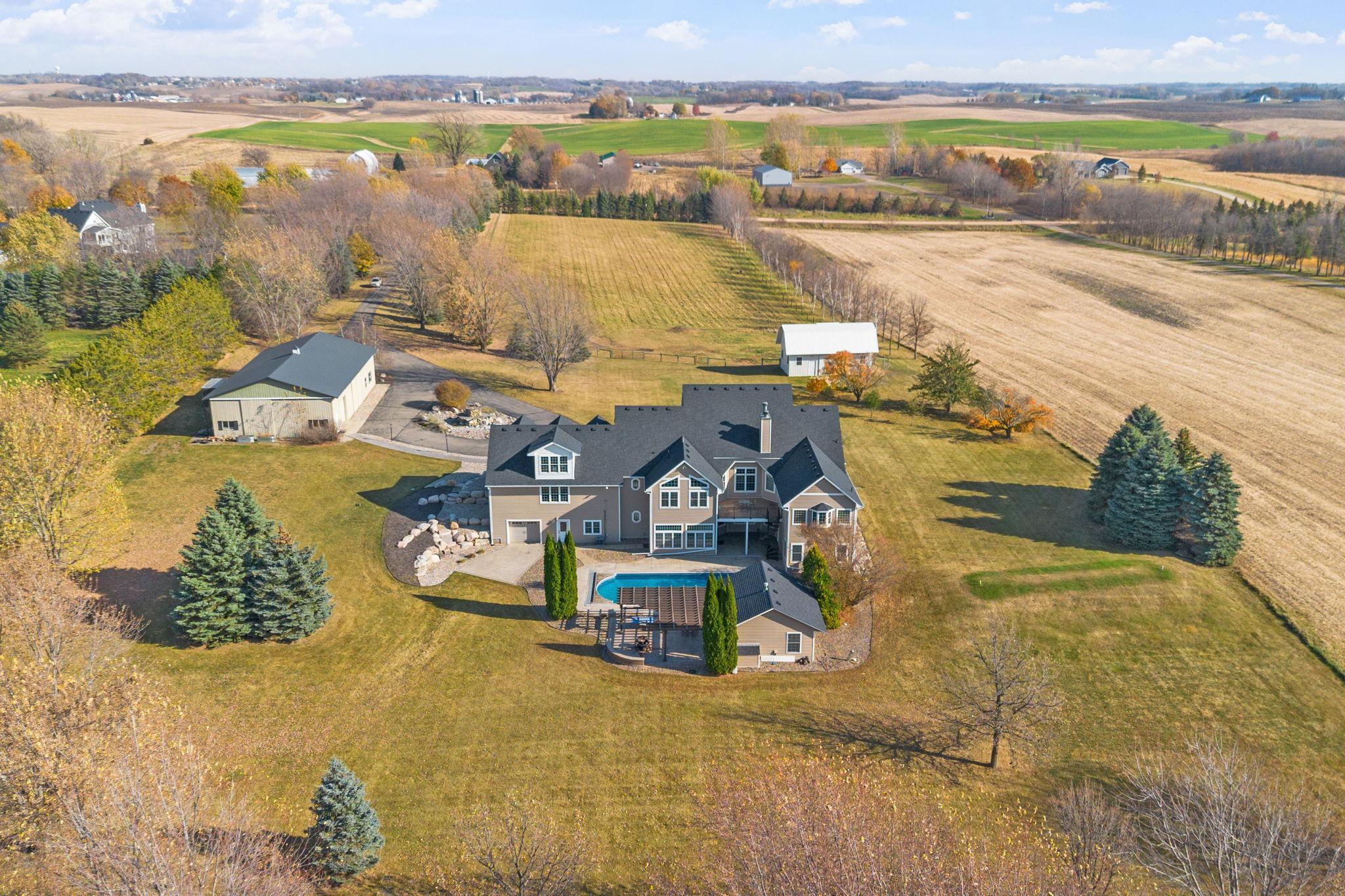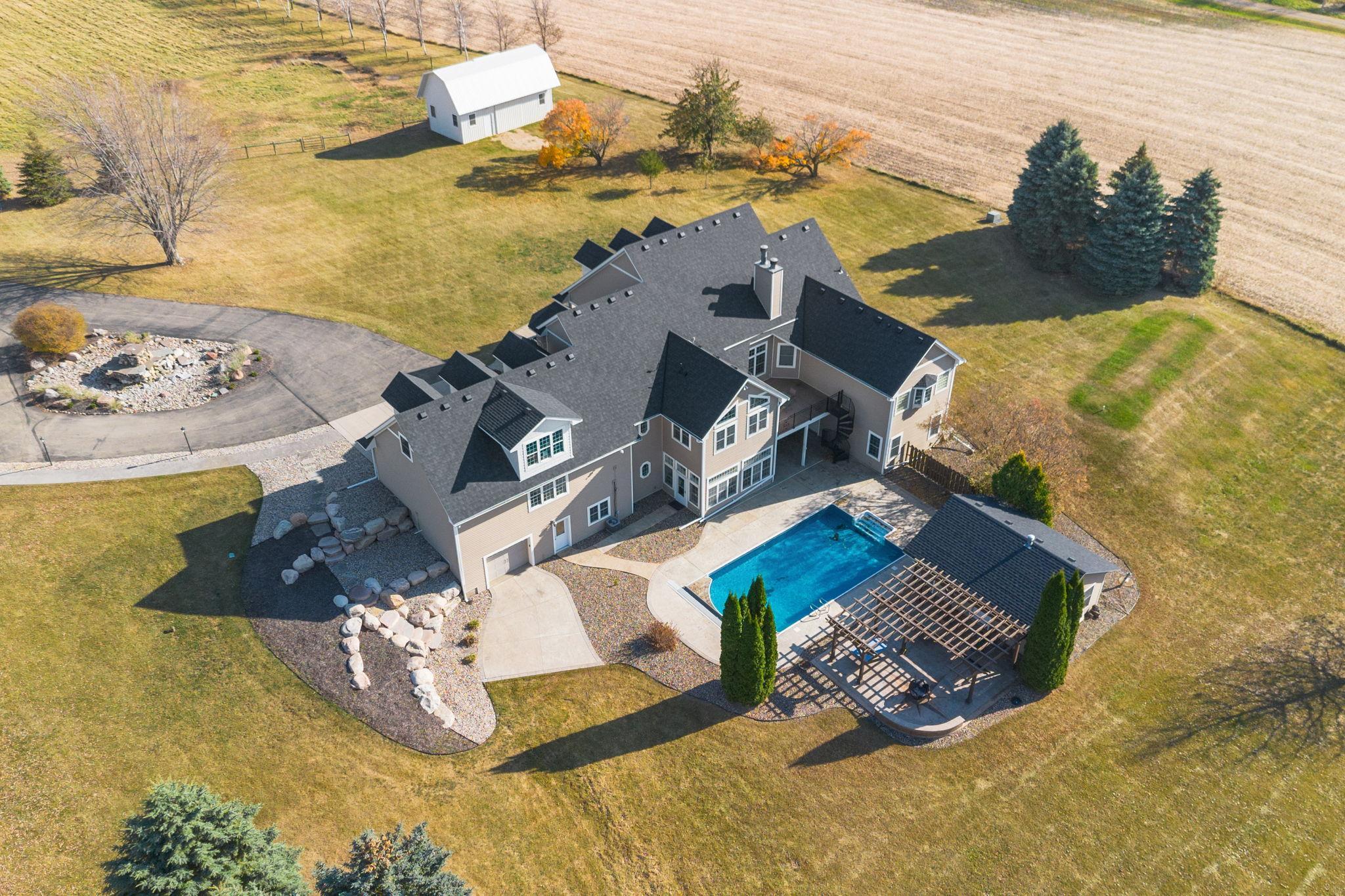You’ll spot the stone water feature as you roll up the driveway, trees lining the way like they’re guarding something worth finding—and they are. This isn’t just a house; it’s a property that hands you the keys to live big, however you define it. Sunlight spills through big windows, hitting white oak floors while vaulted ceilings give the great room a lift. The kitchen’s hickory cabinets and quartz counters are ready for your next meal, and the four-season porch with glass walls frames the green sprawl—acres that could mean barbecues, a garden, or just room for everyone to spread out. An elevator ties it all together, taking passengers and packages from the heated three-car garage to a bonus room and every floor in between. A lower level wood-burning fireplace anchors a family room with a bar and second kitchen, spilling out to a stamped concrete patio and pool that’s primed for summer chaos—cannonballs included. There’s a heated pool house for wet towels, extra guests, or stashing gear, plus a pole barn for your weekend projects and an animal barn with pasture access that could mean chickens, horses, or the resident donkey's!. The open land’s a blank slate—space for your cars, your toys, your hobbies. It’s a house that’s lived-in ready, with nearly every detail waiting to be discovered. You don’t just move in here—you start living the second you arrive. See the many features included in this offering!
