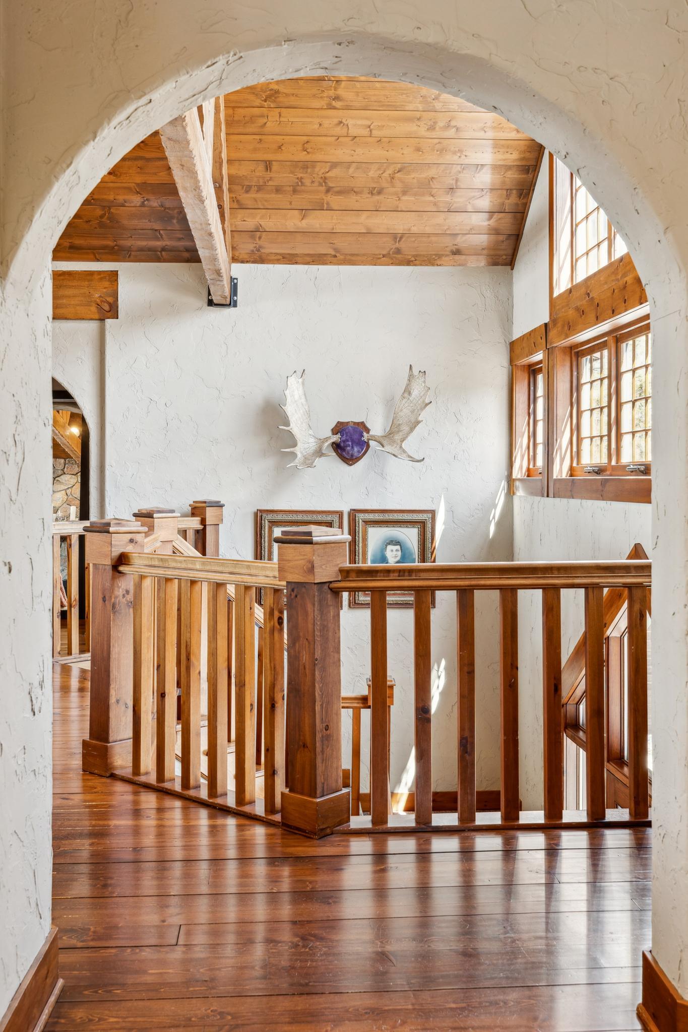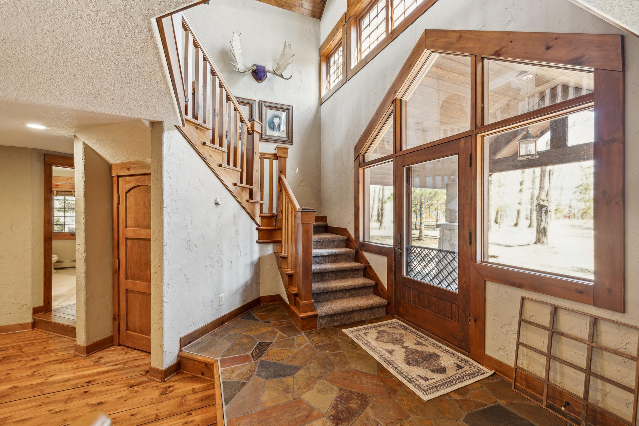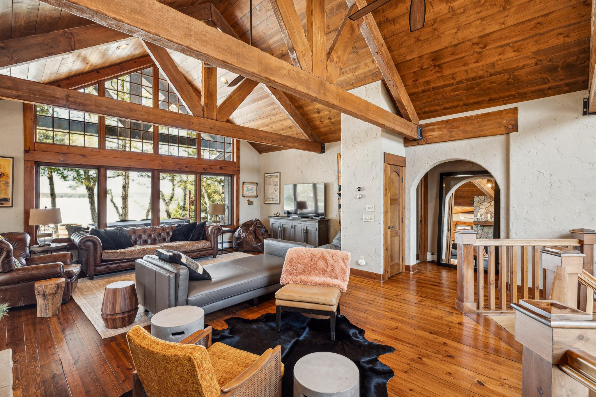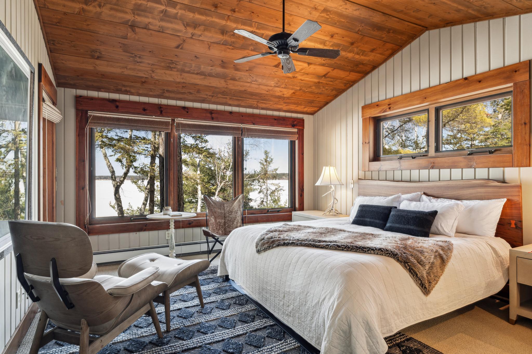 Nestled along the serene shores of Big Whitefish lake, this exquisite property epitomizes Northwoods luxury. A meticulously crafted retreat, the residence blends rustic charm with modern elegance, offering panoramic sunsets with 1.5 acres and 200 feet of sandy beach. Features include four bedrooms, three baths, stunning real stone fireplace, main floor primary suite, large gourmet kitchen, vaulted wood ceilings with exposed trusses, expansive windows framing the natural beauty, hardwood floors, open-concept making this the perfect home for entertaining, spacious stone deck with fire pit, perfect sand beach and that priceless boat house at the waters edge.