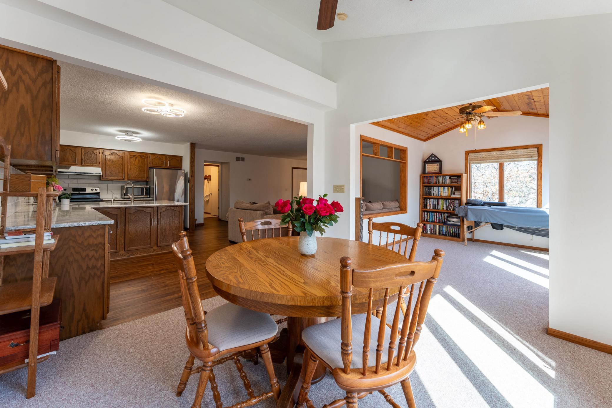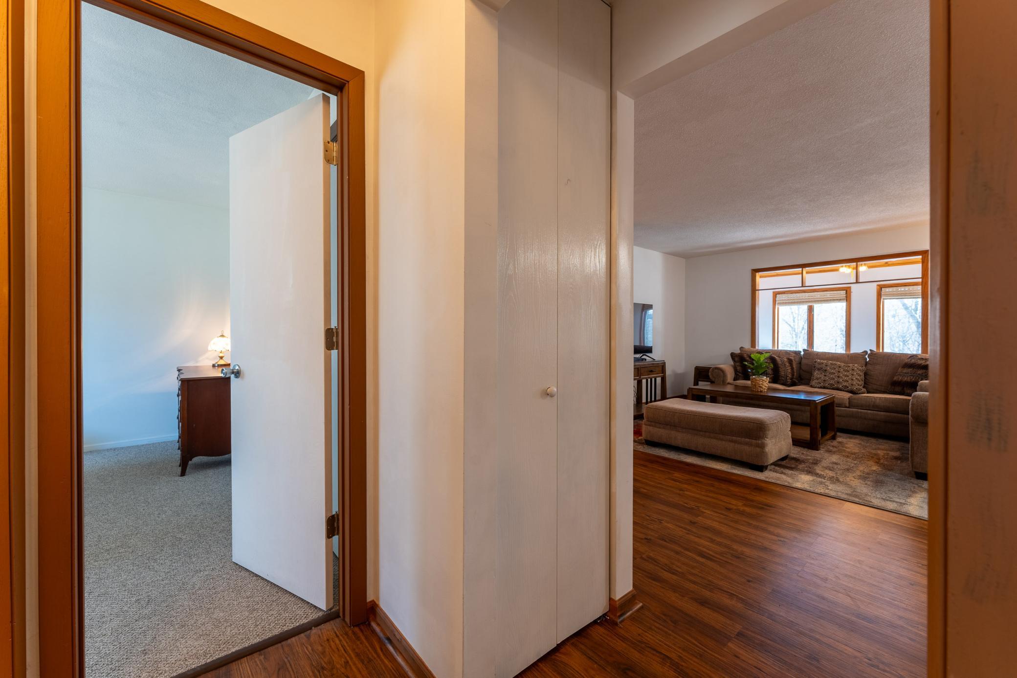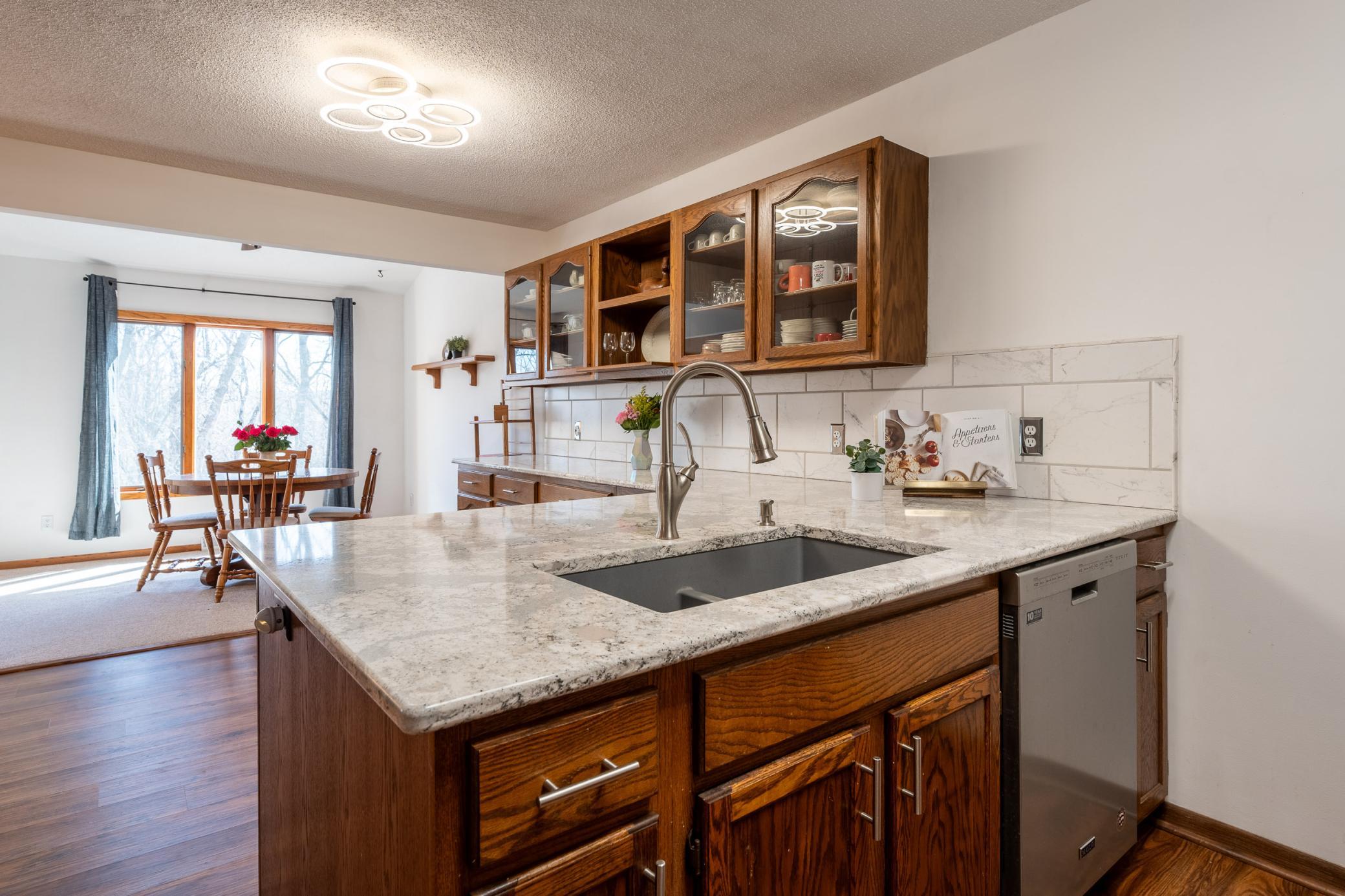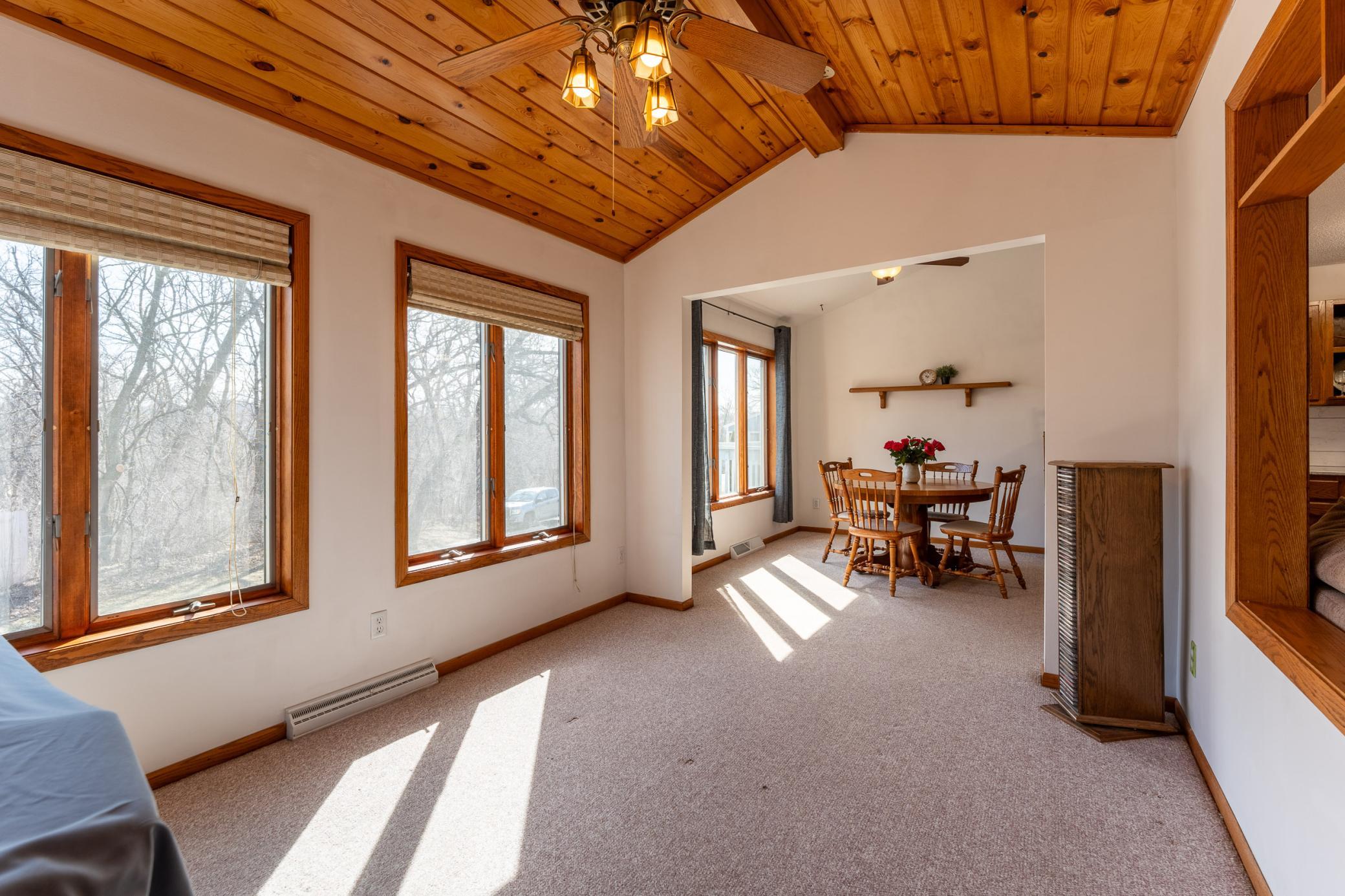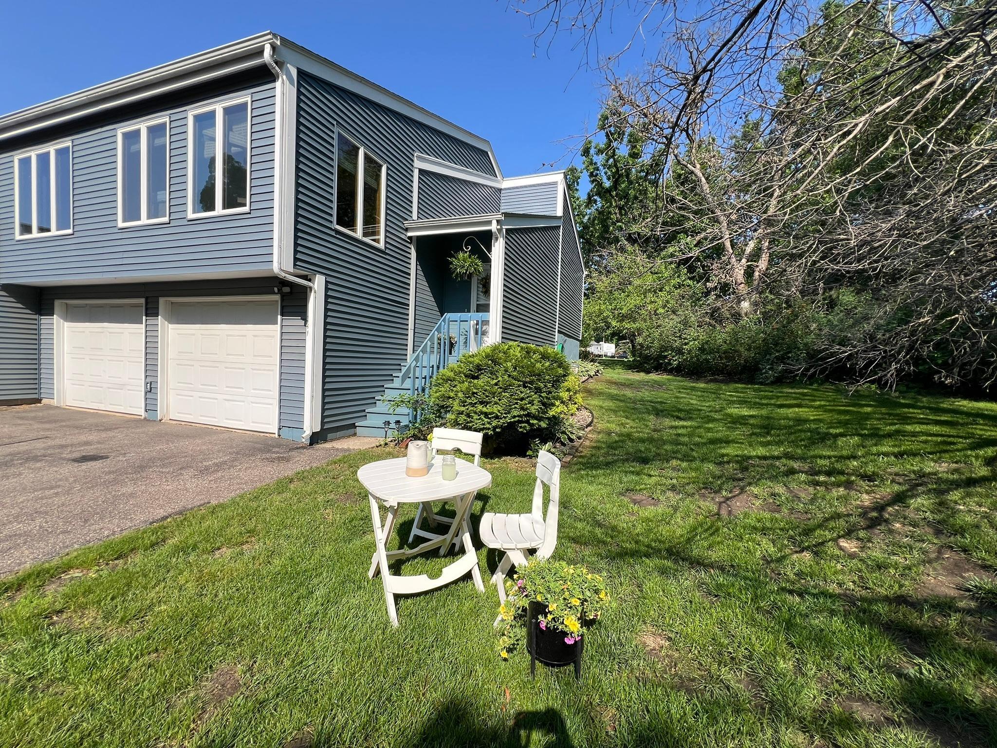 Tucked among mature trees at the end of a quiet street, this end-unit townhome offers a surprising sense of privacy - hard to come by in townhome living! The main level features an open layout connecting the living room, informal dining area, kitchen, and sunroom - perfect for everyday living and entertaining. The updated kitchen serves a fresh look with solid-surface countertops, a tile backsplash, updated hardware, and modern light fixtures. A buffet-style peninsula provides additional counter and cabinet space for added functionality. Two bedrooms and a full bath complete the main level. The lower level offers flexible living space with a large family room or workout area, a third bedroom, another full bath, laundry, and direct entry from the insulated two-car garage. A new roof was installed in 2022. Conveniently located with quick access to Hwy 61 and just minutes from the heart of Red Wing - where historic charm meets vibrant downtown life, scenic river views, shops, dining, and more!