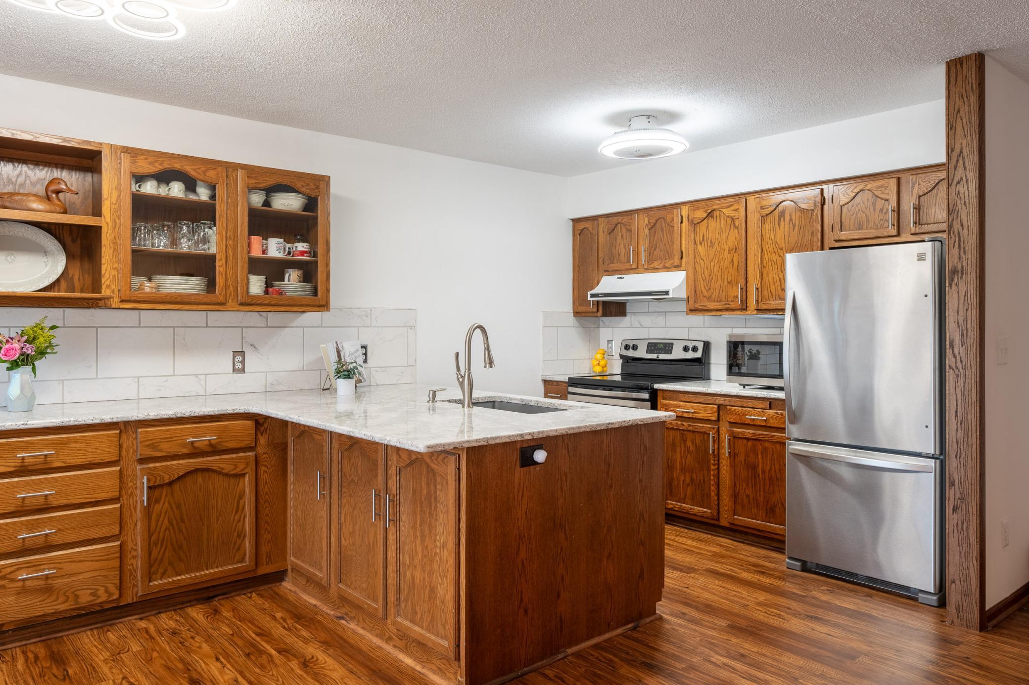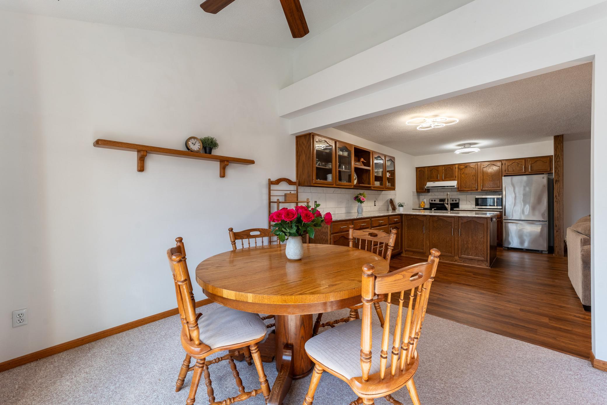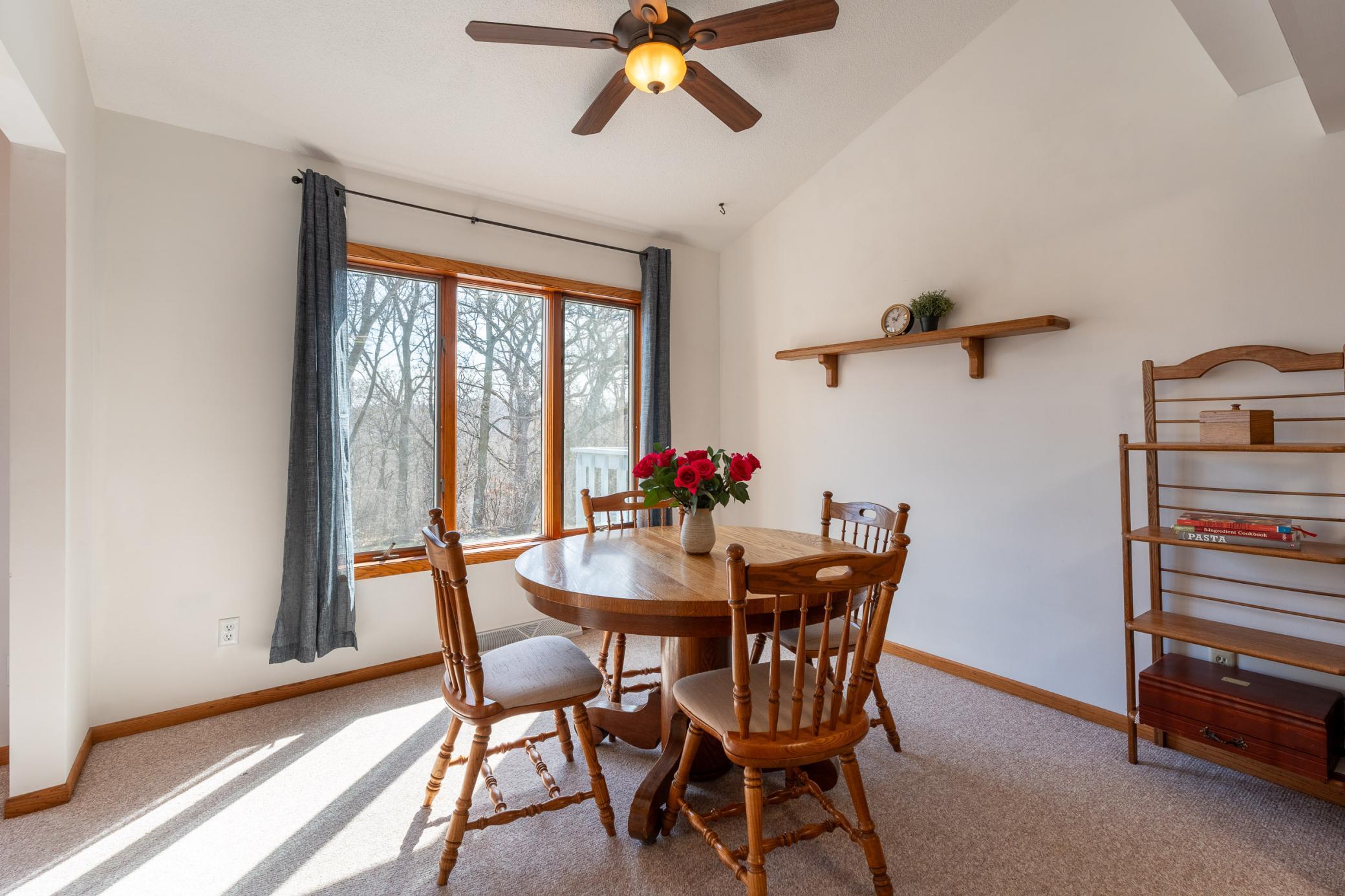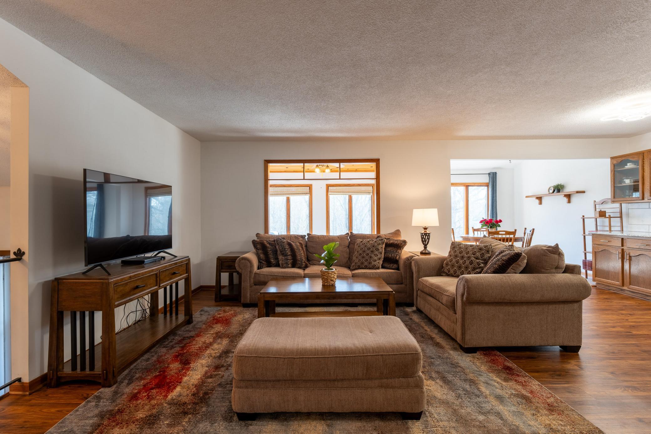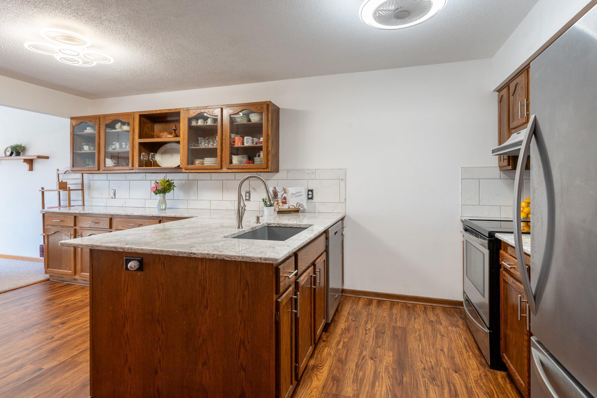 Tucked among mature trees at the end of a quiet street, this end-unit townhome offers a surprising sense of privacy - hard to come by in townhome living! The main level features an open layout connecting the living room, informal dining area, kitchen, and sunroom - perfect for everyday living and entertaining. The updated kitchen serves a fresh look with solid-surface countertops, a tile backsplash, updated hardware, and modern light fixtures. A buffet-style peninsula provides additional counter and cabinet space for added functionality. Two bedrooms and a full bath complete the main level. The lower level offers flexible living space with a large family room or workout area, a third bedroom, another full bath, laundry, and direct entry from the insulated two-car garage. A new roof was installed in 2022. Conveniently located with quick access to Hwy 61 and just minutes from the heart of Red Wing - where historic charm meets vibrant downtown life, scenic river views, shops, dining, and more!
