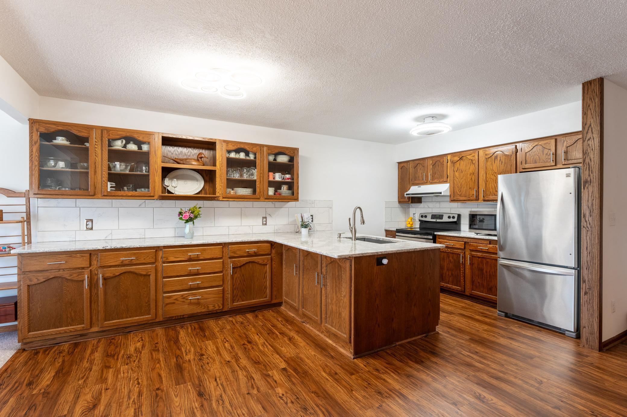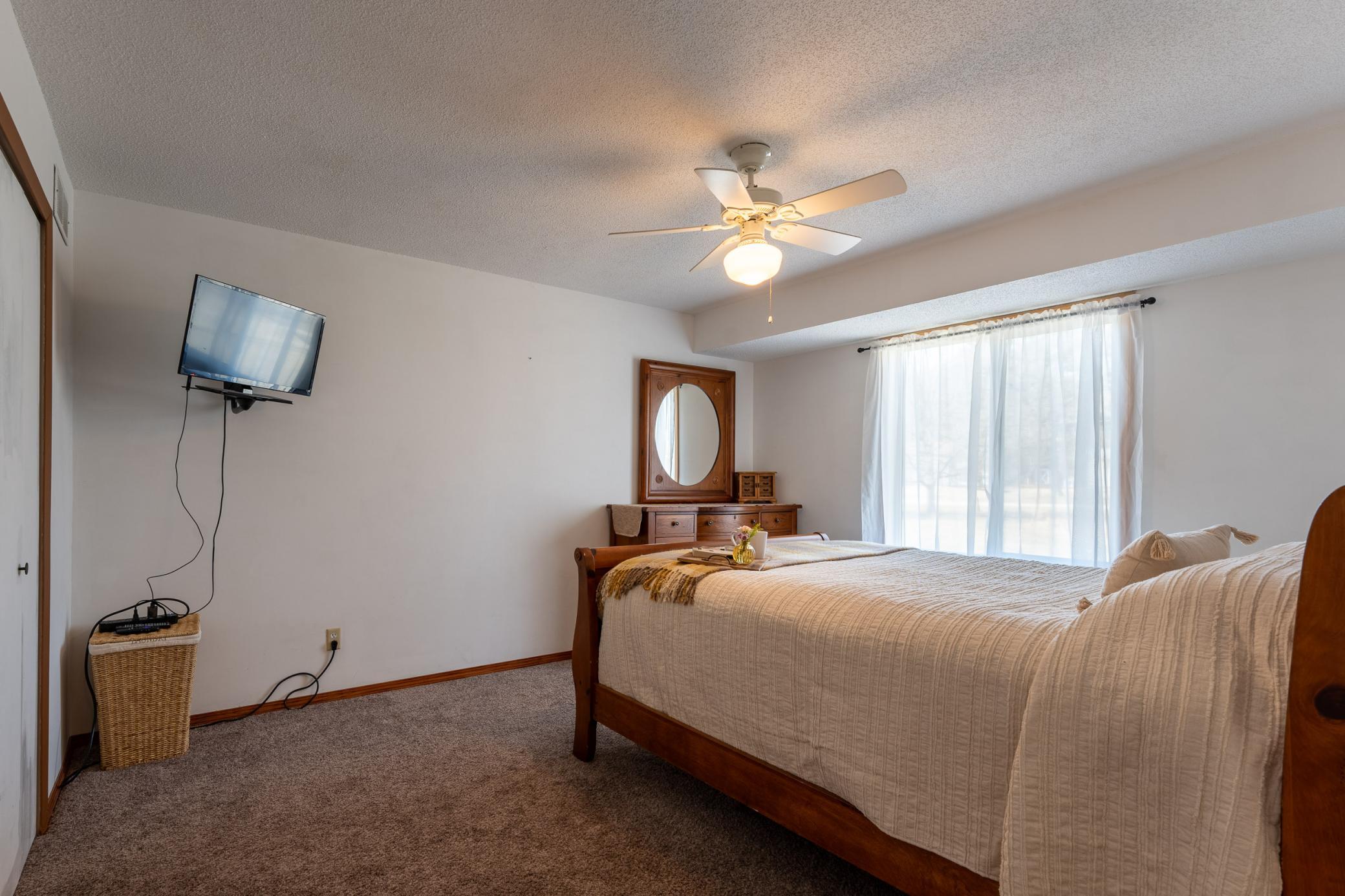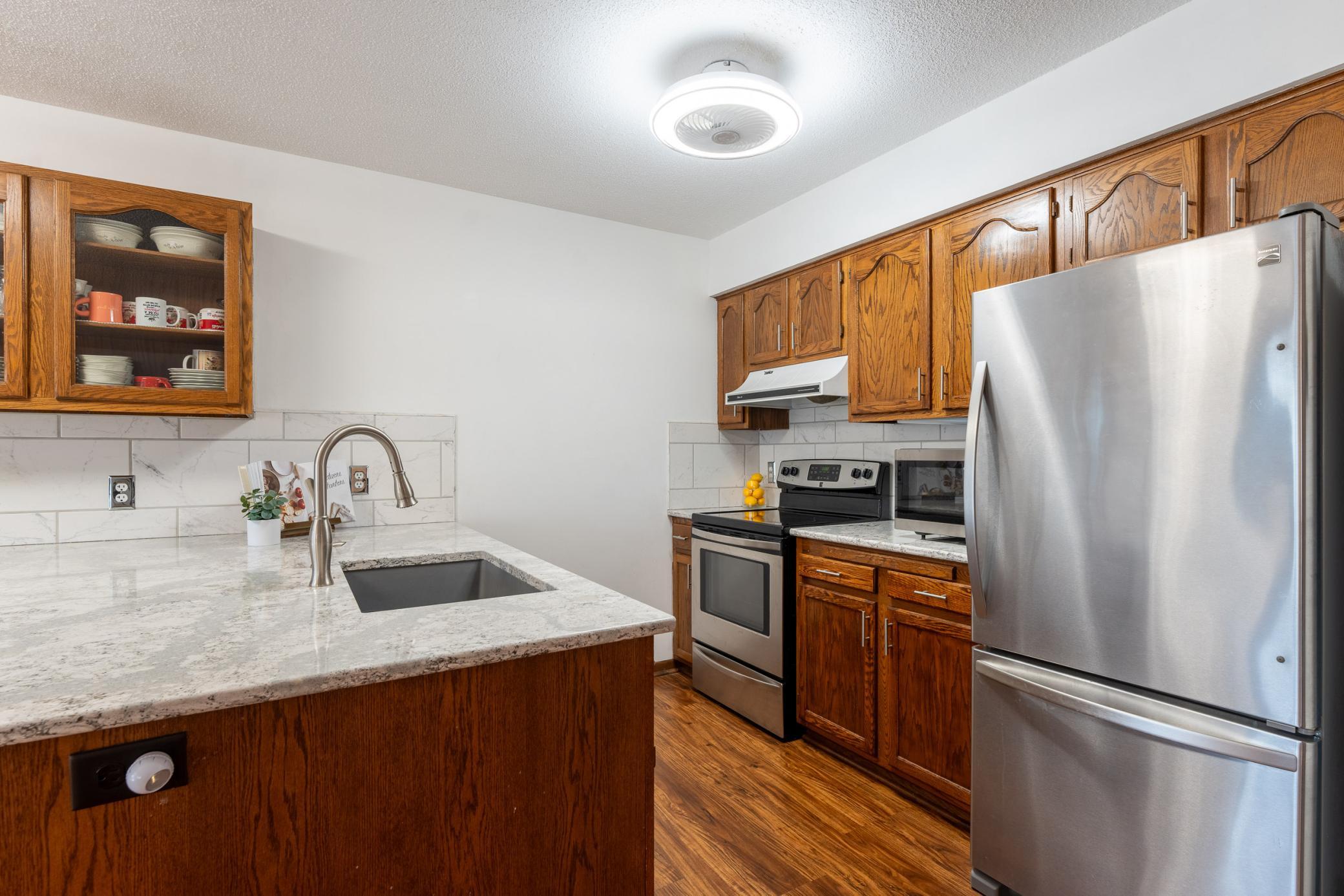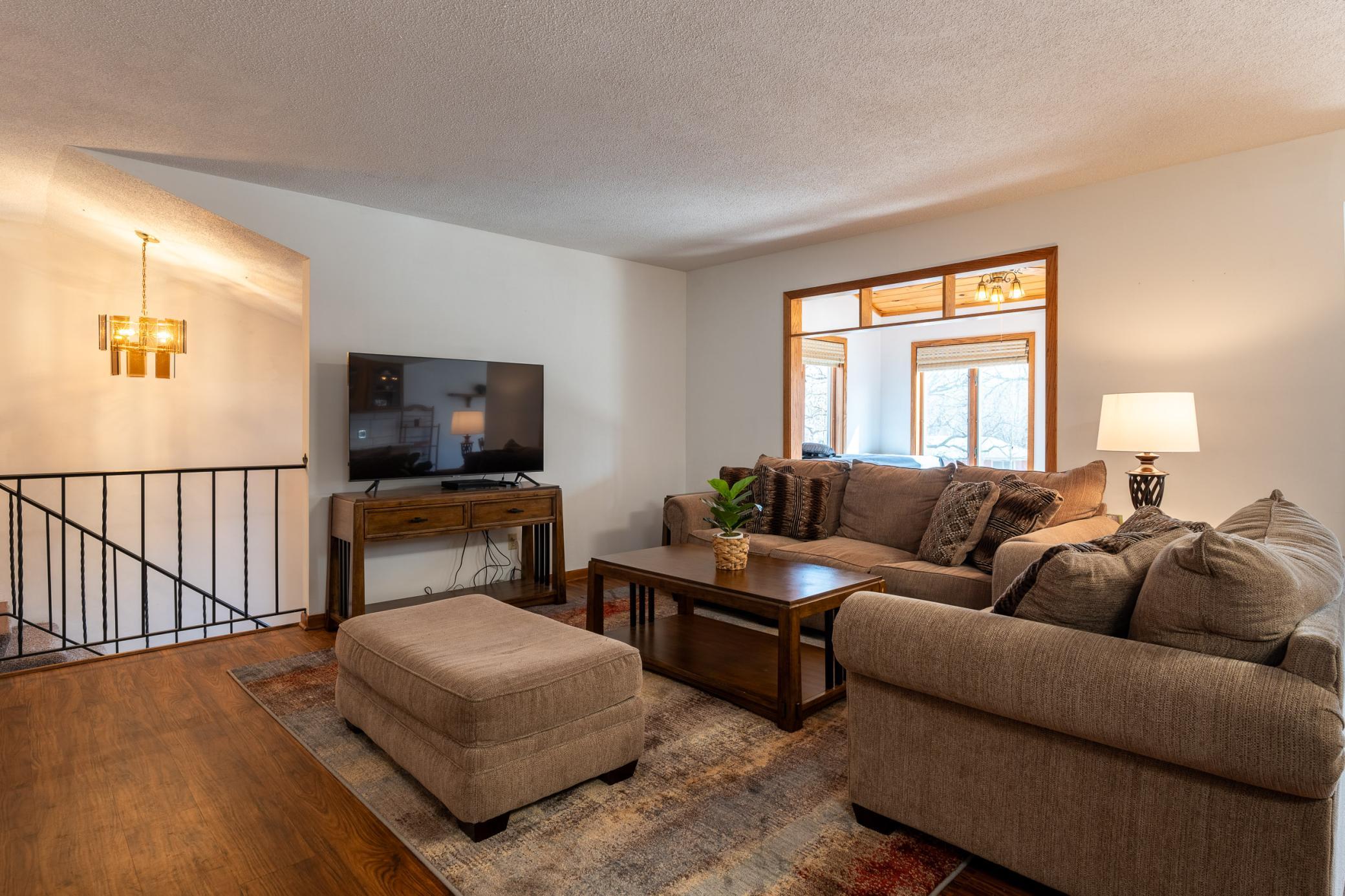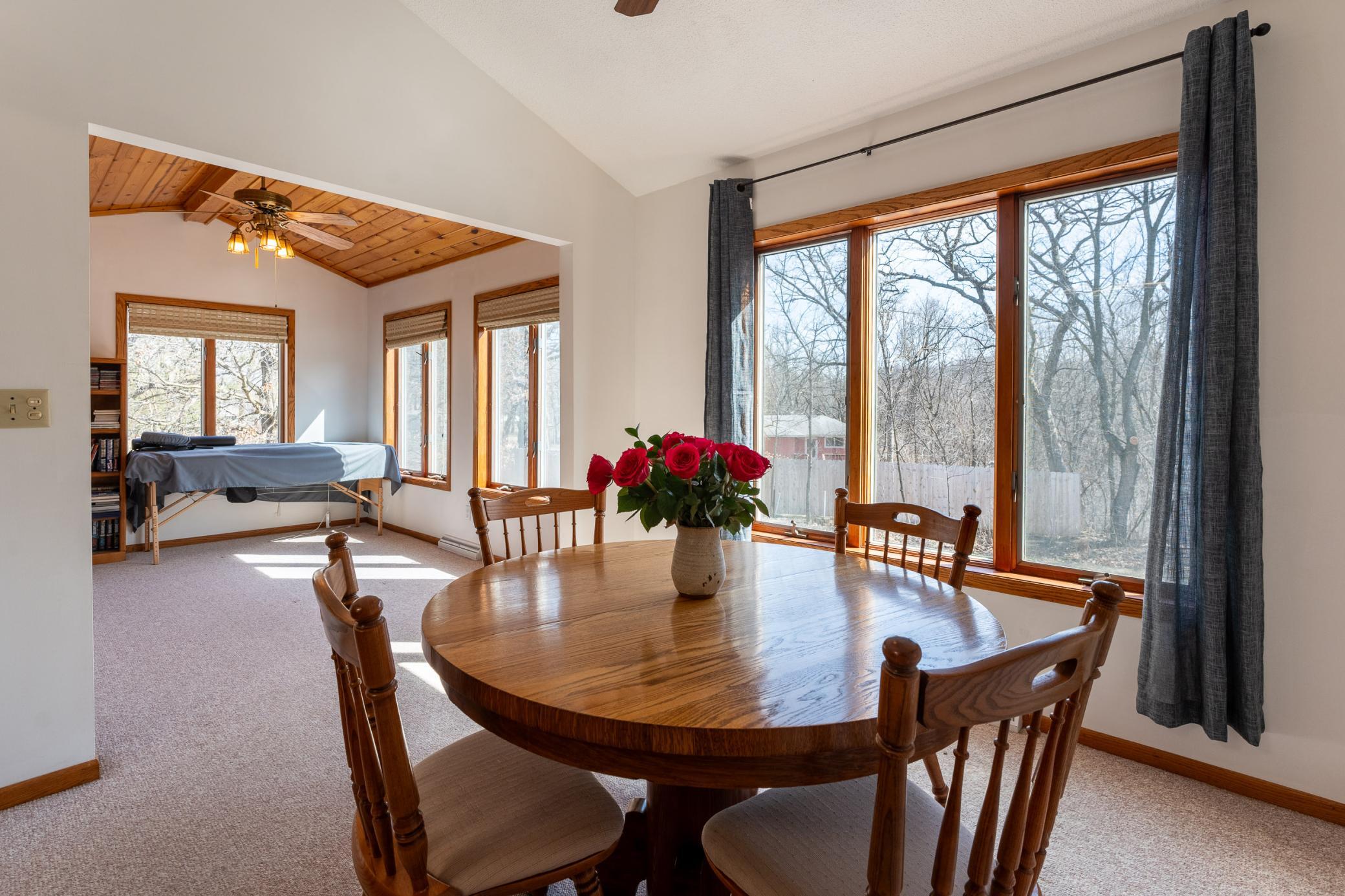 Tucked among mature trees at the end of a quiet street, this end-unit townhome offers a surprising sense of privacy - hard to come by in townhome living! The main level features an open layout connecting the living room, informal dining area, kitchen, and sunroom - perfect for everyday living and entertaining. The updated kitchen serves a fresh look with solid-surface countertops, a tile backsplash, updated hardware, and modern light fixtures. A buffet-style peninsula provides additional counter and cabinet space for added functionality. Two bedrooms and a full bath complete the main level. The lower level offers flexible living space with a large family room or workout area, a third bedroom, another full bath, laundry, and direct entry from the insulated two-car garage. A new roof was installed in 2022. Conveniently located with quick access to Hwy 61 and just minutes from the heart of Red Wing - where historic charm meets vibrant downtown life, scenic river views, shops, dining, and more!