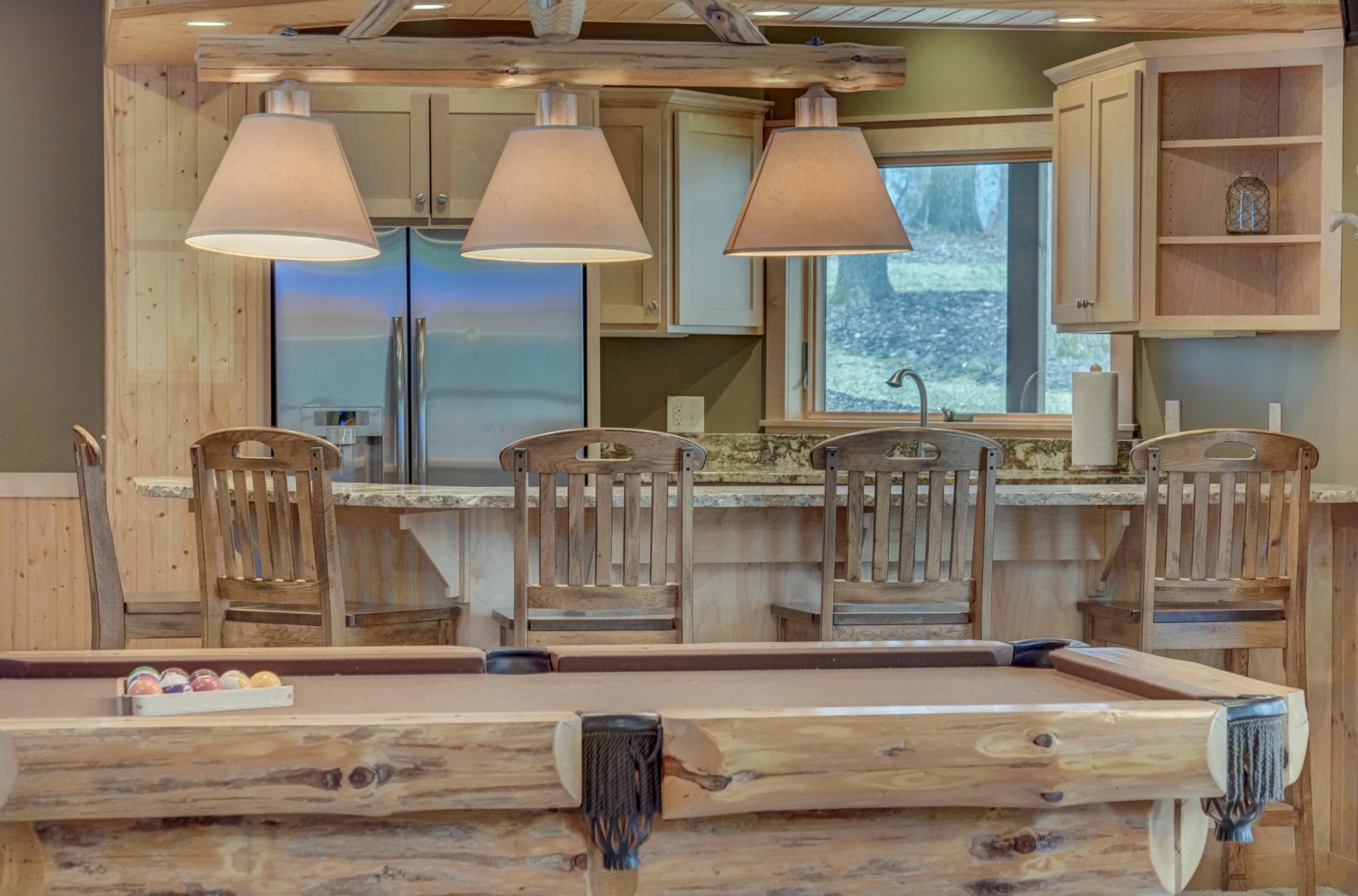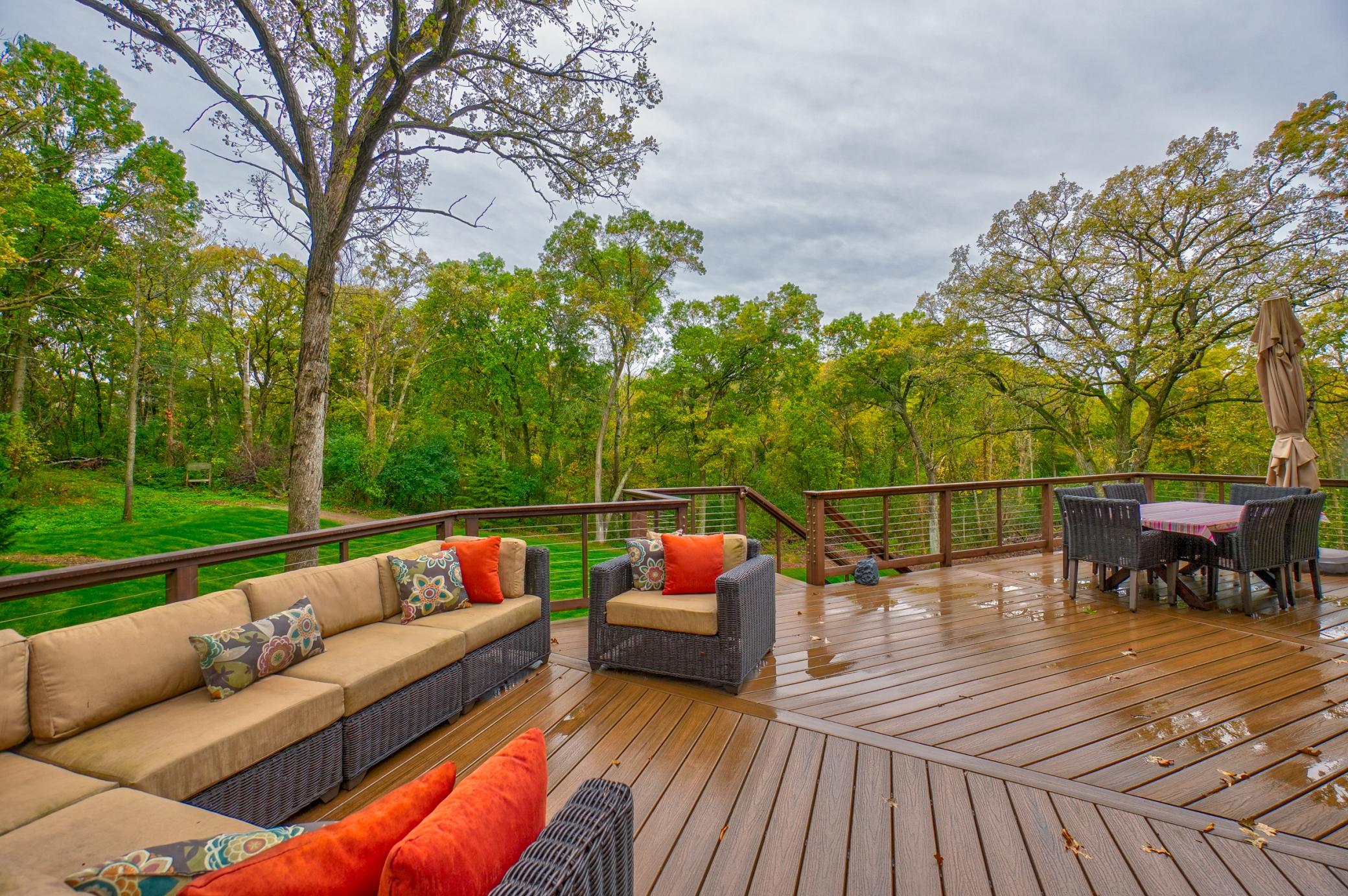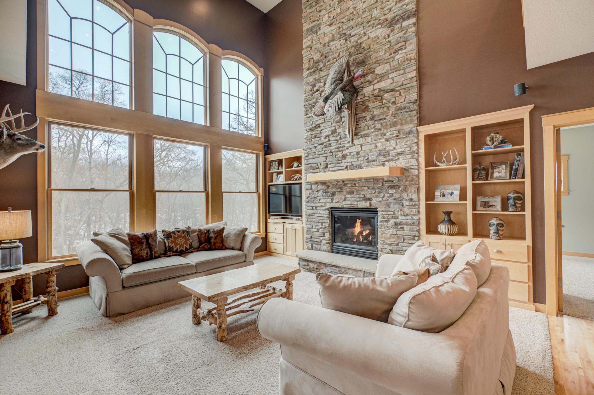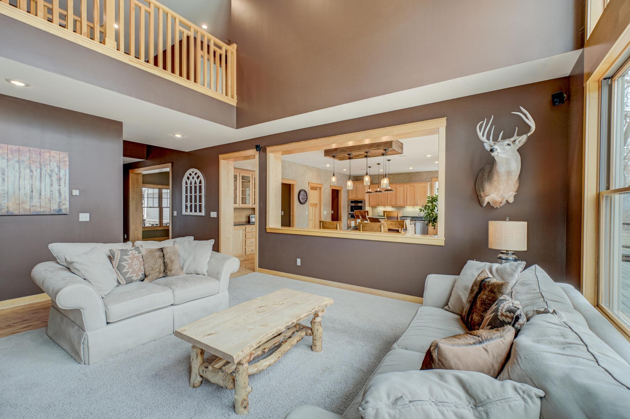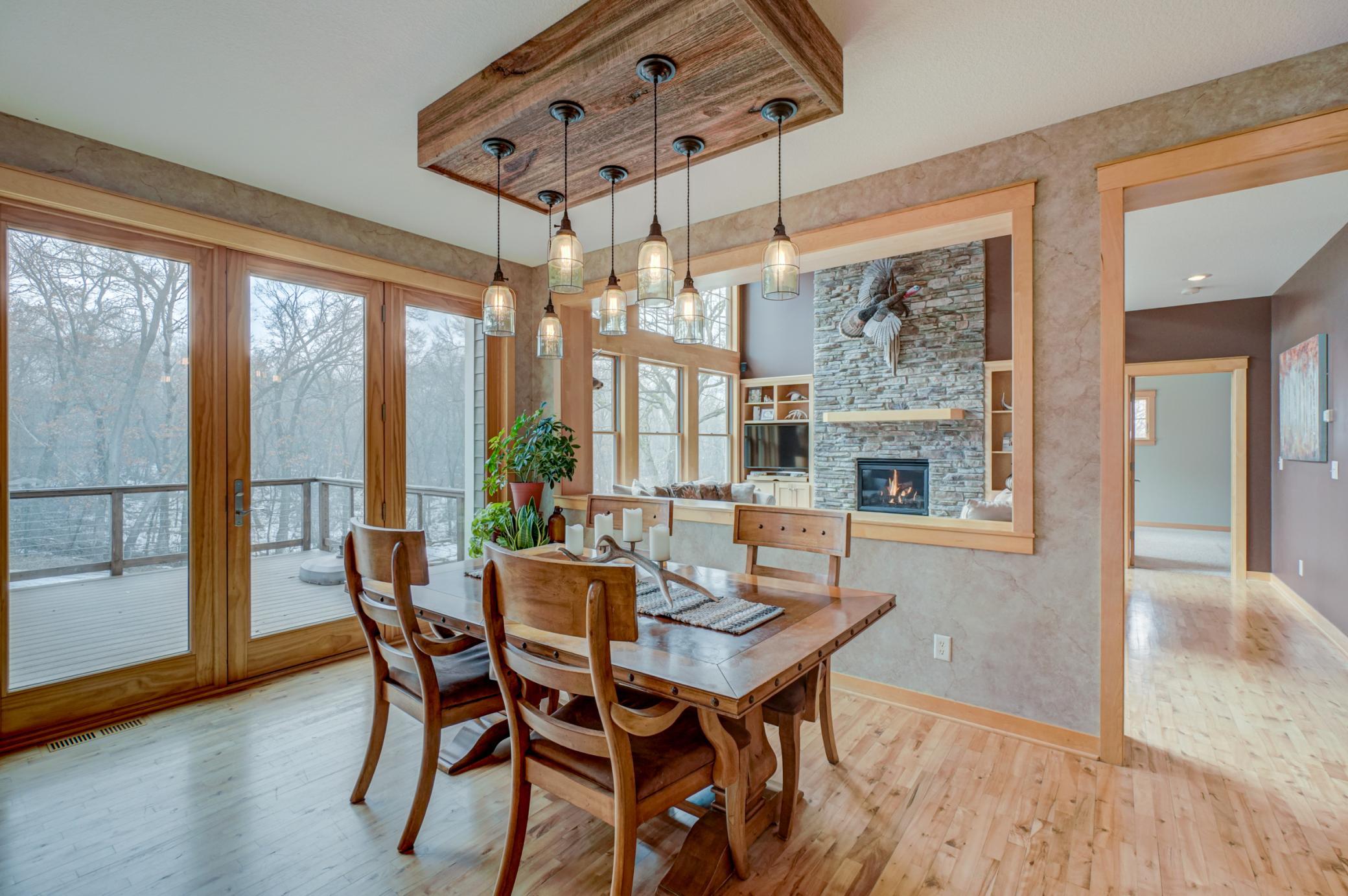 Expertly crafted by Al Hines, this stunning 5 bed, 4 bath home blends timeless design with warm, rustic charm offering an exceptional living experience inside and out. Step into a welcoming open layout defined by soaring ceilings, rich hardwood floors, and natural light pouring through oversized windows. The living room, open to the upper level balcony, features a striking fireplace and flows effortlessly into the eat in kitchen, complete with granite countertops, stainless steel appliances, a walk in pantry, and direct access to the expansive, maintenance free walkout deck. A formal dining room, dedicated office, generous mudroom, and spacious laundry room add ease and functionality to everyday living. Upstairs, enjoy light filled bedrooms with generous closets, including a serene primary suite with a spa like bath featuring in floor heat, a soaking tub, and a massive walk in closet. The bonus living space above the garage offers endless versatility-perfect for work, play, or guests. The walkout lower level is an entertainer’s dream, showcasing a roomy living area with a cozy fireplace, a theater room with projector and screen, and a stunning rustic bar outfitted with granite counters, a sink, fridge, and wine fridge. Relax in the sauna, recharge in the home gym, or host unforgettable gatherings—this level is designed for comfort and fun. Outside, your private retreat awaits on 9 wooded acres complete with a sprawling yard, a 24x36 outbuilding with 10 ft doors and concrete floors, and a 3 car garage featuring in floor heat, a floor drain, and basement access. Whether you're hosting a summer barbecue or soaking up the peaceful surroundings, the outdoor space is designed to elevate every season. Ideally located between Hudson and Stillwater, and just minutes from White Eagle & St. Croix National Golf Courses, this home offers the perfect blend of country privacy and convenient access to everything you need. A rare opportunity that truly checks all the boxes. Schedule your showing today!