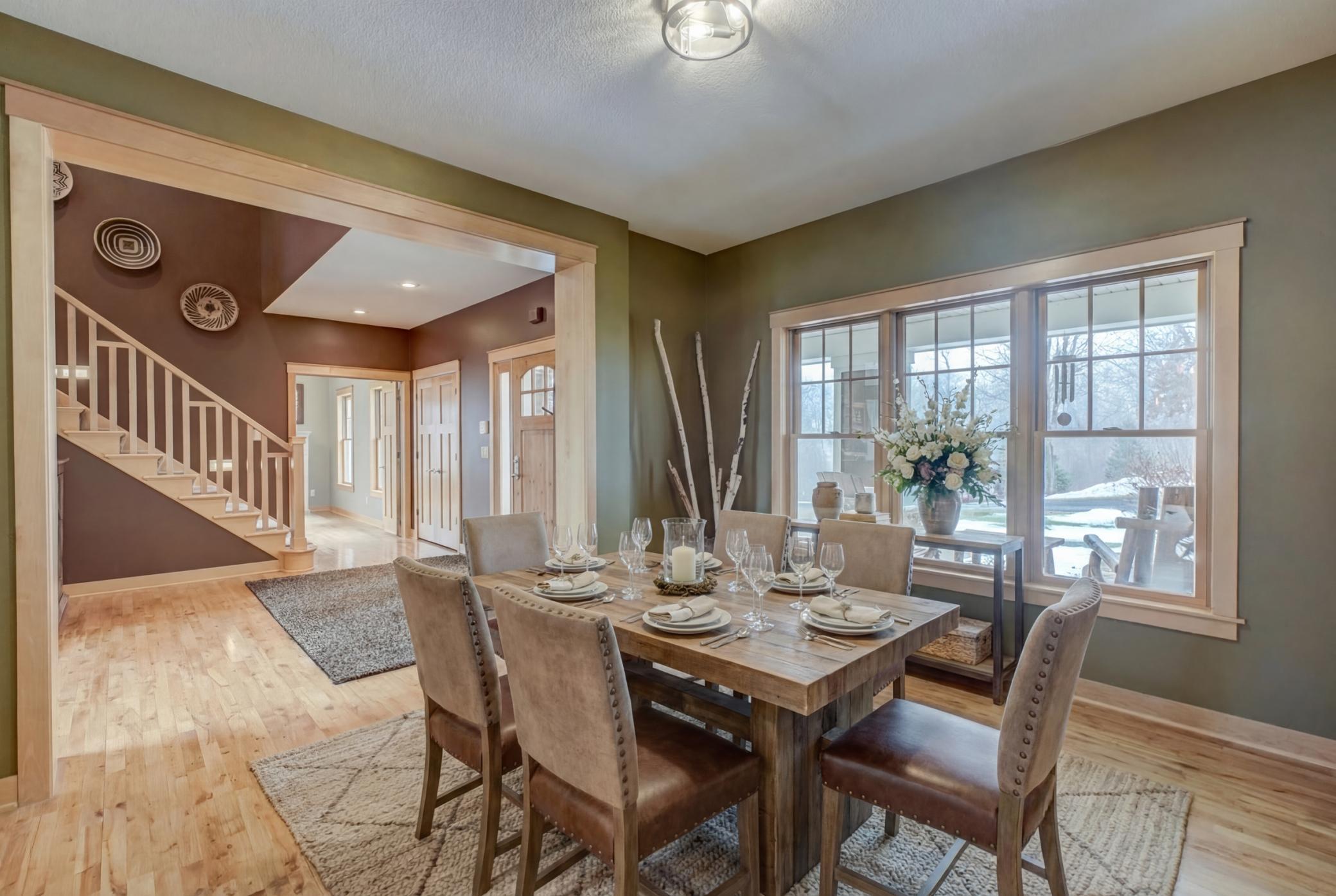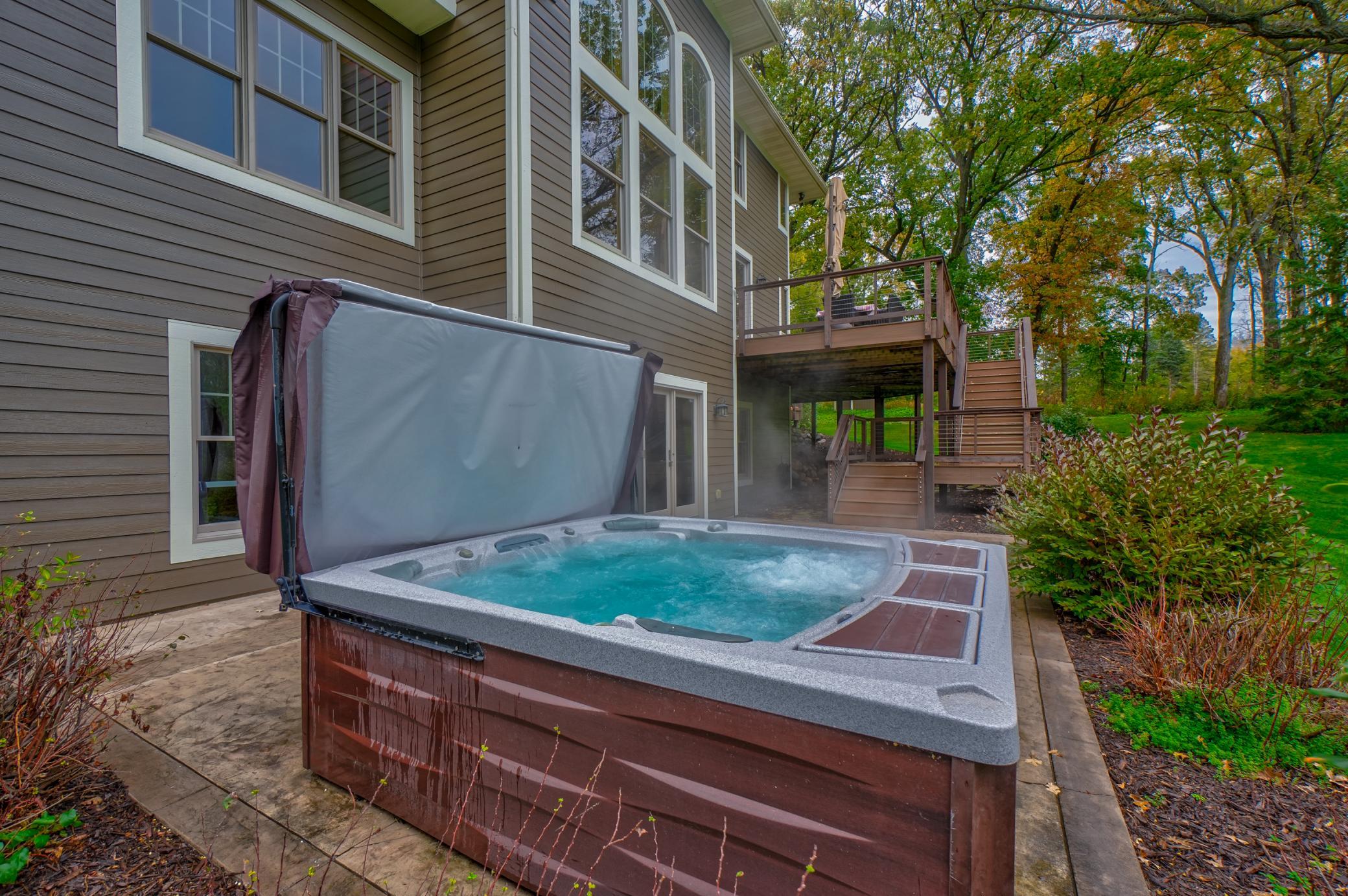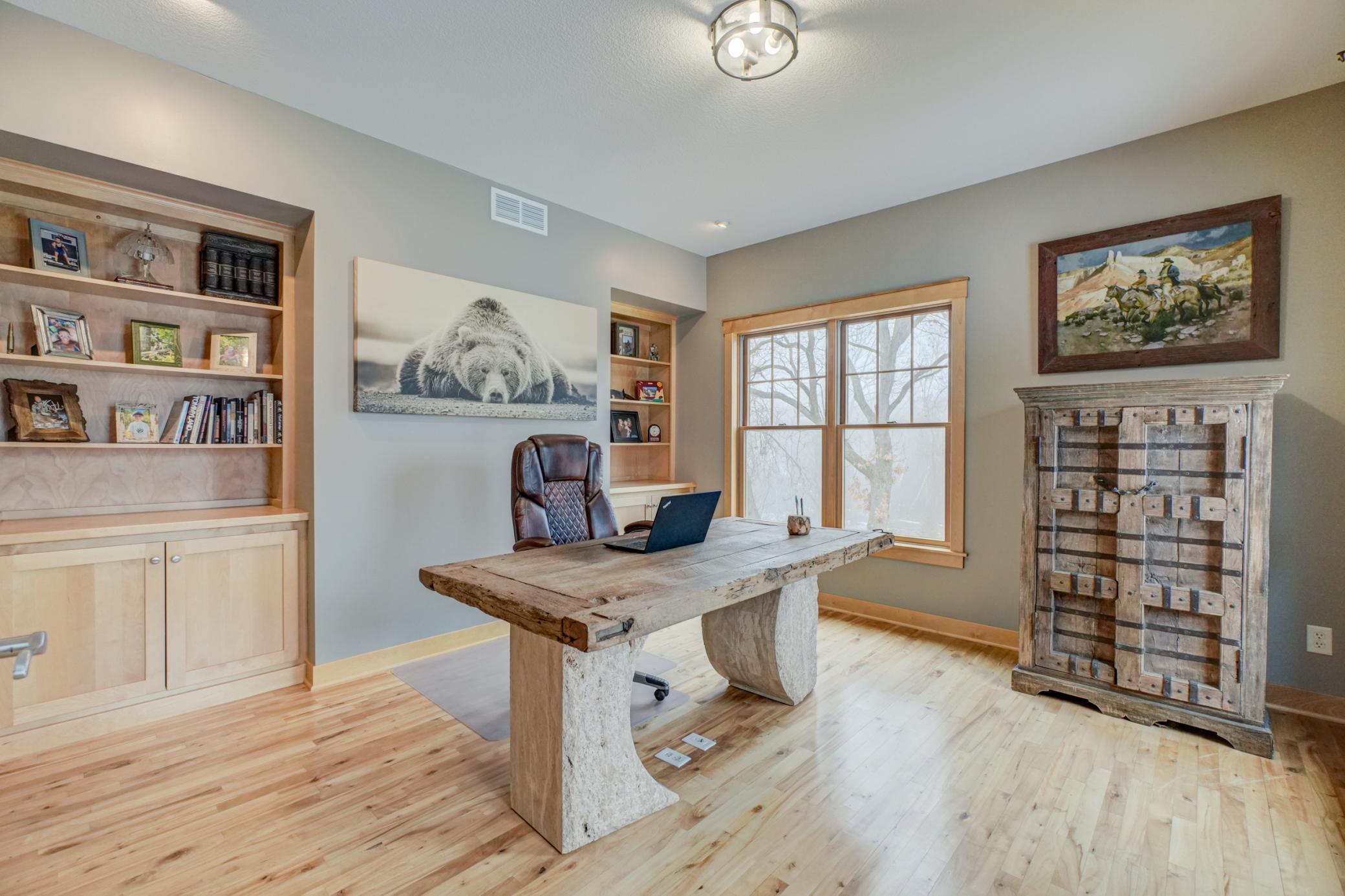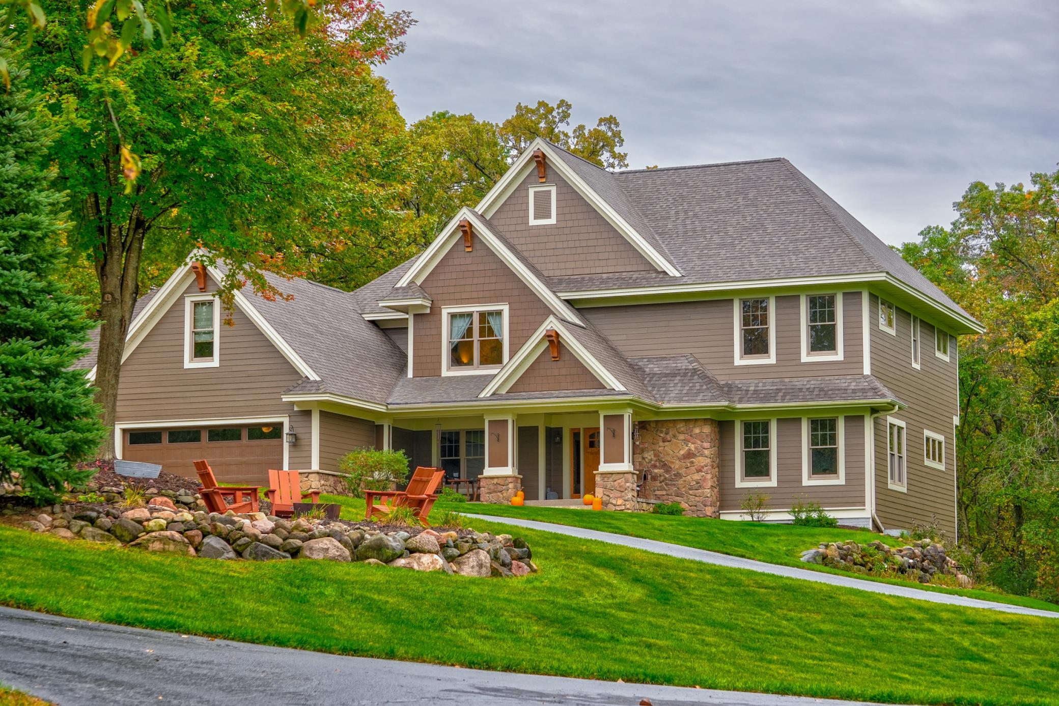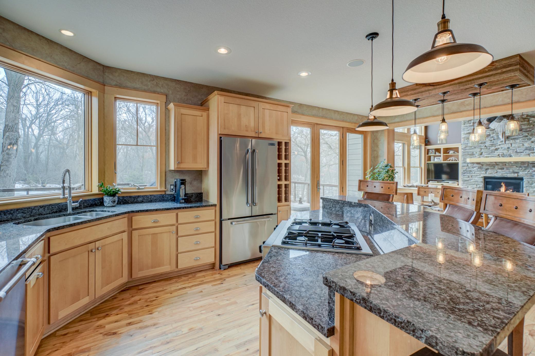 Expertly crafted by Al Hines, this stunning 5 bed, 4 bath home blends timeless design with warm, rustic charm offering an exceptional living experience inside and out. Step into a welcoming open layout defined by soaring ceilings, rich hardwood floors, and natural light pouring through oversized windows. The living room, open to the upper level balcony, features a striking fireplace and flows effortlessly into the eat in kitchen, complete with granite countertops, stainless steel appliances, a walk in pantry, and direct access to the expansive, maintenance free walkout deck. A formal dining room, dedicated office, generous mudroom, and spacious laundry room add ease and functionality to everyday living. Upstairs, enjoy light filled bedrooms with generous closets, including a serene primary suite with a spa like bath featuring in floor heat, a soaking tub, and a massive walk in closet. The bonus living space above the garage offers endless versatility-perfect for work, play, or guests. The walkout lower level is an entertainer’s dream, showcasing a roomy living area with a cozy fireplace, a theater room with projector and screen, and a stunning rustic bar outfitted with granite counters, a sink, fridge, and wine fridge. Relax in the sauna, recharge in the home gym, or host unforgettable gatherings—this level is designed for comfort and fun. Outside, your private retreat awaits on 9 wooded acres complete with a sprawling yard, a 24x36 outbuilding with 10 ft doors and concrete floors, and a 3 car garage featuring in floor heat, a floor drain, and basement access. Whether you're hosting a summer barbecue or soaking up the peaceful surroundings, the outdoor space is designed to elevate every season. Ideally located between Hudson and Stillwater, and just minutes from White Eagle & St. Croix National Golf Courses, this home offers the perfect blend of country privacy and convenient access to everything you need. A rare opportunity that truly checks all the boxes. Schedule your showing today!