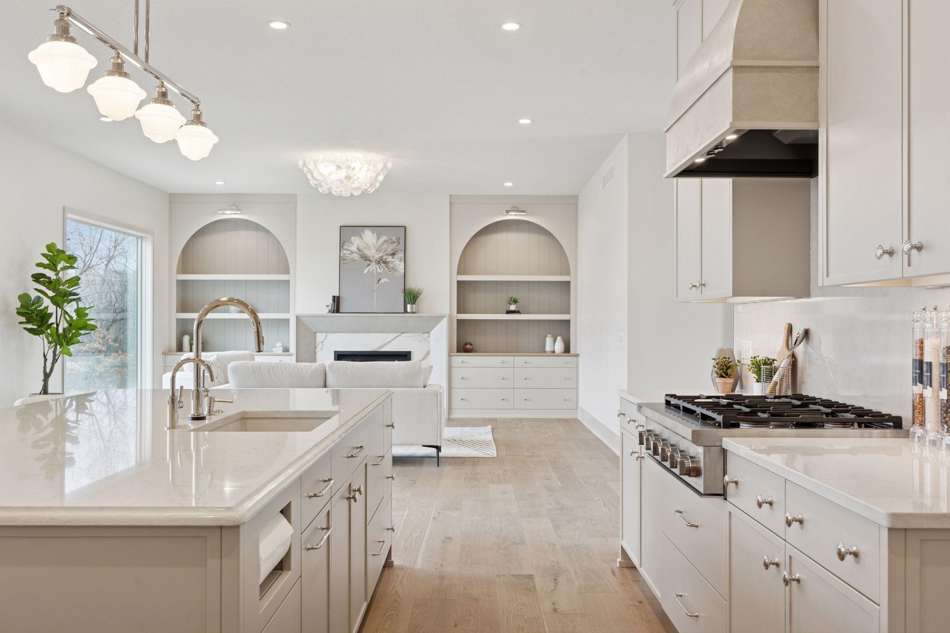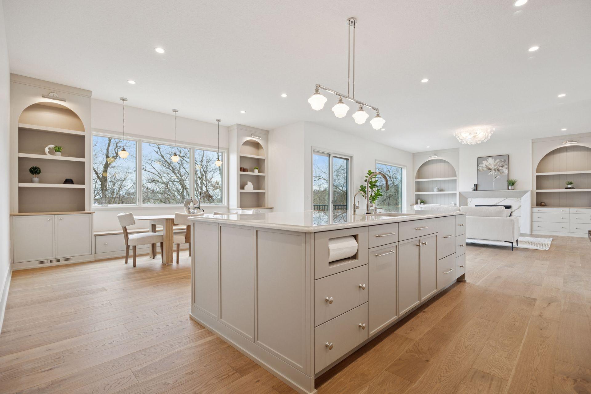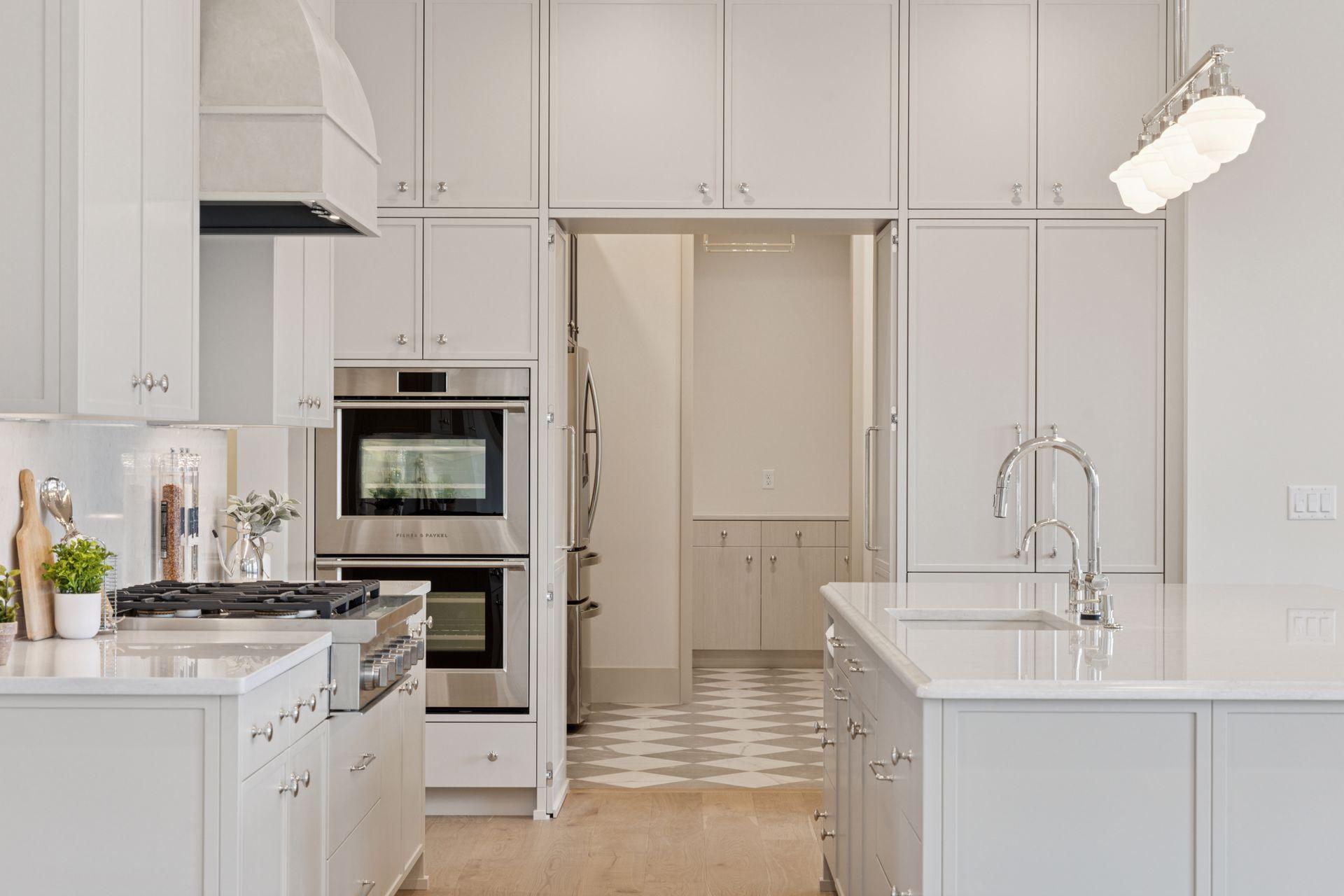 The light-filled main level features soaring 10 ft. ceilings, European white oak floors, and expansive windows. The designer kitchen includes a premium Fisher-Paykel appliance package, an oversized walk-in pantry, and a hidden scullery kitchen—perfect for discreet prep work. A custom plaster fireplace adds warmth and timeless style to the living space.