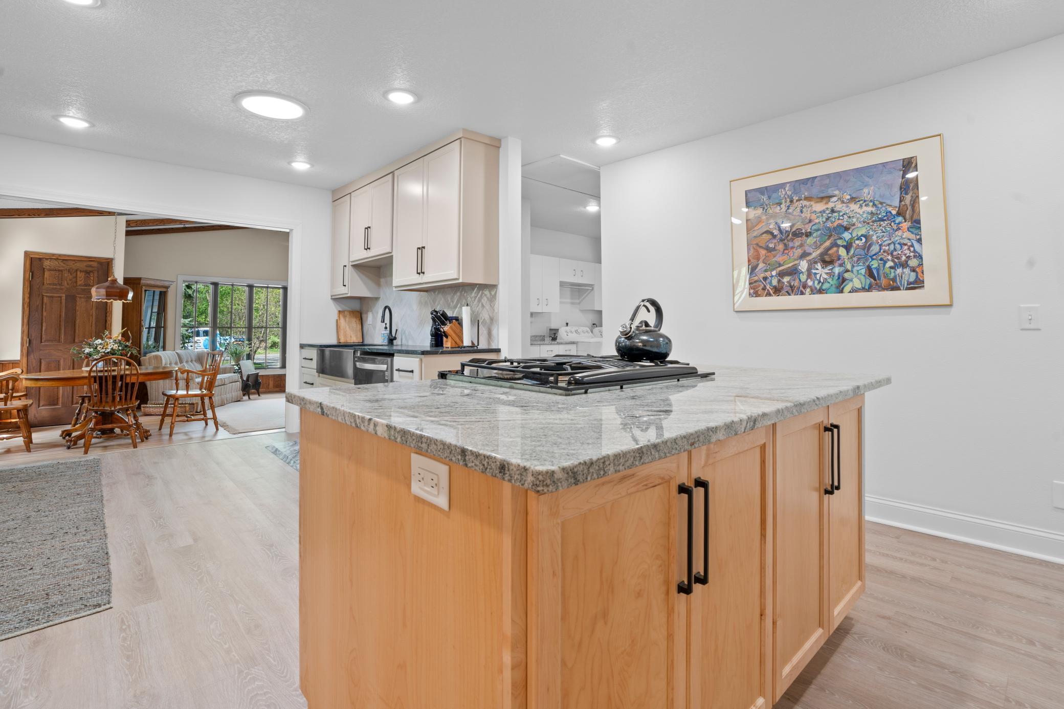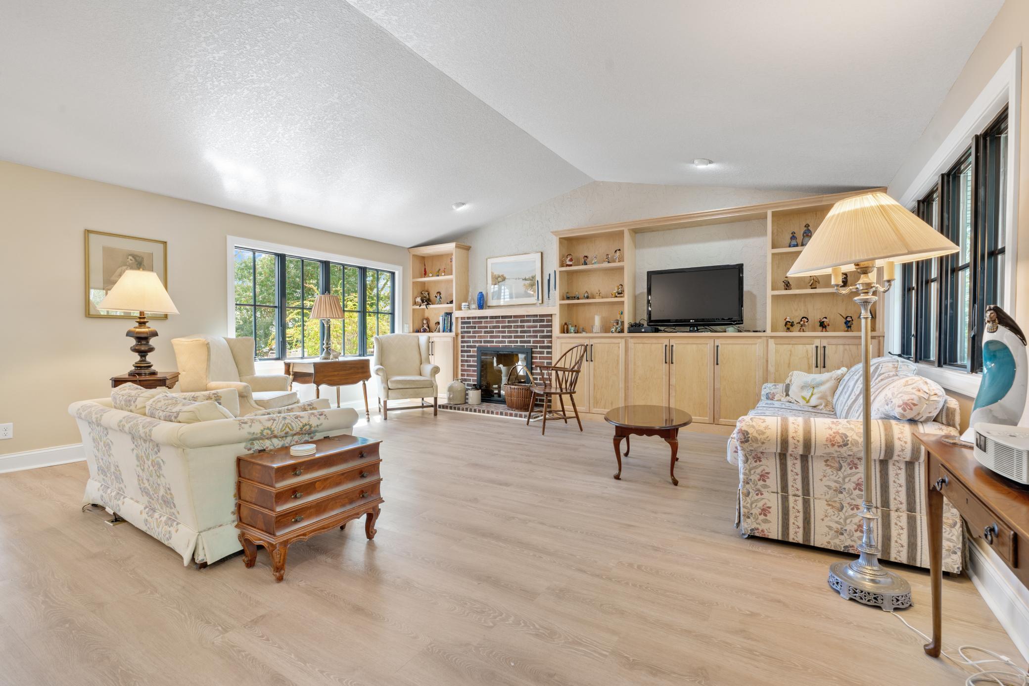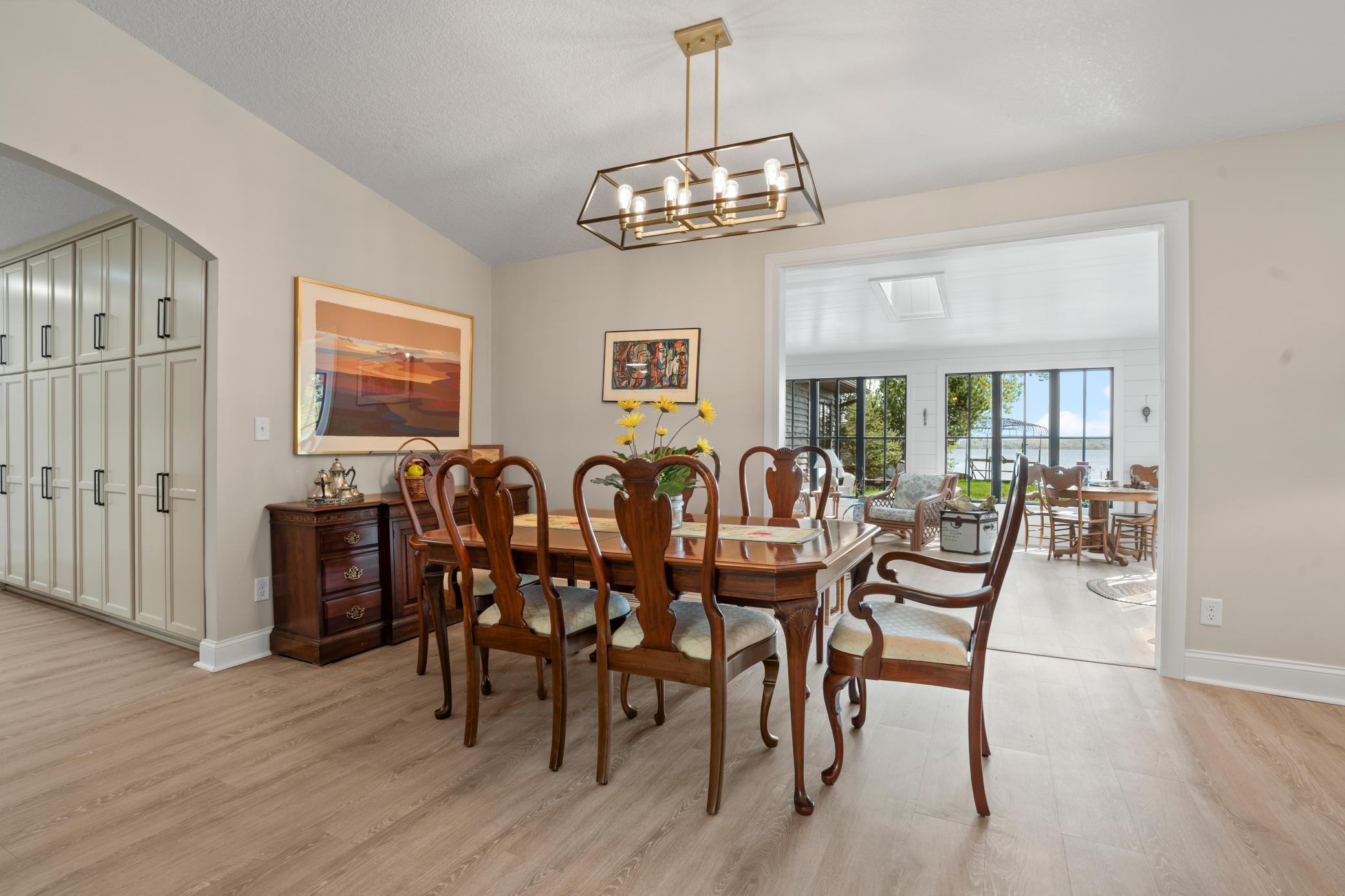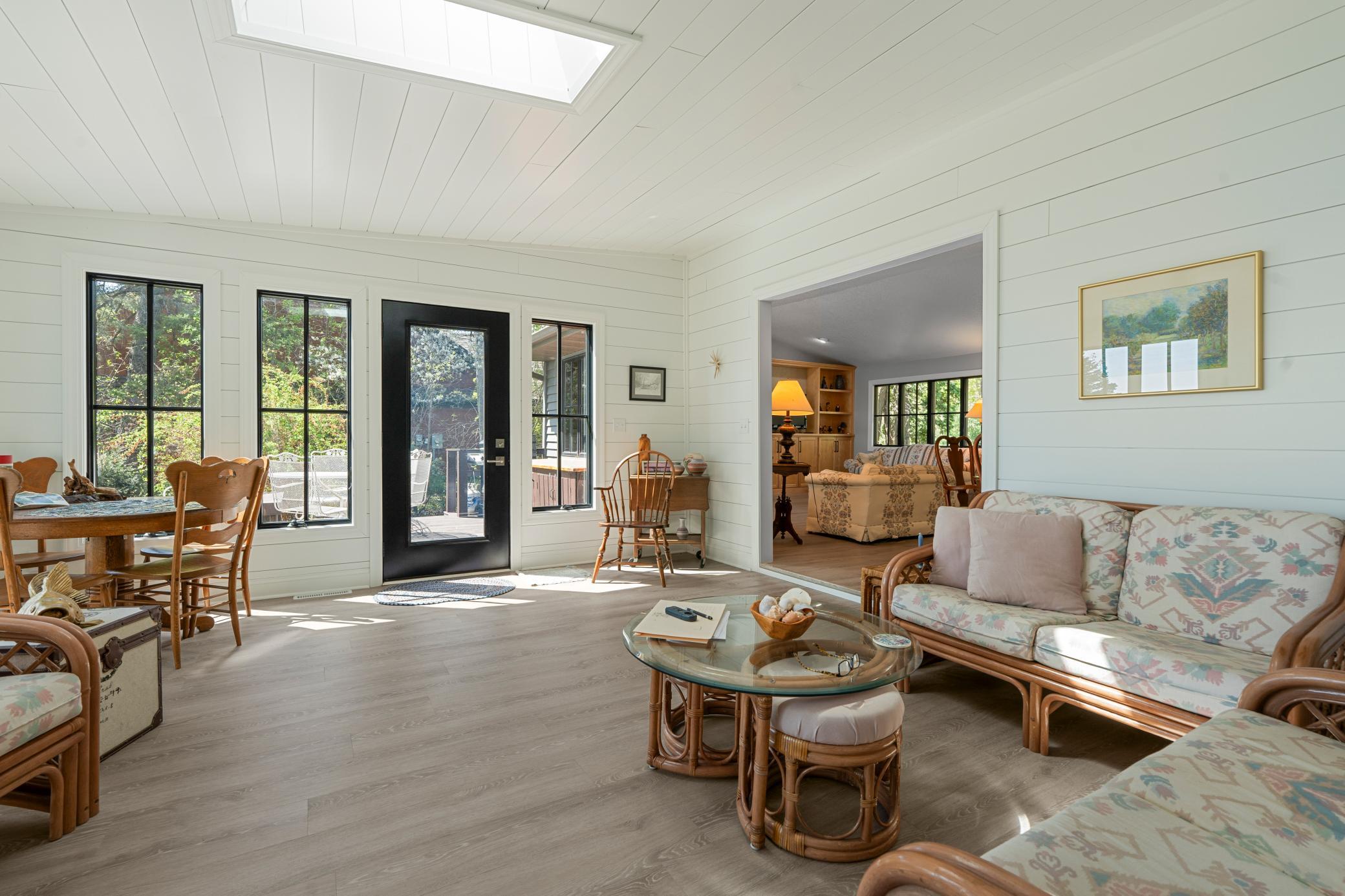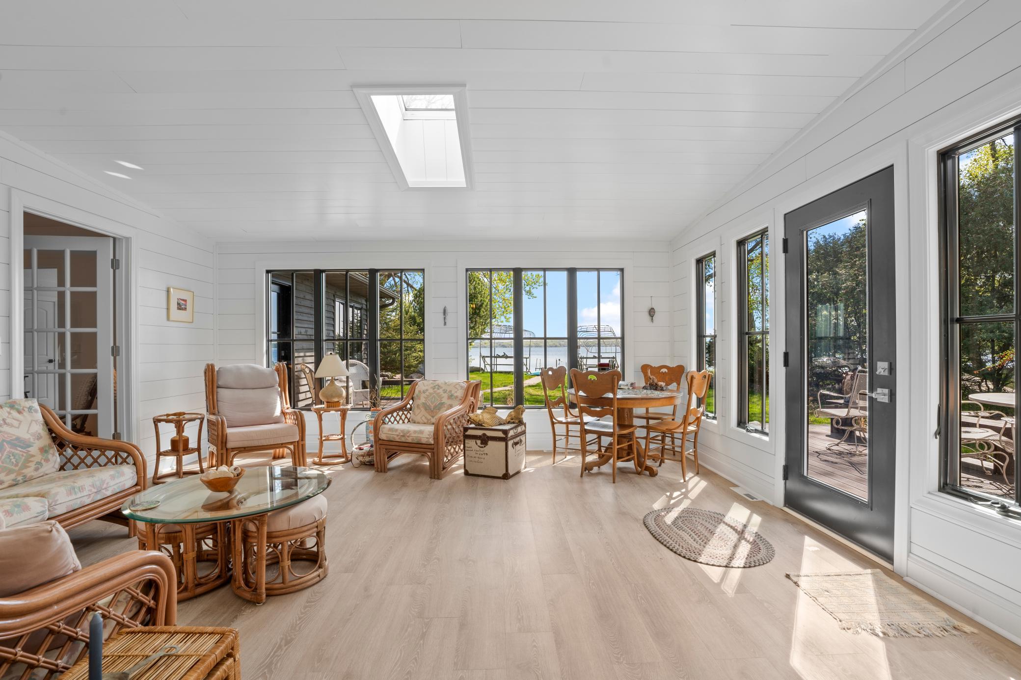 Inside, the home is just as impressive. Recent upgrades include Andersen windows, Bayer exterior doors, stylish laminate flooring, and handcrafted kitchen cabinetry topped with soapstone counters and a granite island. The 4-season lakeside porch, with its charming shipboard walls, offers stunning views and a perfect space for entertaining or relaxing.