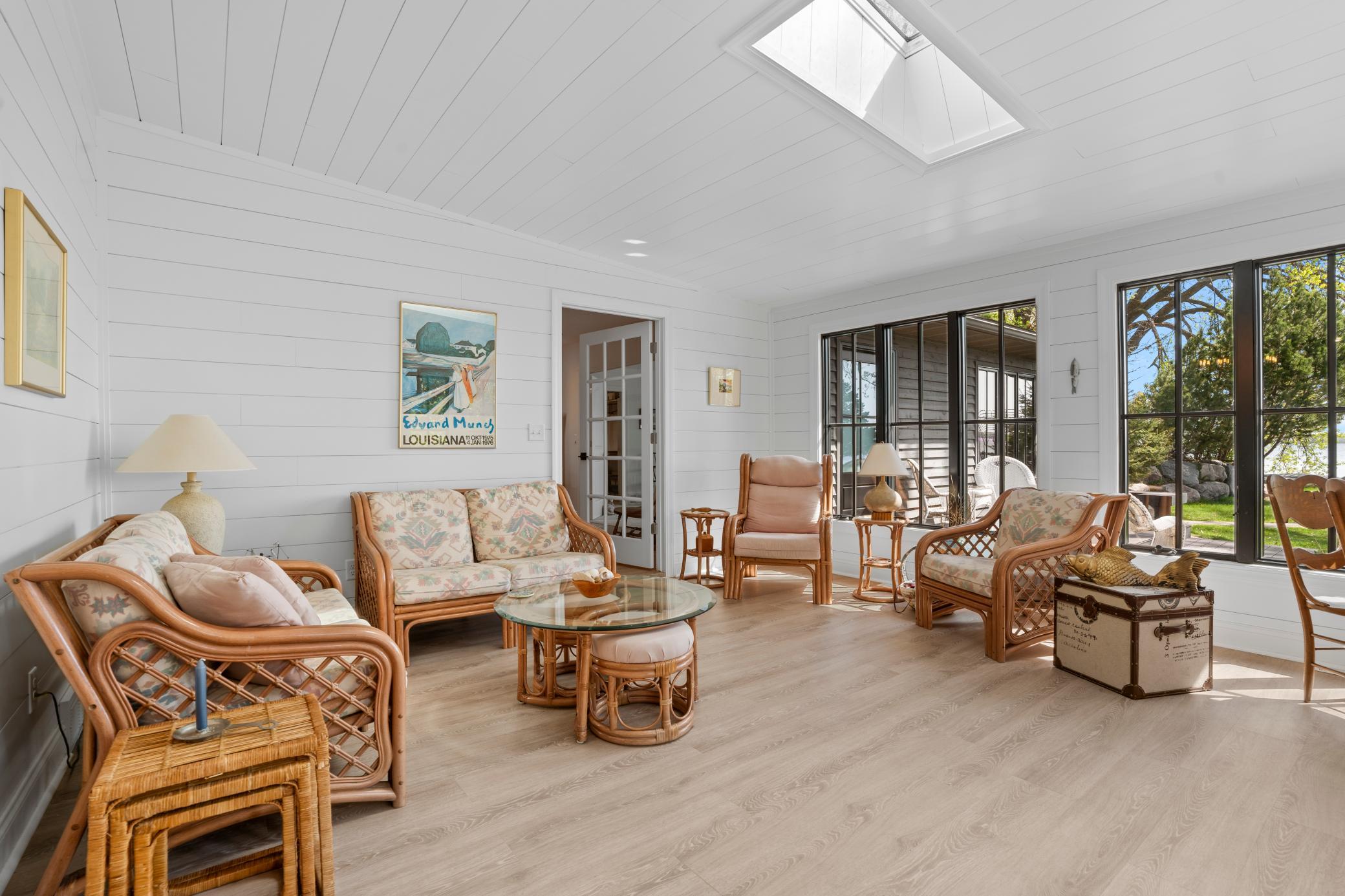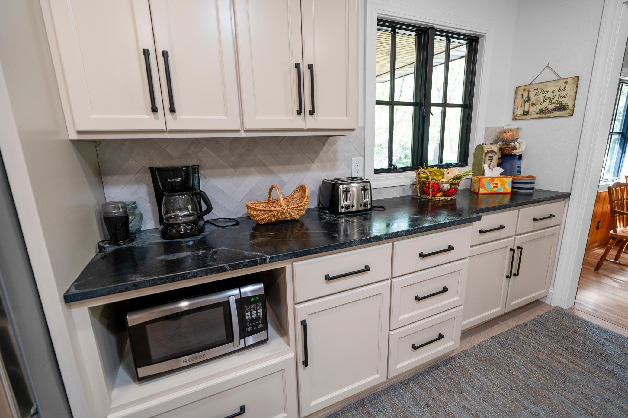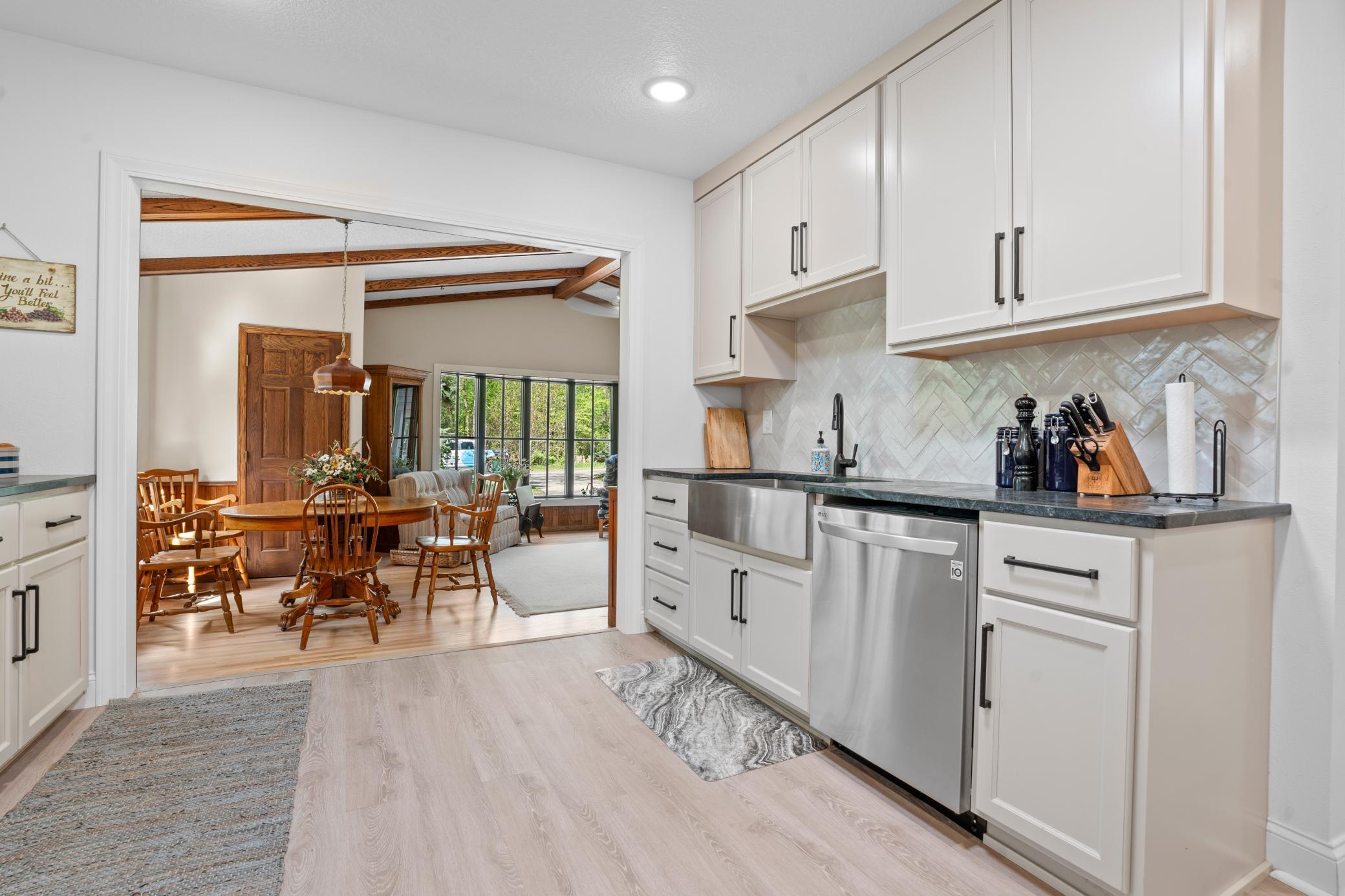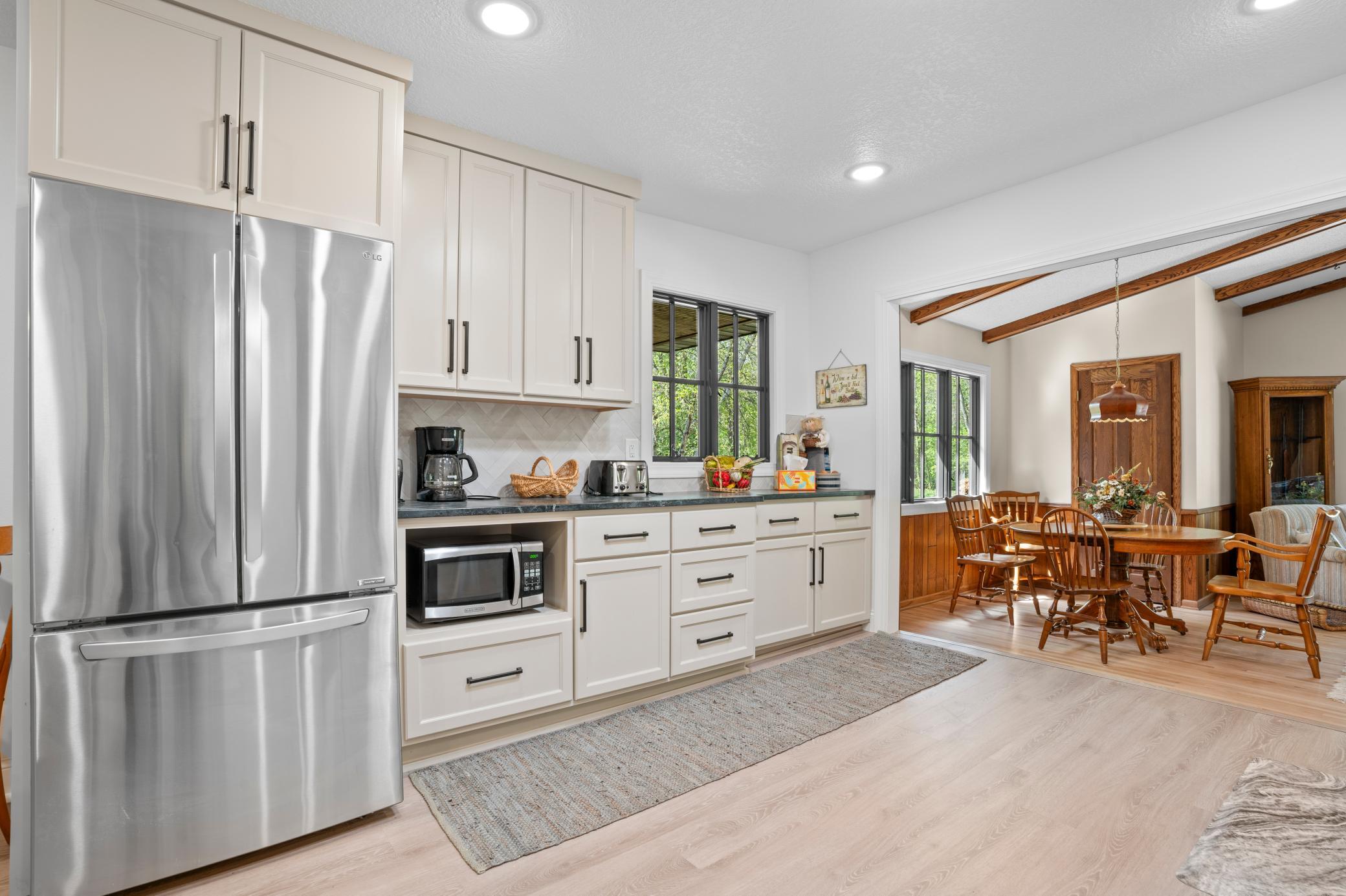 Inside, the home is just as impressive. Recent upgrades include Andersen windows, Bayer exterior doors, stylish laminate flooring, and handcrafted kitchen cabinetry topped with soapstone counters and a granite island. The 4-season lakeside porch, with its charming shipboard walls, offers stunning views and a perfect space for entertaining or relaxing.
