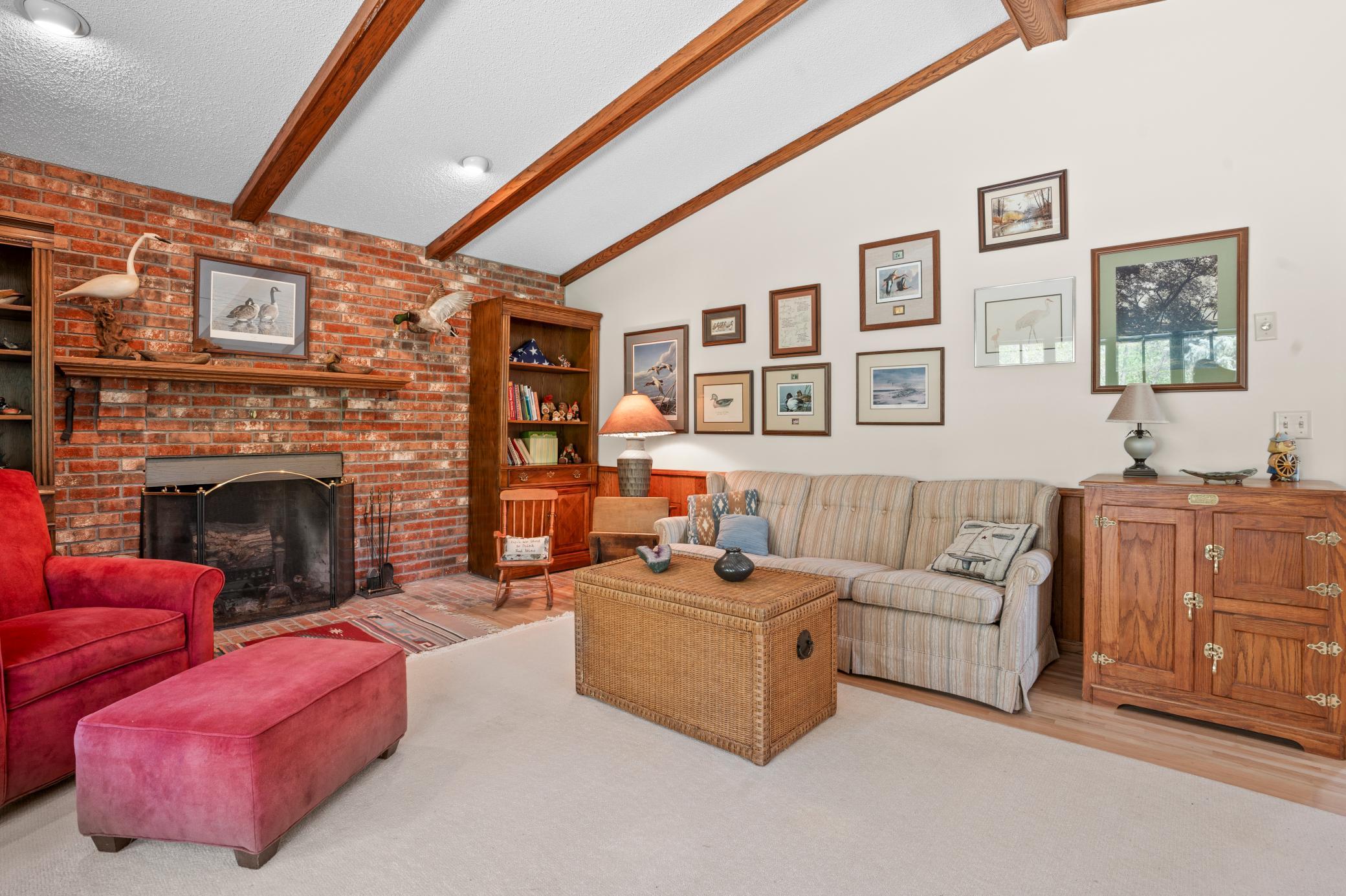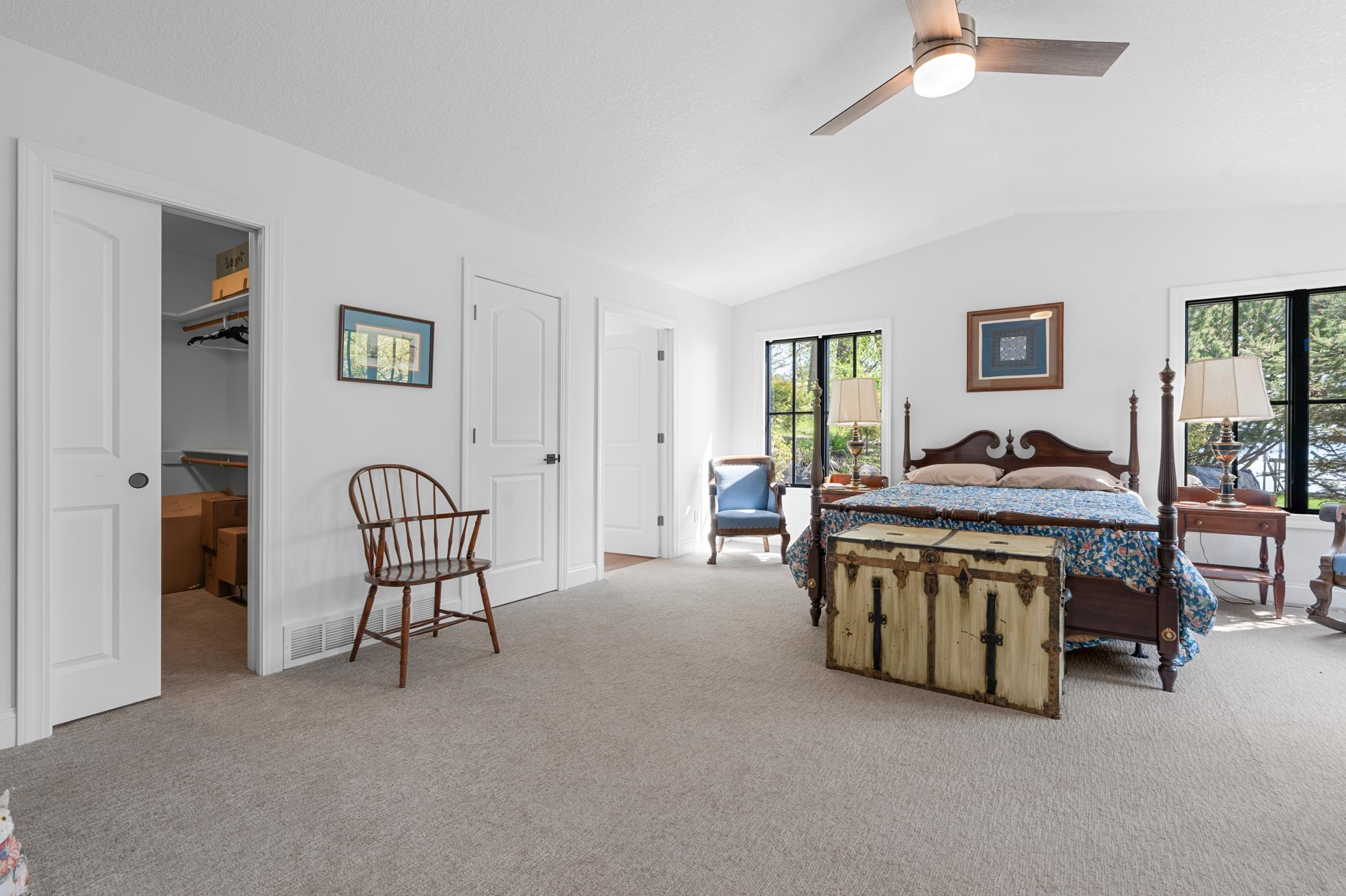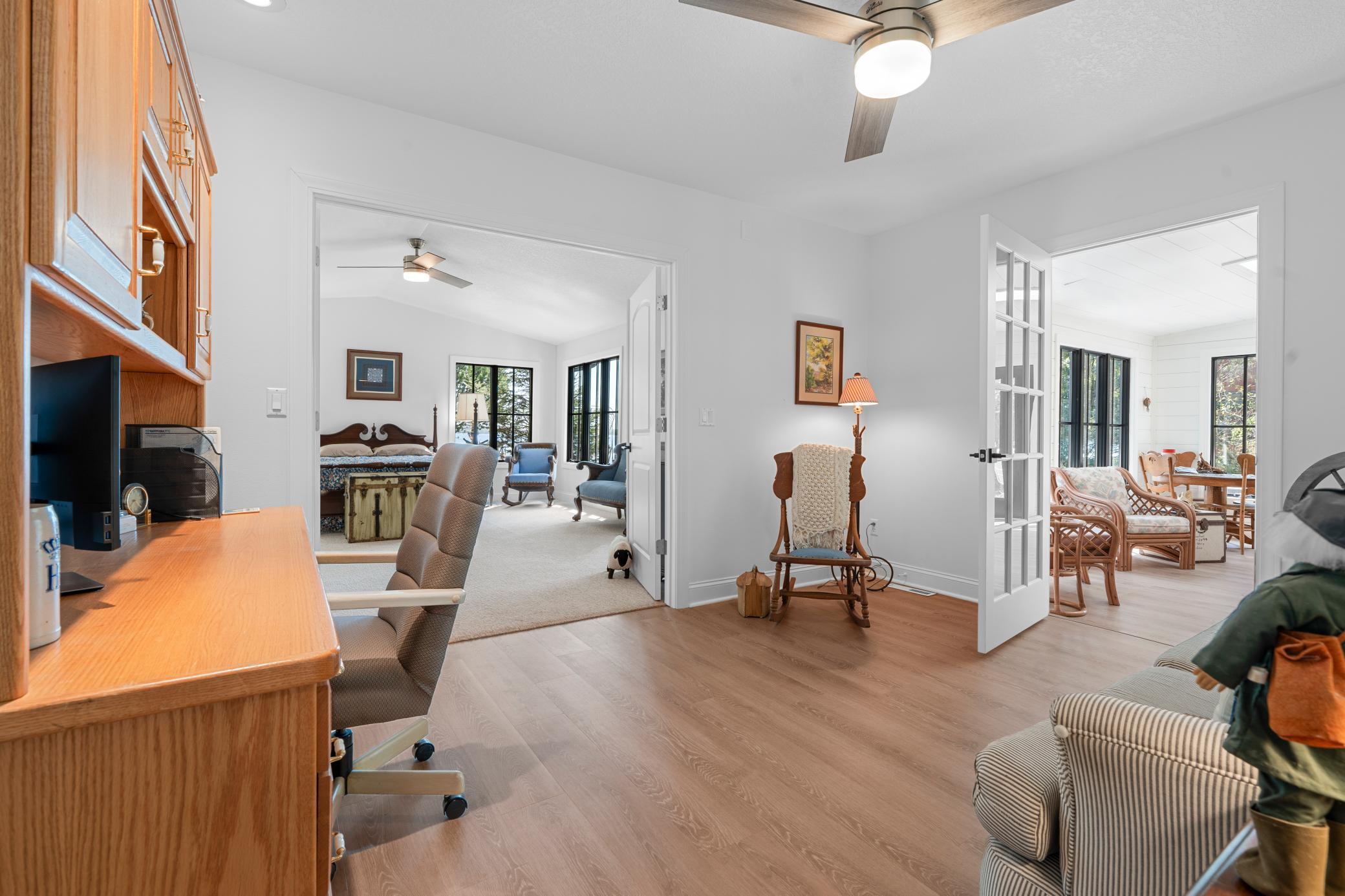 The spacious lakeside master ensuite includes a generous walk-in closet. 2 additional bedrooms give space for family or guests---serviced by full bath. Seems like one always needs an office and there is one of those, too! Not to miss the several solar tube lights throughout the home fill the interior with beautiful natural light. Enjoy two cozy fireplaces—a gas fireplace in the expansive open living room with its lakeview and a wood-burning one in the peaceful roadside family room.