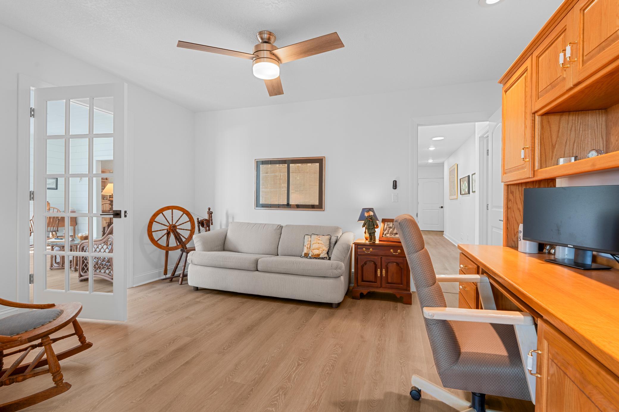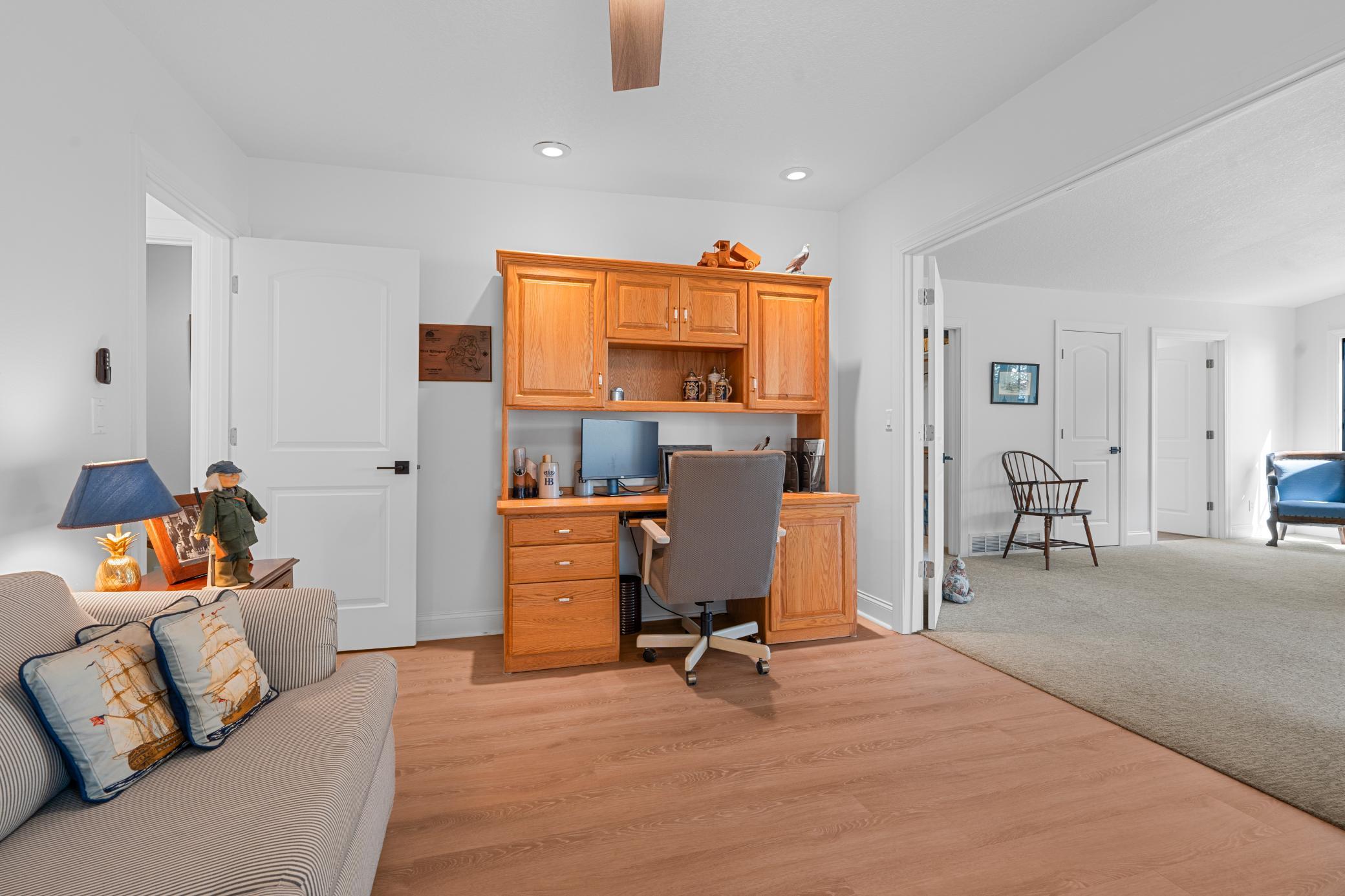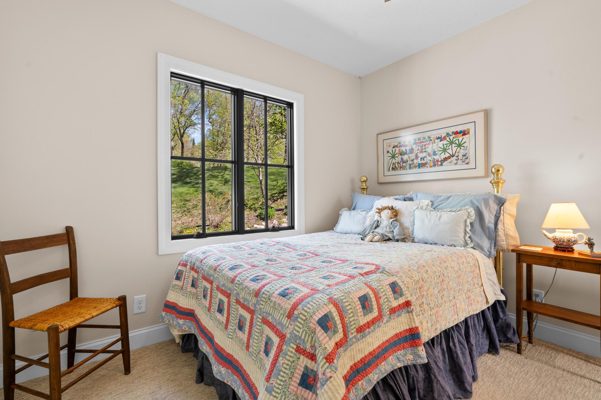 The spacious lakeside master ensuite includes a generous walk-in closet. 2 additional bedrooms give space for family or guests---serviced by full bath. Seems like one always needs an office and there is one of those, too! Not to miss the several solar tube lights throughout the home fill the interior with beautiful natural light. Enjoy two cozy fireplaces—a gas fireplace in the expansive open living room with its lakeview and a wood-burning one in the peaceful roadside family room.