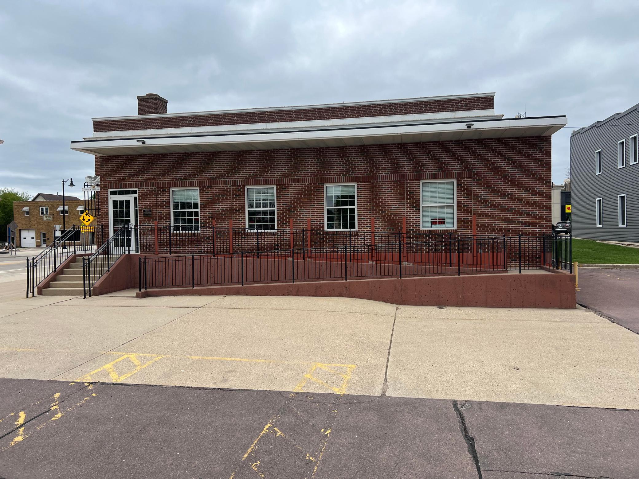 There are steps and a ramp at the east door with plenty of off street parking. The west side has steps and is on Downtown Plaza. This connects you with all the downtown amenities.
