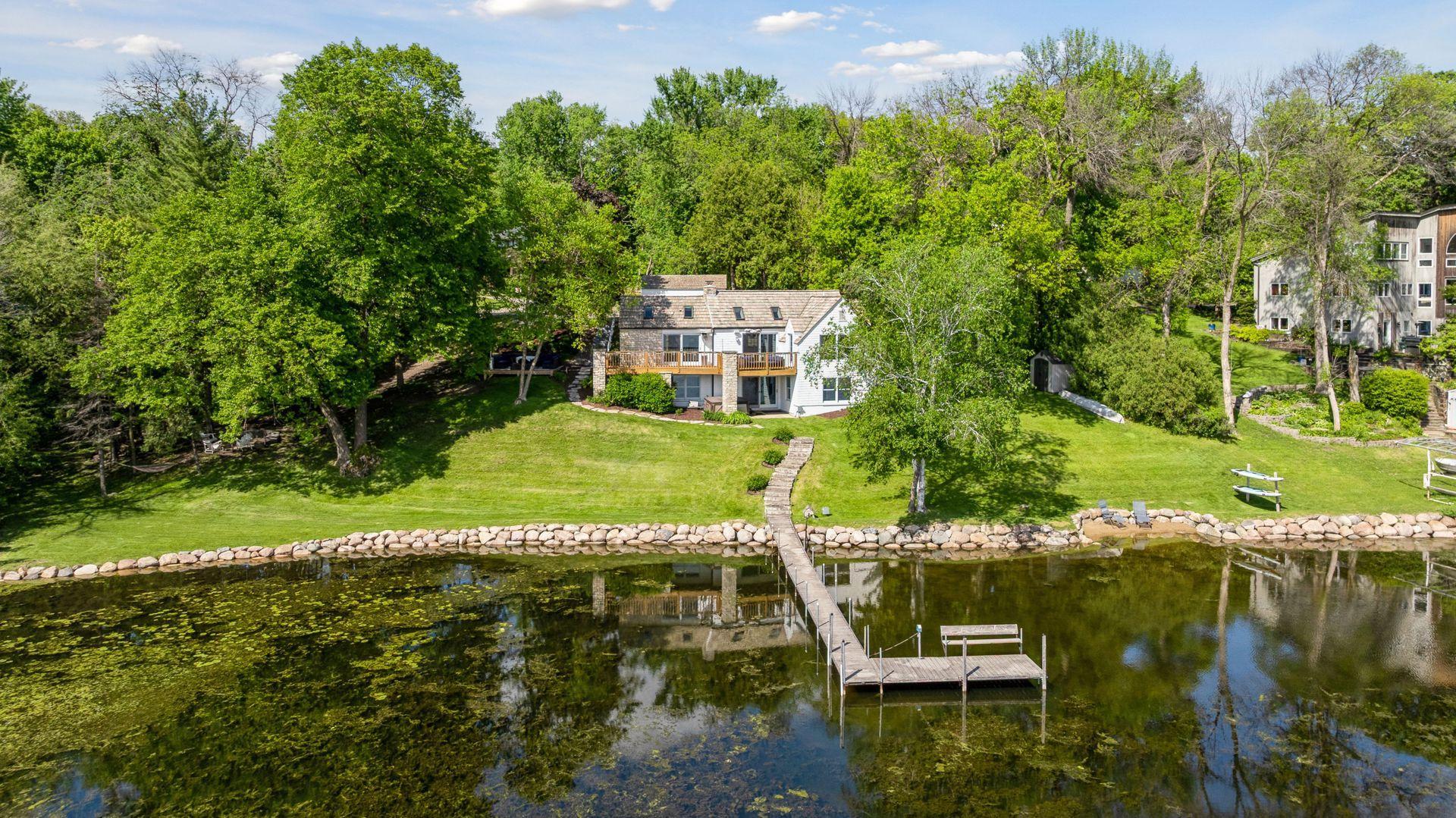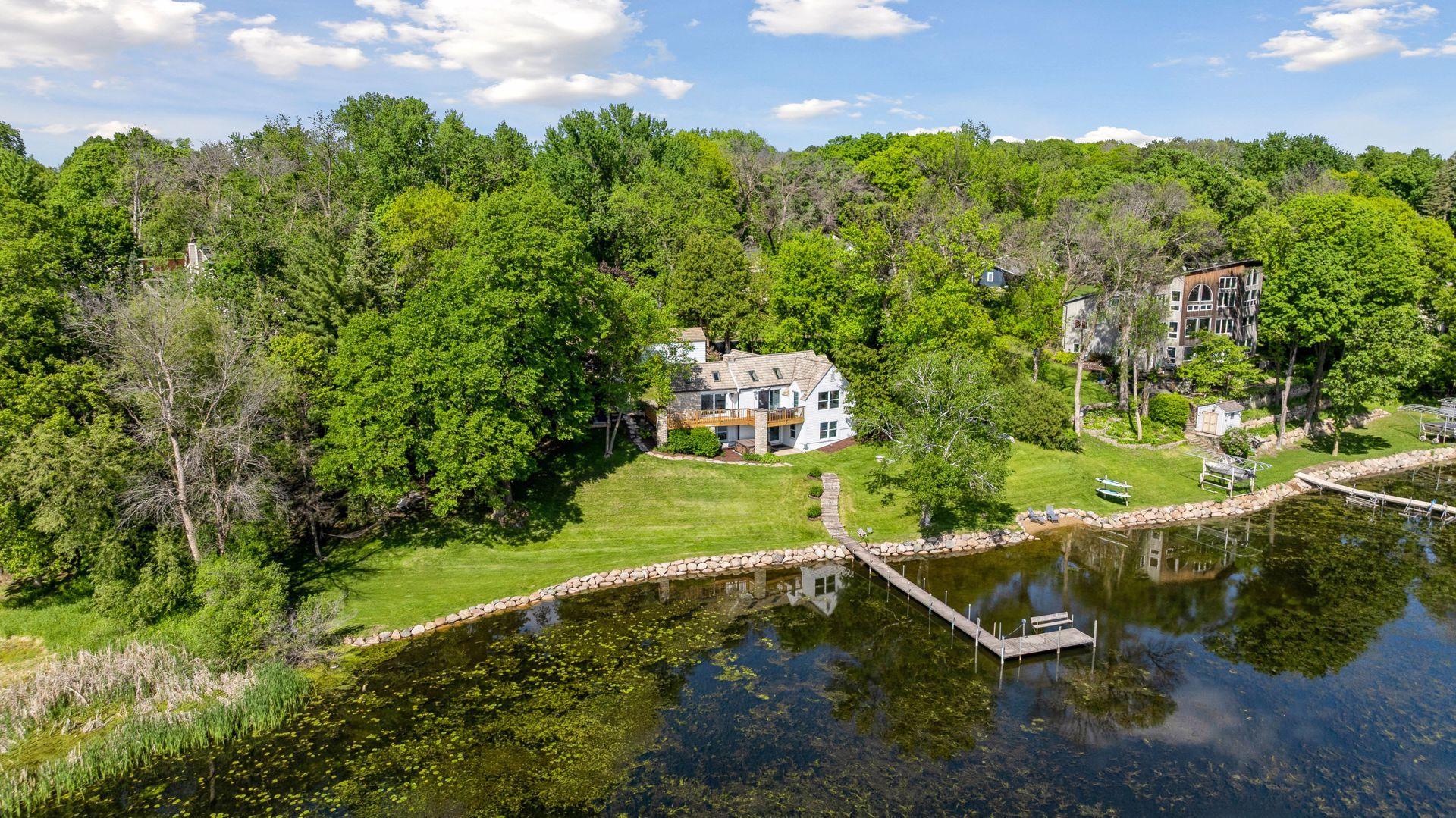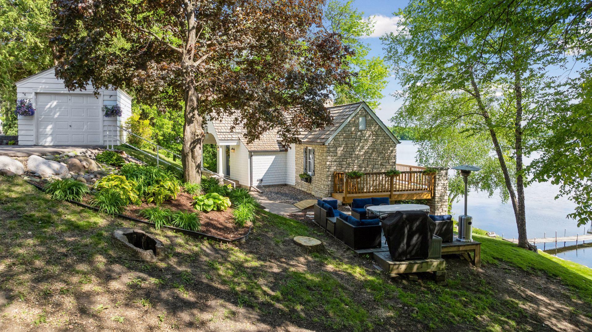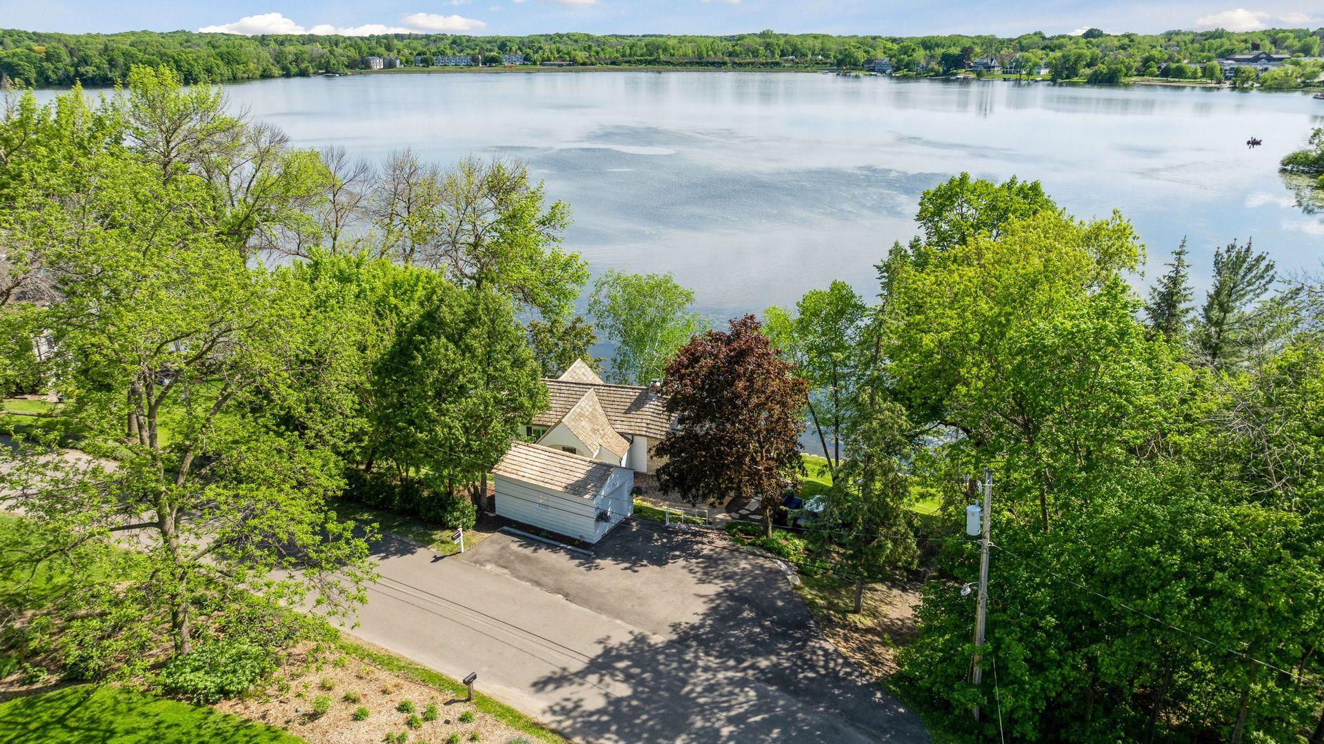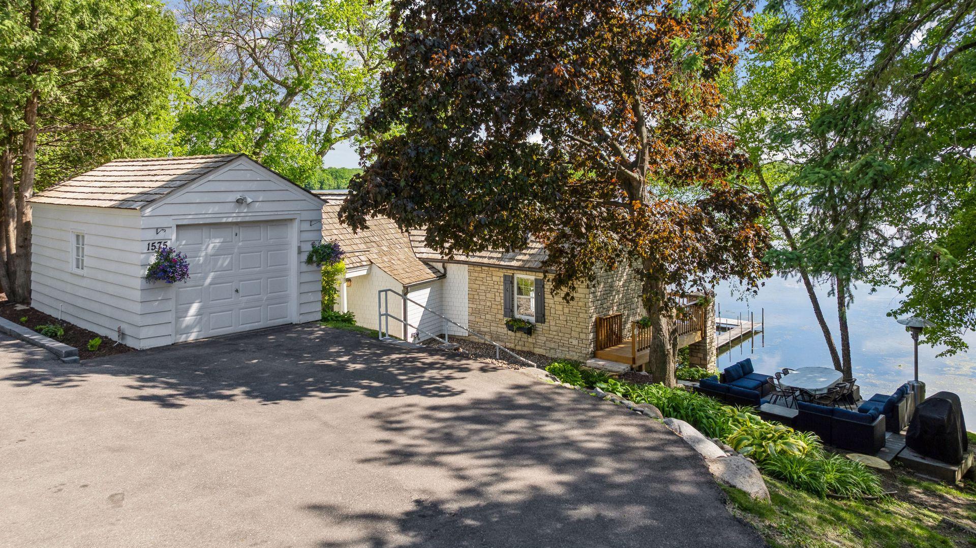 1575 Long Lake Blvd was the first cabin built in the neighborhood you see today. The “Albee Addition” was an Apple Orchard long before lake cabins were built in the late 1930s. Edna Albee, the original owner, was from Norway. Many of the original Norwegian details remain intact in the fireplace mantle, main level bathroom mirror/bath tile work and dining room chandelier. The approach to the house is a step back in time to those original lake cottage days. This home has been meticulously maintained and improved over the years and there is potential to make further improvements and additions. Even with these changes over the years, the charm remains. From the moment you step inside and see the bright spaces with all the right details, you feel the care that all the stewards of this wonderful property have given this home. The additions are tasteful and right sized; the quality and finishes are consistent, complimenting the original character but improving the structure with a new foundation and walkout lower level making for level floors and no old house creaks. What it may lack in modern layout convenience, it more than makes up for with its charm and setting. This property is truly unique and is as much about the setting and outdoor space as it is about the indoor spaces. It feels up north but then you remember, you are 7 minutes from Wayzata and 22 minutes from downtown Minneapolis. The property width, elevation and mature trees work together to create supreme lakeside privacy, and privacy between neighbors. With 250 feet of south facing shoreline on .6 acres, the expansive and unobstructed lake view captures spectacular sunrises and sunsets from inside the house - or from any of the numerous outdoor leisure areas. How many outdoor areas?? Well ... six distinct outdoor areas give you options for any mood or occasion. The back deck and dining deck are two very different feelings, one offering full sun, the other gives shade. The sandy beach is surrounded by rip rap and is a great spot to relax with your feet in the water or go for a swim. The lower patio offers a similar view to the upper deck, but the saltwater hot tub is a different option for relaxation. The secluded fire pit is tucked away from the house near the forested lowlands, surrounded by a flat stone patio with large stone benches and a peaceful view of the lake. The recessed fire pit includes built in drainage and a nearby hose attachment for safety. And finally, relaxing on the dock is the quintessential lakeside decompression zone. Of course, the lake side does offer a fairly flat area for yard games such, making that seven distinct outdoor areas! While you are outside, keep an eye out for Bald Eagles, turtles, hummingbirds, swans and loons. Mulberries, rhubarb and onion grass grows on the hill, next to the garage.
