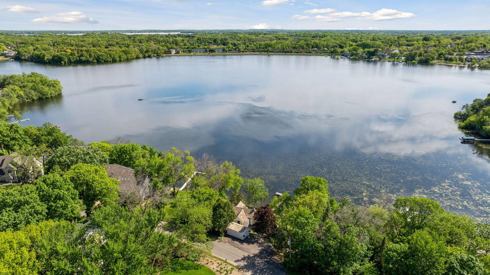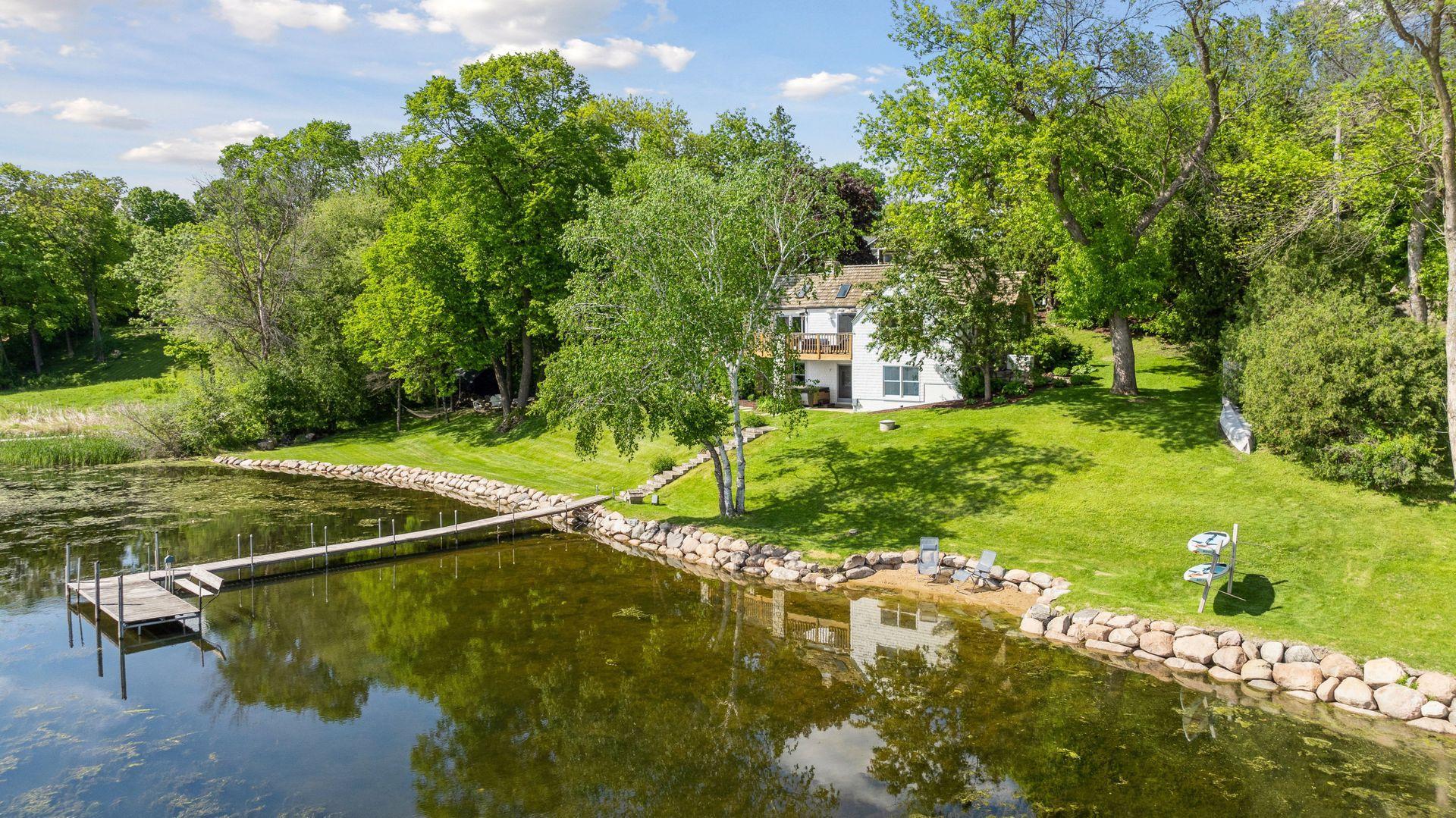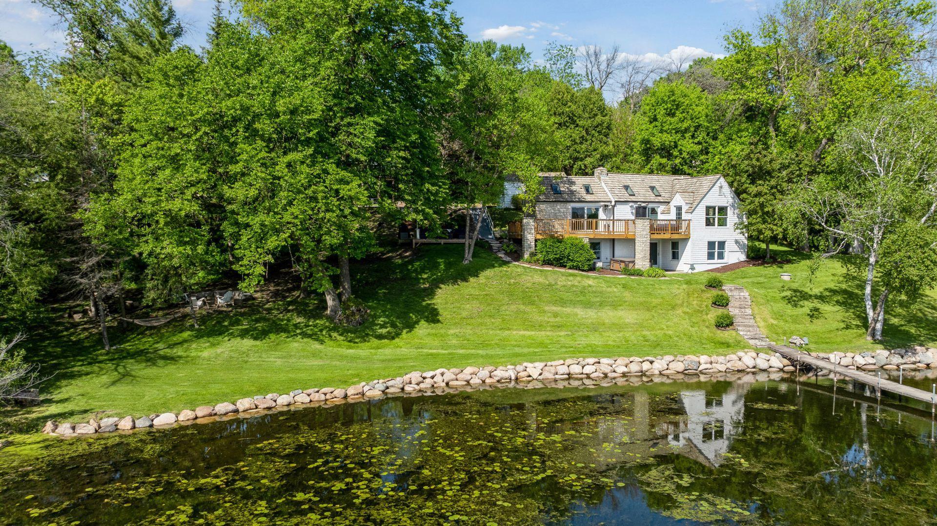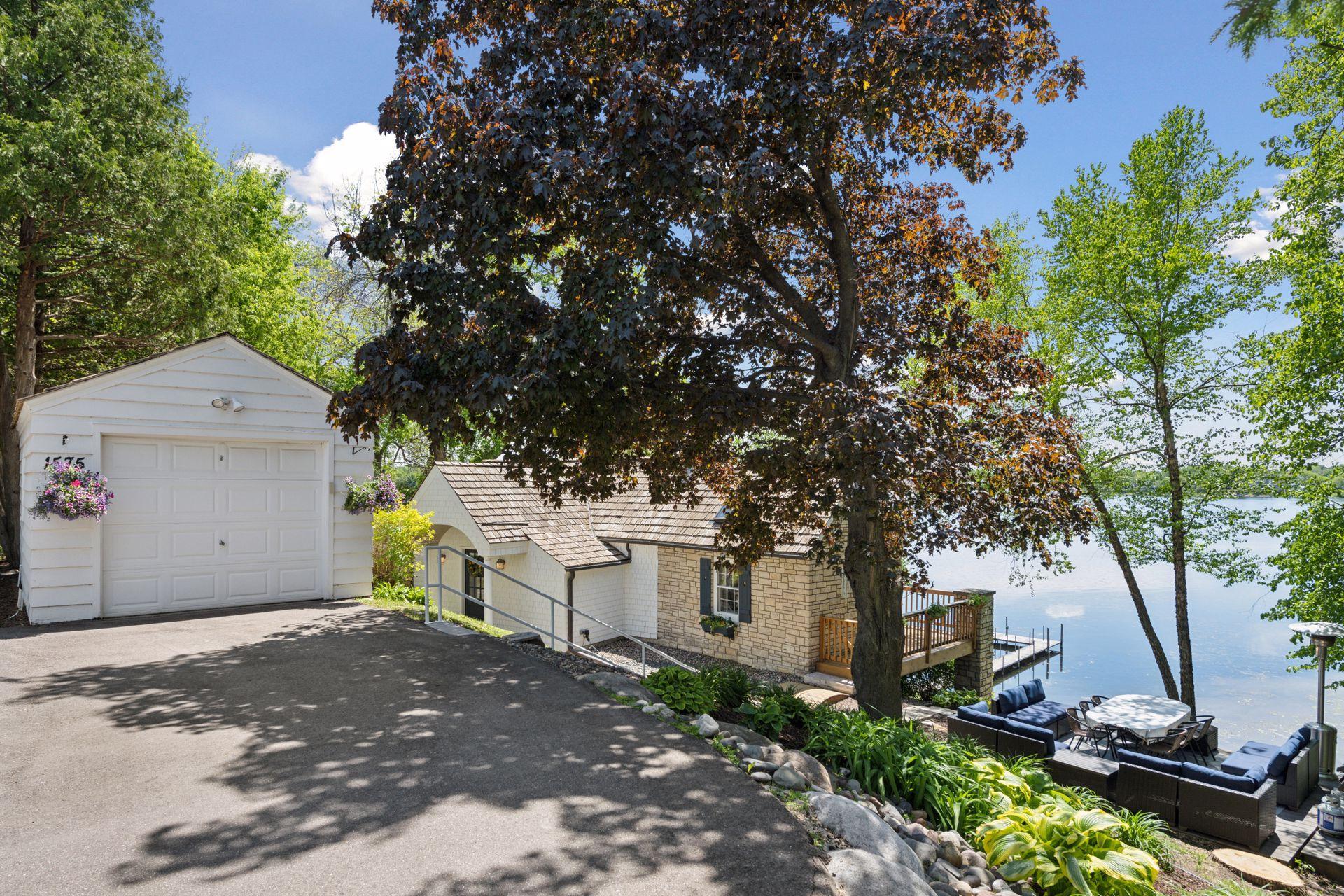 1575 Long Lake Blvd was the first cabin built in the neighborhood you see today. The “Albee Addition” was an Apple Orchard long before lake cabins were built in the late 1930s. Edna Albee, the original owner, was from Norway. Many of the original Norwegian details remain intact in the fireplace mantle, main level bathroom mirror/bath tile work and dining room chandelier. The approach to the house is a step back in time to those original lake cottage days. This home has been meticulously maintained and improved over the years and there is potential to make further improvements and additions. Even with these changes over the years, the charm remains. From the moment you step inside and see the bright spaces with all the right details, you feel the care that all the stewards of this wonderful property have given this home. The additions are tasteful and right sized; the quality and finishes are consistent, complimenting the original character but improving the structure with a new foundation and walkout lower level making for level floors and no old house creaks. What it may lack in modern layout convenience, it more than makes up for with its charm and setting. This property is truly unique and is as much about the setting and outdoor space as it is about the indoor spaces. It feels up north but then you remember, you are 7 minutes from Wayzata and 22 minutes from downtown Minneapolis. The property width, elevation and mature trees work together to create supreme lakeside privacy, and privacy between neighbors. With 250 feet of south facing shoreline on .6 acres, the expansive and unobstructed lake view captures spectacular sunrises and sunsets from inside the house - or from any of the numerous outdoor leisure areas. How many outdoor areas?? Well ... six distinct outdoor areas give you options for any mood or occasion. The back deck and dining deck are two very different feelings, one offering full sun, the other gives shade. The sandy beach is surrounded by rip rap and is a great spot to relax with your feet in the water or go for a swim. The lower patio offers a similar view to the upper deck, but the saltwater hot tub is a different option for relaxation. The secluded fire pit is tucked away from the house near the forested lowlands, surrounded by a flat stone patio with large stone benches and a peaceful view of the lake. The recessed fire pit includes built in drainage and a nearby hose attachment for safety. And finally, relaxing on the dock is the quintessential lakeside decompression zone. Of course, the lake side does offer a fairly flat area for yard games such, making that seven distinct outdoor areas! While you are outside, keep an eye out for Bald Eagles, turtles, hummingbirds, swans and loons. Mulberries, rhubarb and onion grass grows on the hill, next to the garage.