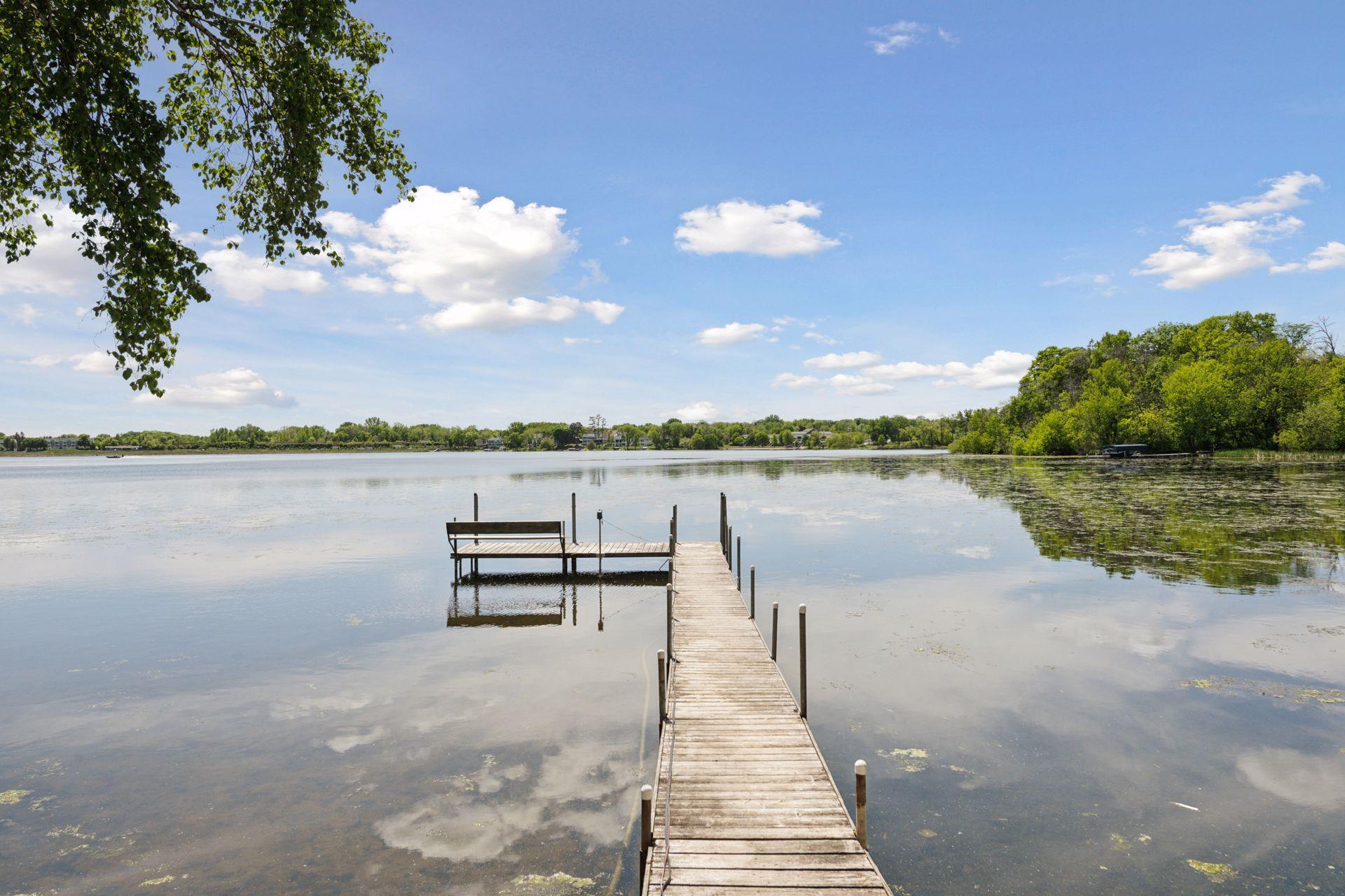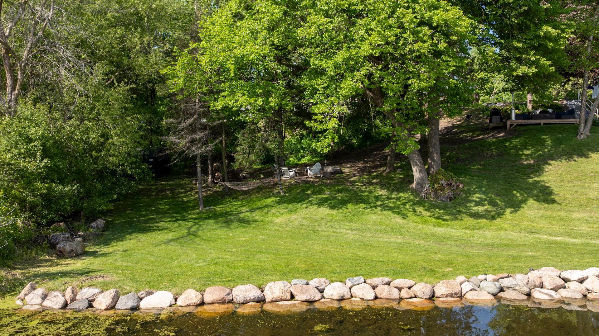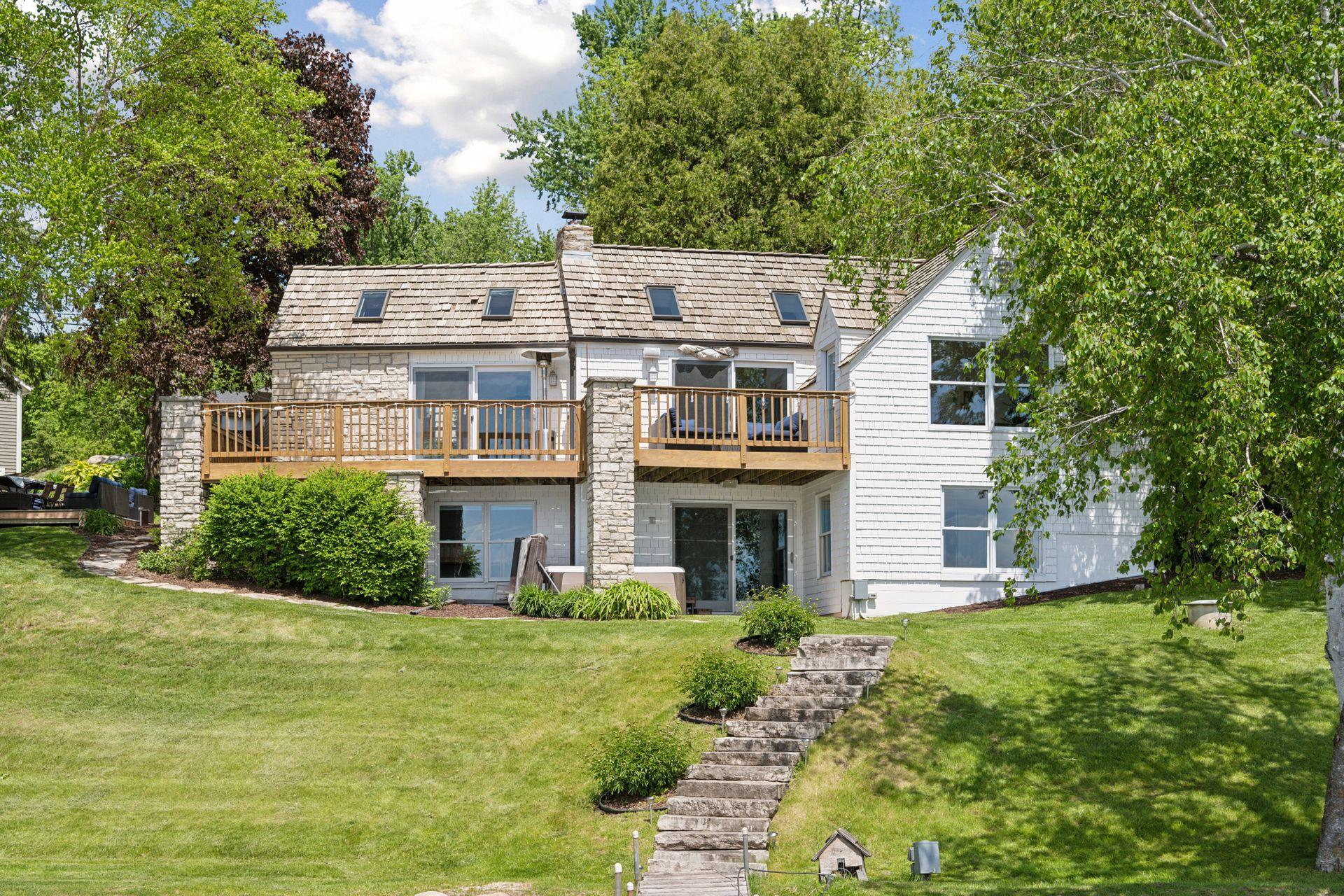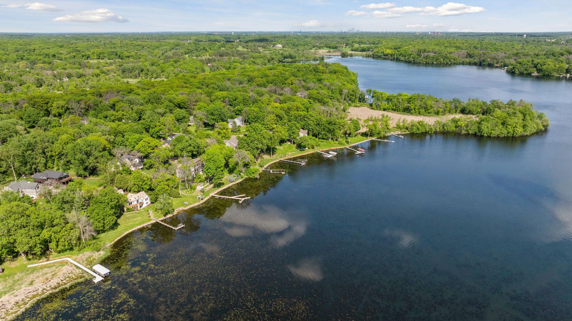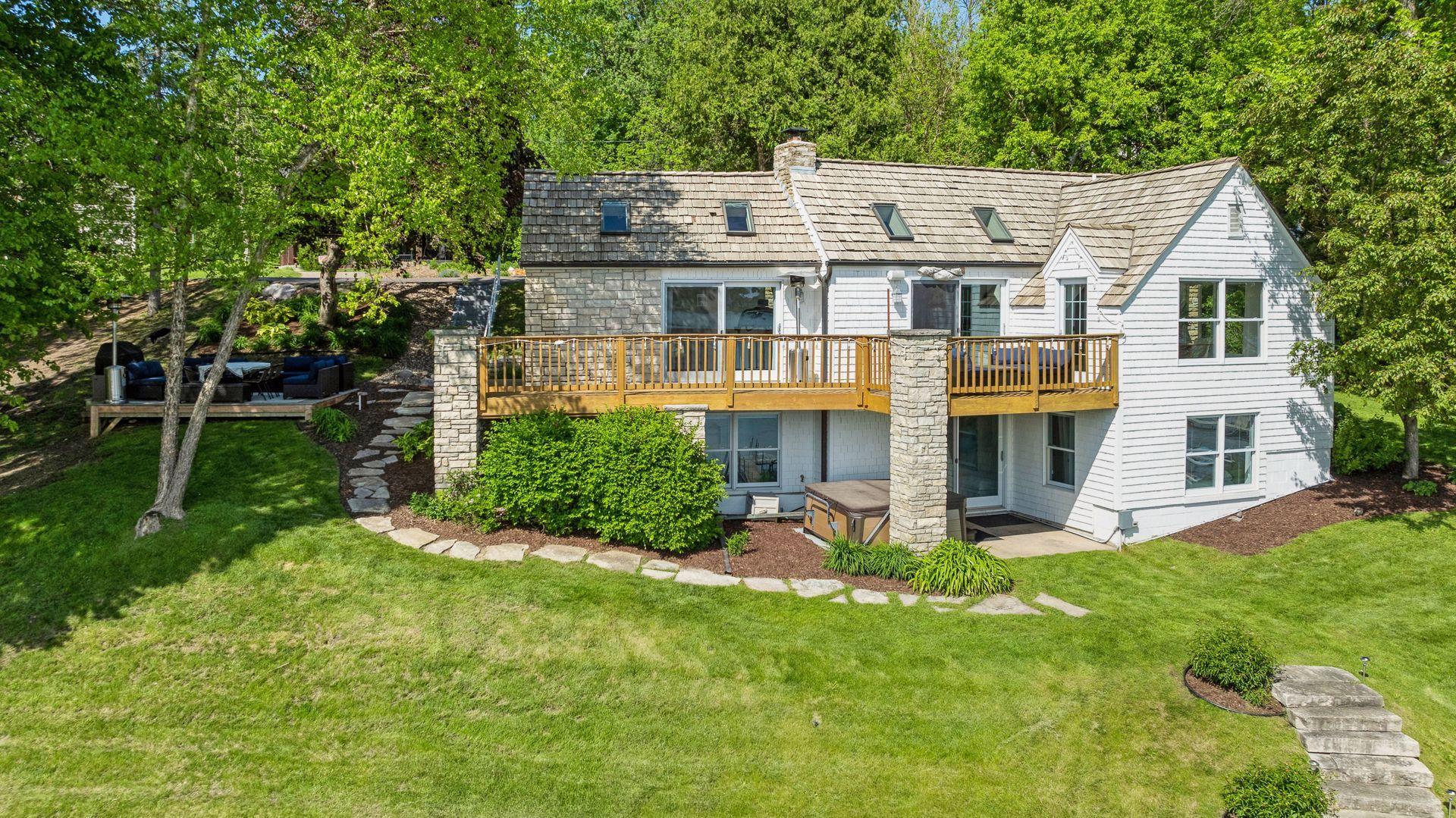 1575 Long Lake Blvd was the first cabin built in the neighborhood you see today. The “Albee Addition” was an Apple Orchard long before lake cabins were built in the late 1930s. Edna Albee, the original owner, was from Norway. Many of the original Norwegian details remain intact in the fireplace mantle, main level bathroom mirror/bath tile work and dining room chandelier. The approach to the house is a step back in time to those original lake cottage days. This home has been meticulously maintained and improved over the years and there is potential to make further improvements and additions. Even with these changes over the years, the charm remains. From the moment you step inside and see the bright spaces with all the right details, you feel the care that all the stewards of this wonderful property have given this home. The additions are tasteful and right sized; the quality and finishes are consistent, complimenting the original character but improving the structure with a new foundation and walkout lower level making for level floors and no old house creaks. What it may lack in modern layout convenience, it more than makes up for with its charm and setting. This property is truly unique and is as much about the setting and outdoor space as it is about the indoor spaces. It feels up north but then you remember, you are 7 minutes from Wayzata and 22 minutes from downtown Minneapolis. The property width, elevation and mature trees work together to create supreme lakeside privacy, and privacy between neighbors. With 250 feet of south facing shoreline on .6 acres, the expansive and unobstructed lake view captures spectacular sunrises and sunsets from inside the house - or from any of the numerous outdoor leisure areas. How many outdoor areas?? Well ... six distinct outdoor areas give you options for any mood or occasion. The back deck and dining deck are two very different feelings, one offering full sun, the other gives shade. The sandy beach is surrounded by rip rap and is a great spot to relax with your feet in the water or go for a swim. The lower patio offers a similar view to the upper deck, but the saltwater hot tub is a different option for relaxation. The secluded fire pit is tucked away from the house near the forested lowlands, surrounded by a flat stone patio with large stone benches and a peaceful view of the lake. The recessed fire pit includes built in drainage and a nearby hose attachment for safety. And finally, relaxing on the dock is the quintessential lakeside decompression zone. Of course, the lake side does offer a fairly flat area for yard games such, making that seven distinct outdoor areas! While you are outside, keep an eye out for Bald Eagles, turtles, hummingbirds, swans and loons. Mulberries, rhubarb and onion grass grows on the hill, next to the garage.