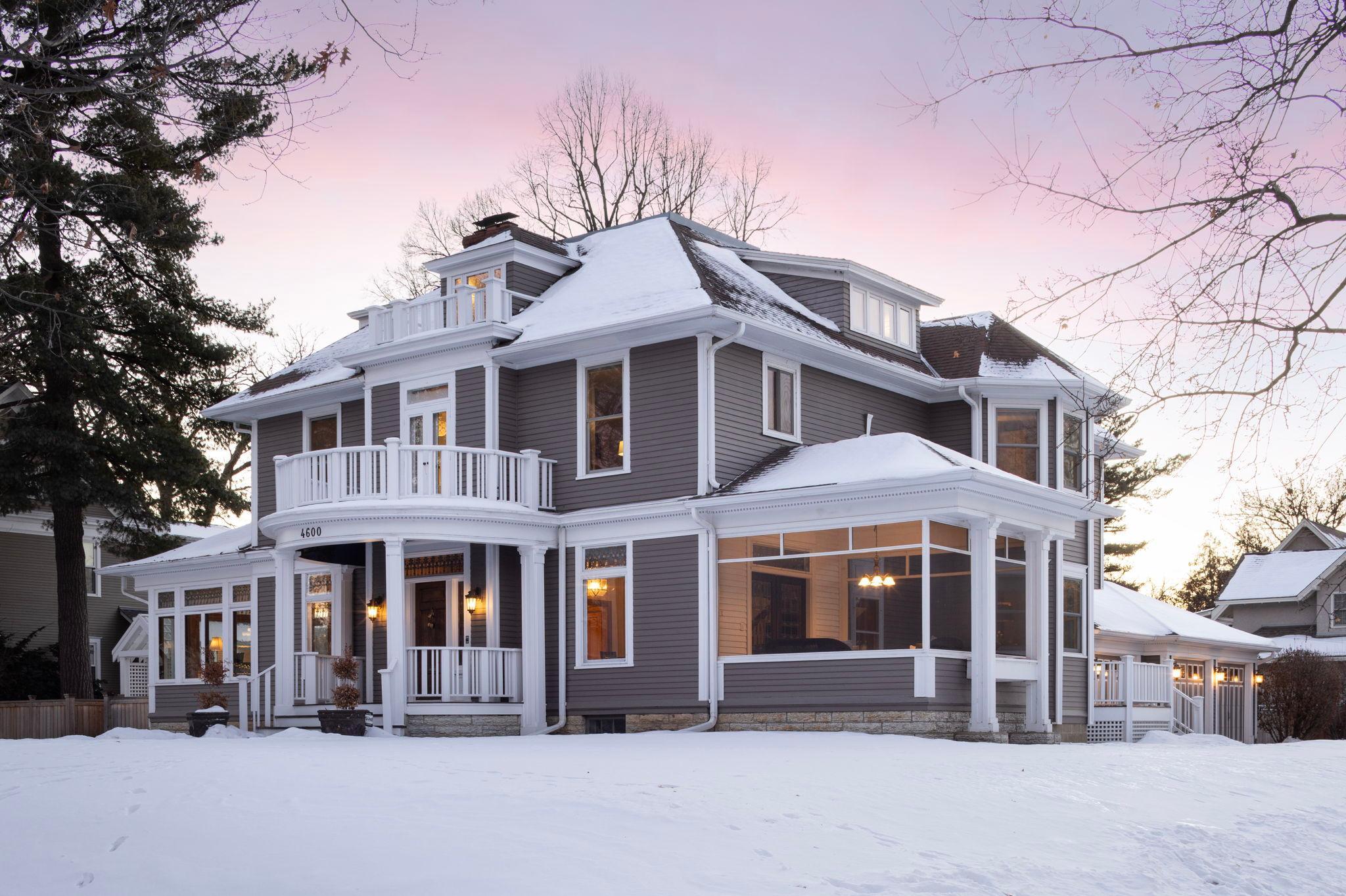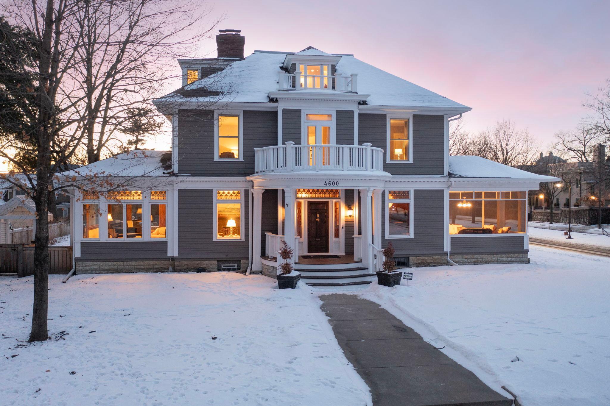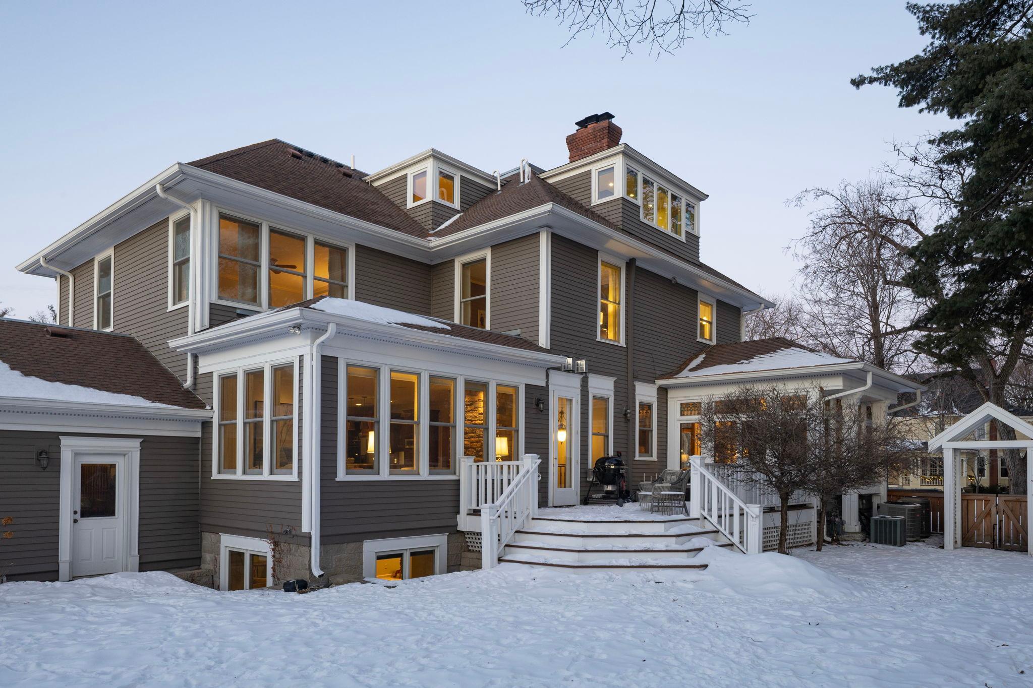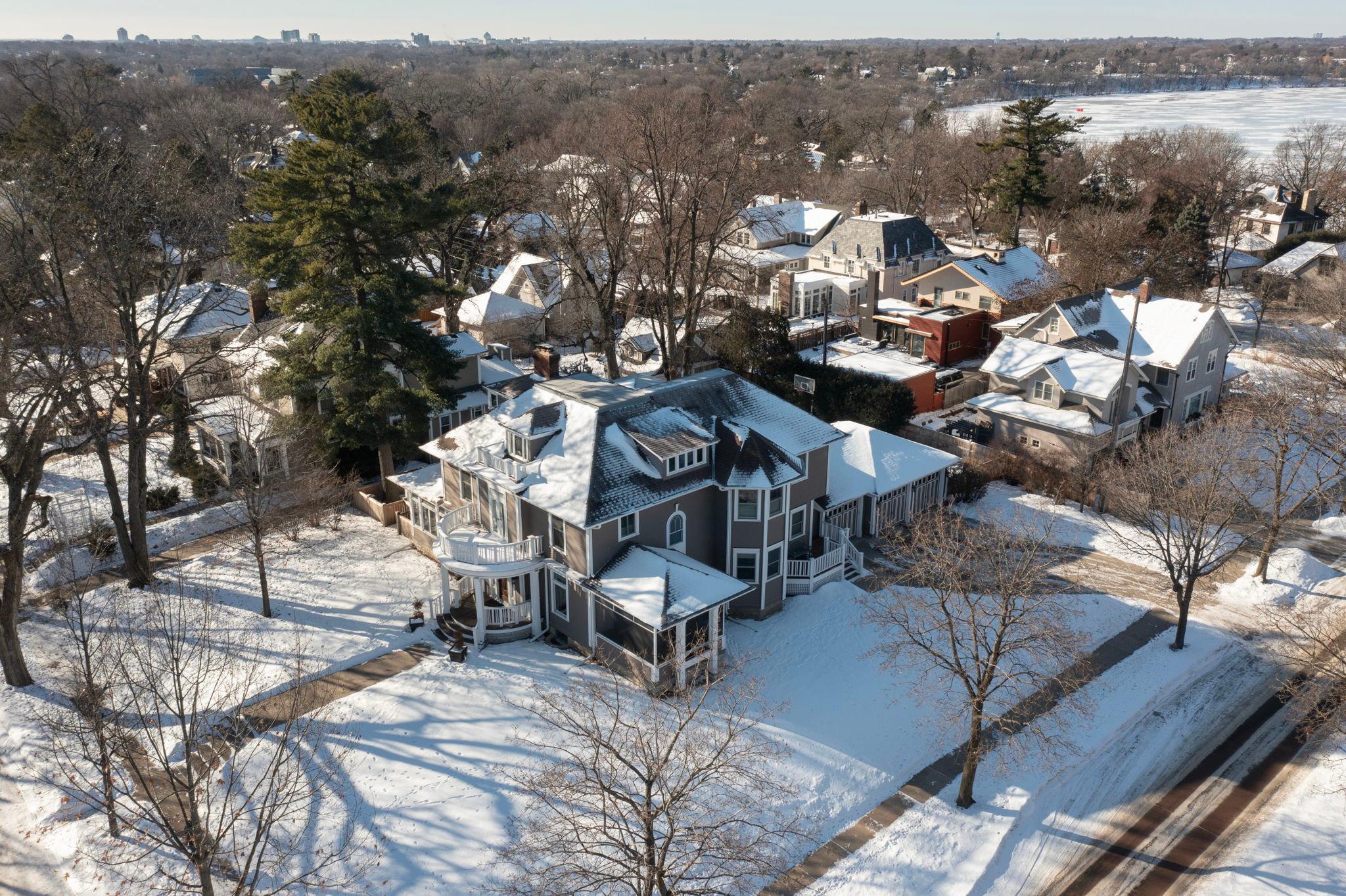 Experience refined historic character and modern living updates in this extraordinary 5 bedroom, 5 bath residence offering 5,940 finished square feet on a rare, fenced triple lot at the prominent corner of Fremont and King's Highway. A stunning 2005 addition creates a bright, open concept kitchen/family room. Walls of south and west facing windows capture daylight and views to the large fenced yard. Cozy up to the gas fireplace, or gather around the kitchen's center island. The rare attached 3 car garage connects to a spacious mudroom and laundry, with a convenient main level half bath. Built in 1893, this classic home showcases exquisite inlaid hardwood floors, stained glass, and exceptional original woodwork in the foyer, living room and dining rooms. A charming screened porch provides a cool respite, and seasonal views of Lake Harriet. Upstairs, four bedrooms include an ensuite primary and a junior suite, complemented by three beautifully updated baths. The impressive third floor renovation (2019) features a flexible family space, office area, fifth bedroom with ¾ bath, built ins, and a coffee bar. The lower level offers a generous, well lit amusement and exercise area with egress windows. A true signature home in a storied neighborhood steps from Lake Harriet.