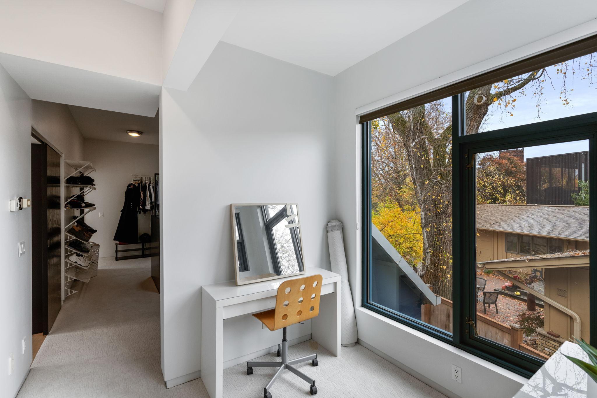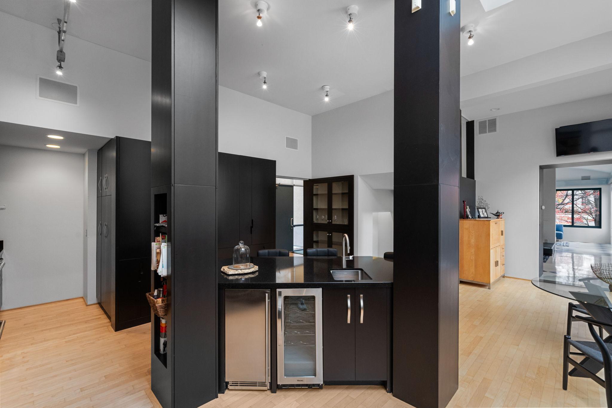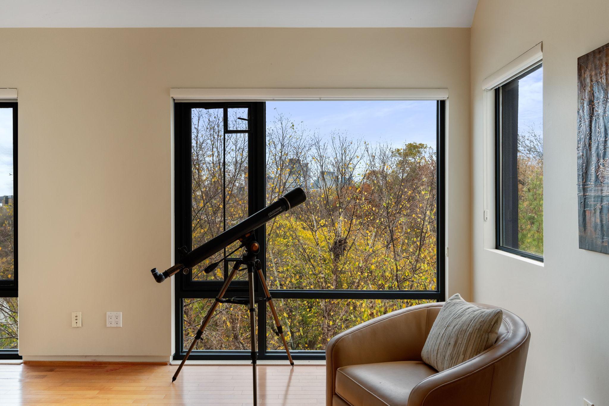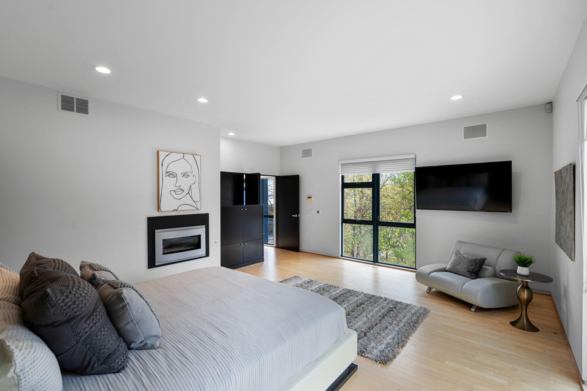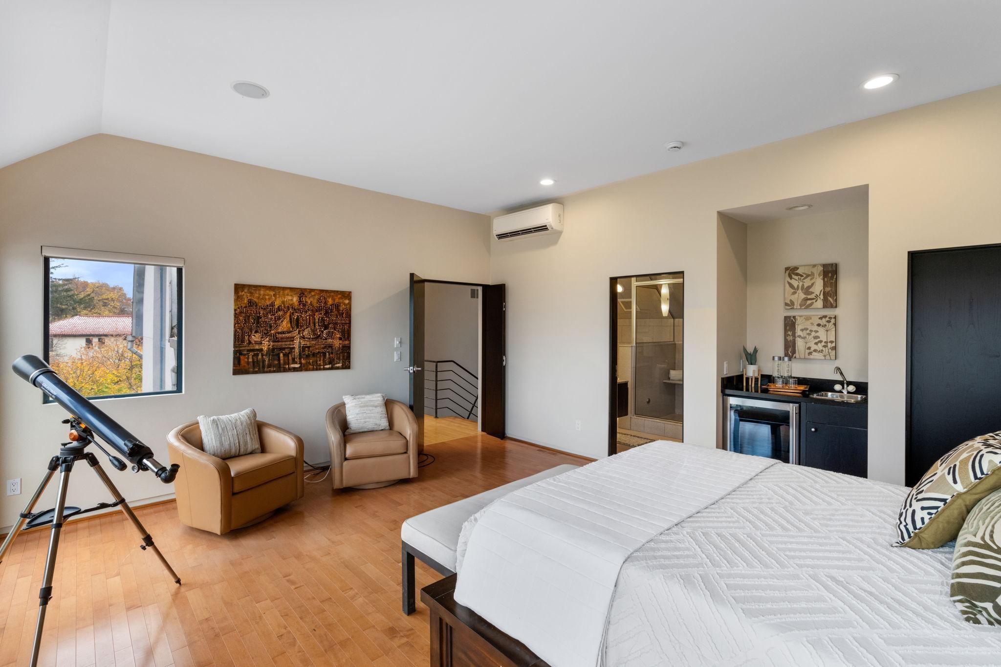 Discover unparalleled modern living in this extraordinary architectural townhome, designed by acclaimed California architect Mark Mack. Spanning four stories, this 4-bedroom, 5 bathroom residence is a showcase of innovative design, featuring soaring barrel-vaulted ceilings, expansive walls of glass, and breathtaking panoramic views of the downtown skyline. Every element of this home exudes sophistication, from the custom maple hardwood floors and sleek ceramic tiles to the radiant in-floor heating that ensures comfort throughout. Floor-to-ceiling windows bathe the home in natural light, while a custom fish tank serves as a striking centerpiece.