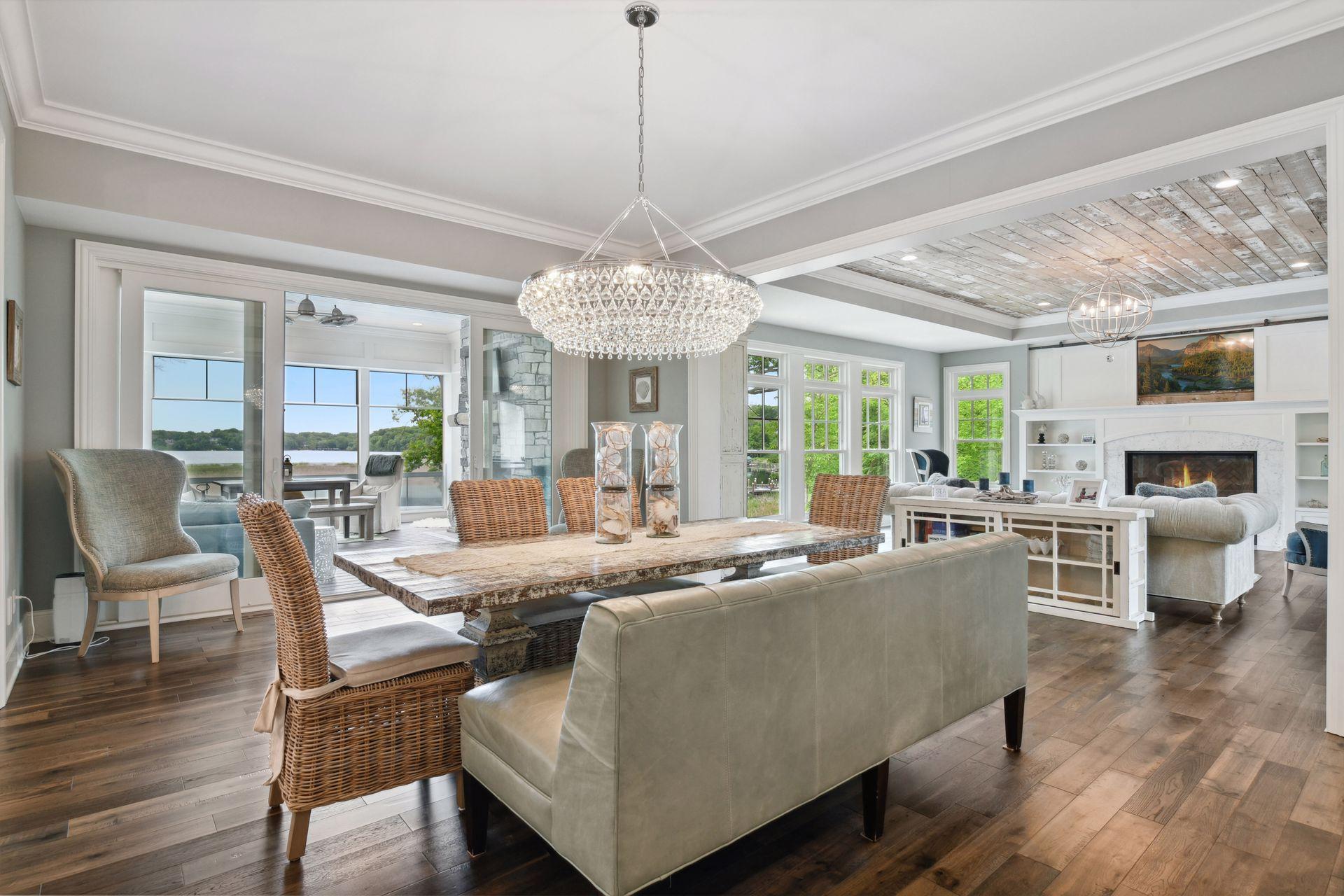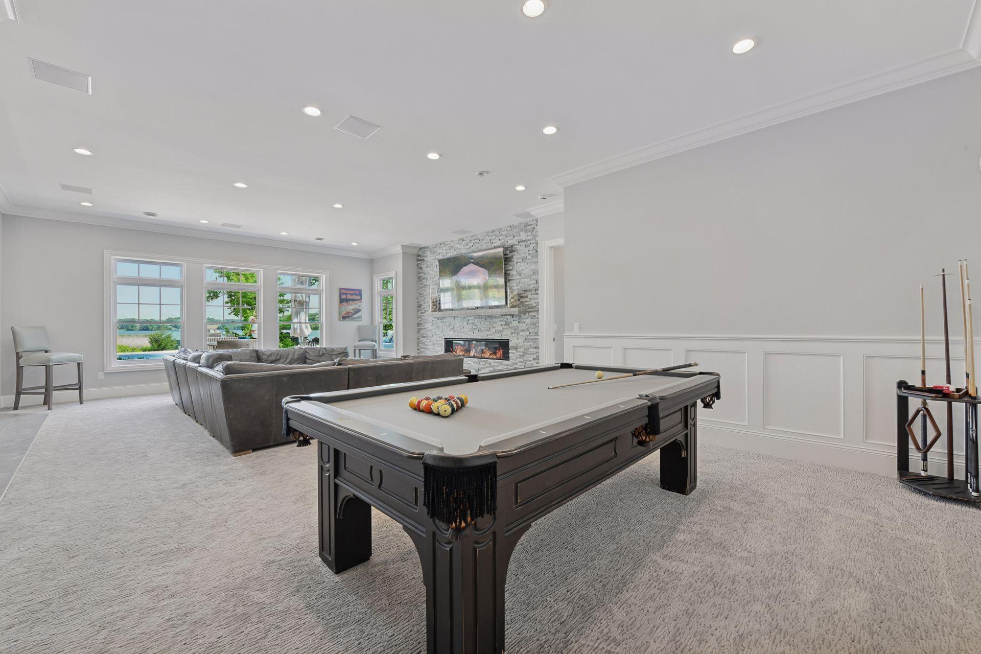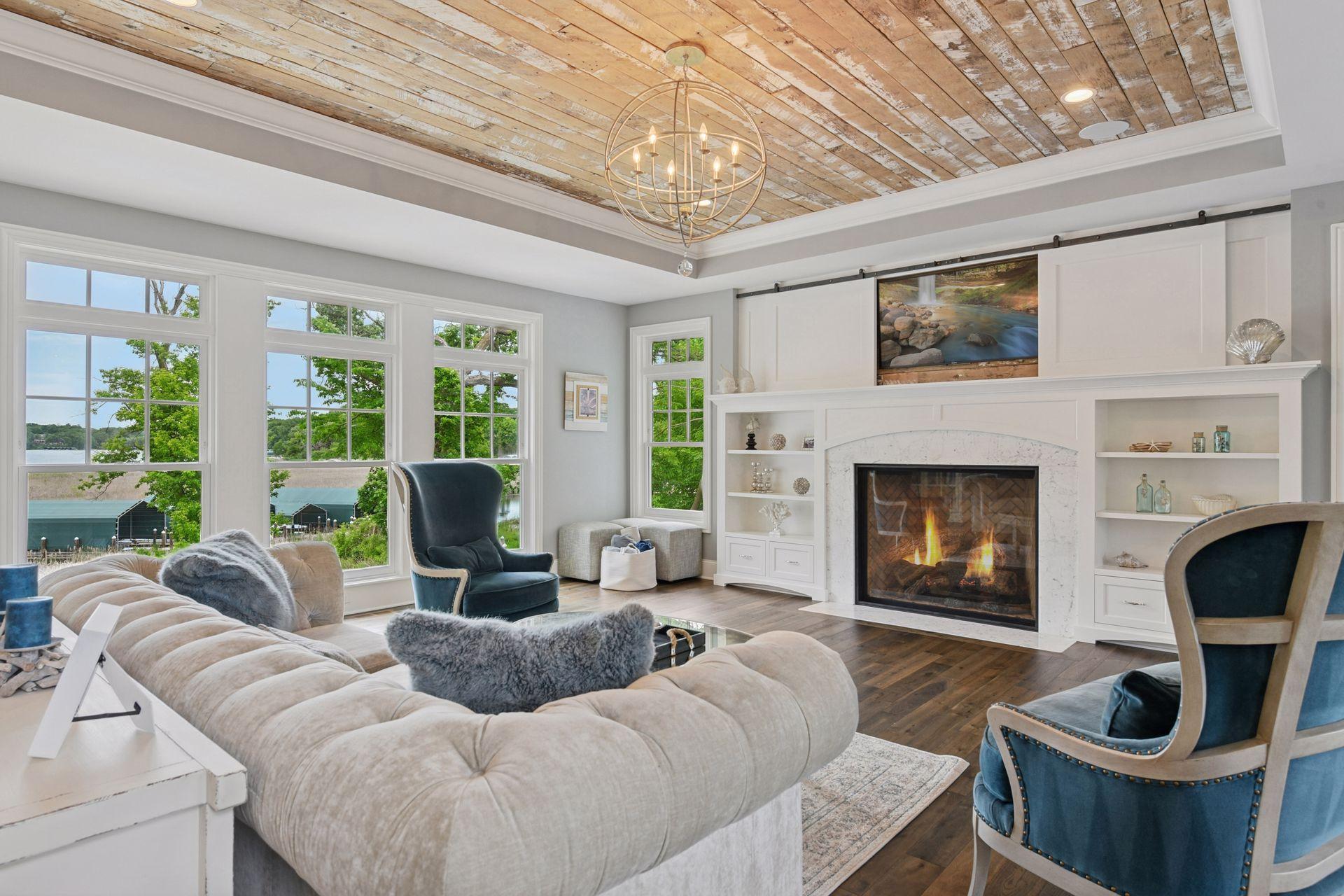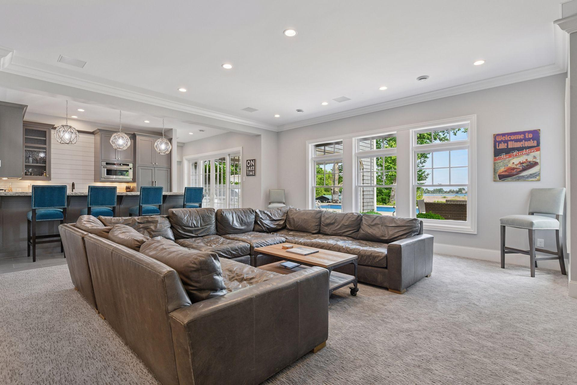 Shingle-style Lake Minnetonka home set on over an acre with 156 feet of lakeshore and three private dock slips in The Cove community. Crisp white interior with enameled millwork and custom finishes throughout. Panoramic views from nearly every room. Main level features include open great room design, gourmet kitchen with separate support space, private study and lakeside three+ season porch with fireplace overlooking the resort-style pool. Upper level offers a luxurious primary suite with fireplace and spa-like bath, plus three additional ensuite bedrooms and separate lounge space. Walkout lower level includes a spacious family room with bar, additional bedroom and an oversized indoor multi-sport court. Entertain in style on the lakeside pool and patio with extensive outdoor kitchen, sun-filled gathering areas, beautiful landscaping and panoramic views of the water. Quiet neighborhood setting with amenities including a community clubhouse and pool, playgrounds, tennis/pickleball courts and miles of walking trails. Close to new grocery store and shopping.