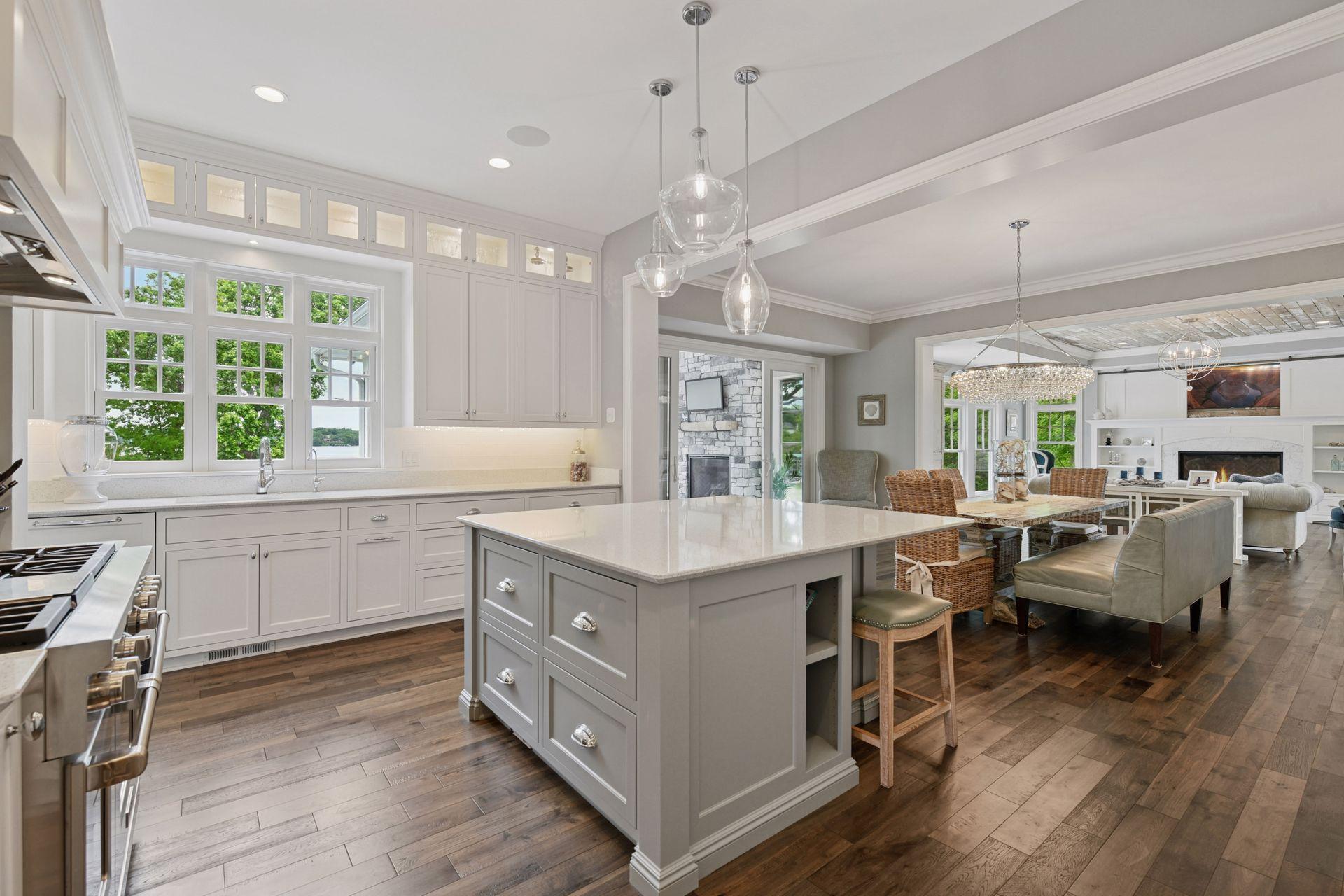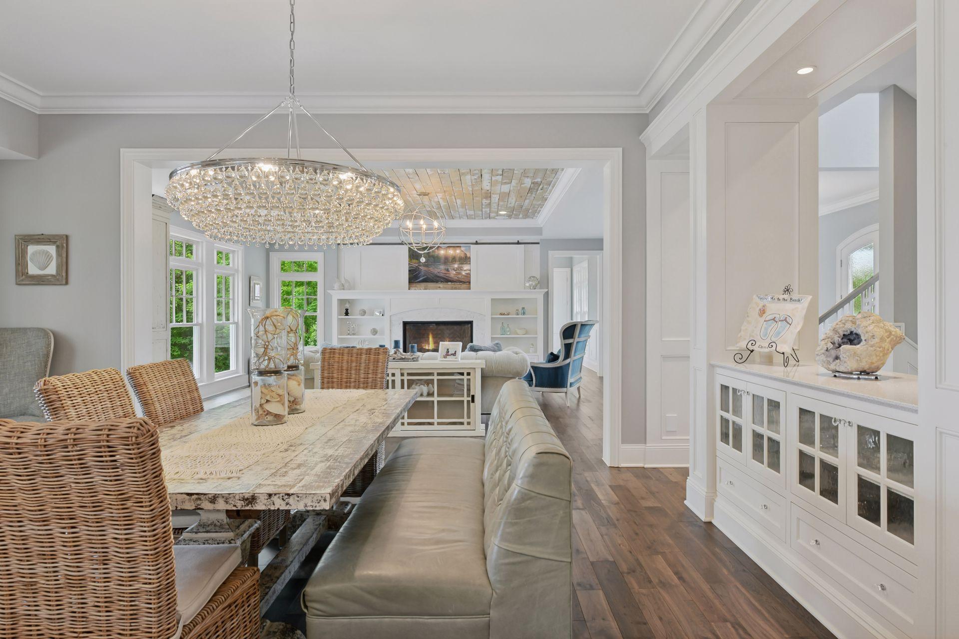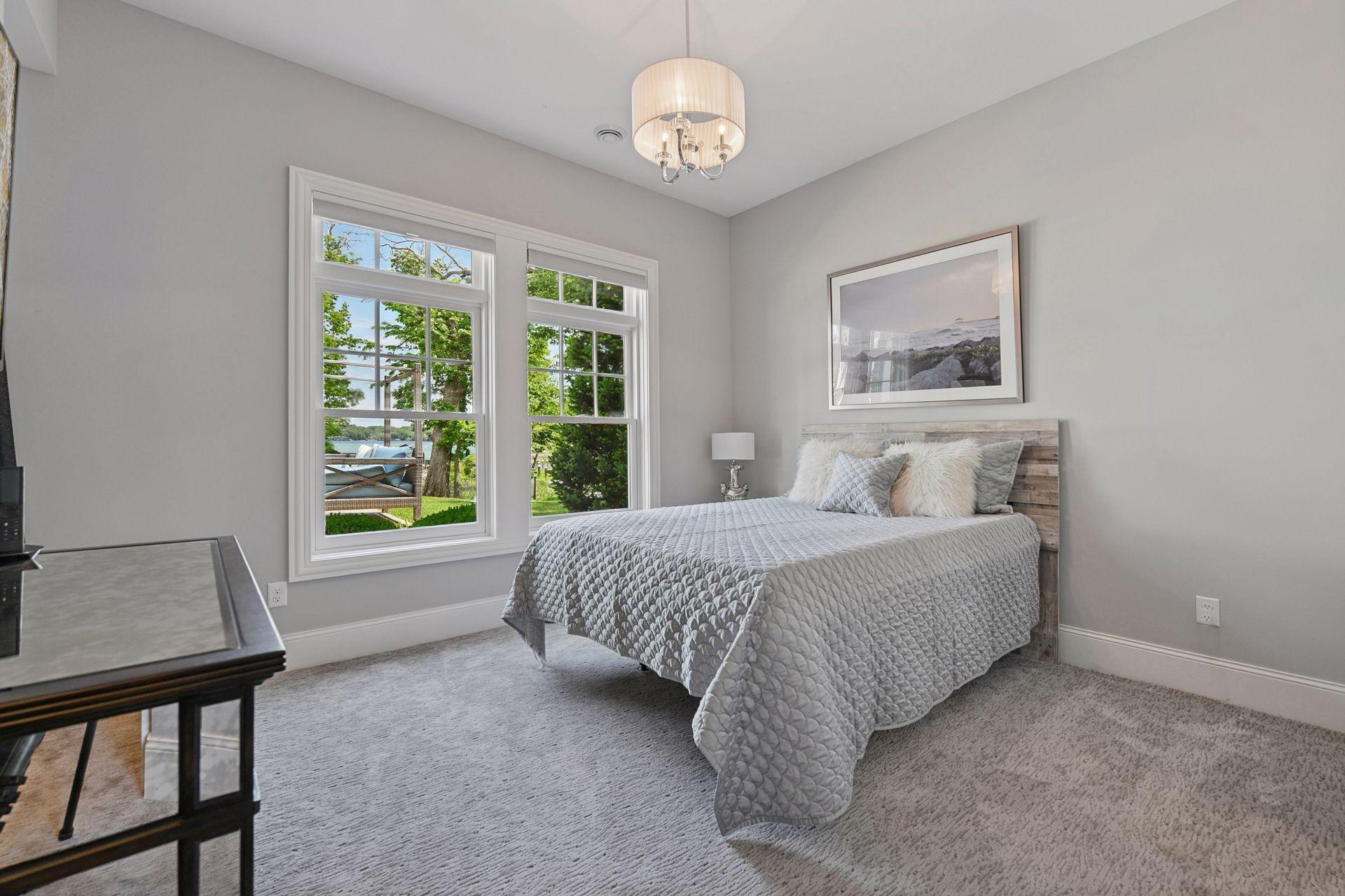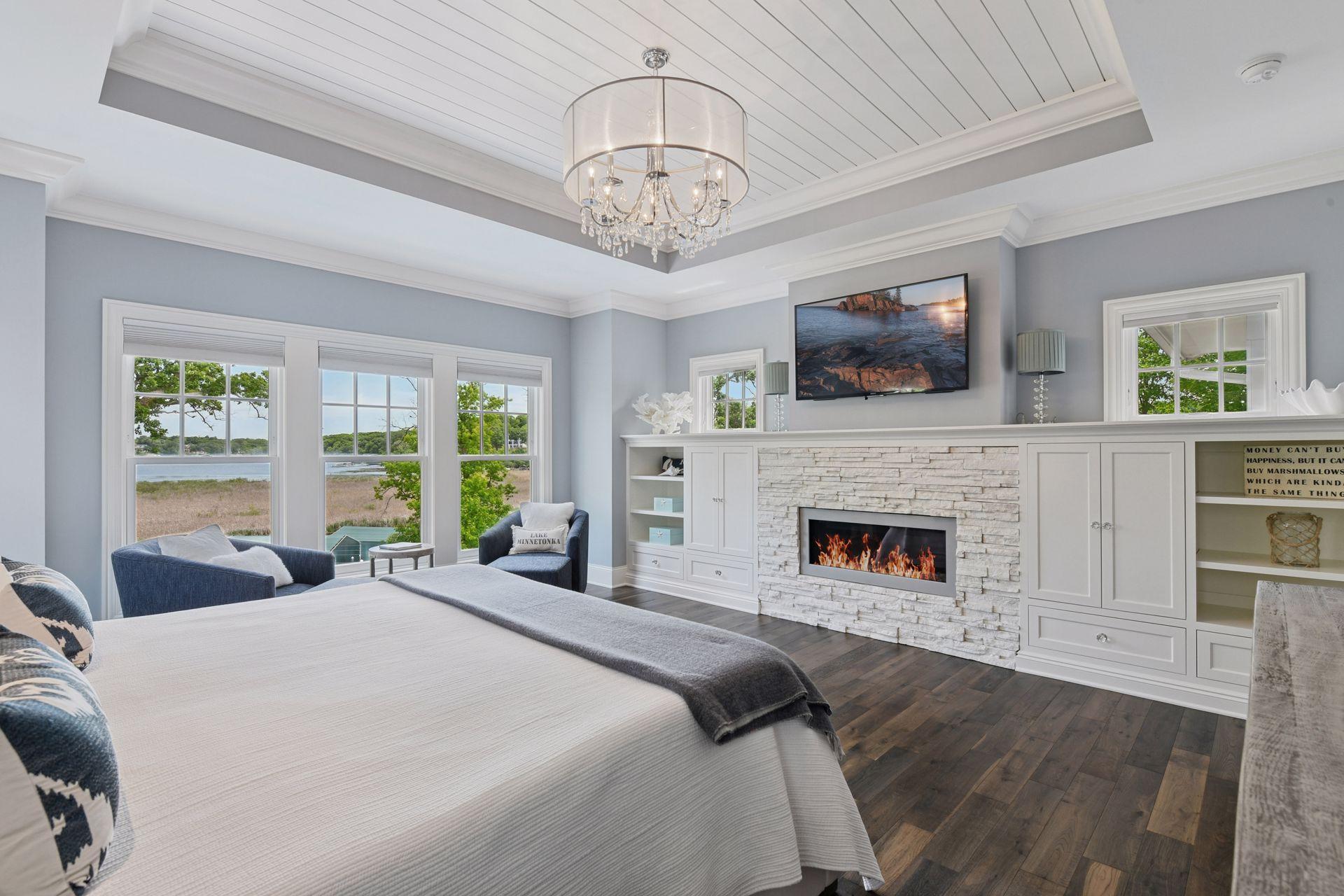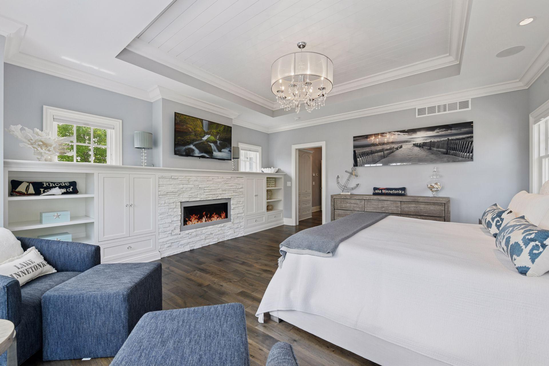 Shingle-style Lake Minnetonka home set on over an acre with 156 feet of lakeshore and three private dock slips in The Cove community. Crisp white interior with enameled millwork and custom finishes throughout. Panoramic views from nearly every room. Main level features include open great room design, gourmet kitchen with separate support space, private study and lakeside three+ season porch with fireplace overlooking the resort-style pool. Upper level offers a luxurious primary suite with fireplace and spa-like bath, plus three additional ensuite bedrooms and separate lounge space. Walkout lower level includes a spacious family room with bar, additional bedroom and an oversized indoor multi-sport court. Entertain in style on the lakeside pool and patio with extensive outdoor kitchen, sun-filled gathering areas, beautiful landscaping and panoramic views of the water. Quiet neighborhood setting with amenities including a community clubhouse and pool, playgrounds, tennis/pickleball courts and miles of walking trails. Close to new grocery store and shopping.