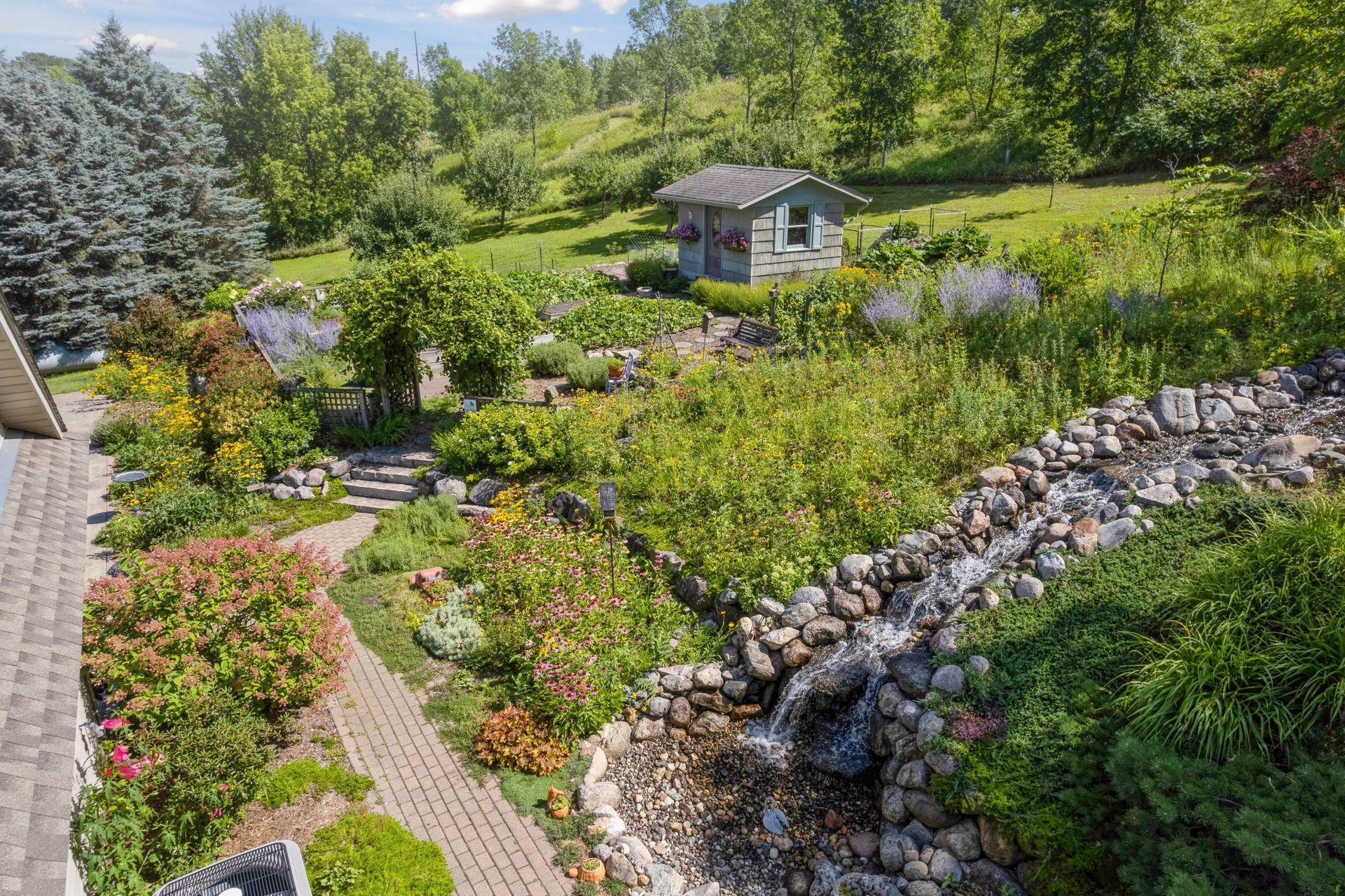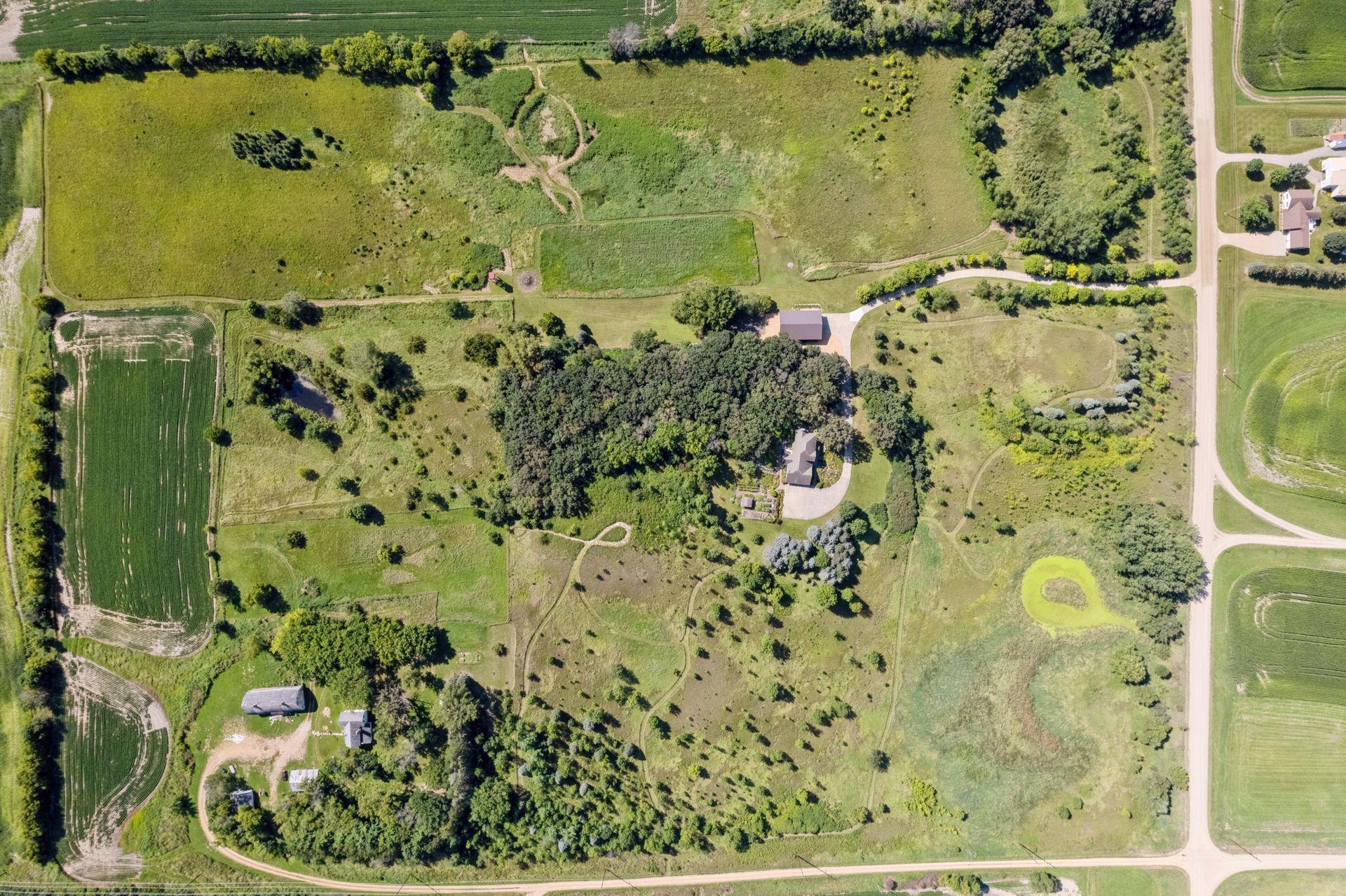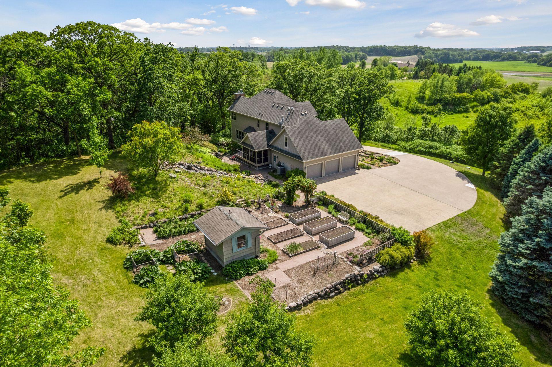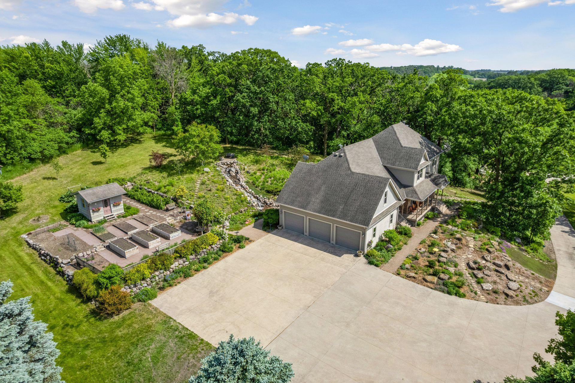 Now available for the first time… 11905 Market Avenue in Cologne. This remarkable 38-acre property impresses with three ponds, rolling hills and truly breathtaking landscape. It showcases masterful gardens with fragrant blooms of perennials and natives with vibrant color all-season long. A potting shed offers charm and caretaking convenience to the grounds next to the vegetable and herb garden. There is a sprawling patch of strawberries and raspberries, as well as apple, pear and plum trees. Enjoy tranquil sounds of the pondless waterfall from several outdoor spaces. Find sanctuary on the three-season porch, admire wildlife from the covered front porch and entertain on the patio or Trex deck. Step inside the home to reveal a gorgeous main level with a comfortable layout and quality craftmanship. Gleaming hardwood floors lead into a sun-filled kitchen with both formal and informal dining space. The adjoining mud room houses convenient laundry, a half bath and abundant storage in the pantry. A handsome gas fireplace is anchored in the family room offering lush views framed by many windows. The front sitting room offers versatile use and more views. Head upstairs to find three bedrooms and two bathrooms on this level, with the inclusion of the primary suite. You will love this private retreat and its spa-like bath with a double vanity, jetted tub and large walk-in closet & shower stall. There are two bonus rooms above the garage that welcome any use but have made for wonderful home offices. The lower level entertains with a cozy wood-burning fireplace, a beautiful custom bar and walkout access in the family room. There is another bedroom, flex room and ¾ bathroom on this level with in-floor heat throughout. Other notable upgrades include maintenance-free steel siding, a heated & insulated 3-stall garage with epoxy flooring, fiber optic internet, invisible fencing and a BRAND-NEW septic system and 40x60 Pole Barn installed in 2024. There are 16 acres currently enrolled in the CRP program with ability to be transferred to the new owner. Hunting enthusiasts will appreciate the custom deer stand and the panoramic views of these prairies. The peaceful life you’ve been searching for has FOUND YOU!