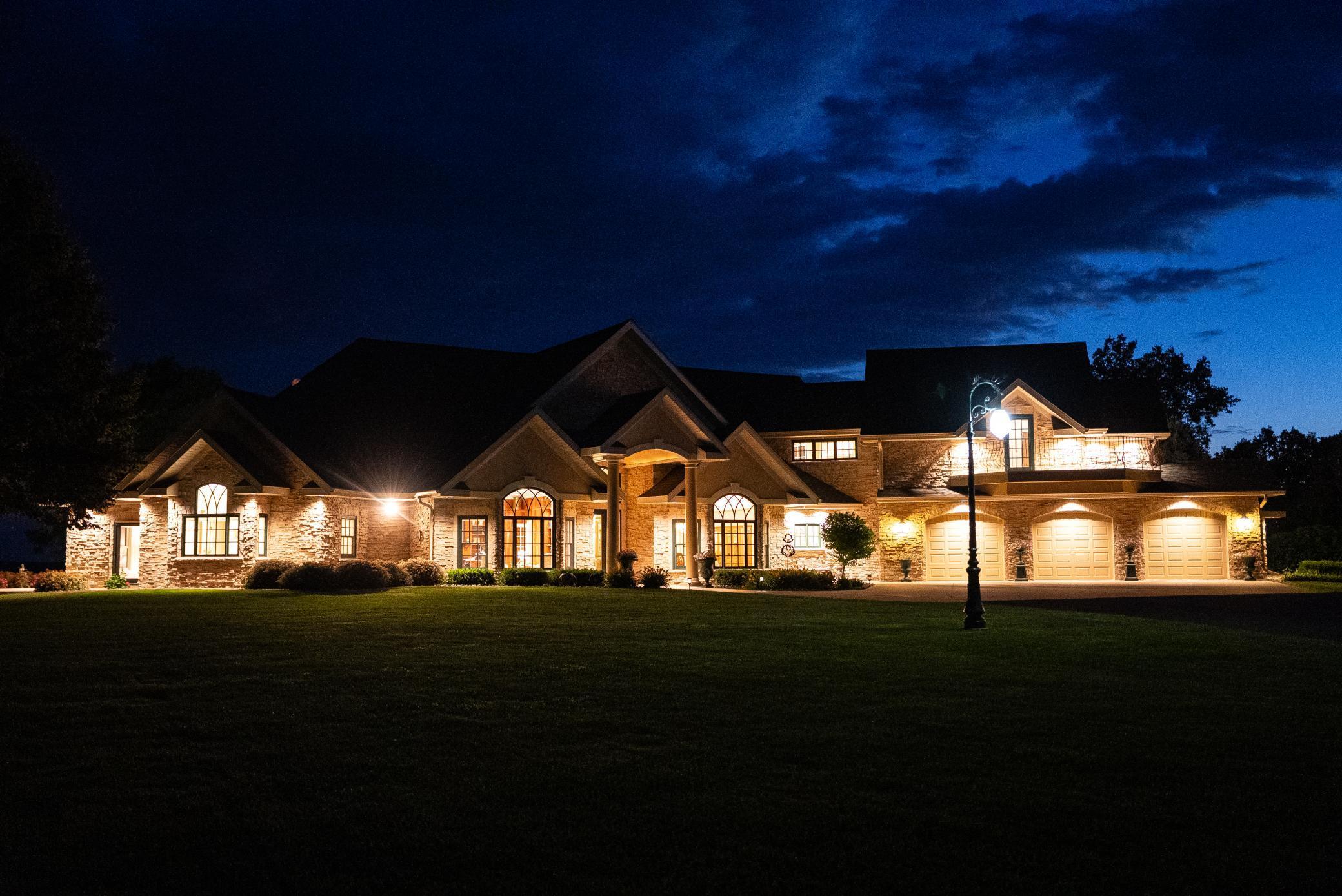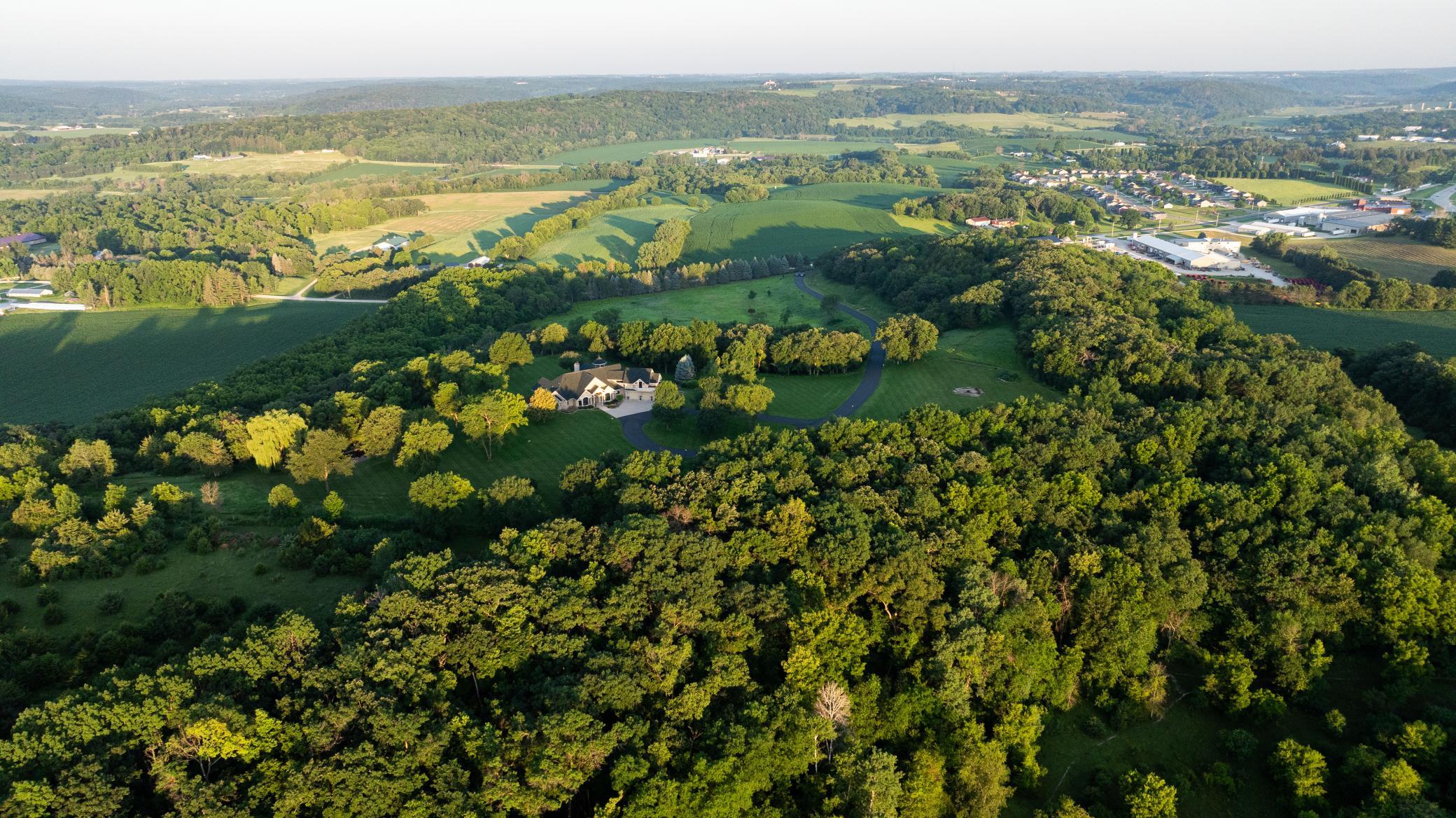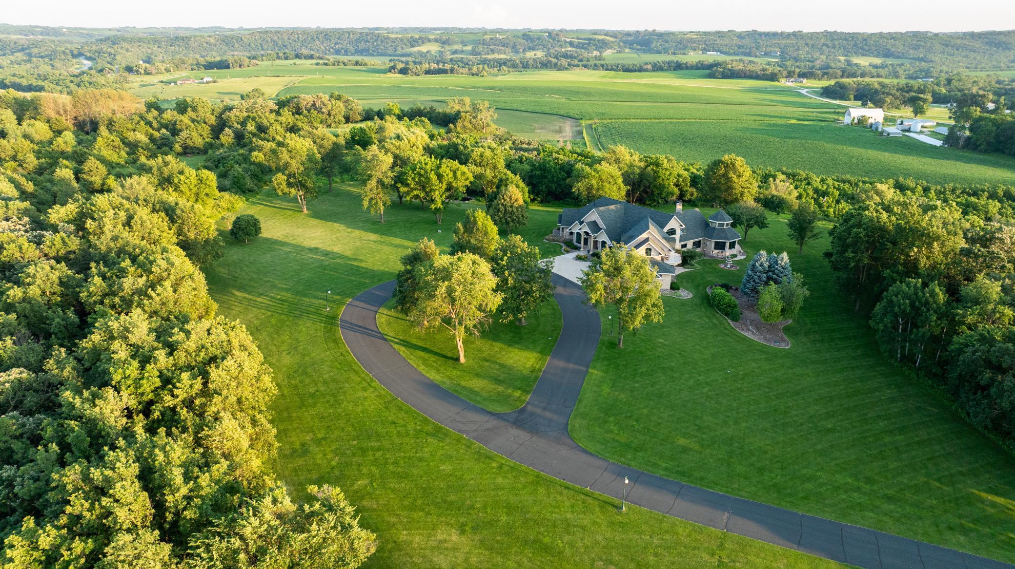 Redtail Ridge Executive Estate on 48+ Private Acres | Unmatched Luxury, Privacy & Scenic Beauty Perched atop a secluded ridge and accessed by a gated, lighted, asphalt driveway, Redtail Ridge is an extraordinary executive retreat nestled on over 48 acres of rolling terrain. With panoramic views, exceptional sunsets, and an unmatched sense of privacy, this one-of-a-kind property offers luxury living surrounded by nature and abundant wildlife—including trophy deer and turkey hunting. This custom-designed residence is an architectural masterpiece that blends elegance, comfort, and functionality. The home features in-floor heating with electric backup, dual-control recirculating hot water, Marvin Integrity windows and sliding doors, and whole-house sound throughout. Exterior amenities include a heated patio and front entry ice melt system, wood-fired Italian pizza oven, multi-tiered fountain, pond with goldfish, a firepit area, and walking trails that wind through native flora, a harvestable walnut grove, and scenic land. Inside, the craftsmanship is evident at every turn—soaring ceilings, rich custom cabinetry, designer finishes, and purposeful layout define the home’s character. The main level features an expansive chef’s kitchen with Sub-Zero and Thermador appliances, double ovens, a 10’ walnut breakfast bar, and seating for eight. Adjacent to the kitchen is a well-appointed bar with granite countertops, beverage fridge, and Scotsman ice maker. A walk-in pantry provides custom storage and appliance-ready space. The dining room accommodates 18 under alabaster chandeliers, while the living room, study, and multiple sun-drenched sitting areas offer both comfort and sophistication. The luxurious owner suite is a true retreat, with private patio access, two large walk-in closets, spa bath featuring Kohler River Bath whirlpool, double vanities, and a two-person shower. Entertainment and functionality continue with a wine cellar (900-bottle capacity), large family room with American cherry ceiling and enclosed entertainment system, and a "Jumby" room with 20’ ceilings, octagonal design, and tiered cove lighting. The home also features a 3-car heated garage with three drains, hot water, and ample workspace and storage. Upstairs, guests and family will enjoy multiple bedrooms with private balconies, a Jack-and-Jill bath, playroom/fitness area with secret nooks, and even a kitchenette-equipped lounge. Whether you're relaxing by the fire, exploring the land, hosting a gathering, or simply enjoying the view from one of three private balconies, Redtail Ridge offers the pinnacle of tranquil, luxury living—just minutes from Chatfield and within reach of Rochester