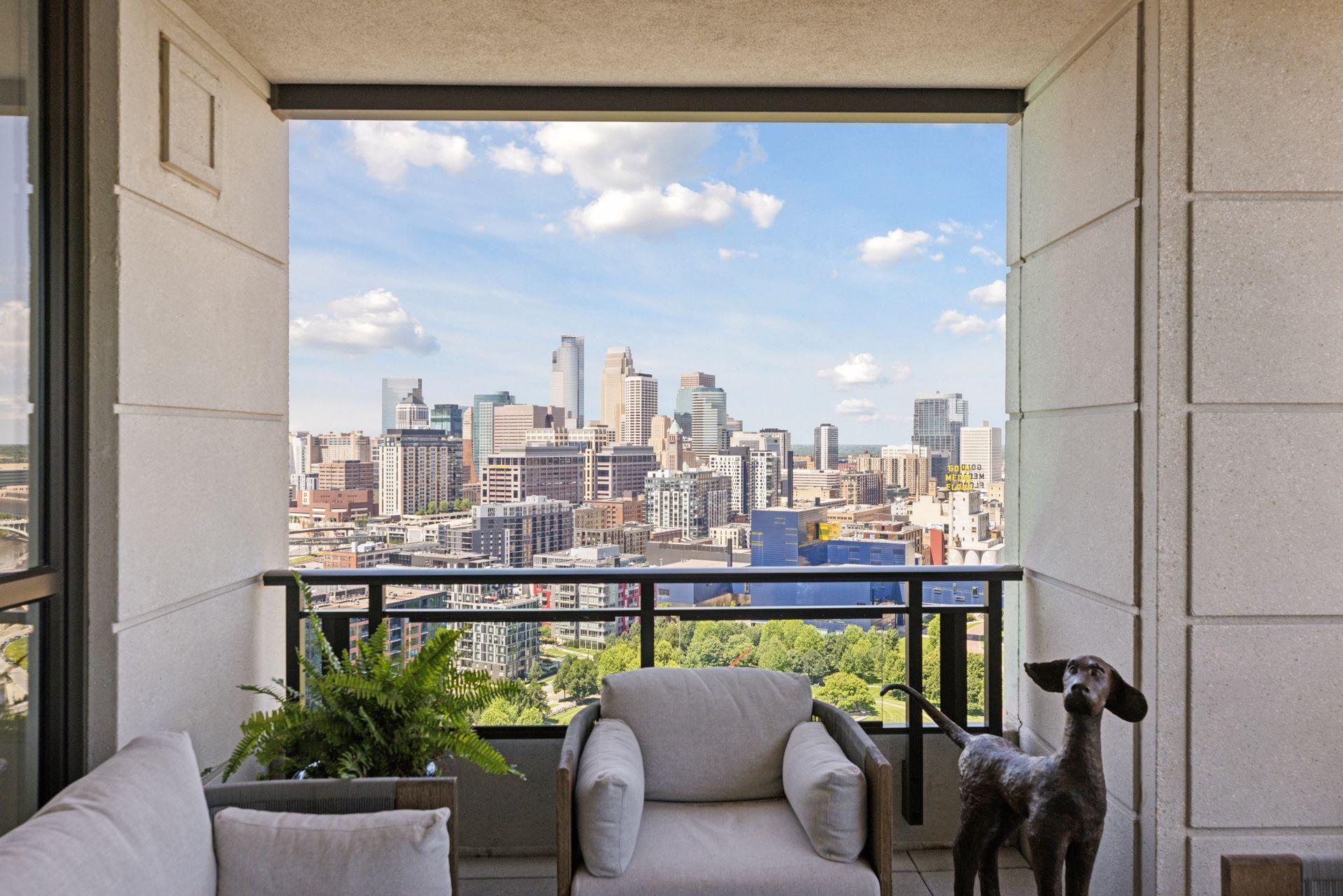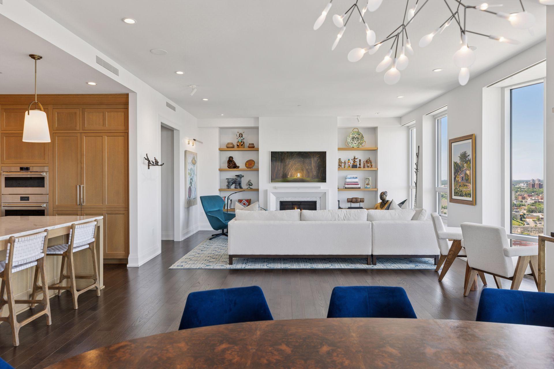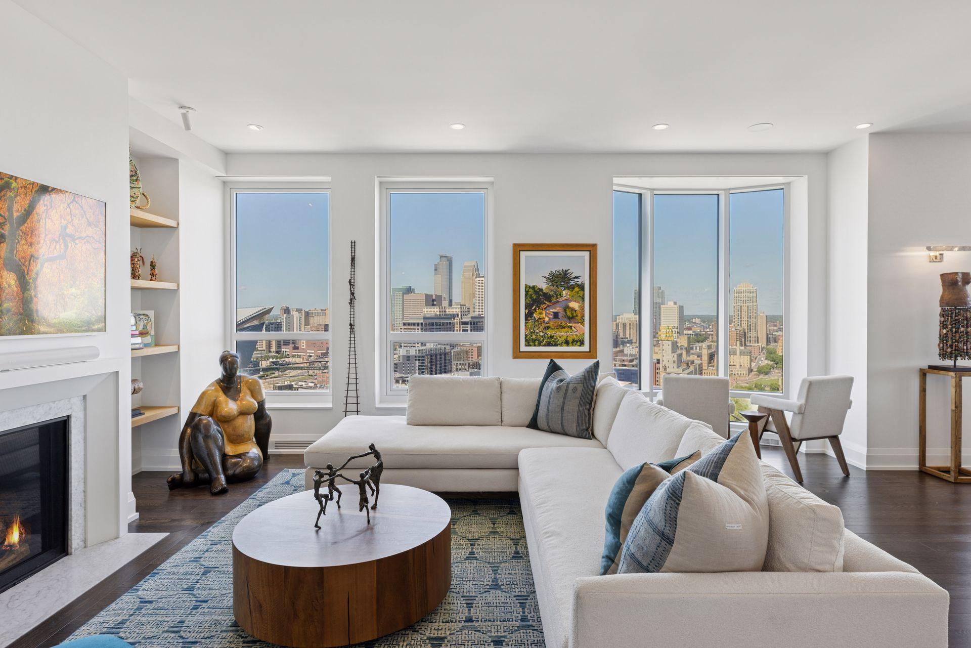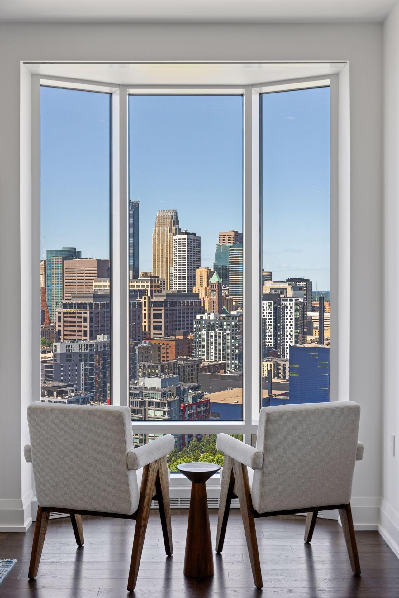 This stunning 2 BR + Den/Media room condo is located on the coveted NW corner of Eleven on the River condominium designed by the renowned Robert A.M. Sterns Architects, with spectacular views of the Mississippi River, Stone Arch Bridge, Gold Medal Park and the Minneapolis skyline. Features include a chef's kitchen complete with large center island, Wolf wall oven, steam oven, microwave, and 2nd large Wolf oven under the cooktop. The Sub-Zero Refrigerator matches the rift oak custom cabinetry throughout the home. Enjoy the breathtaking panoramic views from the expansive 195 sq. ft. heated and covered loggia. Some more added features to this unique home are: 2 garage spaces that EACH have EV charging stations, electric hidden shades in the great room dining area and the primary bedroom, high end gas fireplace, Sonos built-in music system with speakers throughout the entire unit, custom lighting and spotlights to highlight artwork throughout the unit, custom built white rift oak cabinetry in kitchen, bar room and throughout the home. Do not miss the Seura hidden TV in the mirror of the primary bathroom. The countertops in the kitchen and bathrooms are Carrara marble and the floors are hardwood. Every feature in this home is exquisitely and thoughtfully designed. The ELEVEN has all the amenities of a 5-star hotel including private motor court paved in granite with 24/7 doorman service, on demand smart elevators operating at 1,000 ft. per minute, guest suites available for rent, fitness center overlooking the river and city skylines, yoga studio, weight room and sauna, 75 ft. lap pool, spa hot tub, children's splash pad, private cabanas and outdoor fireplaces, indoor multi-sport court, golf simulator and private dog park and dog grooming room and so much more!