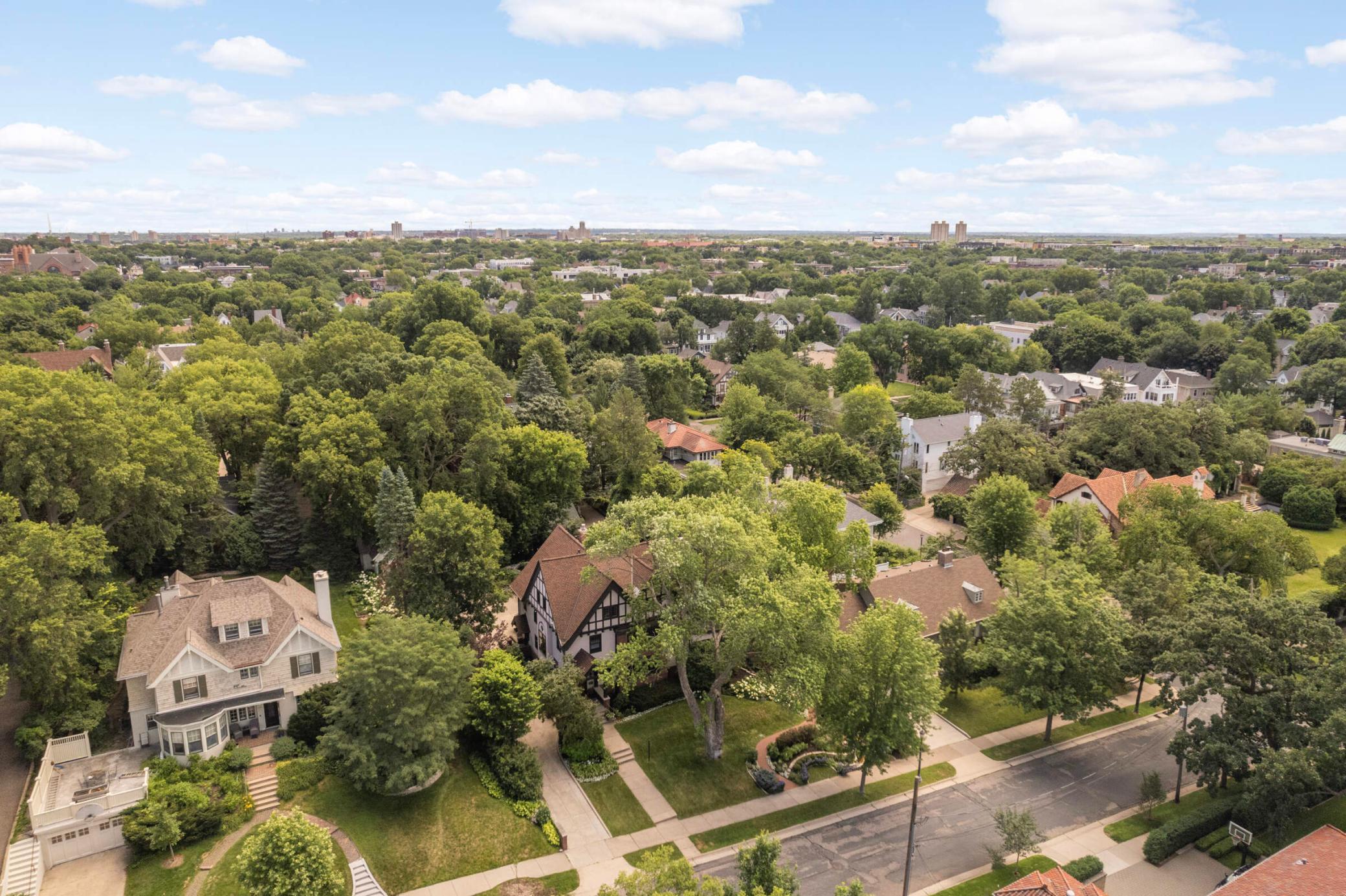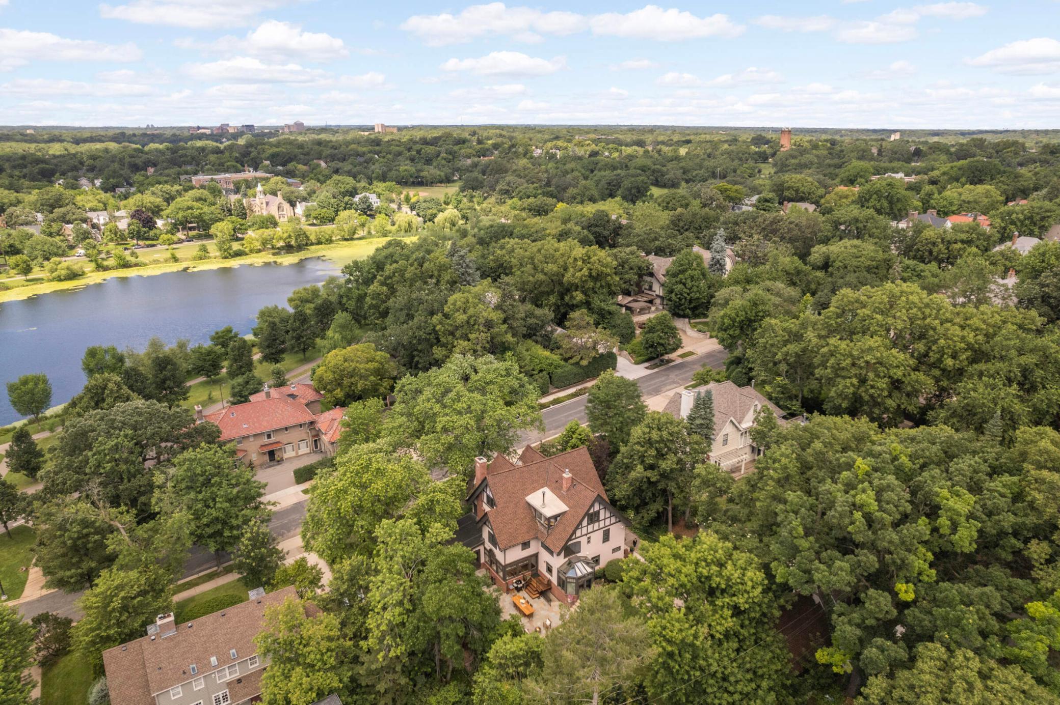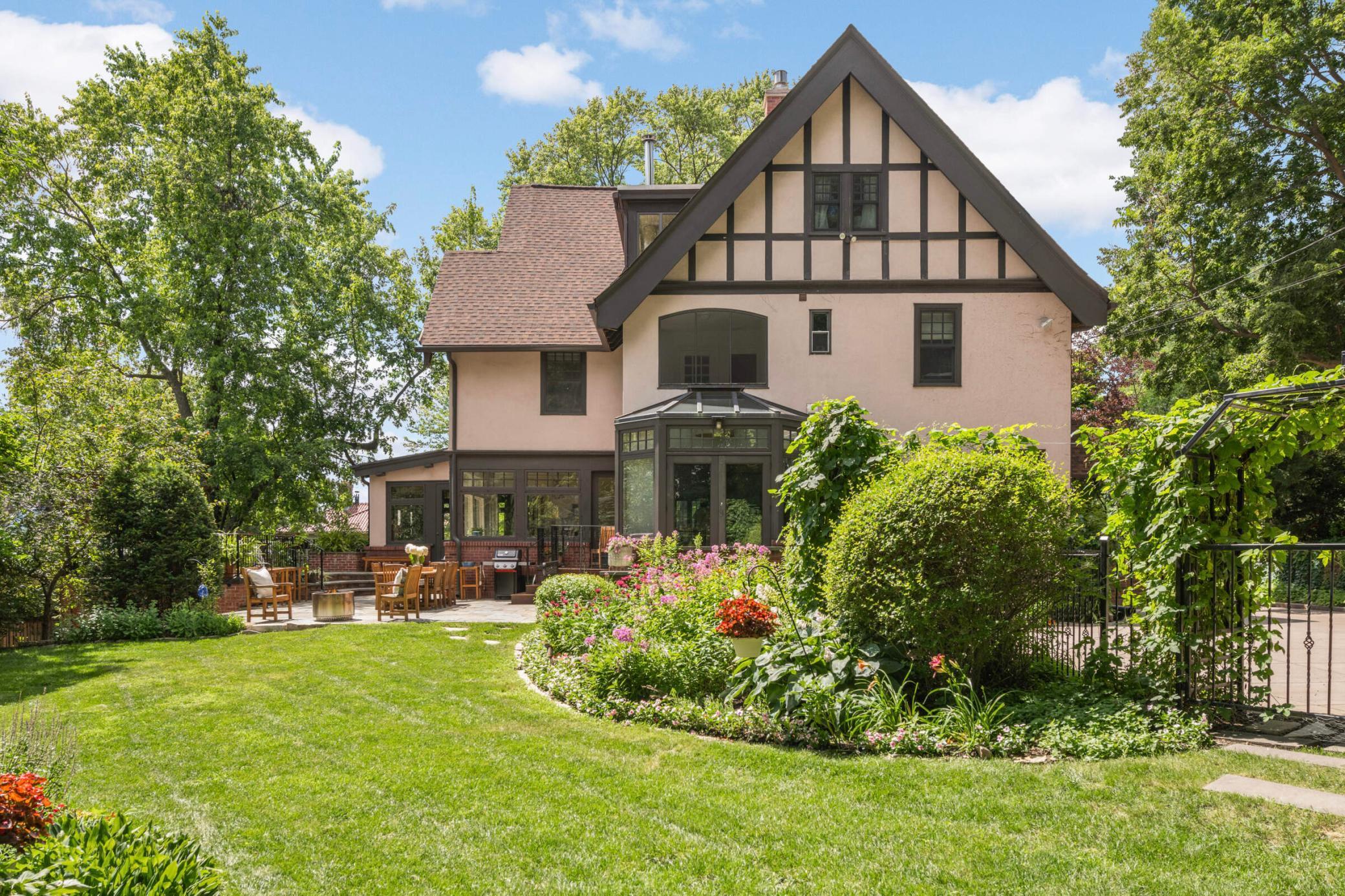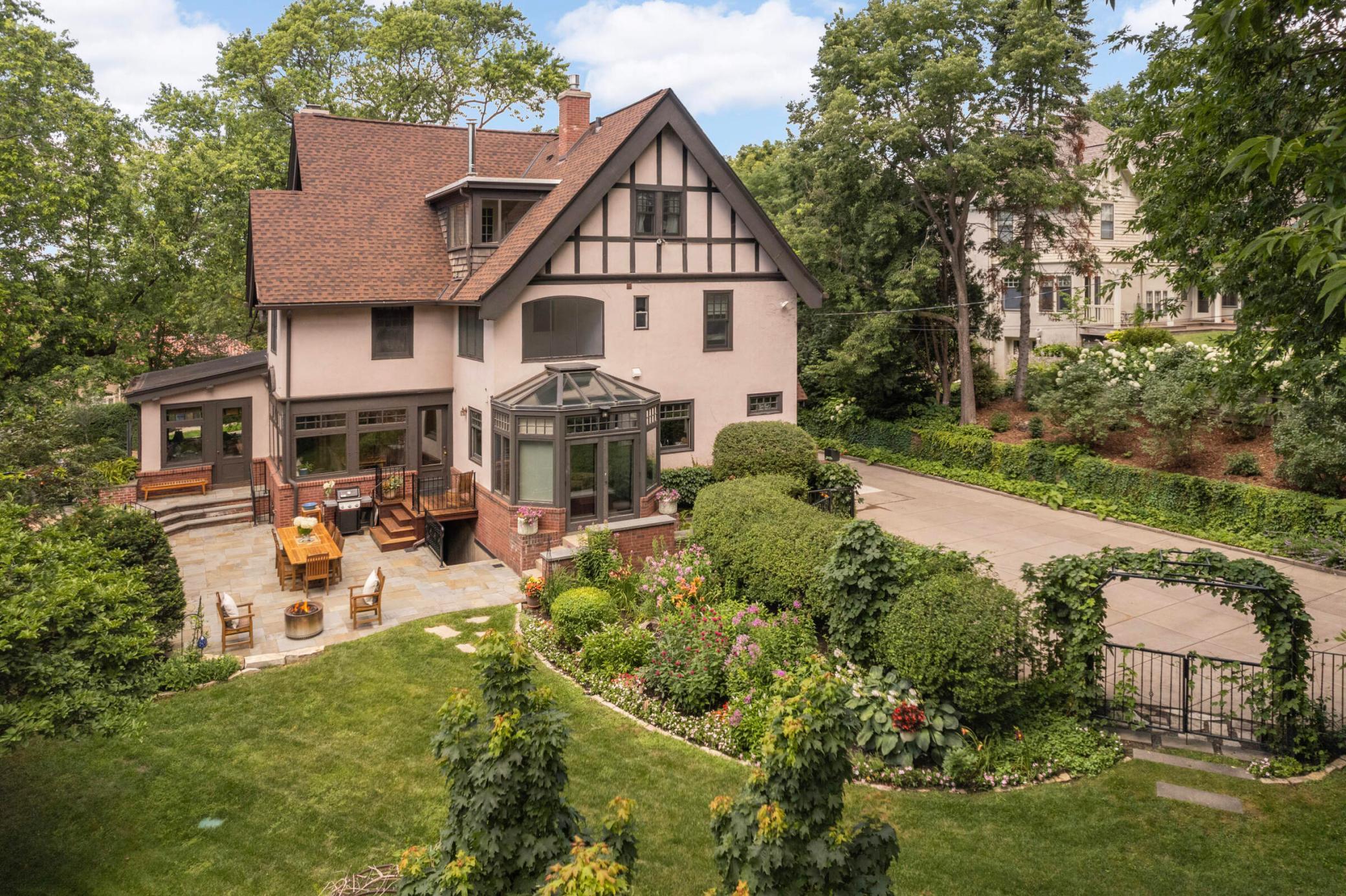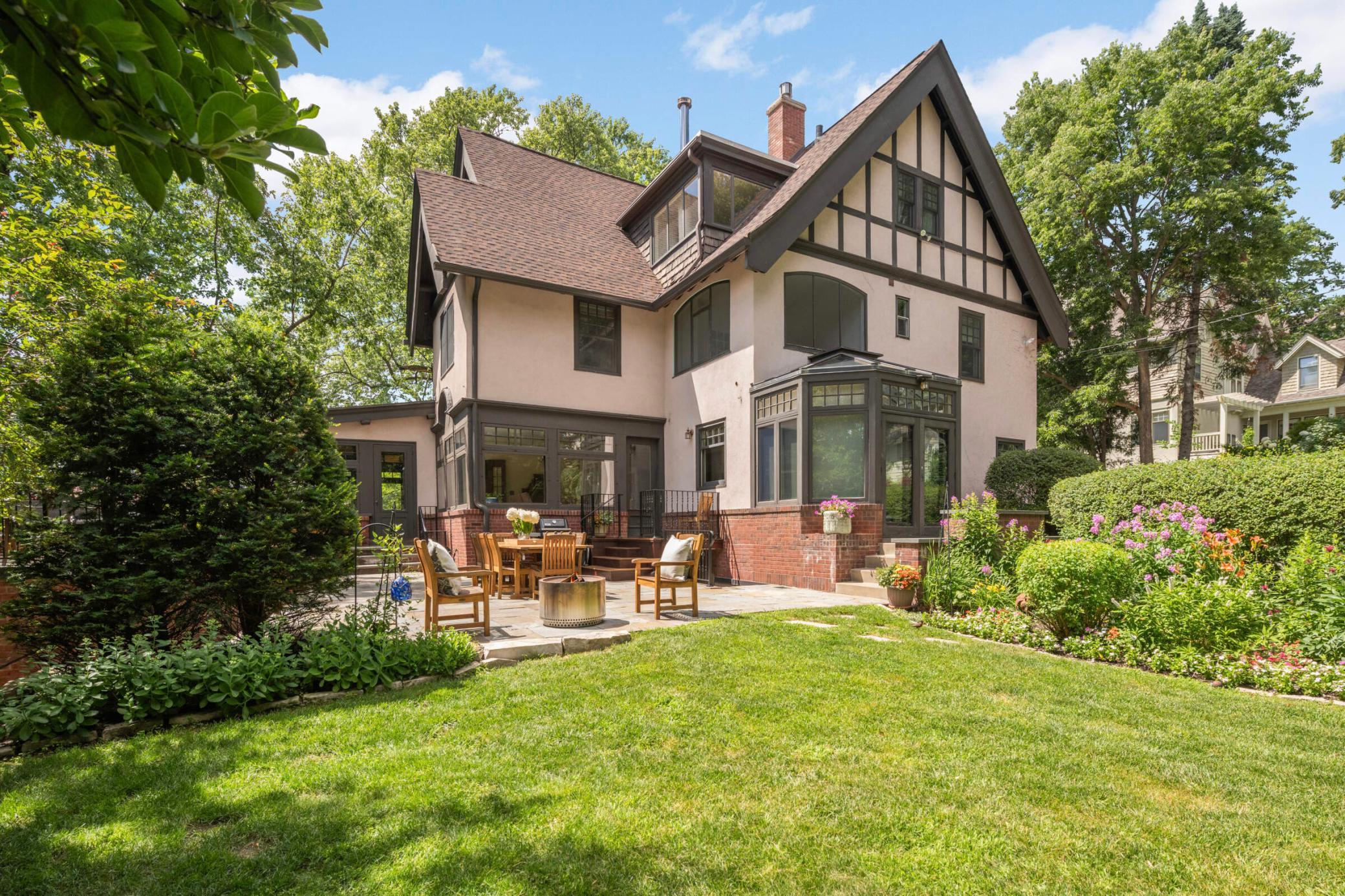 LOCATION, location... Nestled between Lake of the Isles & DT Mpls, renowned architect, Harry Wild Jones, designed this stately 1909 American Tudor Revival. Situated on an oversized lot, the house exudes a magical, casual elegance. Effortlessly melding historic beauty with thoughtful renovations. Main floor highlights include a beautifully crafted open staircase; a chef's kitchen with an atrium-style dining nook, inset cabinetry, walk-in pantry, & prof appliances; custom oak mudroom; a sun-filled formal dining rm w/ orig clay floor tiles; Leaded French doors; a cozy den w/ rich oak wookwork & built-in bookshelves; and, a spacious formal living room with the orig woodburning fireplace. The backyard is STUNNING w/ multiple access points for seamless indoor/outdoor living. A true oasis with an expansive tiered bluestone patio & terrace, mature gardens, and a peaceful babbling brook. Plus, the perfect sodded flat area for kids & adults alike. Note the clever (large) bike + canoe + paddleboard storage under the terrace for EZ access to LOTI & trails. The 2nd & 3rd floor offers tree-top lake views and hosts 5 bedrooms (including the luxe primary suite), an office, 4 thoughtfully appointed bathrooms, 2 charming porches, & ample attic storage. Completing this fine home is the lower-level hang-out space (w/gorgeous limestone walls), a renovated 3/4 tiled bath, laundry, and additional storage. MOVE IN and ENJOY the Minneapolis Lakes Area to the fullest.