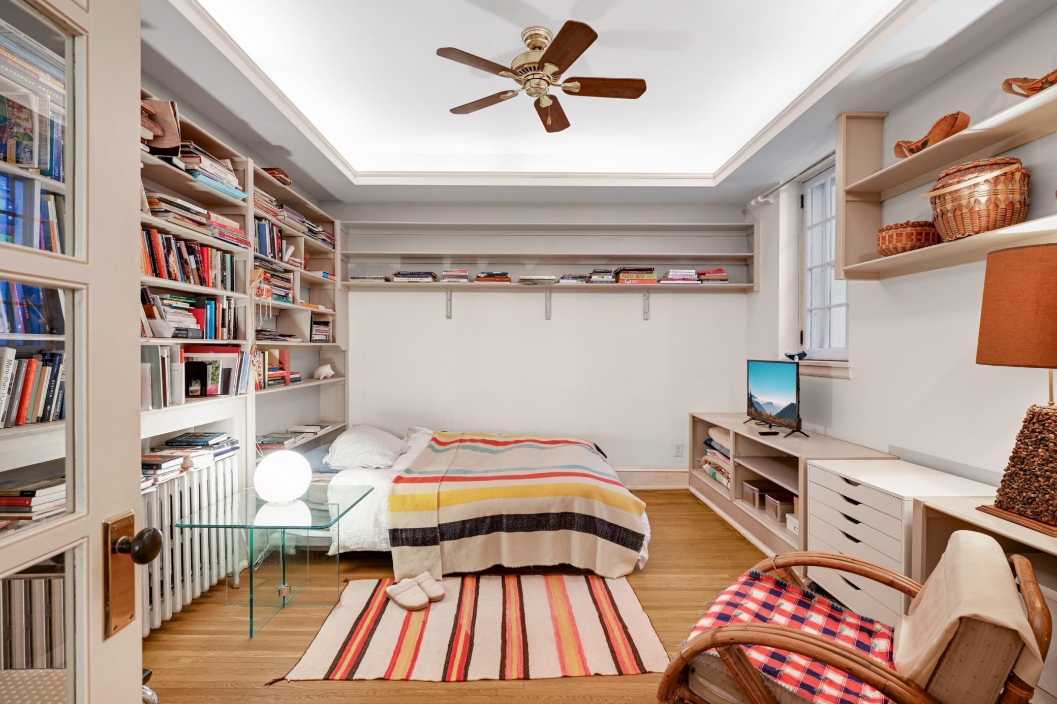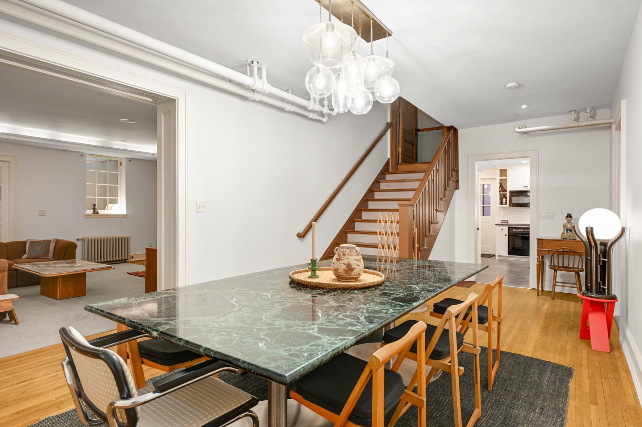 The garden level features a private entrance, with additional access from the main floor. This expansive space offers nine foot ceilings, two bedrooms, an updated kitchen, two bathrooms, a living room with gas fireplace, dining area, and laundry, making it ideal for guests or extended living.