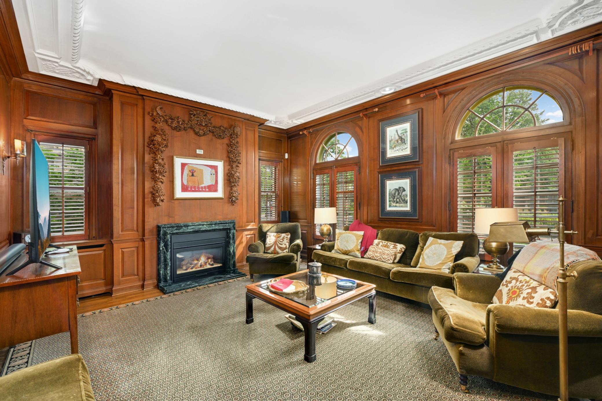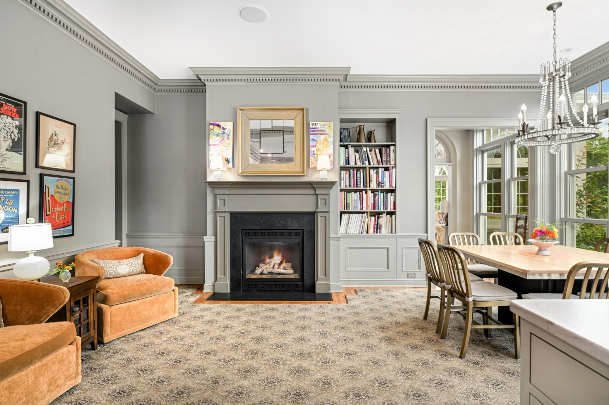 distinct living spaces that can function independently or as one cohesive home. The main level features a light filled eat-in kitchen with high end appliances and a gas fireplace, flowing seamlessly to a terrace ideal for outdoor dining and relaxation. Additional spaces include a formal dining room, butler’s pantry, sunroom, living room with gas fireplace, and a richly appointed library wrapped in Cuban mahogany built-in bookshelves and a gas fireplace. Two half baths complete this level.