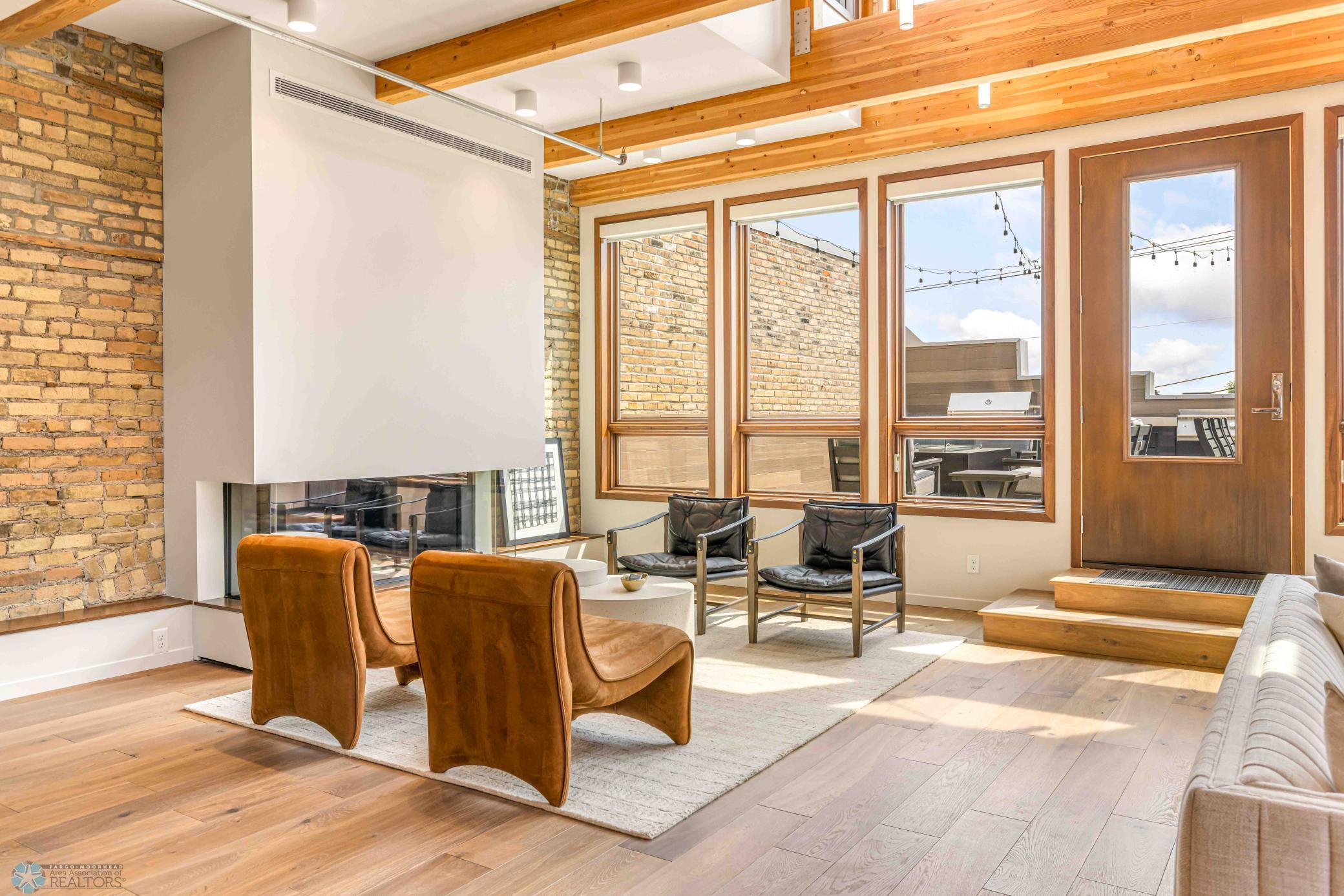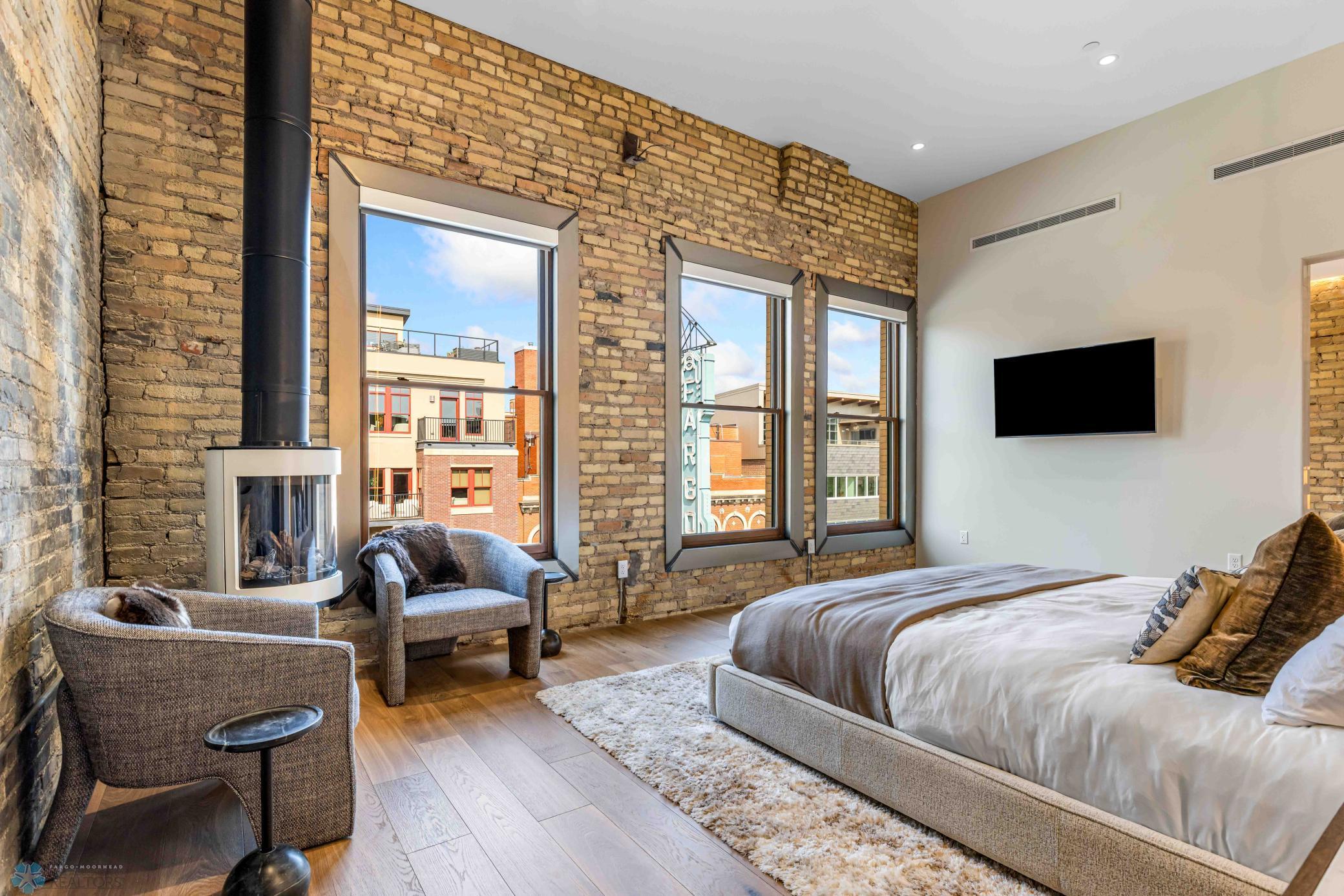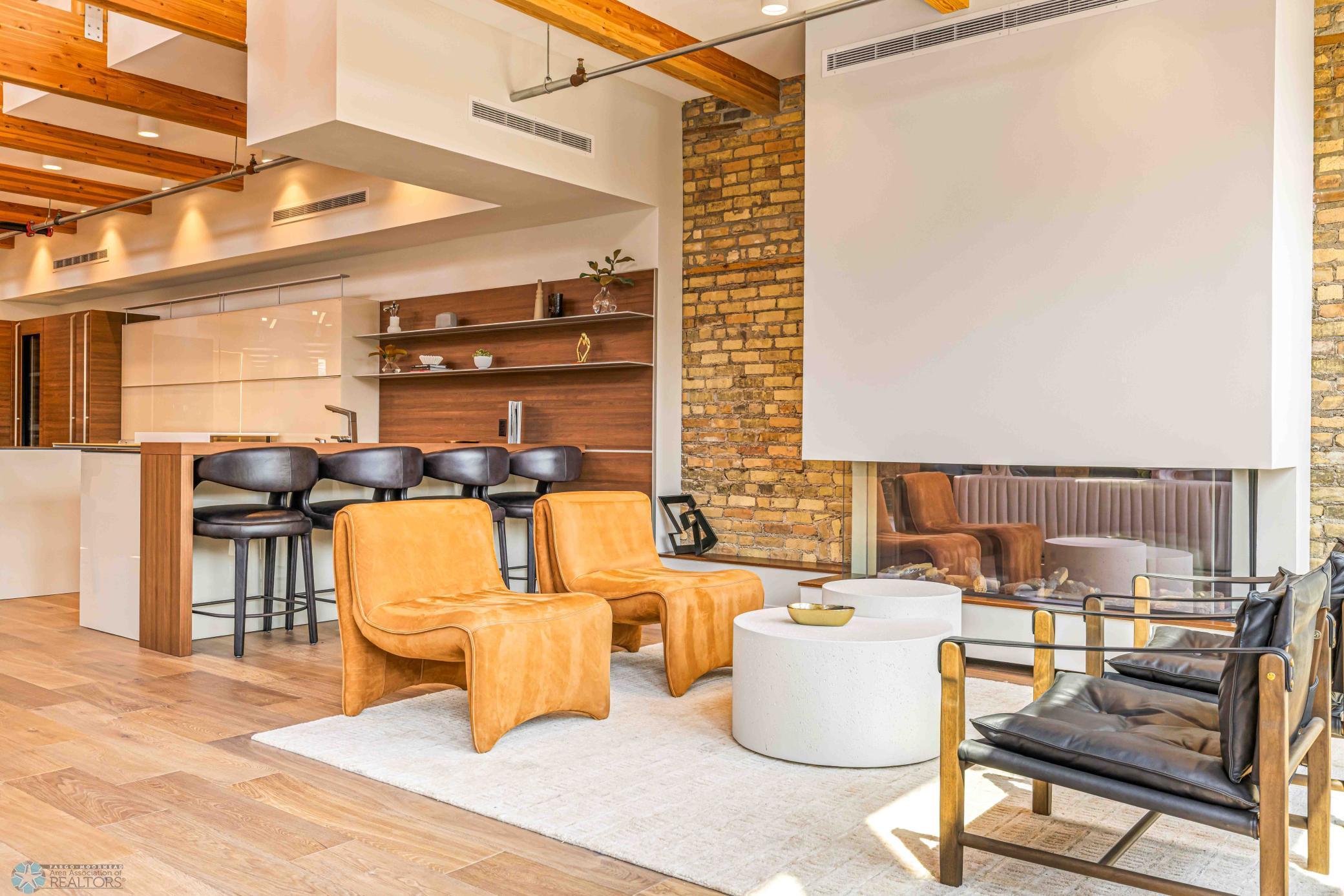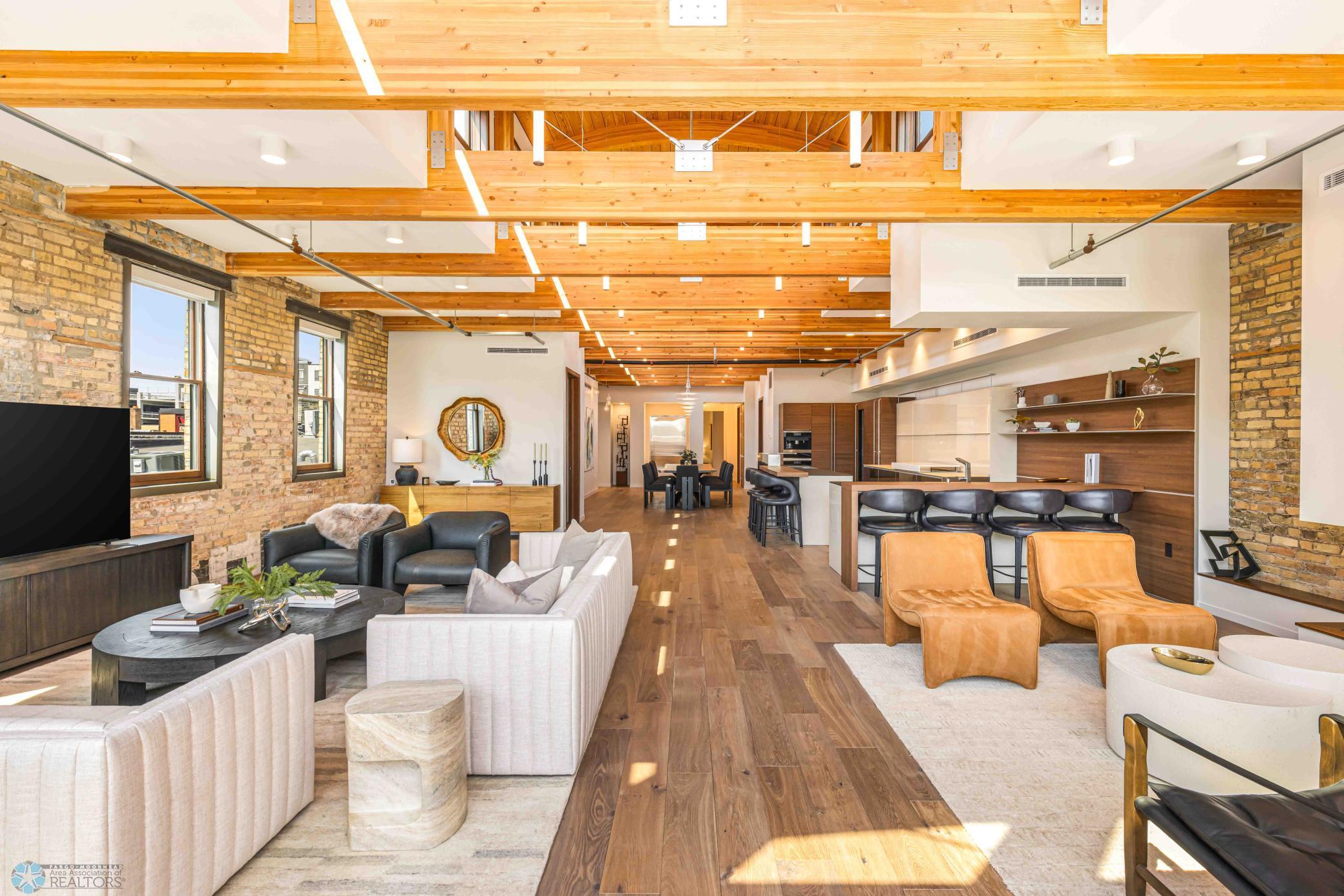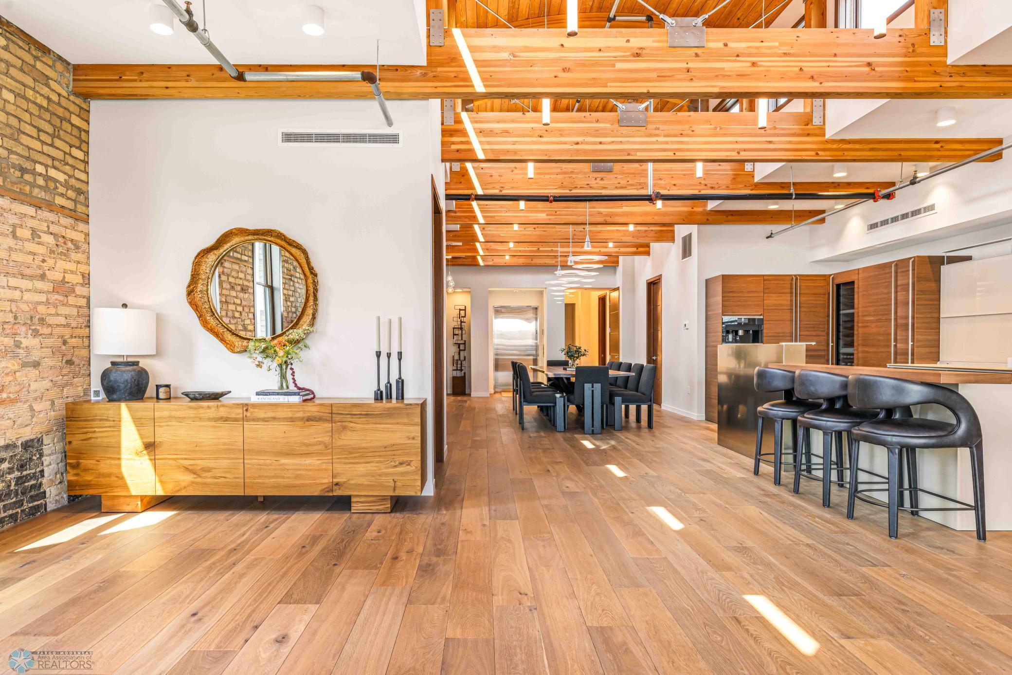 The Moose Dixon Penthouse Perched above Broadway in the heart of downtown Fargo, overlooking the iconic Fargo Theatre, the Moose Dixon Penthouse is a breathtaking blend of historic charm and contemporary sophistication. Encompassing over 3,300 square feet, this one-of-a-kind residence crowns a landmark 1905 building, once home to Dixon Laundry and the Moose Lodge, now transformed into a timeless showcase of elevated urban living. Arrive through heated underground parking and take the elevator up to the penthouse level. Inside, stunning architectural details abound; from the custom barrel ceiling and original exposed brick to the modern suspended fireplace and sleek, in-wall lighting. Every inch is finished with intention, including 8-foot solid wood doors with striking chrome inlays that line the home with understated elegance. At the heart of the residence is a state-of-the-art Italian Valcucine kitchen, fitted with top-of-the-line Miele appliances, a hidden induction cooktop, dual sinks, pot filler, climate-controlled wine fridge, built-in icemaker, espresso machine, and warming drawers. Just beyond, a Butler’s pantry offers extra storage and discreetly houses the hidden in-unit washer and dryer, keeping utility out of sight without sacrificing convenience. The open-concept layout flows effortlessly into the living and dining spaces, featuring automated shades, invisible speakers, and smart lighting all powered by a full smart home system. A dual-zone furnace ensures comfort year-round, and the home is sold fully furnished with luxury designer pieces for a truly turnkey experience. Retreat to the spa-inspired bathrooms, where luxury continues with bidet toilets, heated seats, a deep soaking tub, dual vanities, and a massive steam shower that rivals high-end resorts. Step outside to the first of two private rooftop spaces; a fully finished outdoor oasis with an outdoor kitchen, custom fire feature, and seating for up to 21 guests, creating a true entertainer’s paradise in the heart of downtown. One level above, the second rooftop, on the fifth floor, offers a rare opportunity for future expansion. Already roughed in for a wet bar and hot tub, this unfinished space is ready for your vision to transform it into something extraordinary. Whether you’re searching for an iconic personal residence, a luxury short-term rental, or a one-of-a-kind event venue, the Moose Dixon Penthouse is a rare opportunity to own a piece of Fargo’s past.. refined and redefined for modern living.