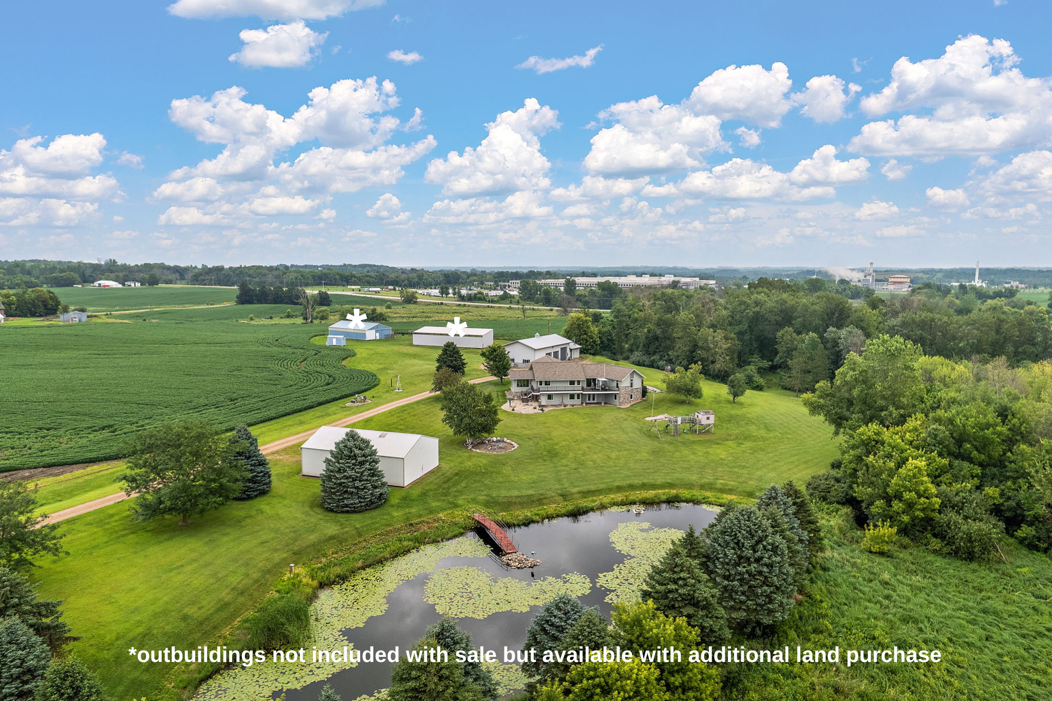 **NOTE: PRIVATE DRIVEWAY, PLEASE DO NOT ENTER WITHOUT A SCHEDULED APPOINTMENT...THANK YOU!** The long tree lined driveway ushers you to a pristine 12.7+ acre country setting filled with abundant wildlife, panoramic views and seclusion. The property continues to impress...charming pond with footbridge, beautifully manicured lawn, wooded areas, and the numerous outbuildings offering versatile space for storage, workshop or small business endeavors. The sprawling one story home offers almost 4000 sq ft of thoughtfully designed living space. The living room with its large windows and three sided gas fireplace serves as the ideal gathering spot offering stunning views of the surrounding landscape. The heart of the home is the spacious kitchen equipped with stainless steel appliances, center island, custom cabinetry and ample counter space. The cozy knotty pine sunroom features pocket doors, beamed vaulted ceiling, access to deck and is surrounded on all sides with windows ensuring nature is always a part of your indoor experience. The home office provides a dedicated workspace with built-in shelving & desks and also has a convenient separate front entrance that is perfect for a home business. Spacious primary suite with tray ceiling, walk in closet, full bath and whirlpool soaking tub. Walkout lower level includes a full kitchen, 3 bedrooms, laundry, full bath and includes a walkup stairs to the garage....making this a perfect in-law or multi generational layout. Features include newer LVP flooring throughout, new roof in 2015, newer Trex deck & railing, newer central air, main level laundry hookup & newer exterior doors. You will enjoy all the outdoor spaces including the 400sf deck overlooking the pond with stairs to backyard, lower level patio and large covered front porch. Huge heated & insulated 2400sf pole building with concrete floors, wood boiler, 3 new overhead doors (10' & 12' height), 450sf mezzanine and half bath. Additional 1536 pole building, 3286 pole building, 992 lean-to, 2000 open steel utility bldg, 2160 steel utility building and chicken coop spaced throughout the acreage making this property as functional as it is beautiful. 4 minutes to I-35 entrance & restaurants providing the perfect blend of seclusion and accessibility. Discover the potential and endless possibilities that await in this rare country setting where your next chapter begins. ***ADDITIONAL 32 PRIME ACRES AVAILABLE WITH THIS SALE**