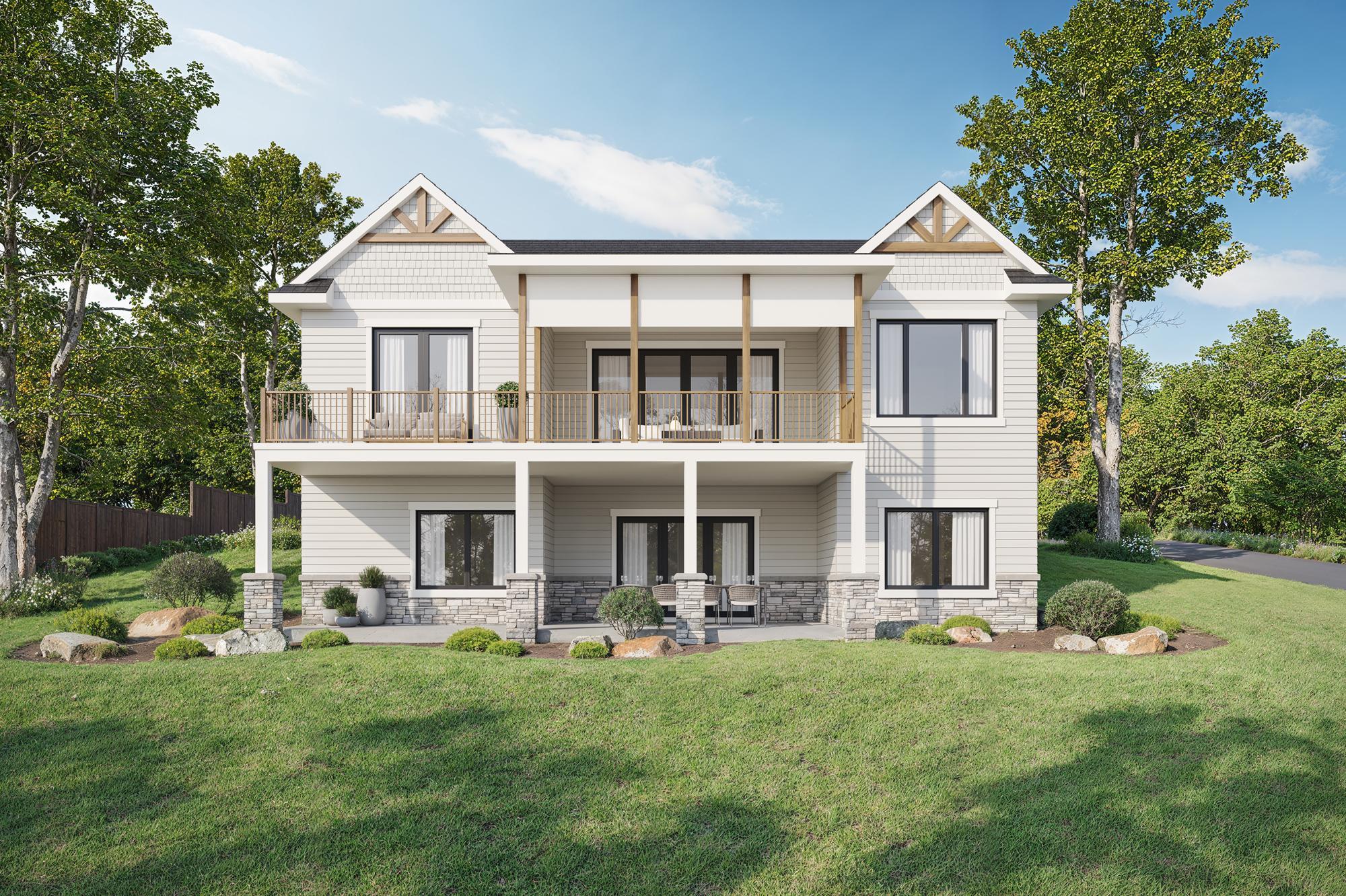 The rear elevation shows the two-story lakeside design with a covered upper deck for entertaining and lake views. Natural stone and white siding create timeless appeal that complements the lakefront setting.