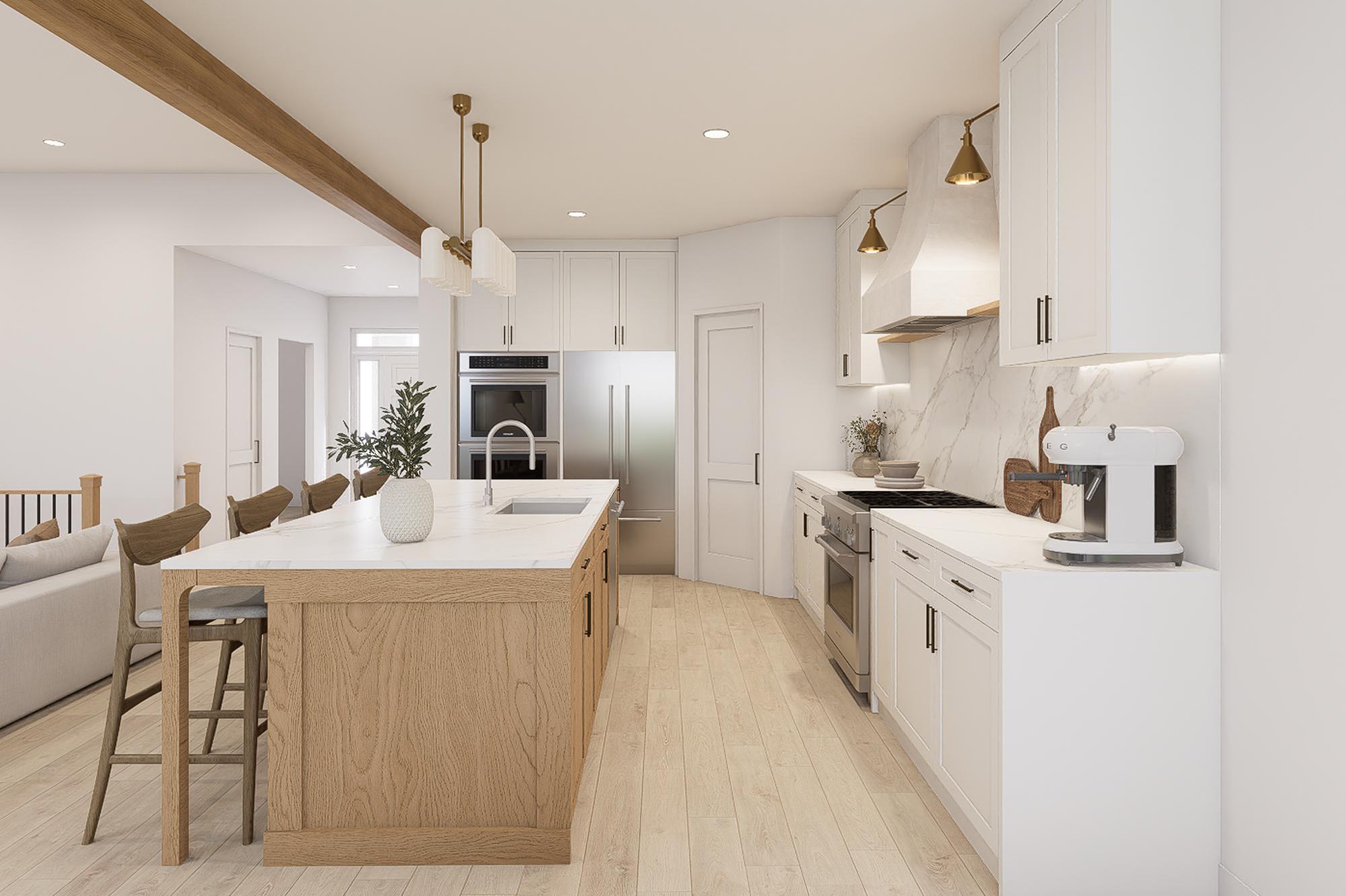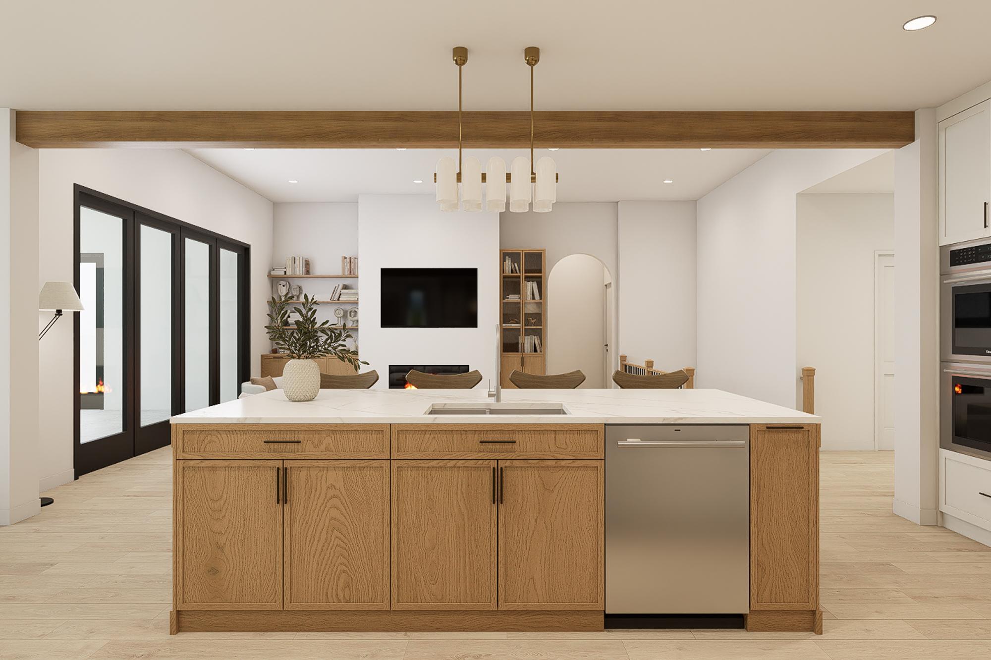 This rambler design maximizes lake views while blending modern sophistication with lakeside comfort. Floor-to-ceiling white custom cabinetry creates seamless flow throughout the open concept living spaces. The kitchen features dramatic backsplashes and countertops with natural veining, complemented by wood accents and brass pendant lighting over the large island.
