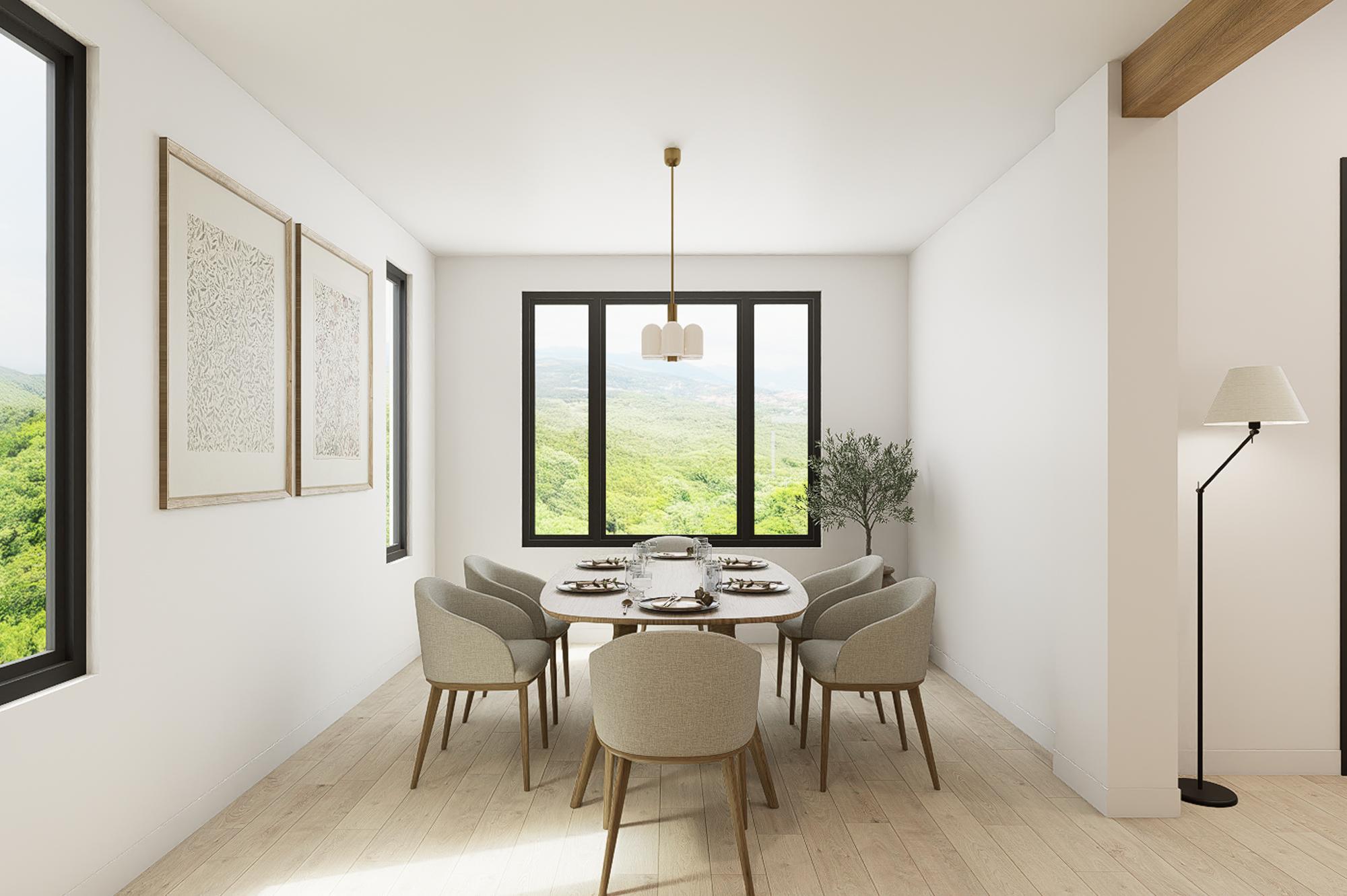 The great room captures lake views through floor-to-ceiling black-framed windows. Soaring ceilings with exposed wood beams and a modern chandelier anchor the space. Kitchen, dining, and living areas flow together, all oriented toward the water views.
