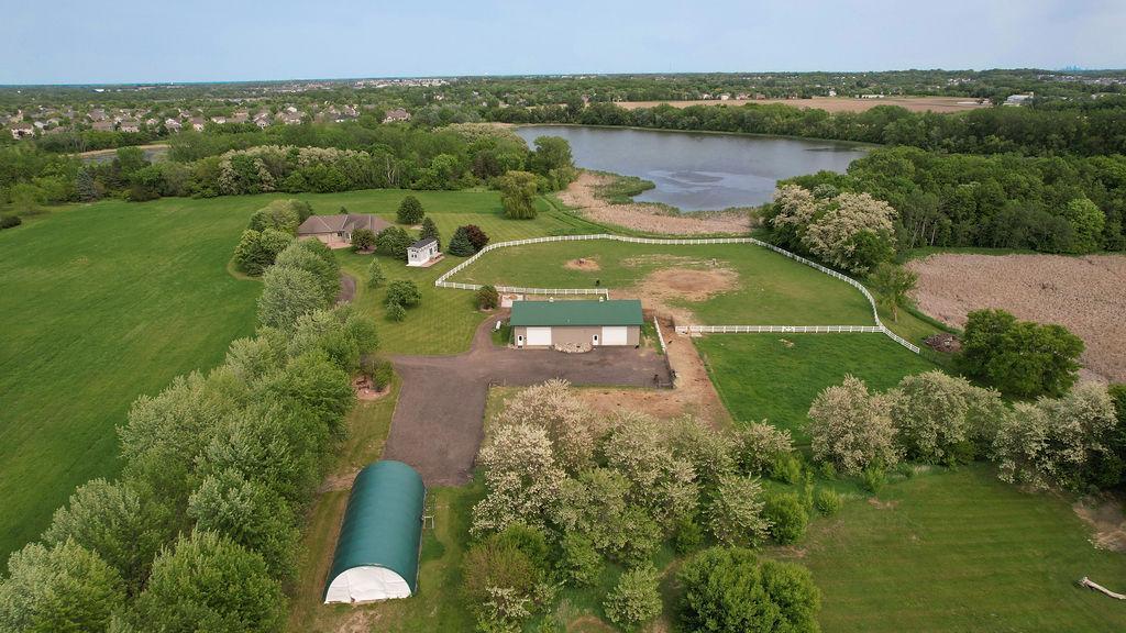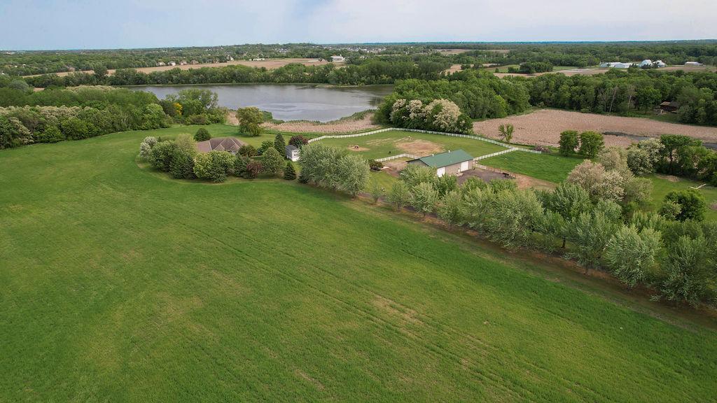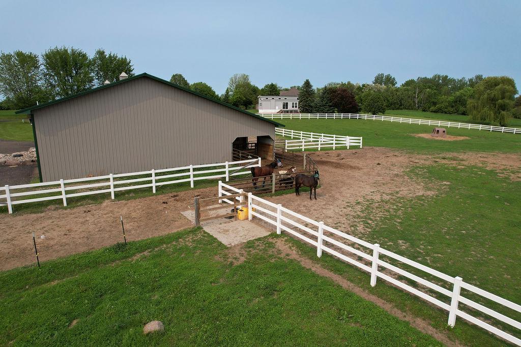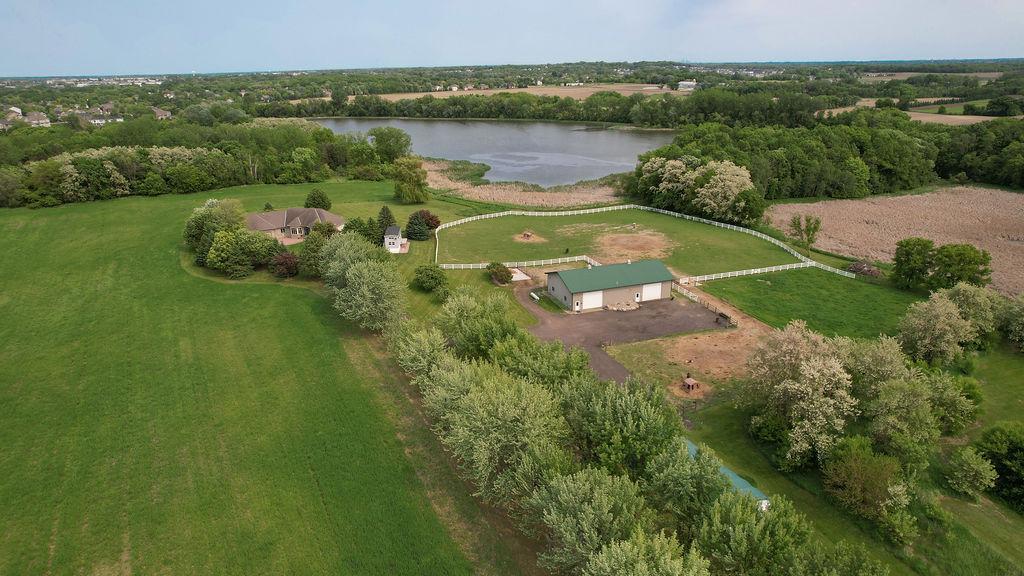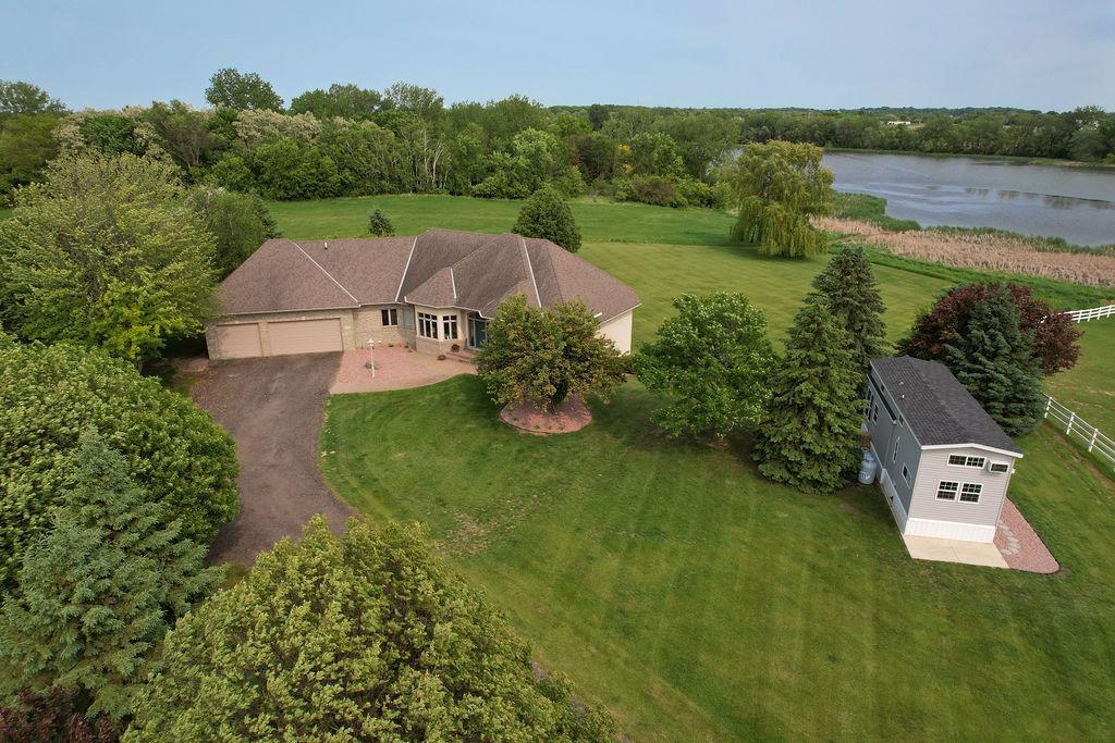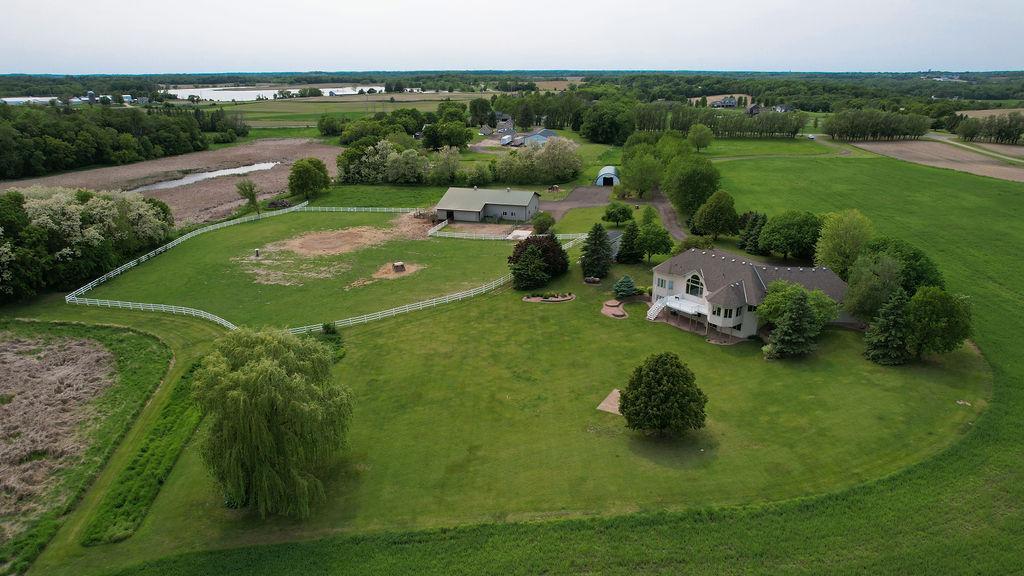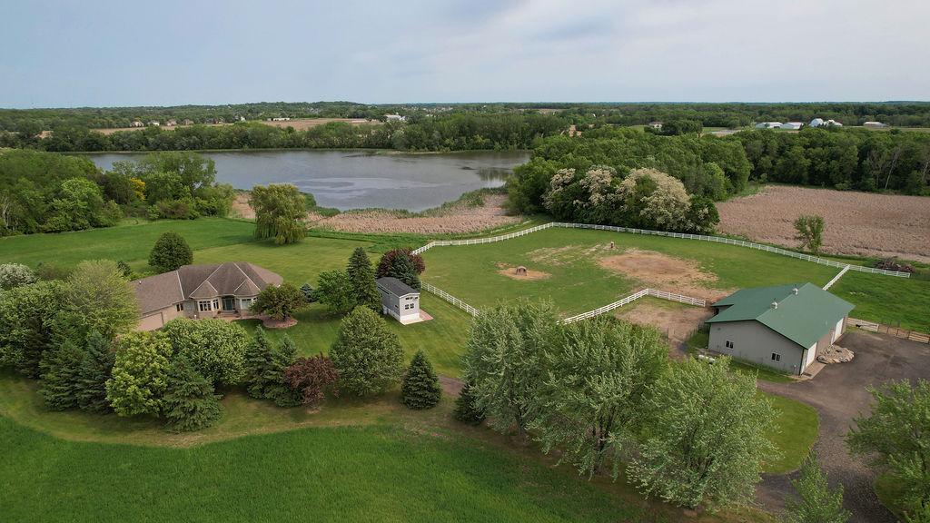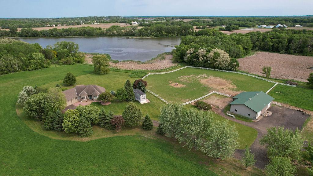 Lake front, Horse Stables, Fenced Pasture, Heated Shop, and 21 acres; if there were such thing as a Dream Property this is it! Welcome to this Custom-Built, walkout Rambler off Lake Cowley in Rogers. Thoughtfully designed with vaulted ceilings, a sunroom overlooking the backyard, and a dedicated home office space. The kitchen has upgraded features which include granite countertops, a tile backsplash, matching stainless steel appliances, and a large center island to gather around. On the Main Floor you will find the spacious, Primary Bedroom with Private Bathroom that includes a double vanity sink, tub, and walk-in shower. Enjoy Main Level Living with the Laundry Room located of the Main Floor as well. Downstairs you'll find two over-sized bedrooms, each include a walk in closet and built in vanity. Between each bedroom is a full bathroom with double vanity sink, tub, and walk in shower. Enjoy the wet-bar off the Family Room that has a walk out to the back patio. The outdoor space is magnificent. All the privacy one could wish for and lakefront that provides stunning sunset views off Lake Cowley. The 21 Acre lot holds a 64 x 27 Hay Tent and a 44 x 80 Heated and Insulated Pole Building containing a 44 x 47 Shop and six indoor horse stables, plumbed and ready for an additional bathroom to be added. Ask about future development options.