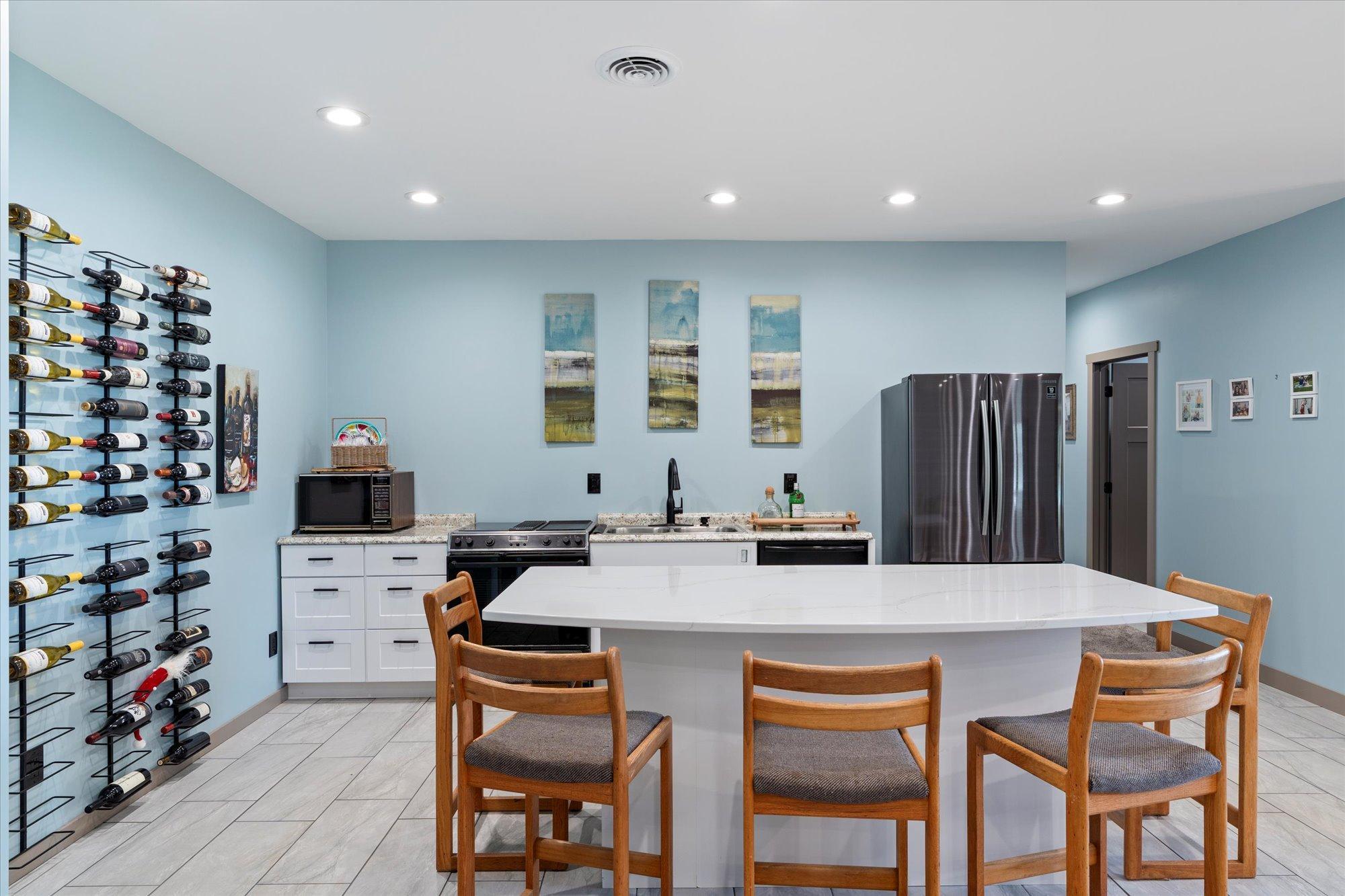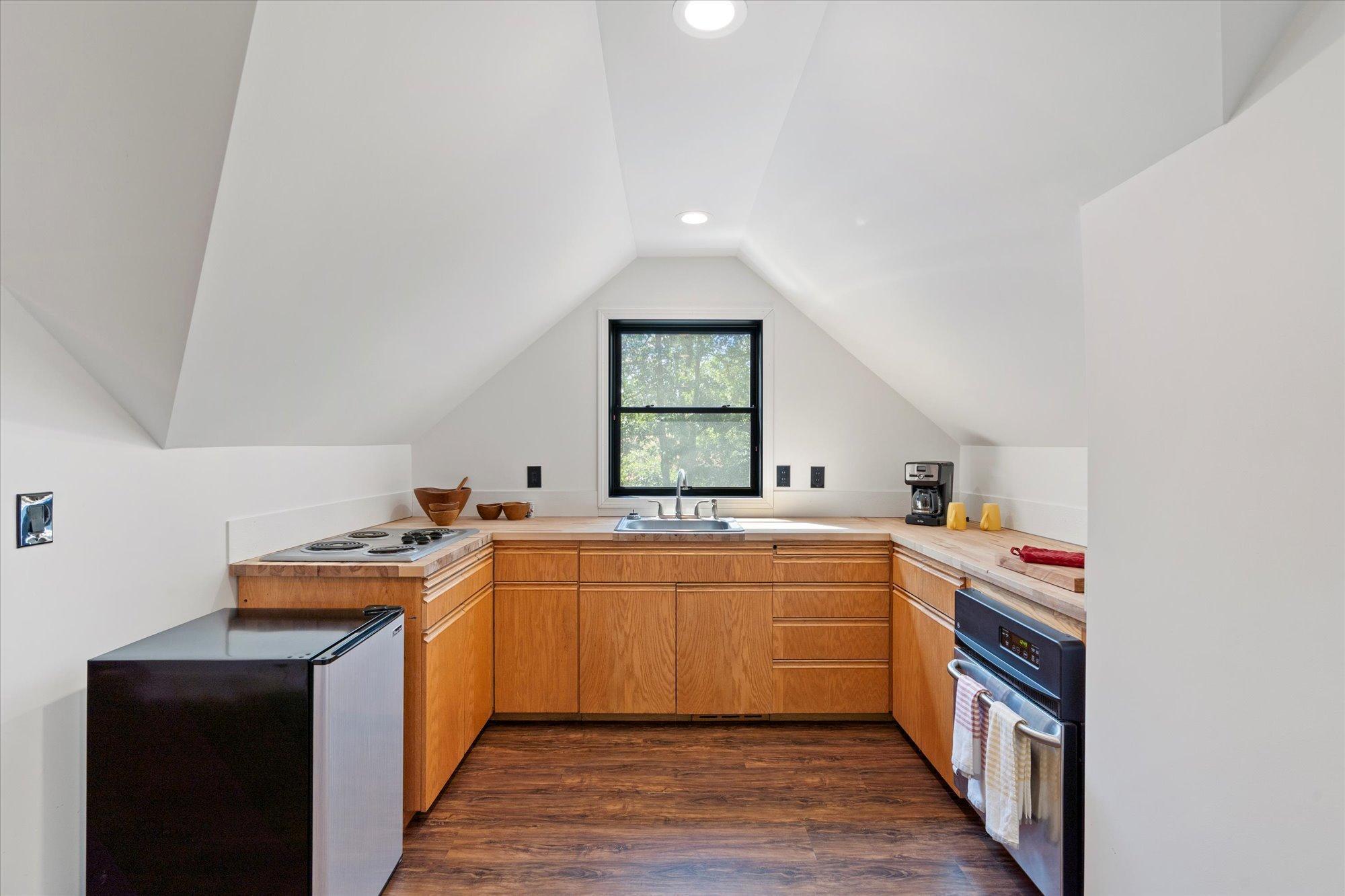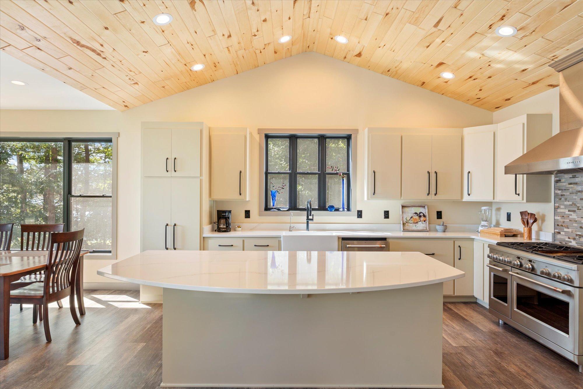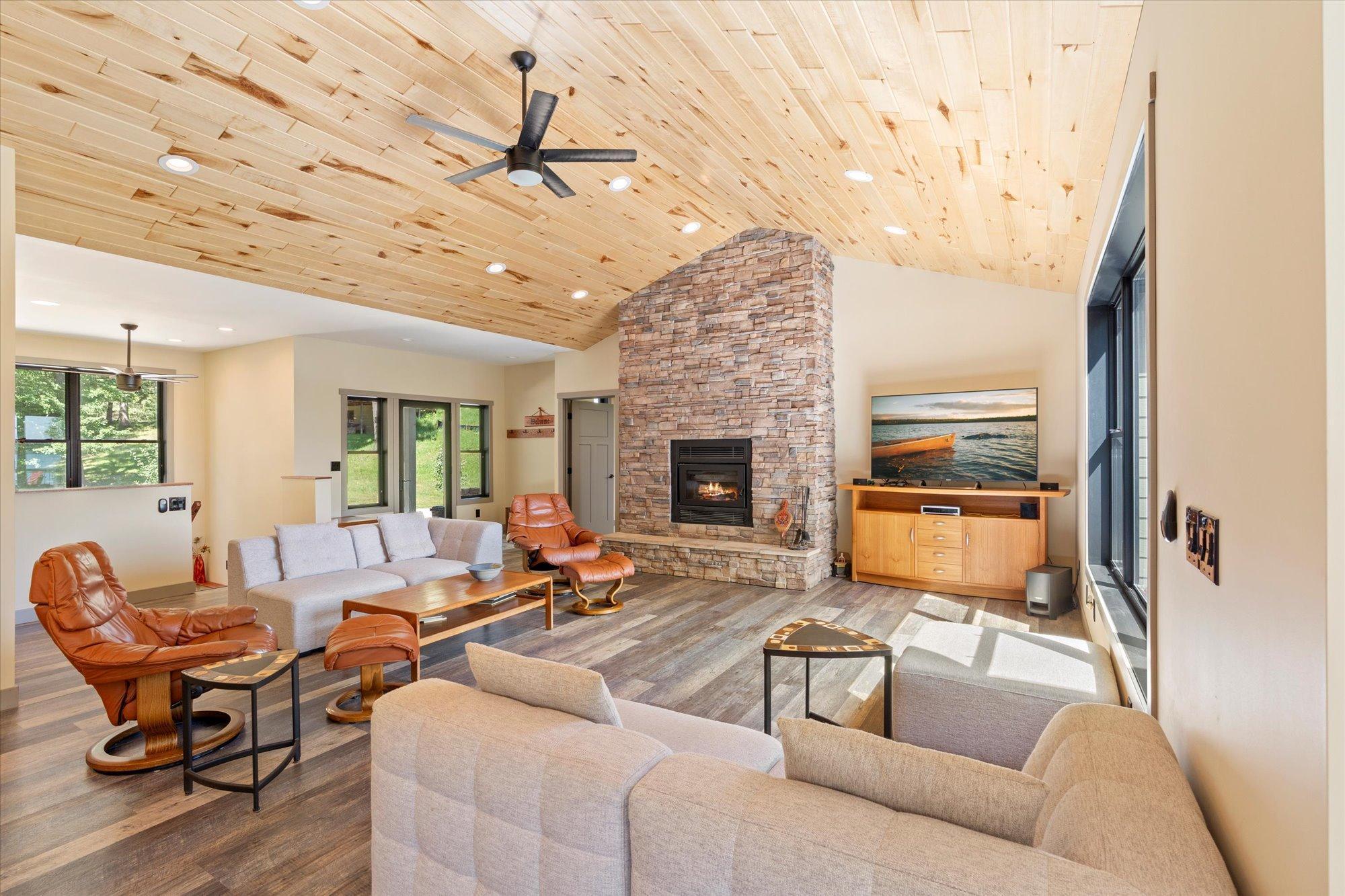 Modern comfort in a premier lakefront setting on 109 feet of sandy frontage! This newer 4-bedroom, 4-bath home on the west end of Thunder Lake is situated on a level irrigated lot with low elevation, providing easy access to the water. Perfect for hosting friends and family, this home showcases an open concept main floor with a large living room complete with a vaulted wood ceiling and a floor-to-ceiling wood-burning fireplace, a spacious kitchen with a large center island/breakfast bar, and a lakeside dining room plus a primary suite with a private bath featuring a separate tub and shower. In the upper bonus area, you will find a guest suite with a bedroom, a ¾ bath, and a small kitchenette. The lower level of the home includes 2 bedrooms, an office, and bathroom, along with a large family room (complete with a wet bar/second kitchen) leading out to a fabulous four-season porch. Take advantage of the storage and convenience of the attached 3-car insulated and heated garage with a concrete driveway. With its thoughtful layout and sought-after location, this property is ready to be enjoyed as a year-round home or lakeside retreat.