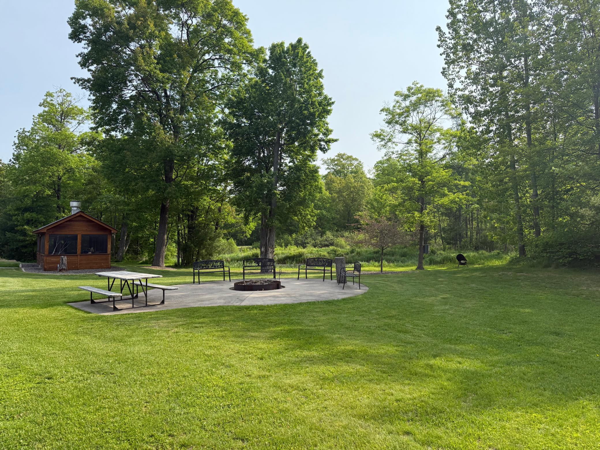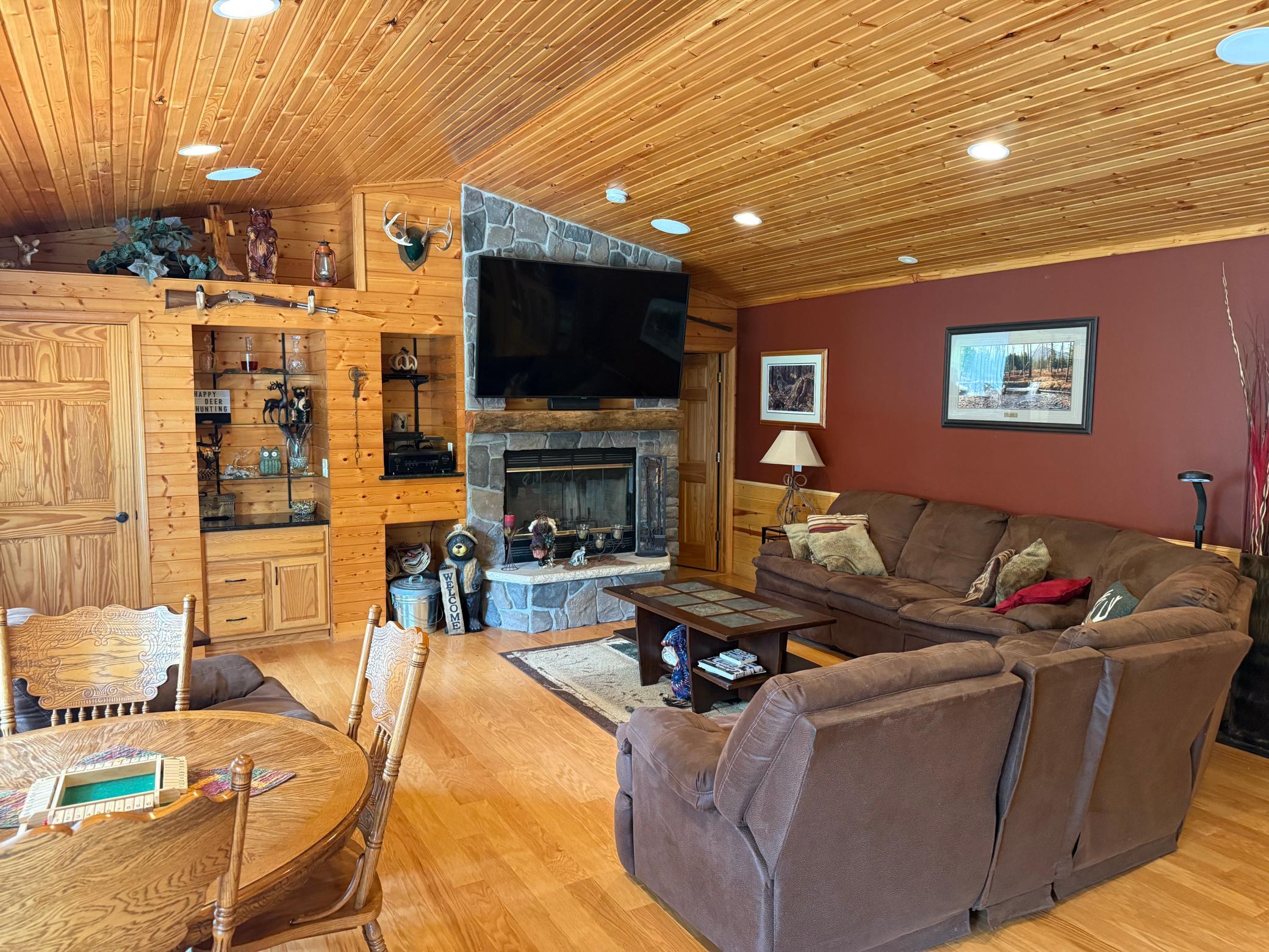 Welcome to your dream outdoor escape! This stunning turnkey property offers the perfect blend of luxury living and world-class recreation. Nestled behind a gated entry, you'll find a beautifully manicured yard, a spacious home, and direct access to Keene Lake—known for excellent fishing for northern pike, largemouth bass, sunfish, and crappie. The home is warm and inviting with an open-concept layout, vaulted ceilings, and a floor-to-ceiling stone fireplace anchoring the great room. Premium finishes include hardwood and tile flooring, granite countertops, a whirlpool tub, and energy-efficient spray foam insulation with in-floor heating throughout. The attached shop features an epoxy-coated floor and wet bar—ideal for relaxing after a hunt or cleaning the day’s catch. Step outside and enjoy a large concrete patio, a 3-season porch, and a private pond—all overlooking your peaceful, wooded retreat. A well-maintained internal road system leads you through the property and down to the lake, with several miles of branching UTV trails providing easy access to multiple enclosed box stands. This is big buck and bear country, and recent years have produced several impressive trophies. The property borders thousands of acres of the St. Croix State Forest, offering nearly limitless hunting, hiking, and exploring opportunities. Plus, the Gandy Dancer ATV/snowmobile trail is just down the road, making this a true four-season playground. Whether you're after a trophy buck, a quiet morning of fishing, or a luxury basecamp for year-round adventure, this property checks all the boxes. There are also 6 Banks Stump 4 blinds with deck plates,